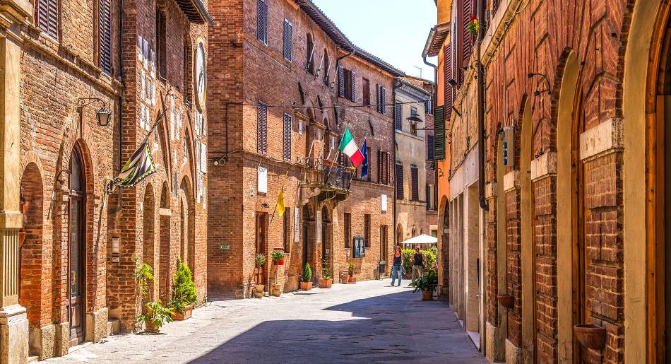 Buonconvento est probablement l'un des plus beaux villages d'Italie situé au cœur des Crete Senesi. Il n'est qu'à quelques kilomètres de Sienne, enfermé dans les murs de la ville, le village médiéval construit en 1379 n'avait que deux entrées, une au nord de la Porta Senese et une au sud appelée Porta Romana qui a été détruite en 1944 par les Allemands. Son centre historique s'appelle Via Soccini et vous y trouverez la plupart des restaurants et cafés.
