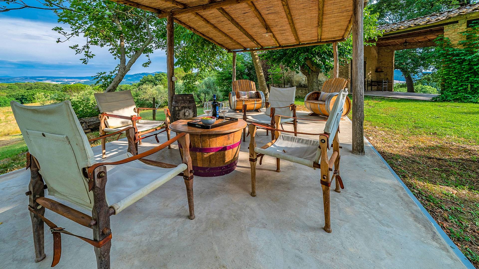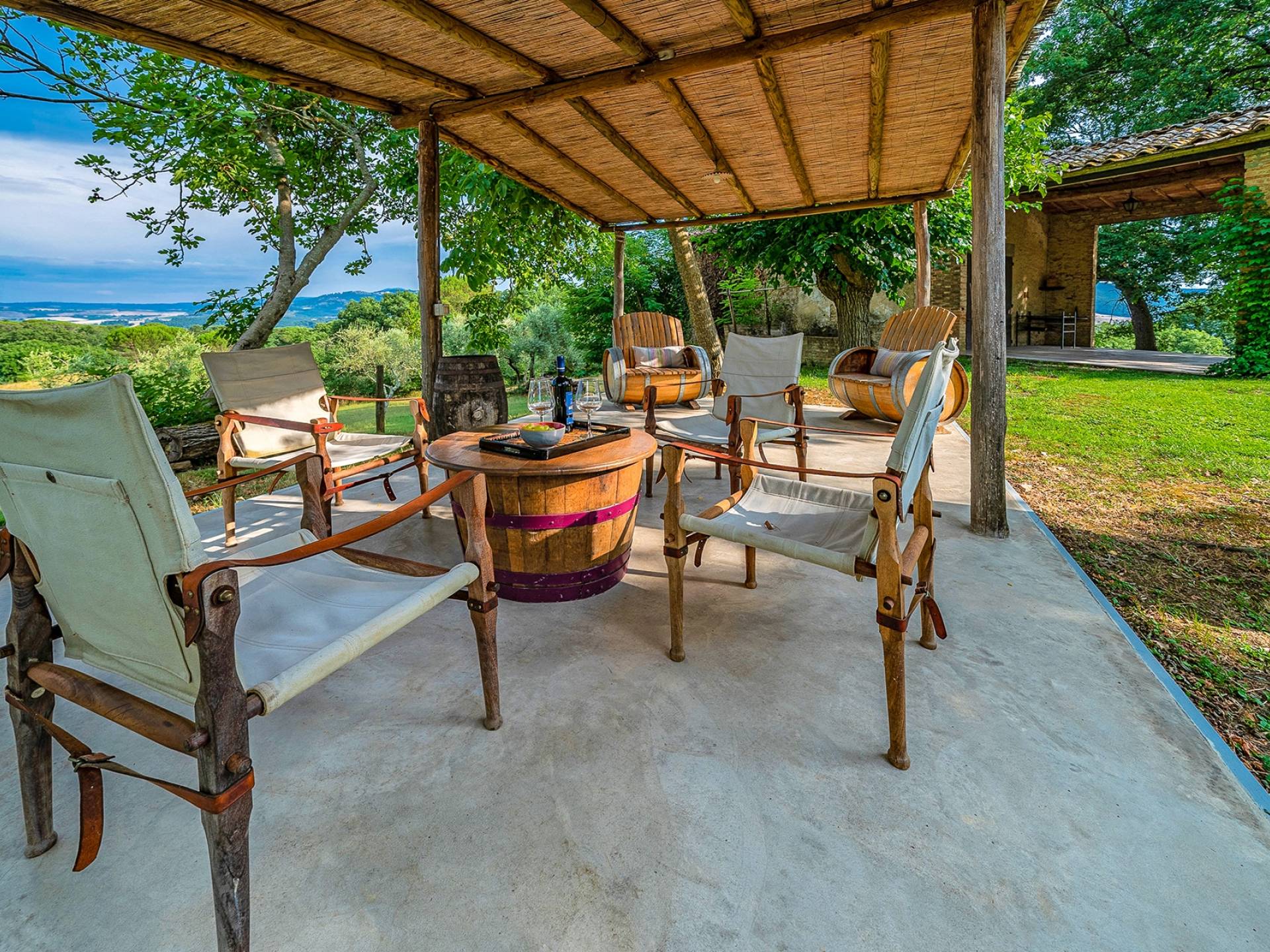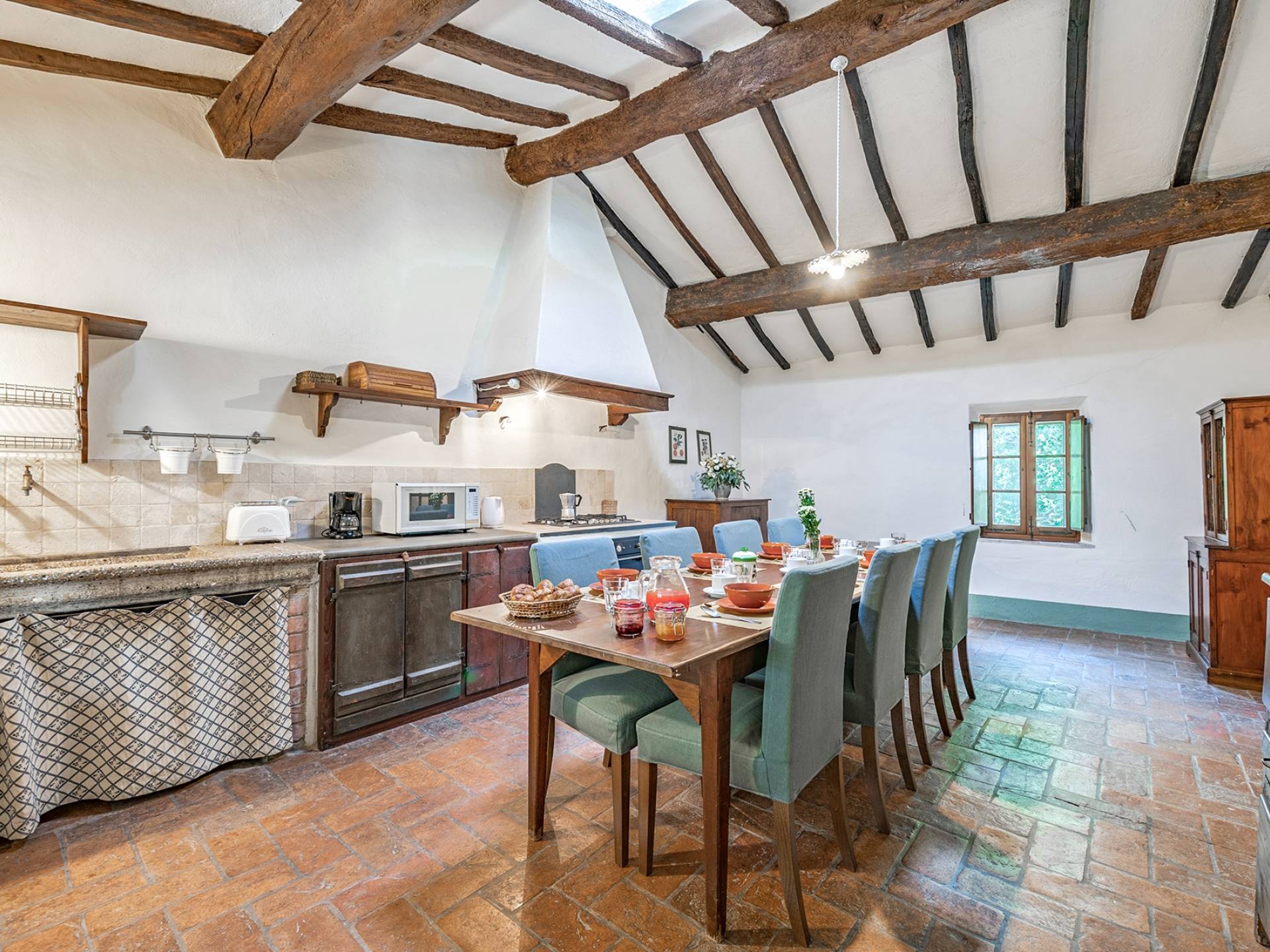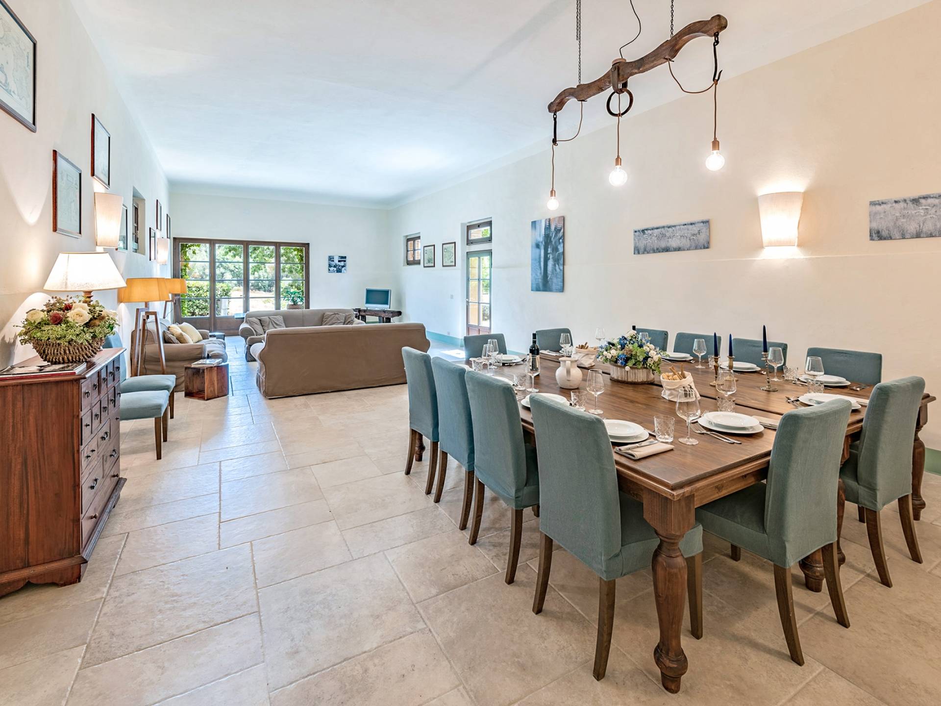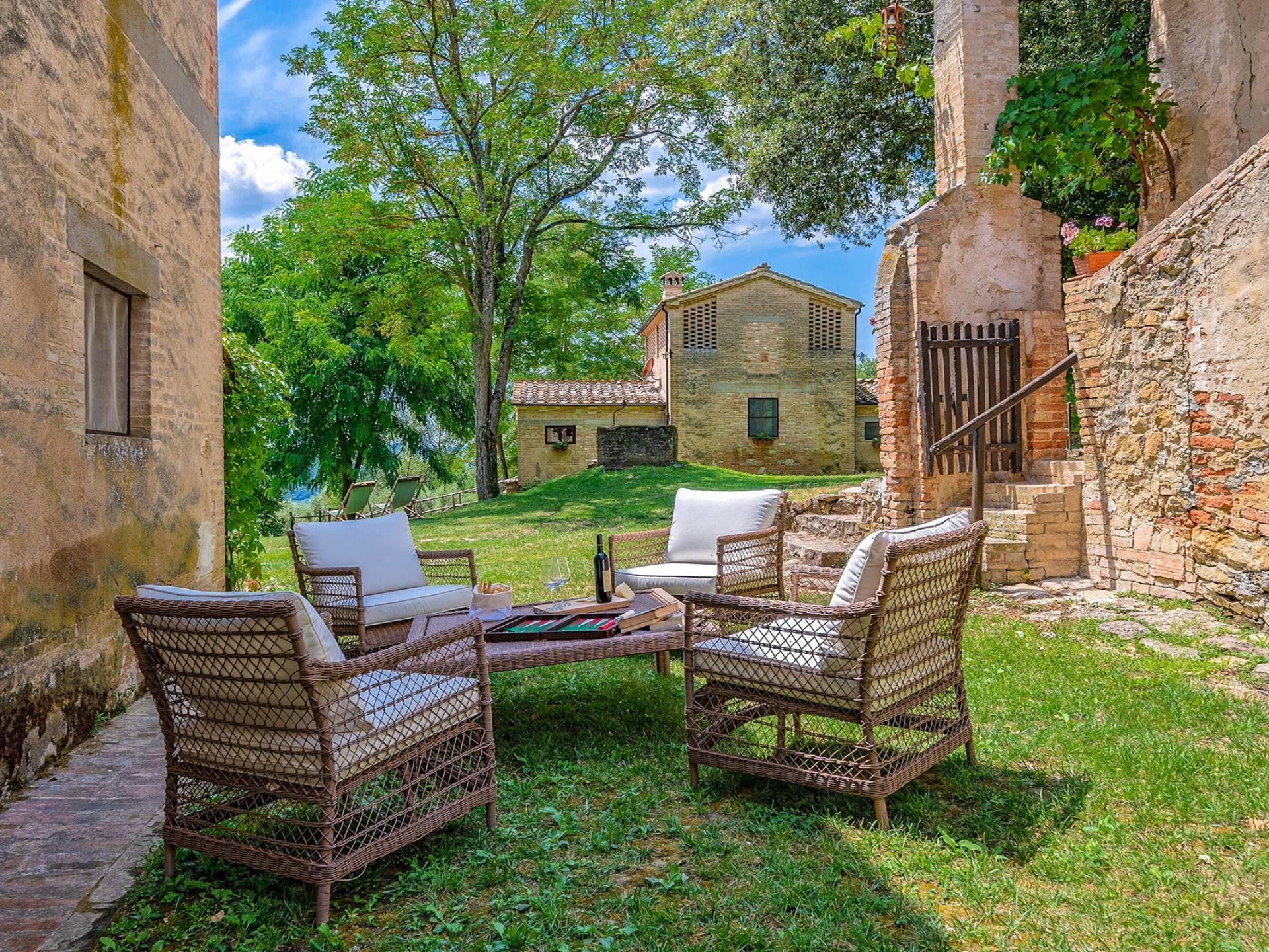 Vivre des vacances ici, ce sera comme s'immerger dans une autre vie, dans une autre dimension. Tout est en effet conçu pour accueillir le touriste dans un lieu à l'authenticité intemporelle. Dans la grande pièce du rez-de-chaussée de la maison patronale, à l'origine utilisée comme entrepôt mais ensuite restaurée et transformée en pièce de vie principale, de grandes fenêtres et portes en bois s'ouvrent sur le jardin où un patio couvert et une seconde pergola sont à disposition des hôtes pour les dîners. open ou autres moments de vraie convivialité.