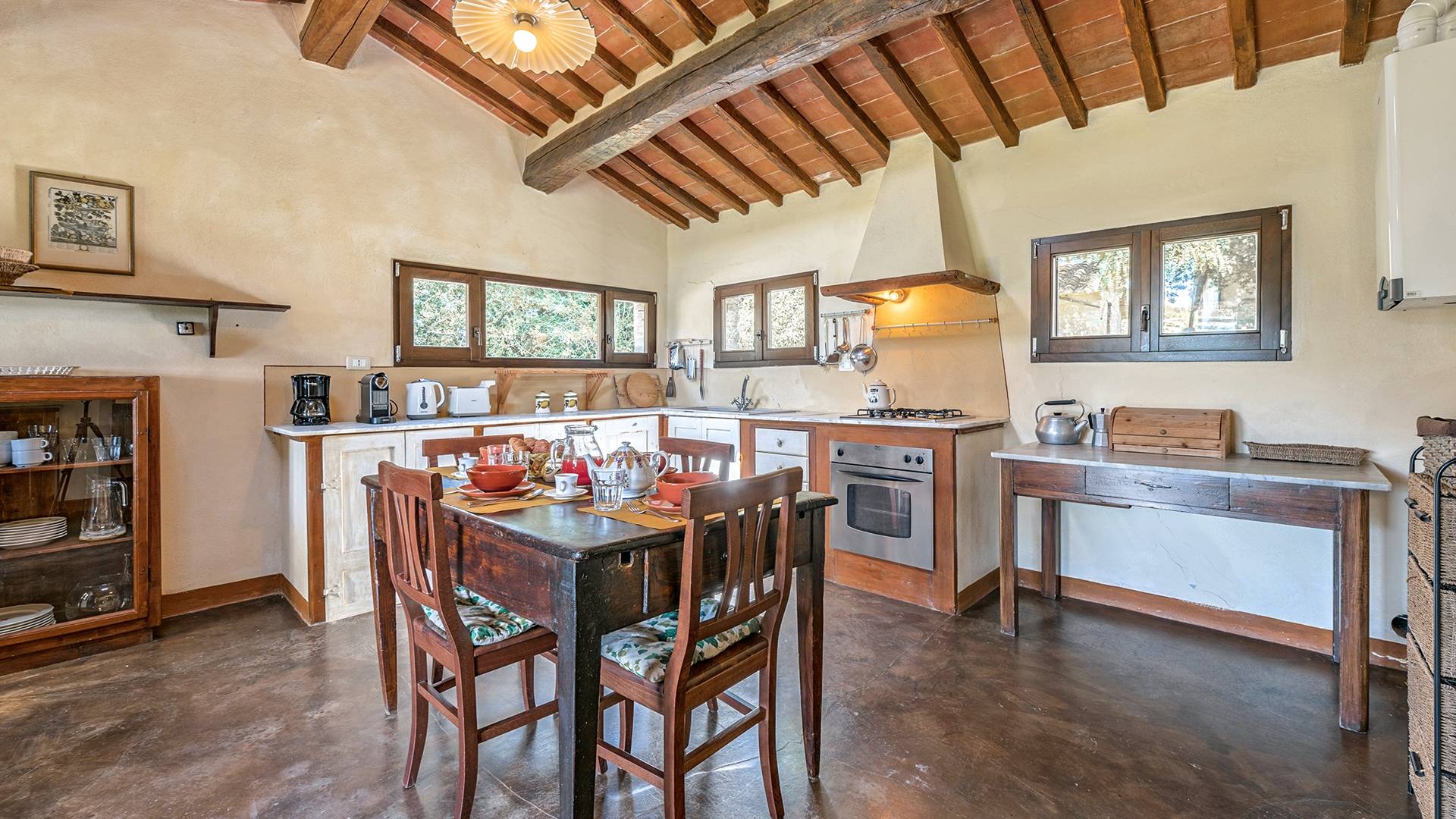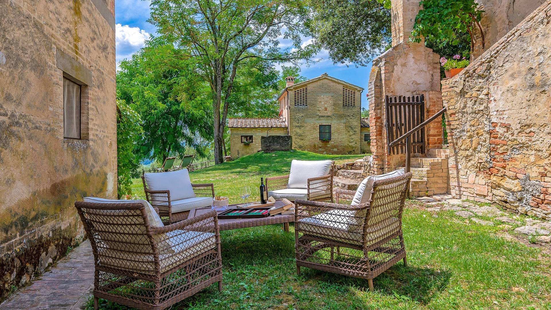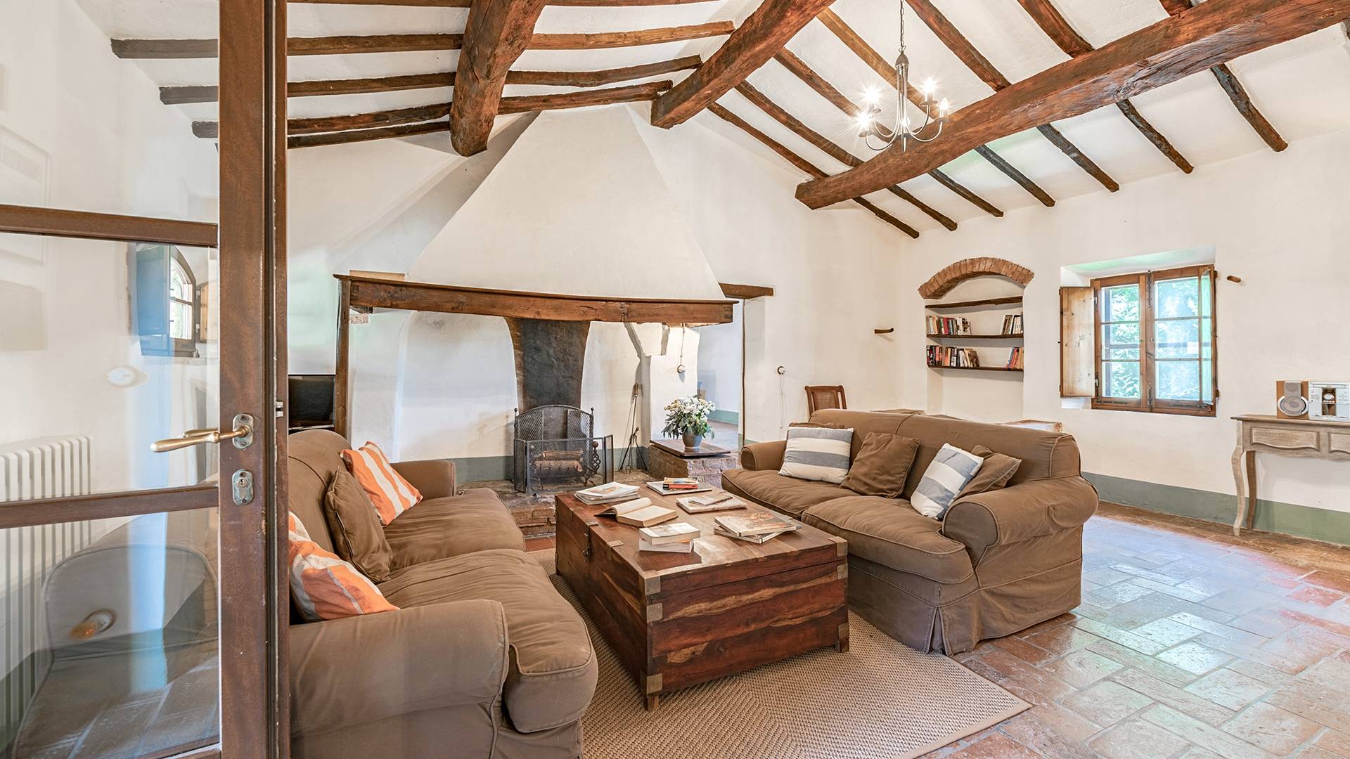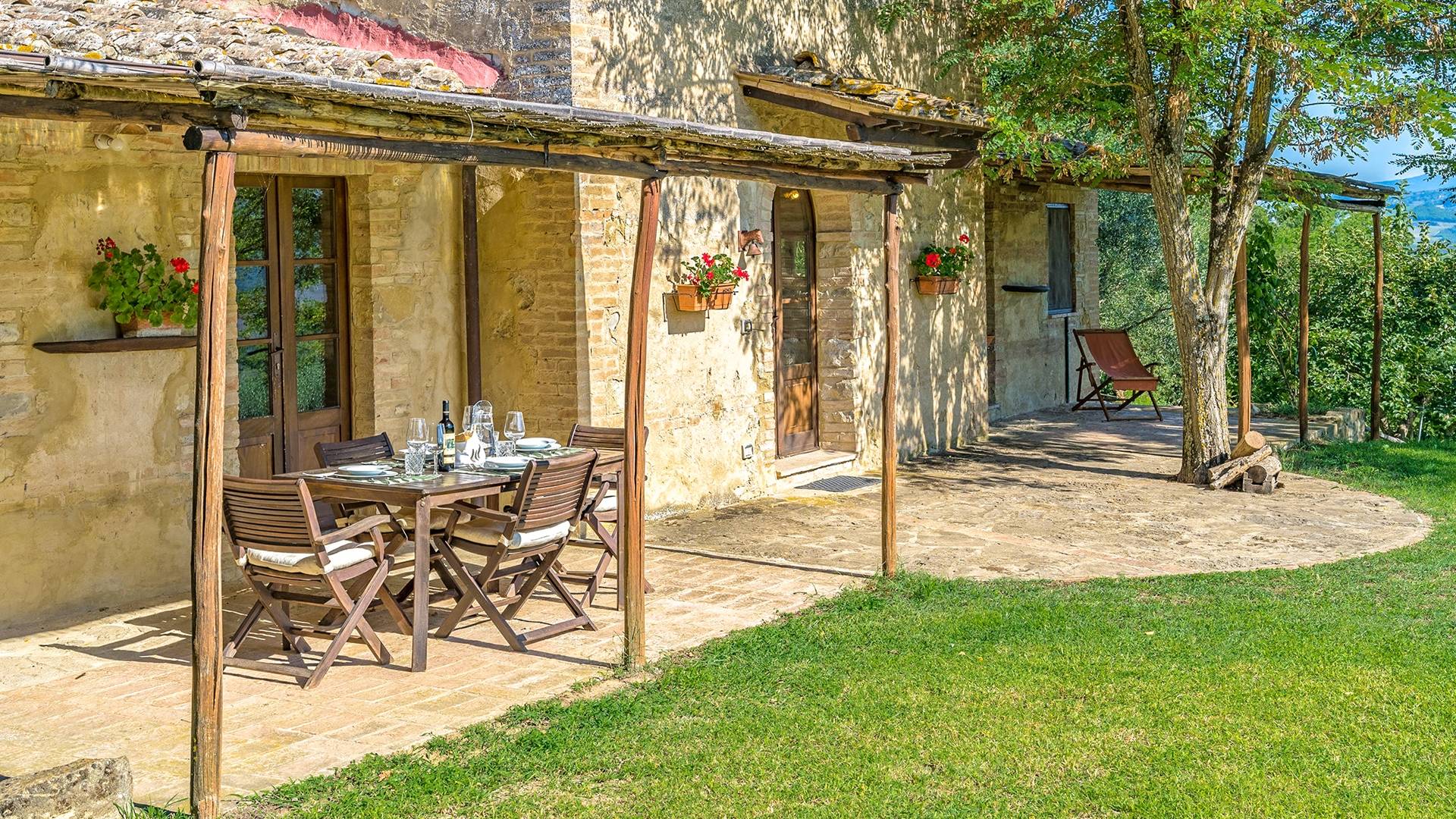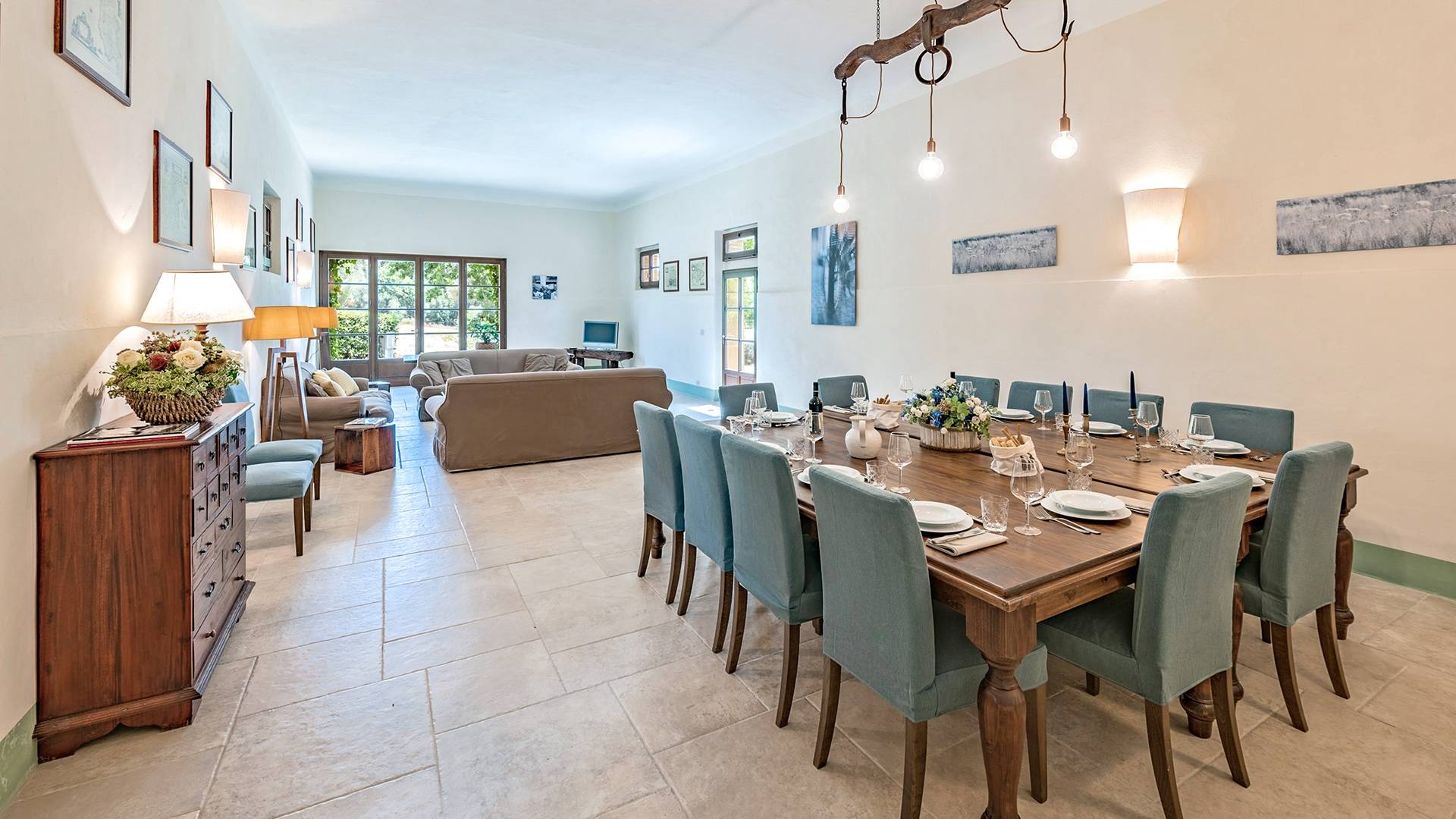 Vivre des vacances ici, ce sera comme s'immerger dans une autre vie, dans une autre dimension. Tout est en effet conçu pour accueillir le touriste dans un lieu à l'authenticité intemporelle. Dans la grande pièce du rez-de-chaussée de la maison patronale, à l'origine utilisée comme entrepôt mais ensuite restaurée et transformée en pièce de vie principale, de grandes fenêtres et portes en bois s'ouvrent sur le jardin où un patio couvert et une seconde pergola sont à disposition des hôtes pour les dîners. open ou autres moments de vraie convivialité.