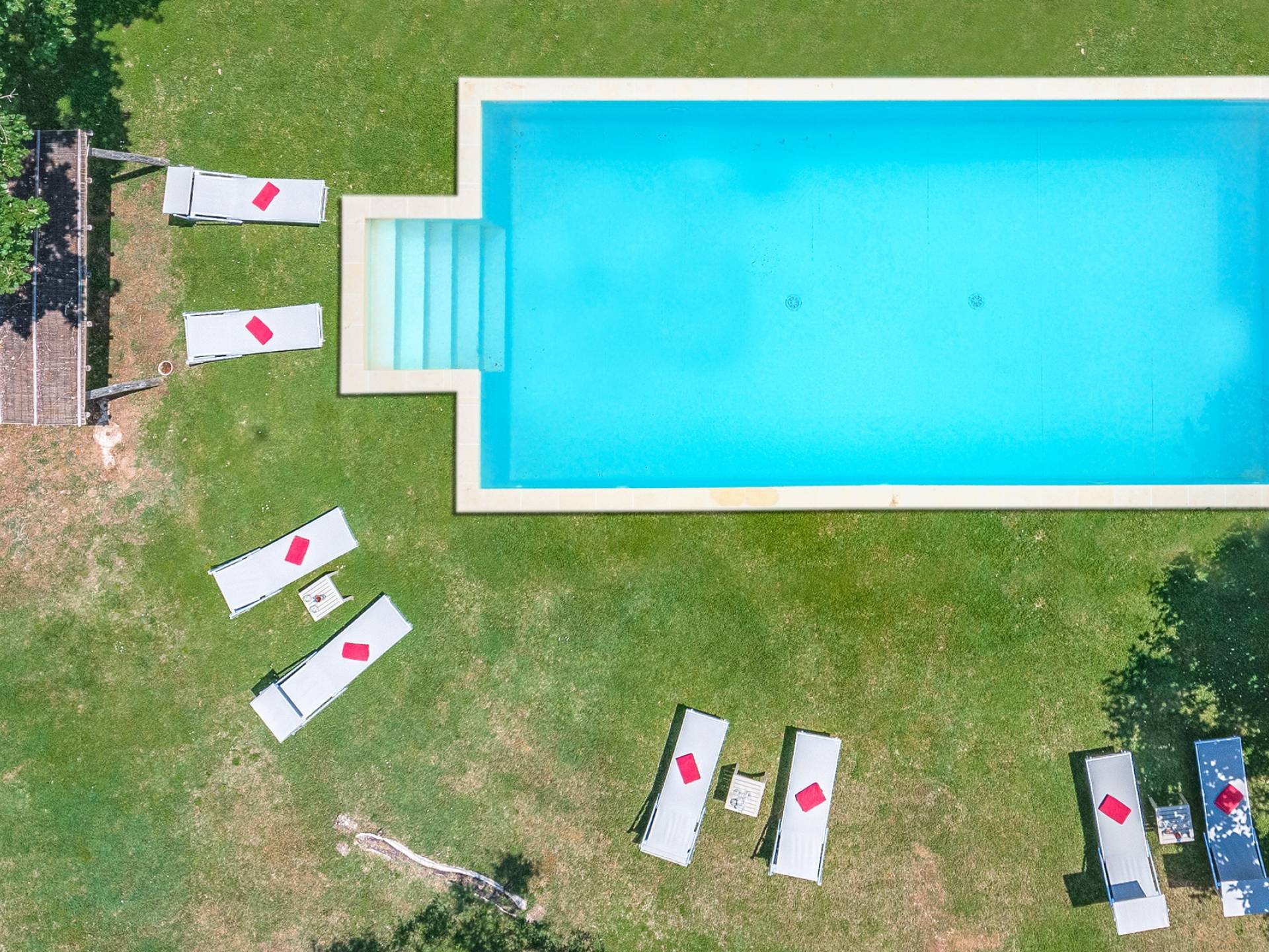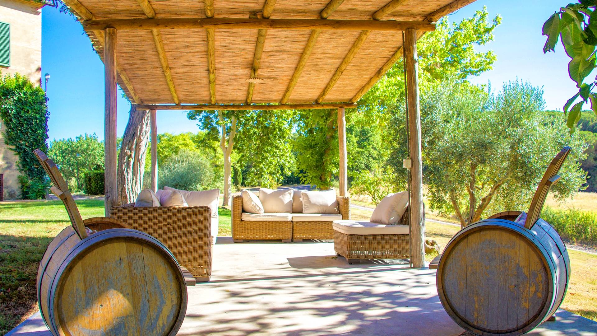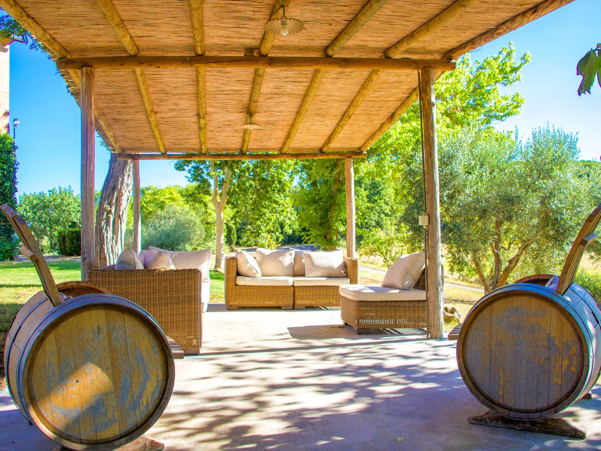 À l'extérieur, tout autour des deux bâtiments principaux, il y a un immense jardin avec des espaces verts pleins d'arbres et équipé d'une belle piscine, d'un coin barbecue et d'espaces de détente pour lire un livre, prendre un verre ou se promener. Avec le vin, le domaine produit des céréales, du blé, des olives et autres trésors de ces terres où l'hospitalité a toujours été la véritable carte de visite.