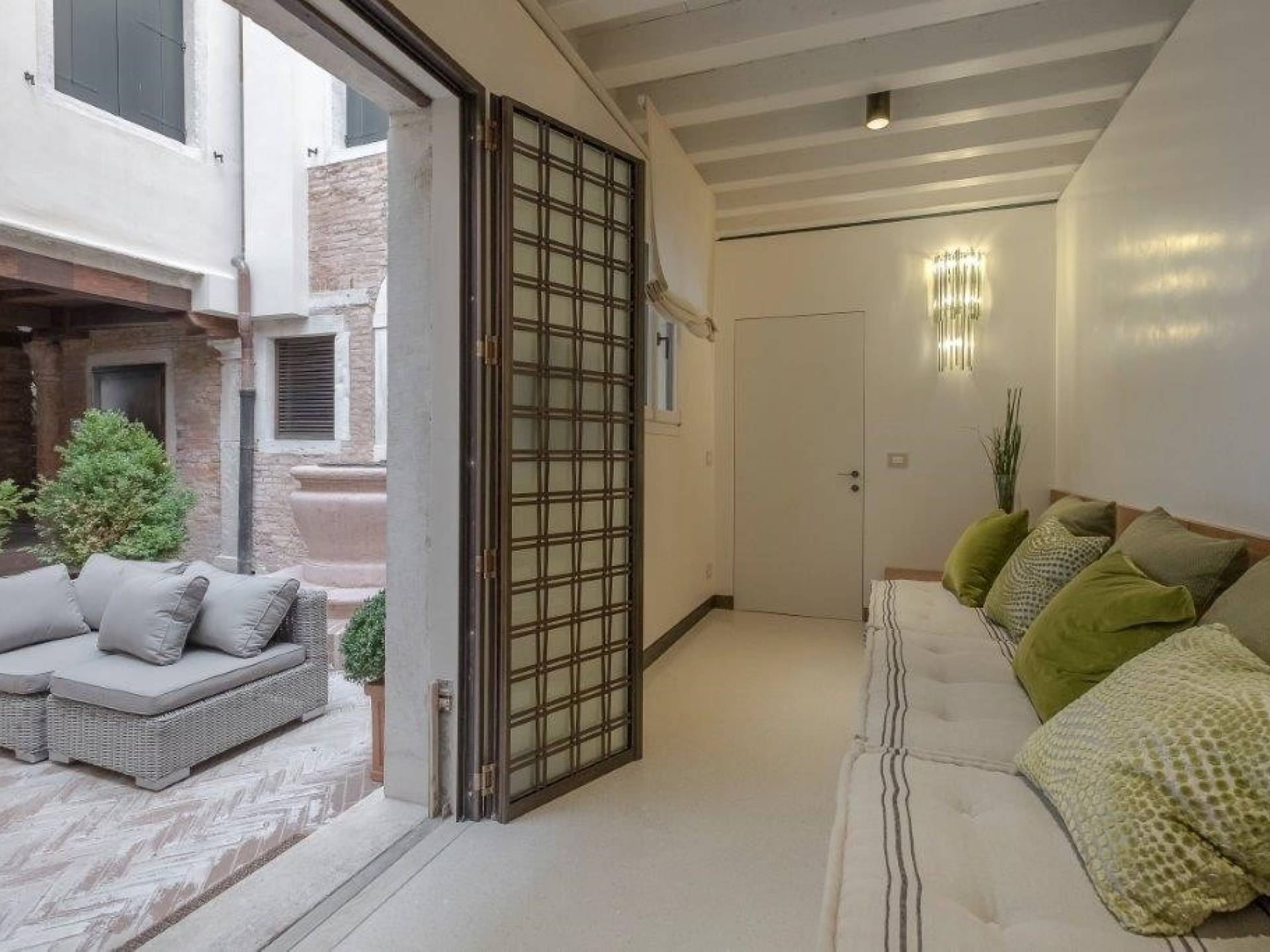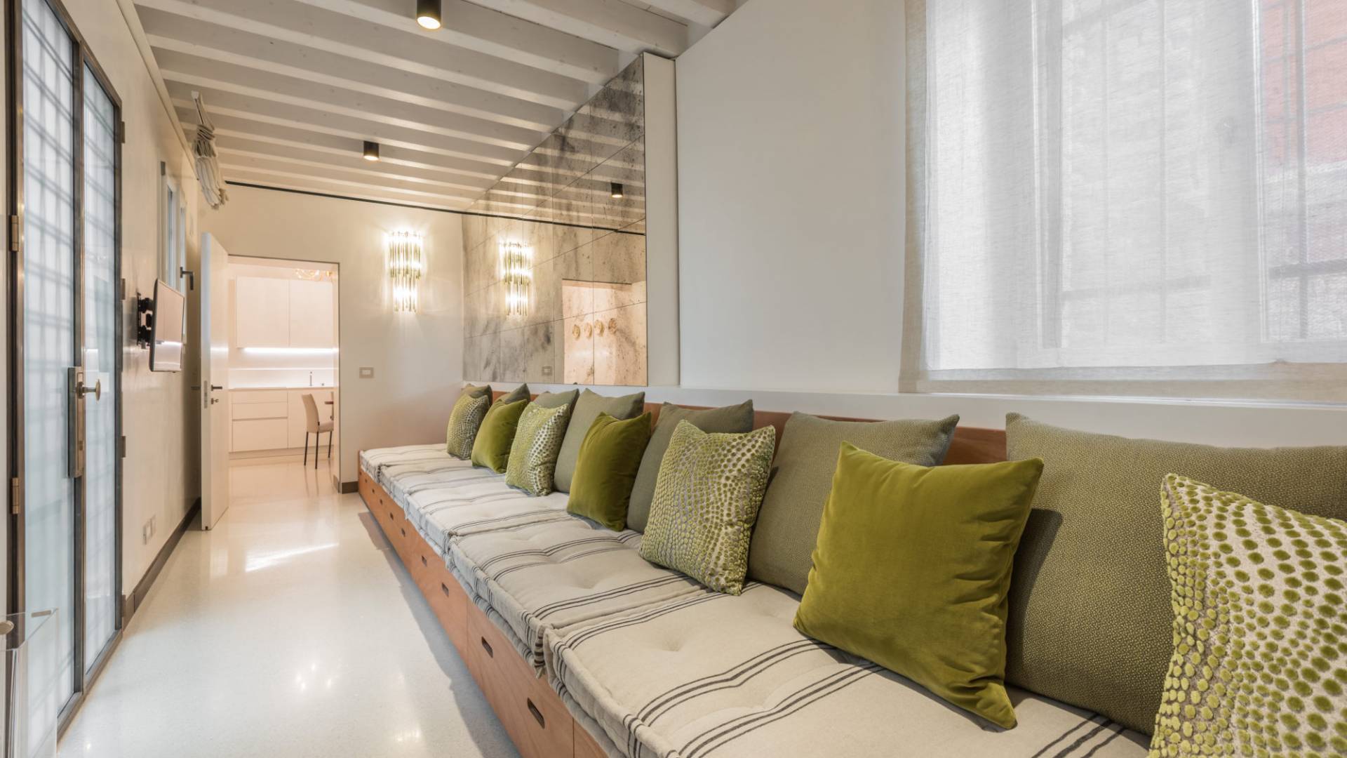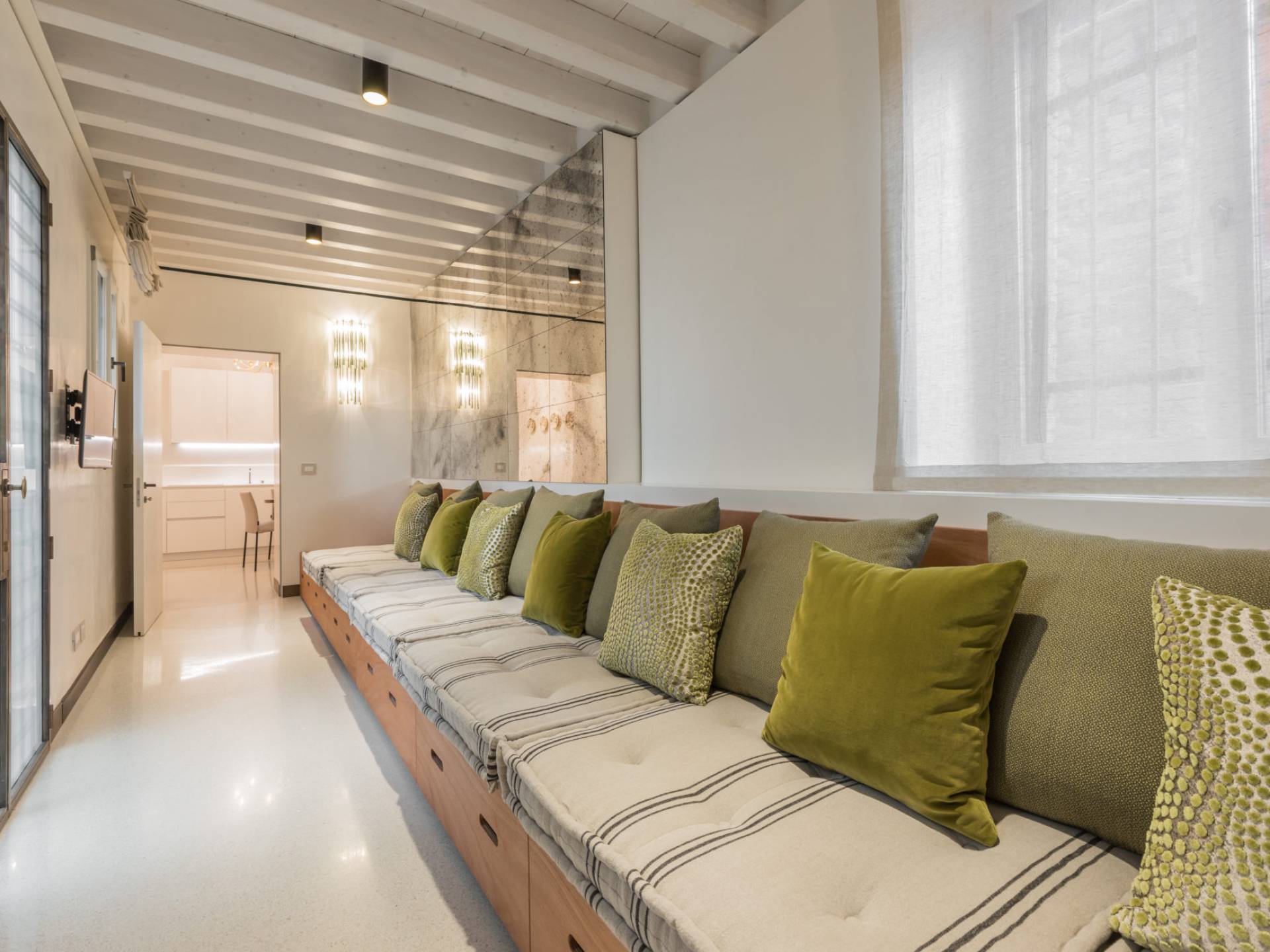La décoration intérieure de l'appartement associe des tissus naturels et précieux tels que le lin italien associé à de la soie brodée fabriquée à Venise. Les murs sont finis en plâtre vénitien, les sols sont en marbre terrazzo tandis que les appliques et les lampes sont en verre de Murano, imprégnant l'espace moderne d'accents locaux rappelant la vie vénitienne. L'effet global est un étonnant affichage du chic moderne.