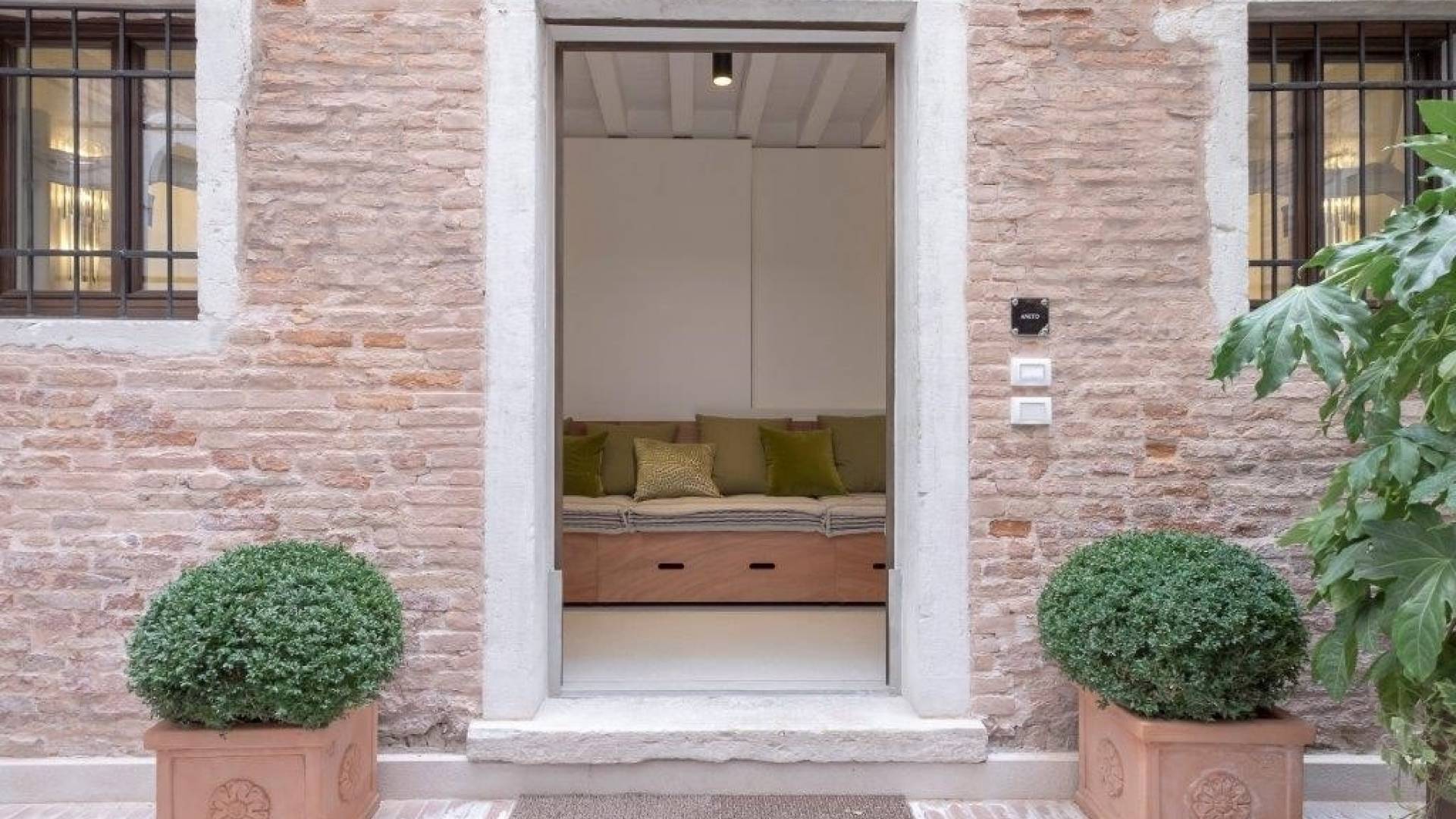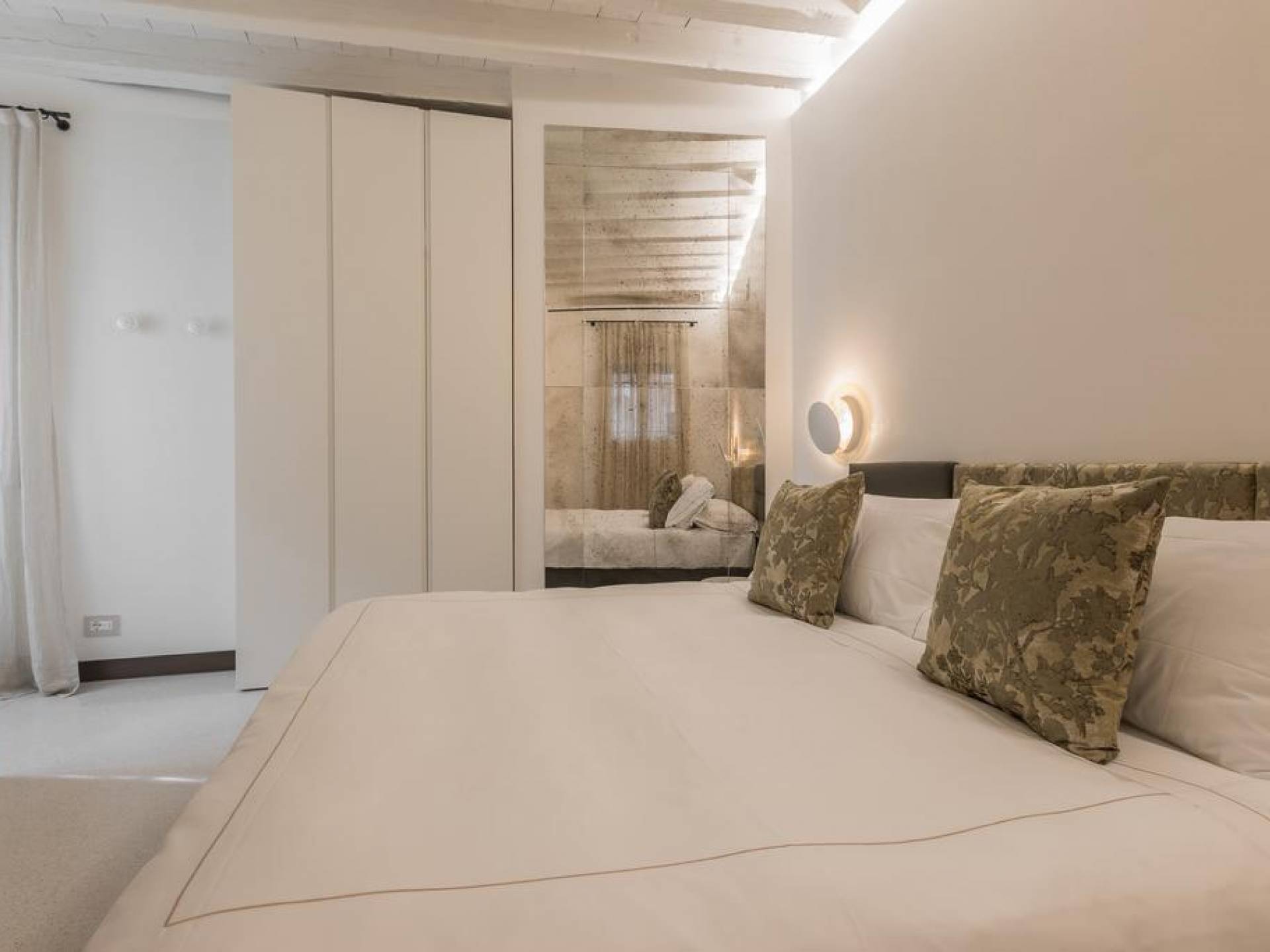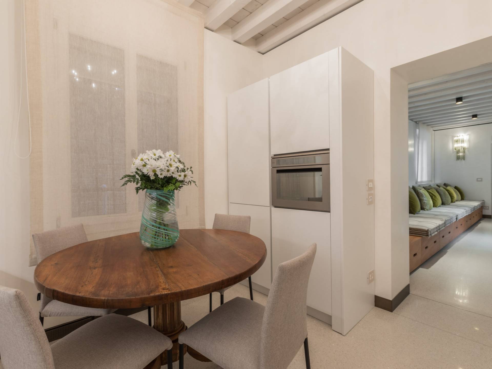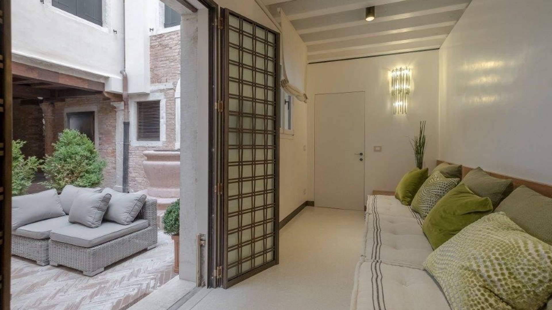La décoration intérieure de l'appartement associe des tissus naturels et précieux tels que le lin italien associé à de la soie brodée fabriquée à Venise. Les murs sont finis en plâtre vénitien, les sols sont en marbre terrazzo tandis que les appliques et les lampes sont en verre de Murano, imprégnant l'espace moderne d'accents locaux rappelant la vie vénitienne. L'effet global est un étonnant affichage du chic moderne.