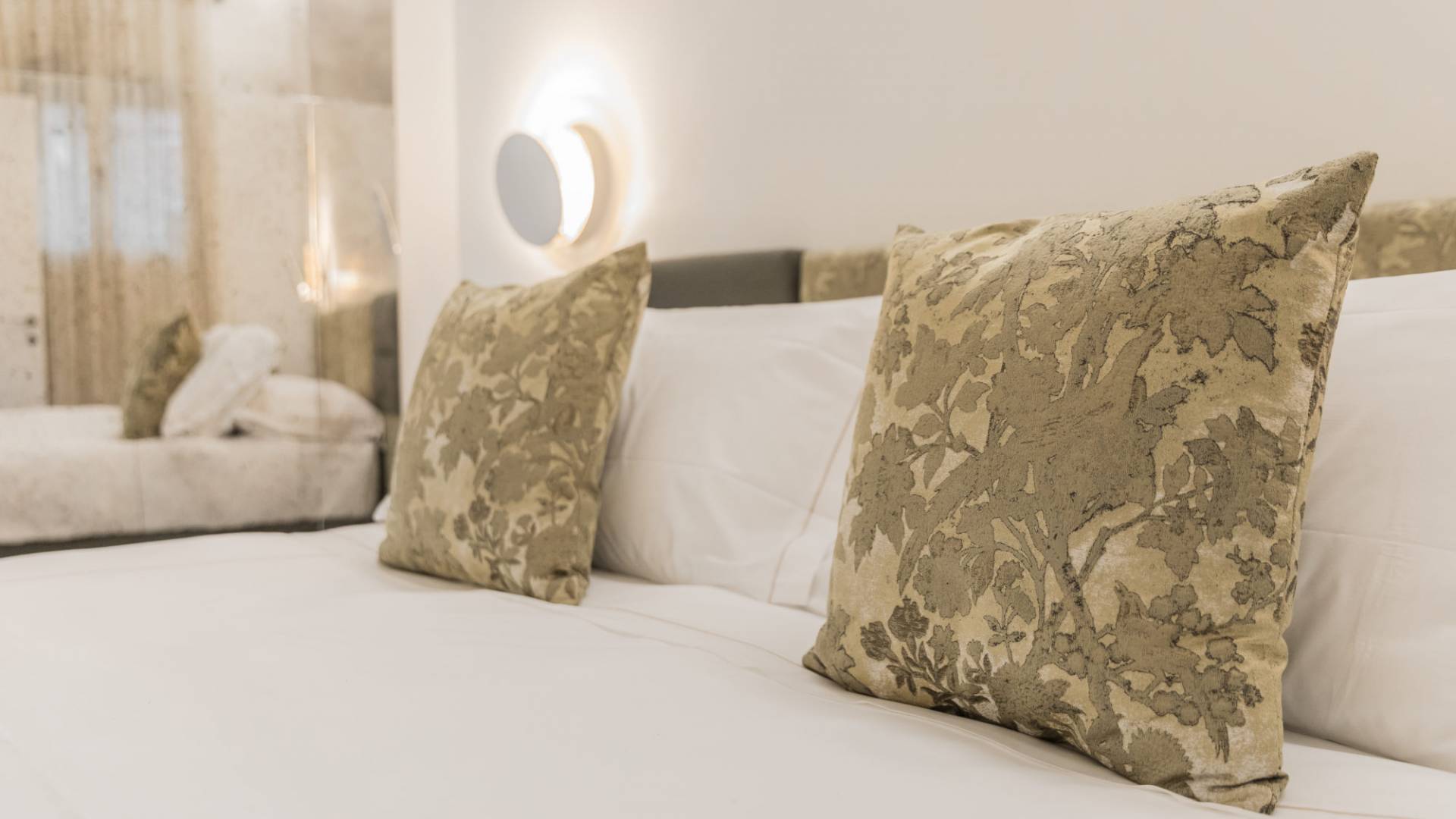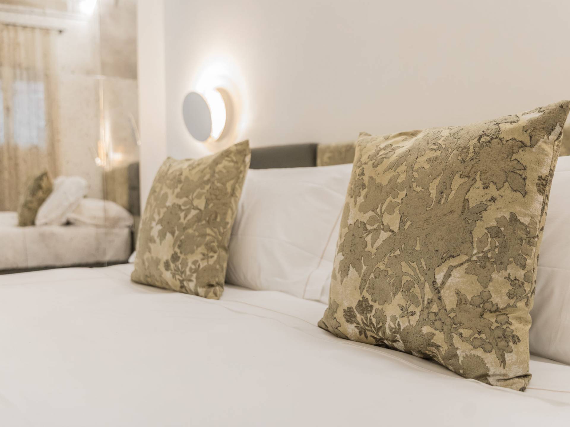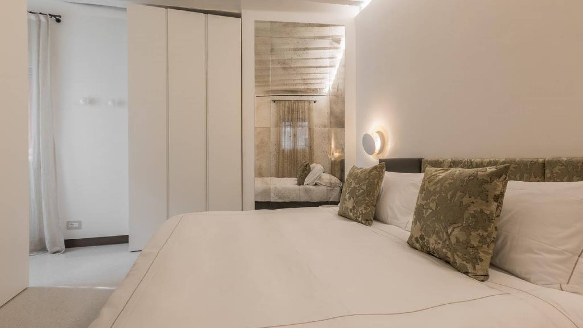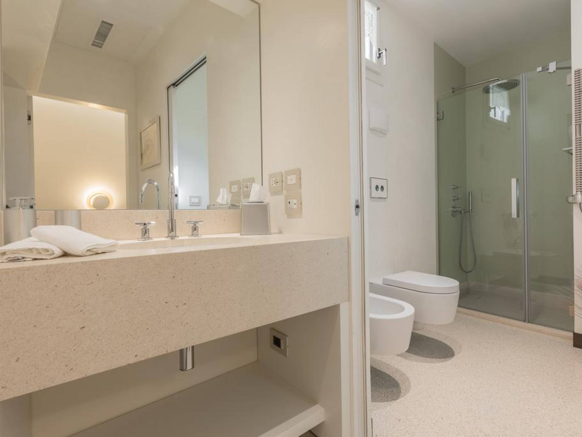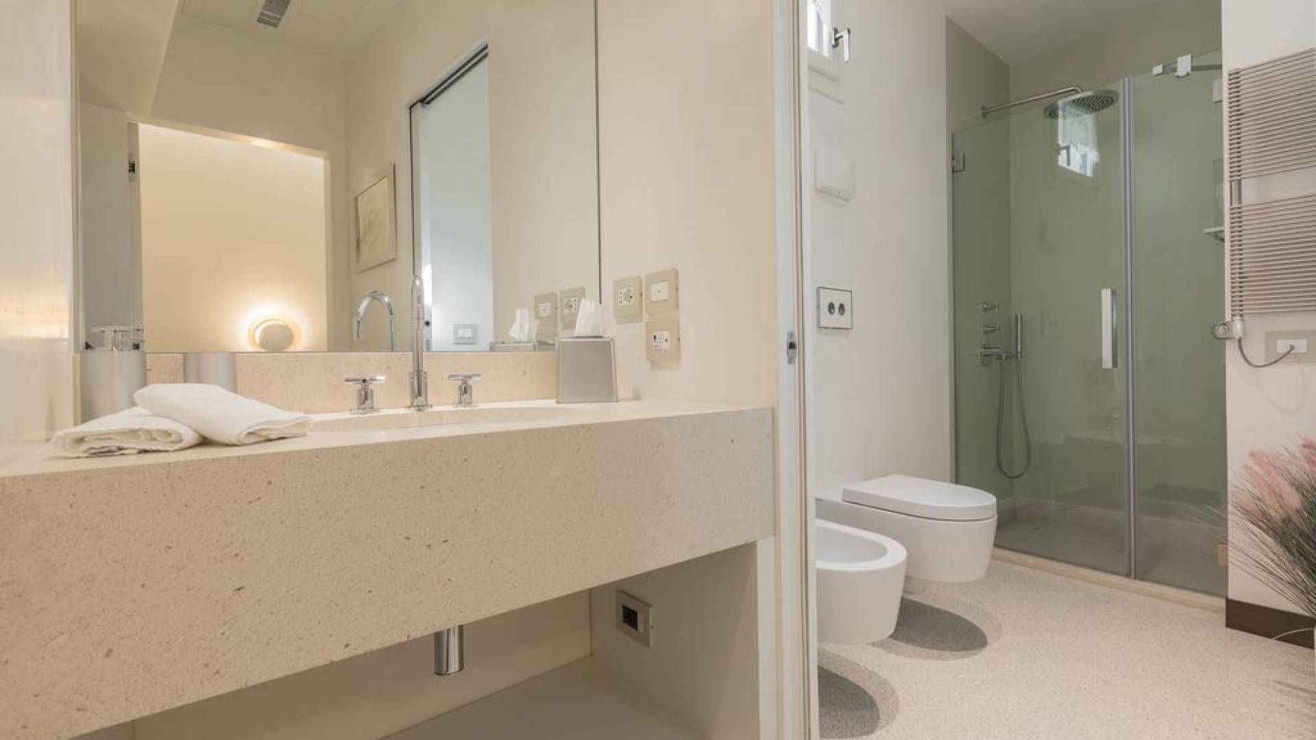 À droite du salon se trouve une salle de bain vitrée avec douche à l'italienne. Superbement détaillée, avec des finitions haut de gamme qui incluent la pierre d'Istrie, des miroirs et des armoires fabriquées à la main, la salle de bain est idéalement située près de la chambre, offrant la bonne quantité d'intimité pour recevoir des invités. La chambre comprend un lit king-size et un coin salon offrant une vue sur les colonnades médiévales et le jardin du palais.