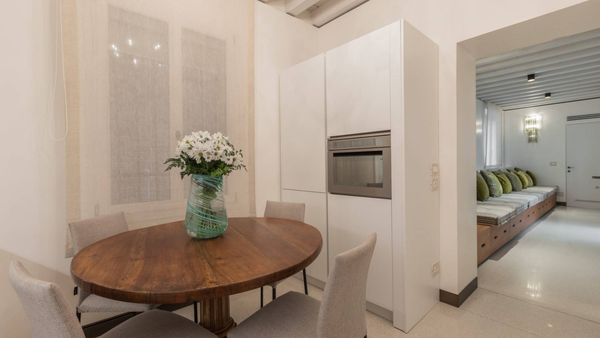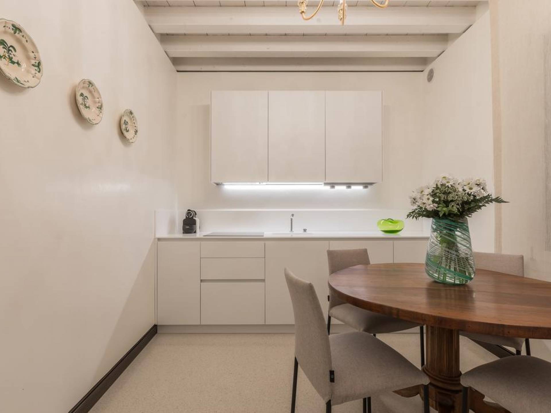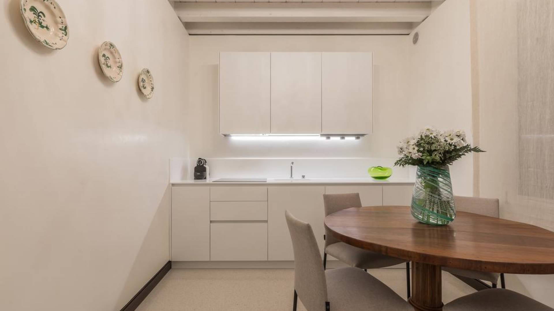 A l'entrée de l'appartement se trouve un petit salon, équipé d'un confortable canapé oblong recouvert de précieux linge italien. Deux fenêtres donnent sur une cour verdoyante, tandis qu'une troisième donne sur la ruelle tranquille à l'extérieur. Les murs sont traités en plâtre vénitien blanc, avec des draperies en lin blanc cassé et des textiles brodés vert terreux. Derrière une porte coulissante à gauche se trouve une cuisine entièrement équipée, décorée avec table et chaises.