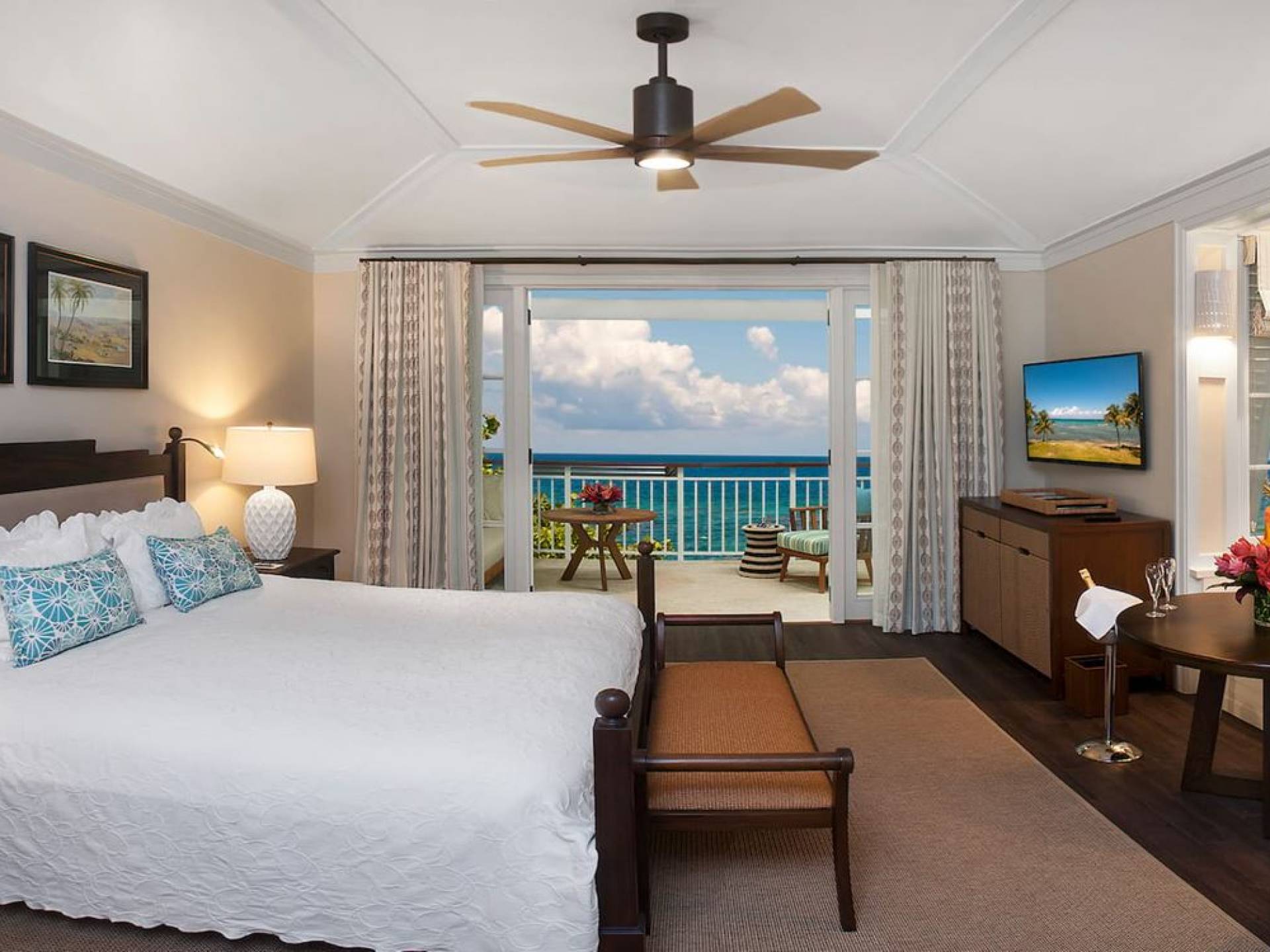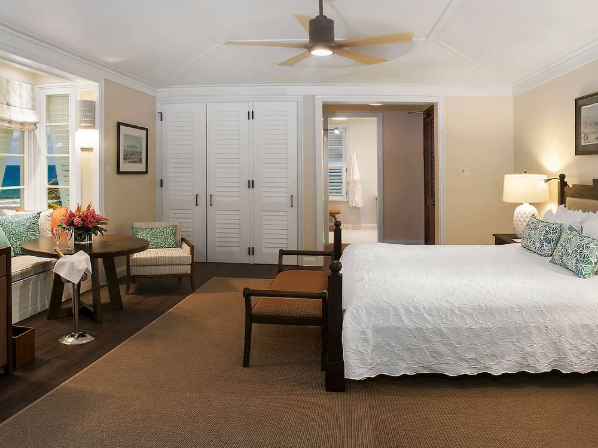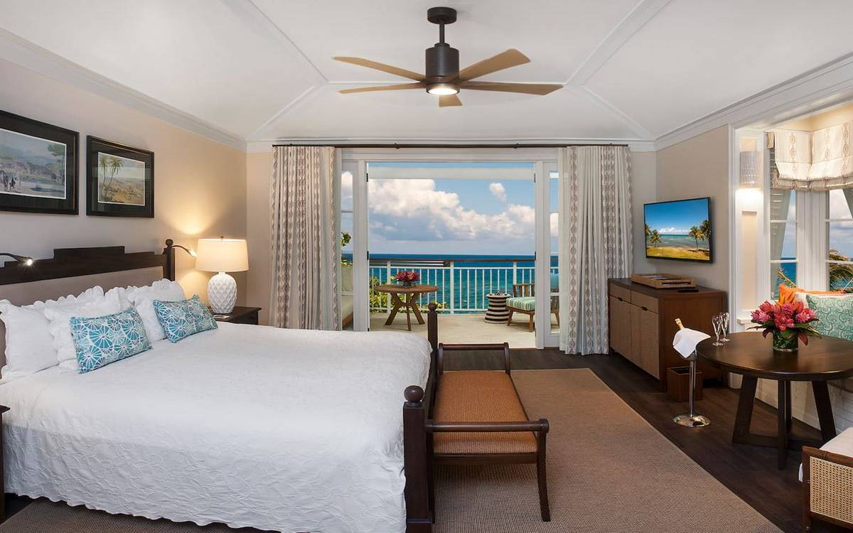 Certaines chambres sont situées au rez-de-chaussée ou au premier étage de cottages à deux étages, tandis que d'autres sont situées au premier étage de la grande maison du complexe. Chaque chambre est dotée d'un vaste patio ou d'un balcon privé couvert et meublé. Les chambres disposent d'un lit king-size ou de deux lits doubles (sous réserve de disponibilité à l'arrivée). Les salles de bains privatives sont équipées de lavabos doubles et de baignoires ou de douches. Les chambres King communiquent avec les chambres doubles pour plus d'espace.