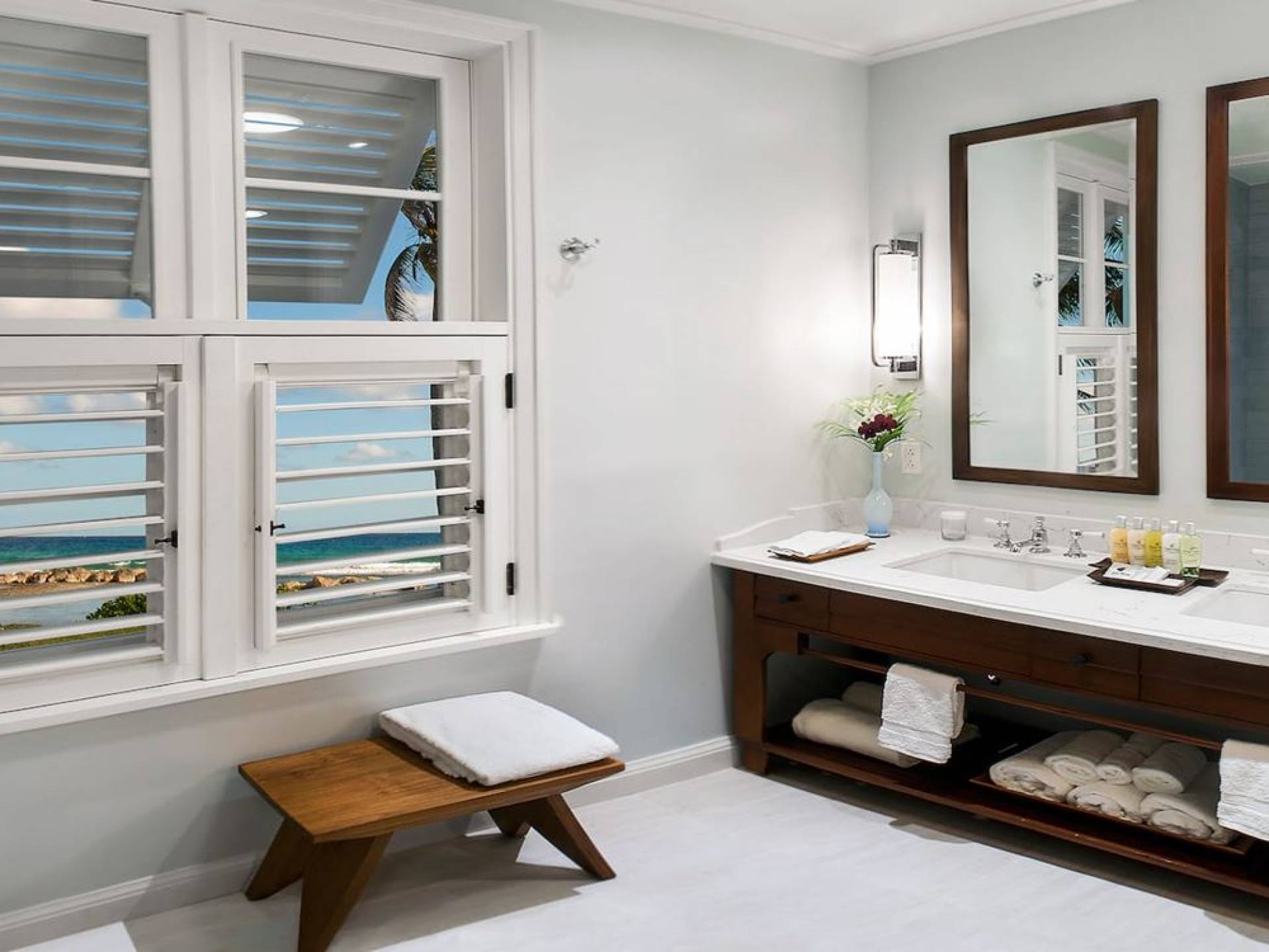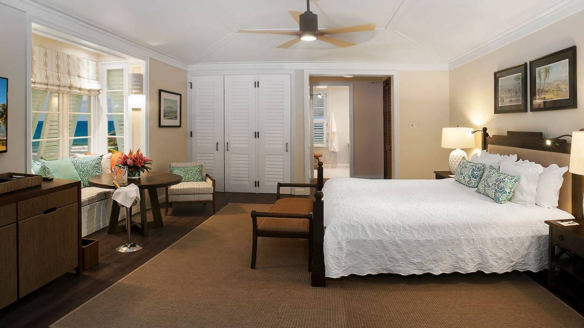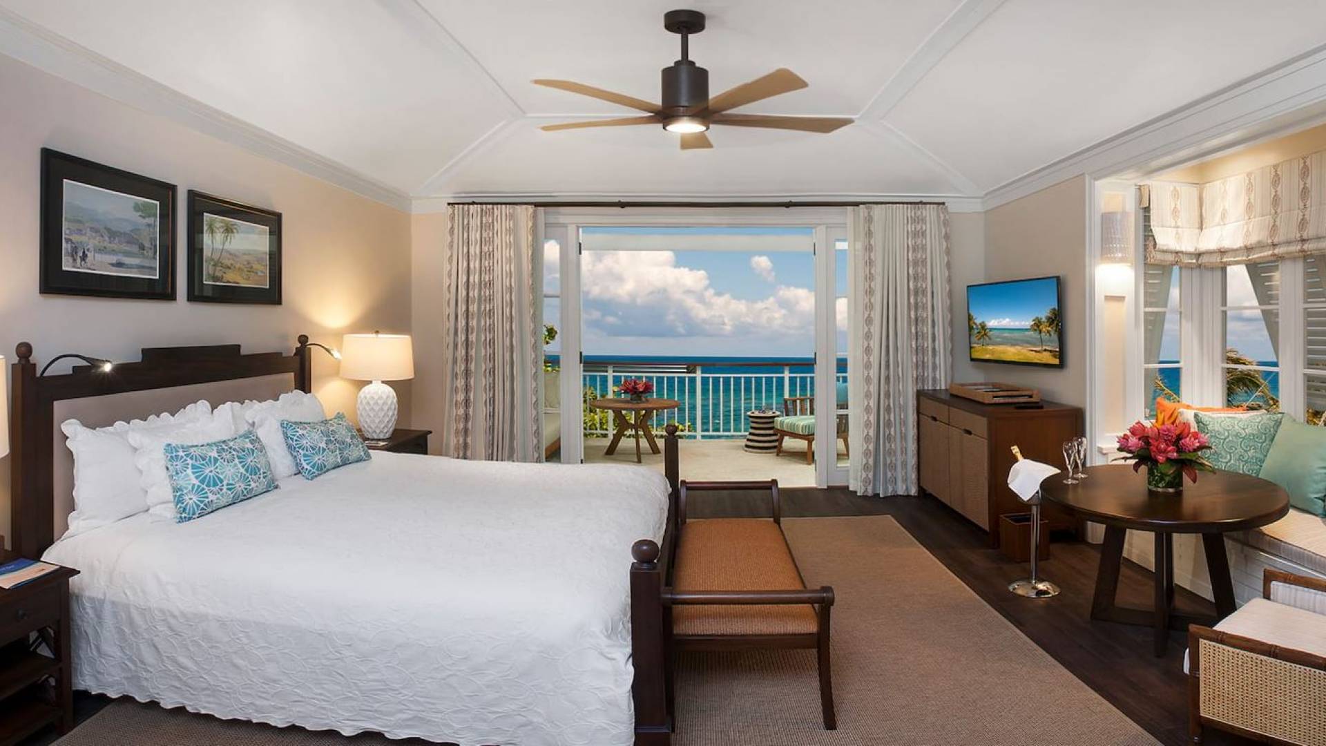 Certaines chambres sont situées au rez-de-chaussée ou au premier étage de cottages à deux étages, tandis que d'autres sont situées au premier étage de la grande maison du complexe. Chaque chambre est dotée d'un vaste patio ou d'un balcon privé couvert et meublé. Les chambres disposent d'un lit king-size ou de deux lits doubles (sous réserve de disponibilité à l'arrivée). Les salles de bains privatives sont équipées de lavabos doubles et de baignoires ou de douches. Les chambres King communiquent avec les chambres doubles pour plus d'espace.