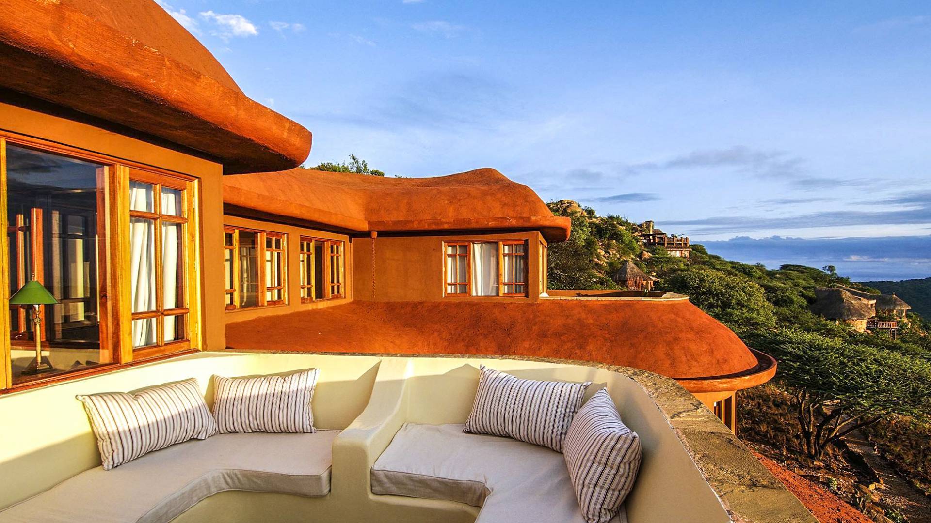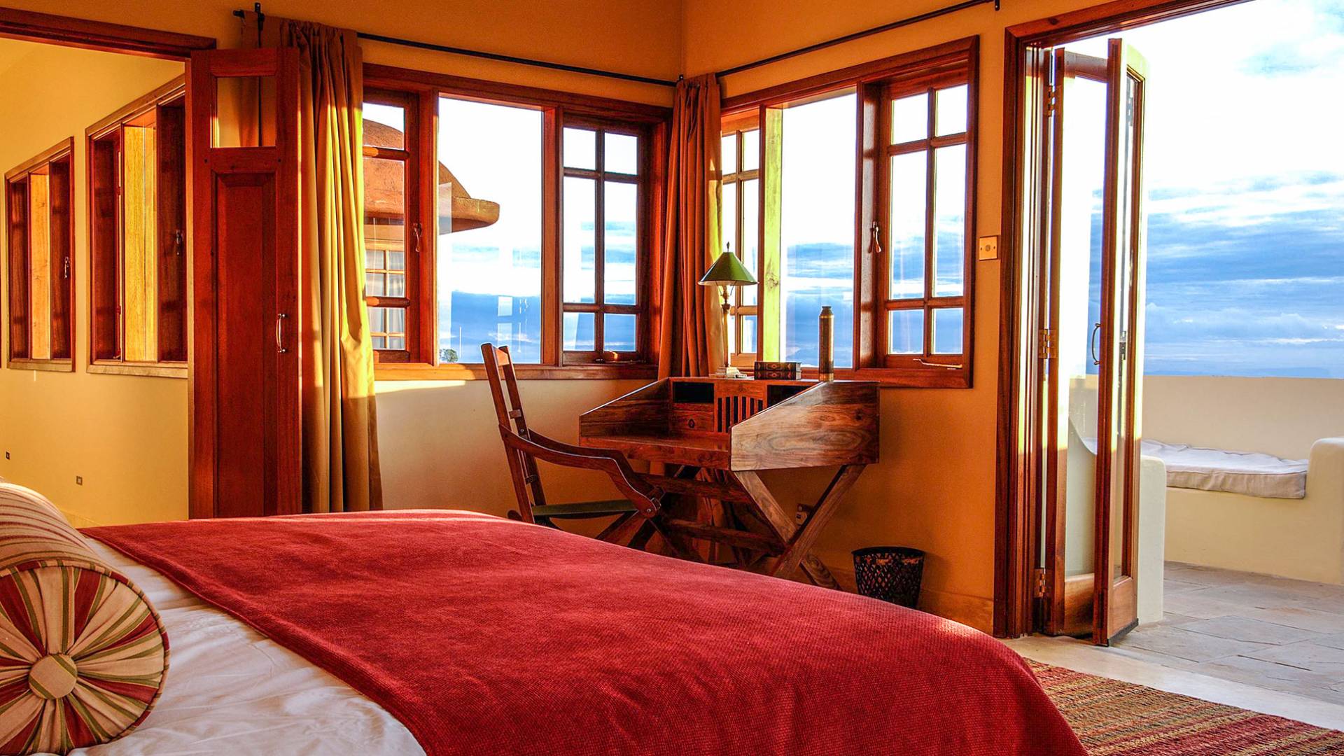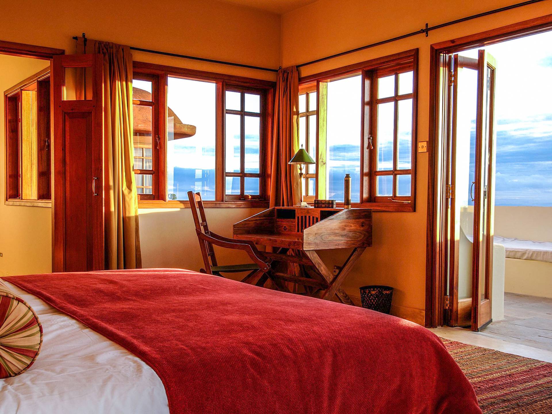 La maison du colonel est construite sur deux étages, il y a deux grandes chambres à l'étage supérieur où vous pouvez choisir un lit king ou des lits jumeaux. Les deux sont luxueusement confortables avec une literie délicieusement douce. Chacune des chambres dispose d'une grande terrasse privée, accessible par des portes à double vitrage pour profiter et absorber les vues panoramiques. Ils disposent également de vestiaires, de baignoires encastrées et d'une salle de douche sans toit. Dans le passage entre les chambres, il y a un bel exemple de vitrail Kitengela fait à la main. Un escalier majestueux mène au salon - un endroit idéal pour prendre un apéritif et raconter des histoires après le dîner. De l'autre côté de la cour se trouve la salle à manger décorée de cartes anciennes et où vous pourrez prendre des repas intimes ensemble. À l'extérieur, sur la grande terrasse, il y a un petit bassin profond pour se rafraîchir du soleil de midi.