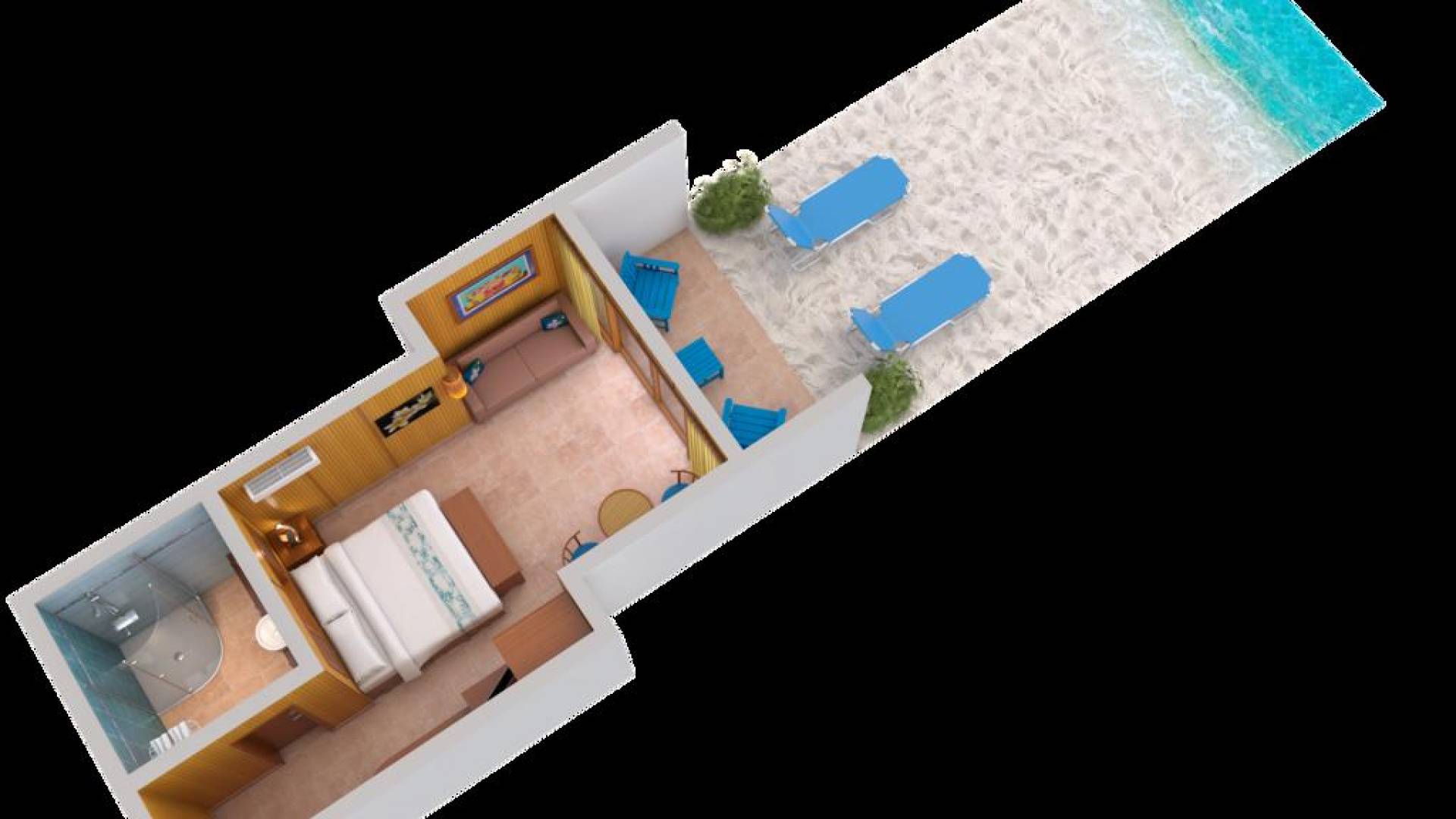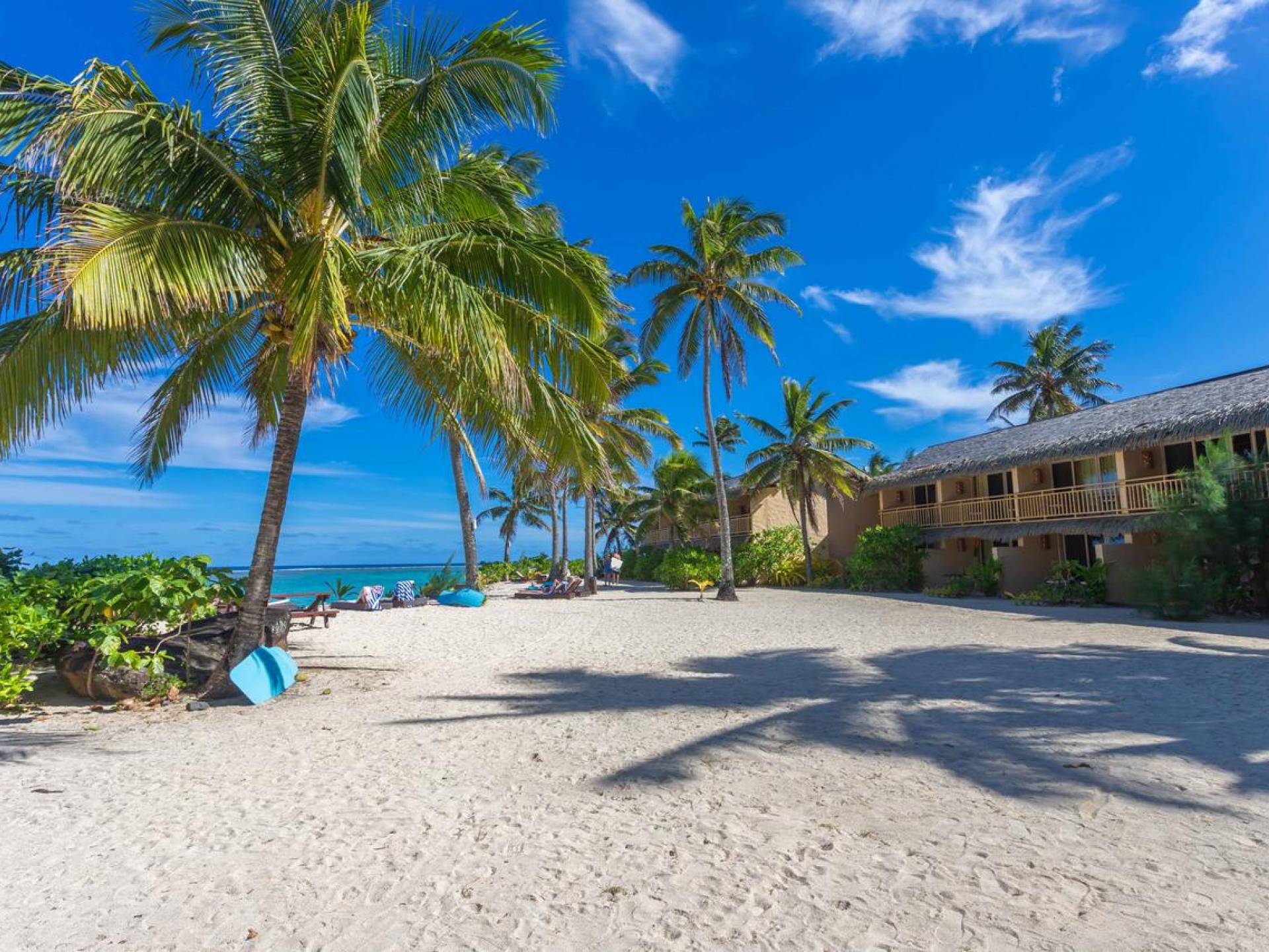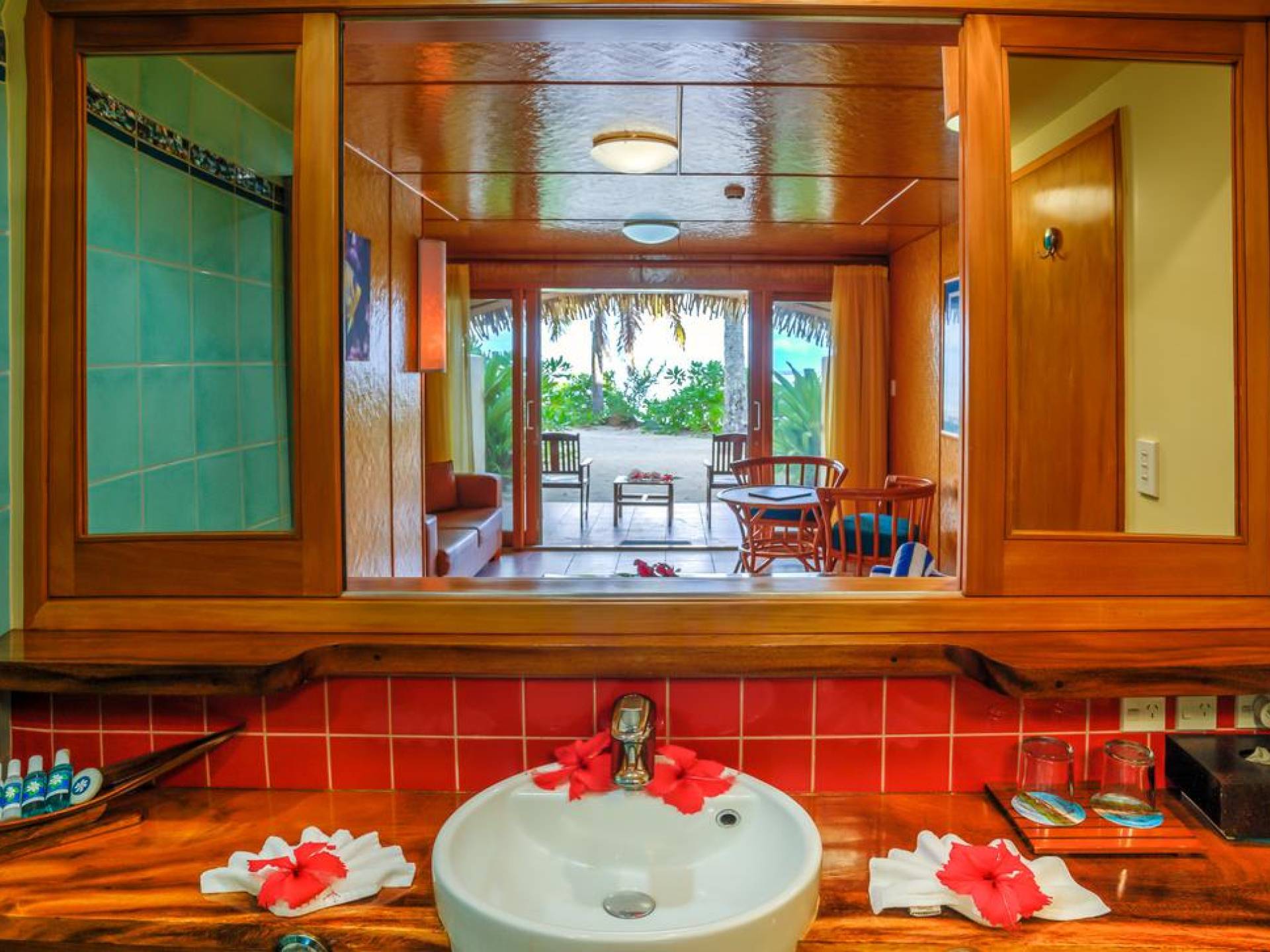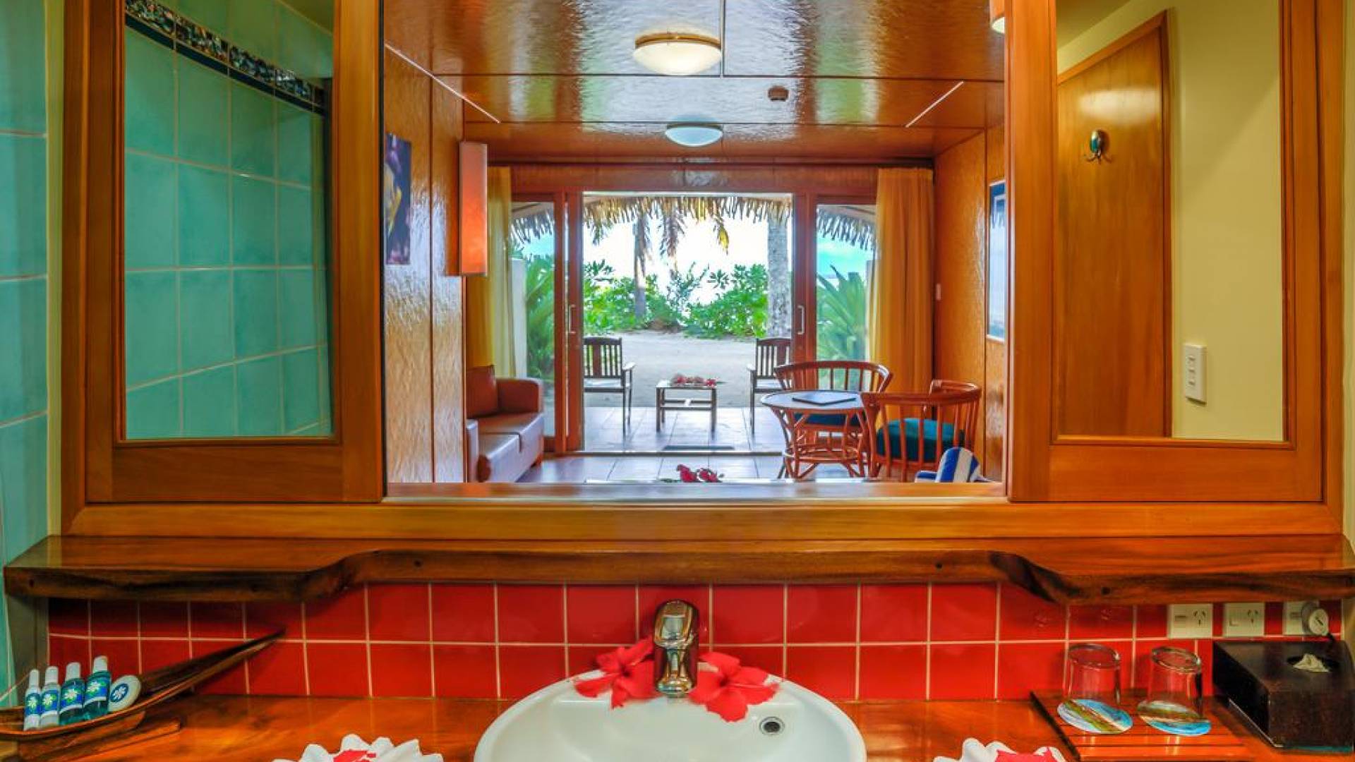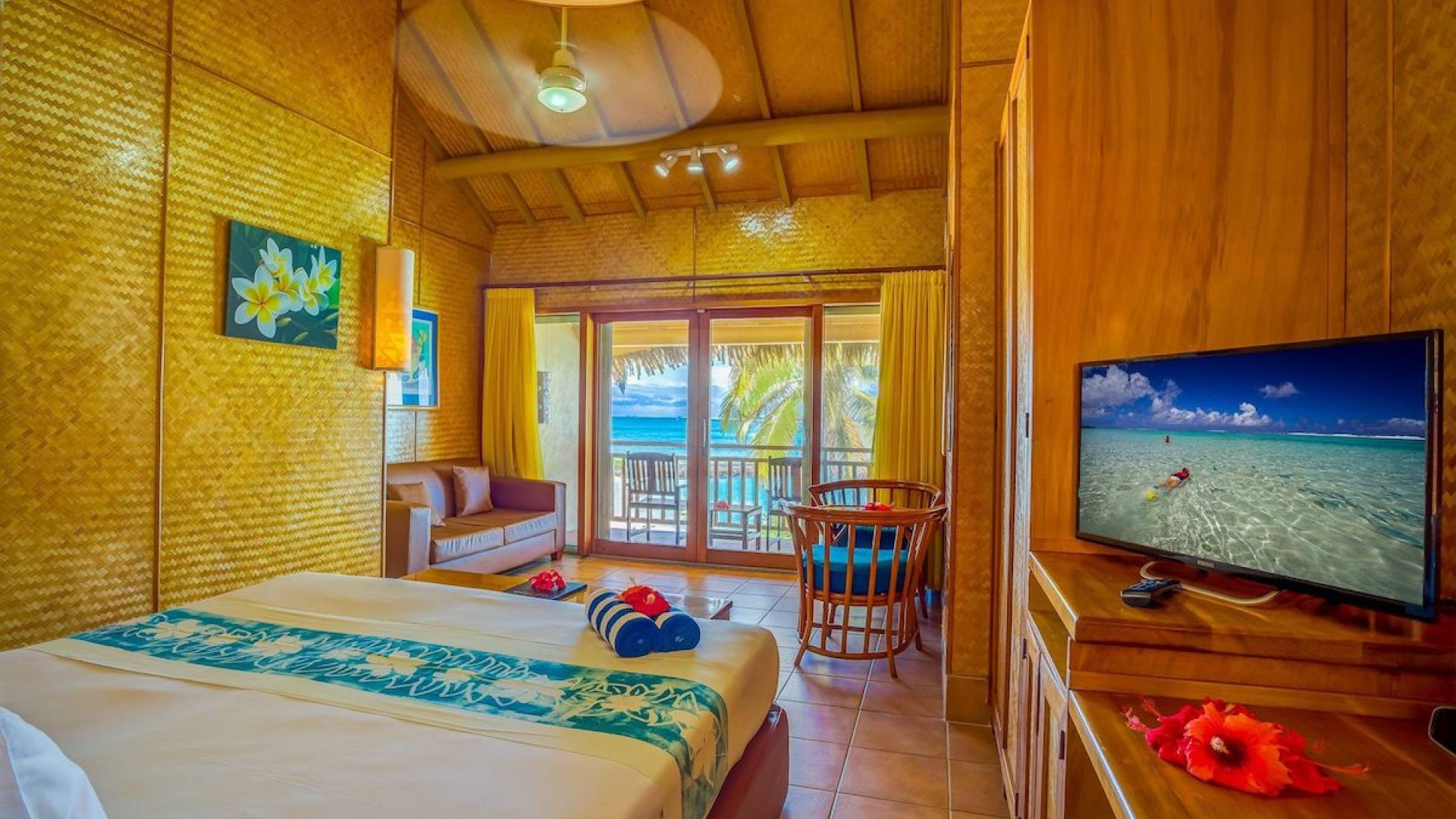 Les suites de luxe en bord de mer ont l'impression d'être dans votre propre hutte natale, directement sur la plage. Les 48 suites sont situées directement sur le sable blanc d'Aroa Beach avec une vue fabuleuse sur le lagon et offrent une expérience insulaire distinctive avec un décor tropical des mers du Sud et de beaux rendez-vous, y compris une superbe salle de bain carrelée avec des accents de nacre noire, une spacieuse douche en verre incurvé et dessus de vanité en arbre de pluie avec lavabo en porcelaine design, murs doublés de rotin, éclairage et œuvres d'art fabriqués à la main, meubles en rotin, armoire et bureau en kauri tropical et excellent flux intérieur-extérieur à travers des portes coulissantes à grande ouverture encadrées en kauri tropical.