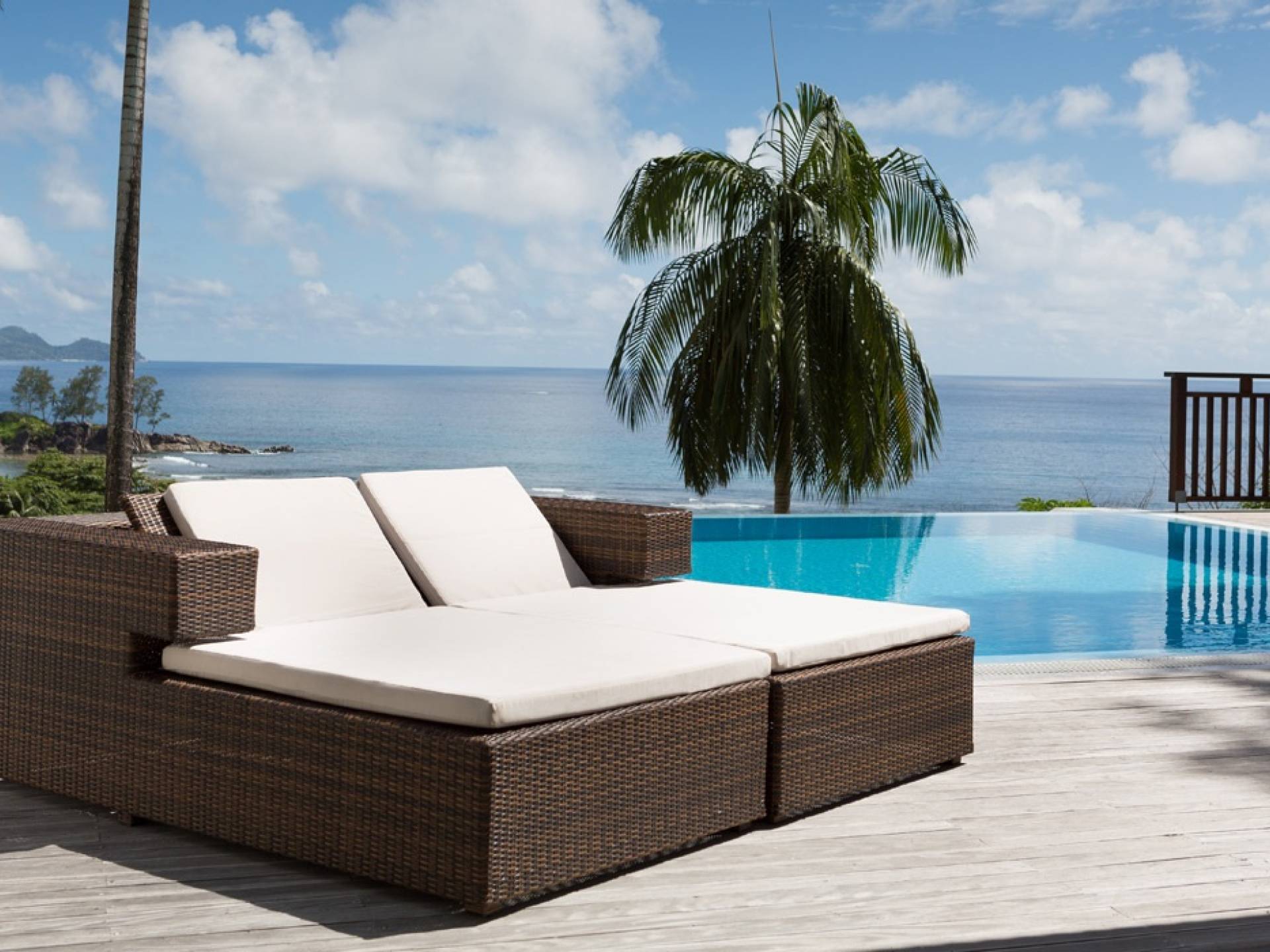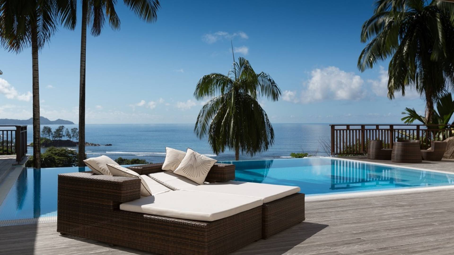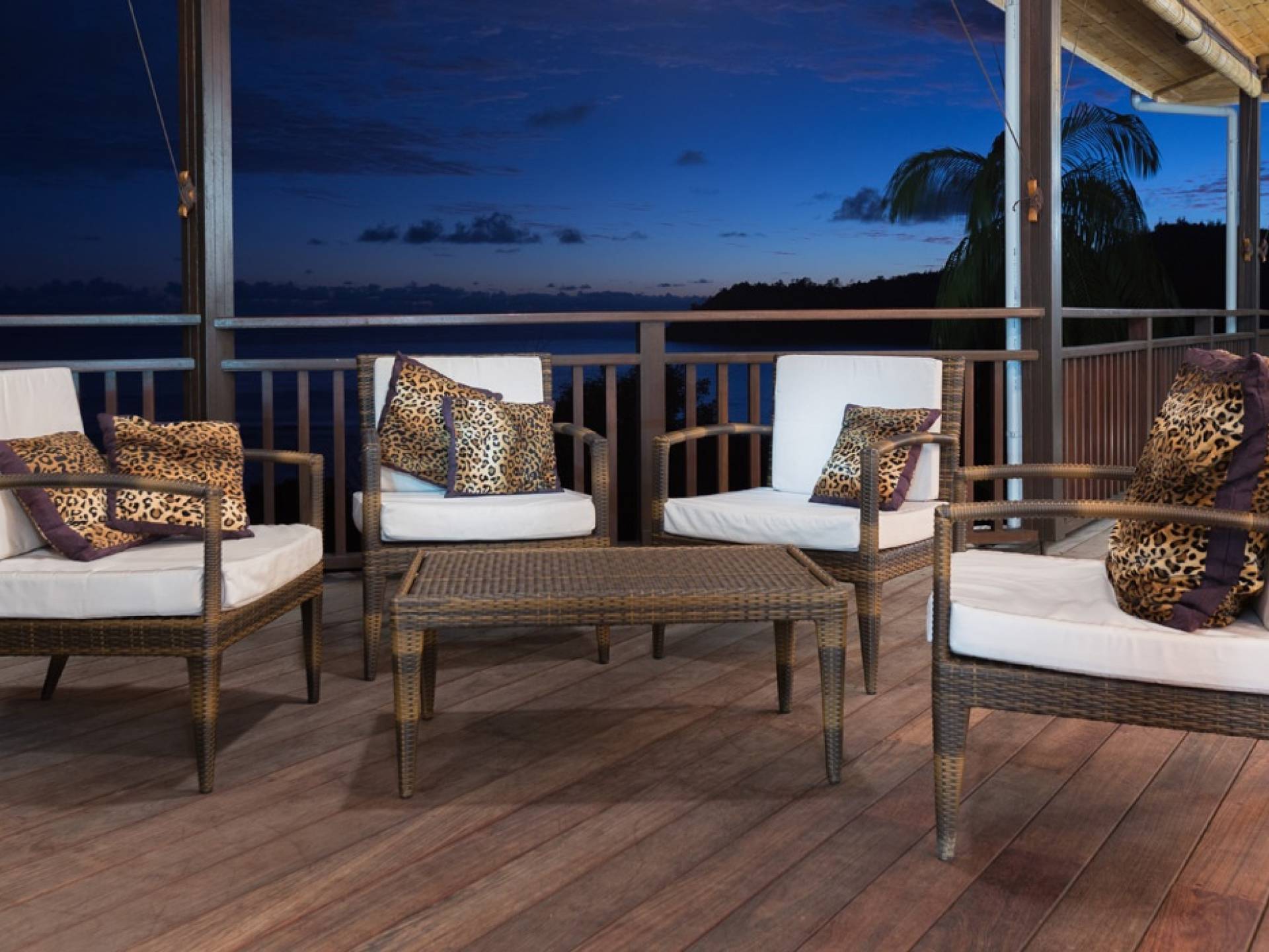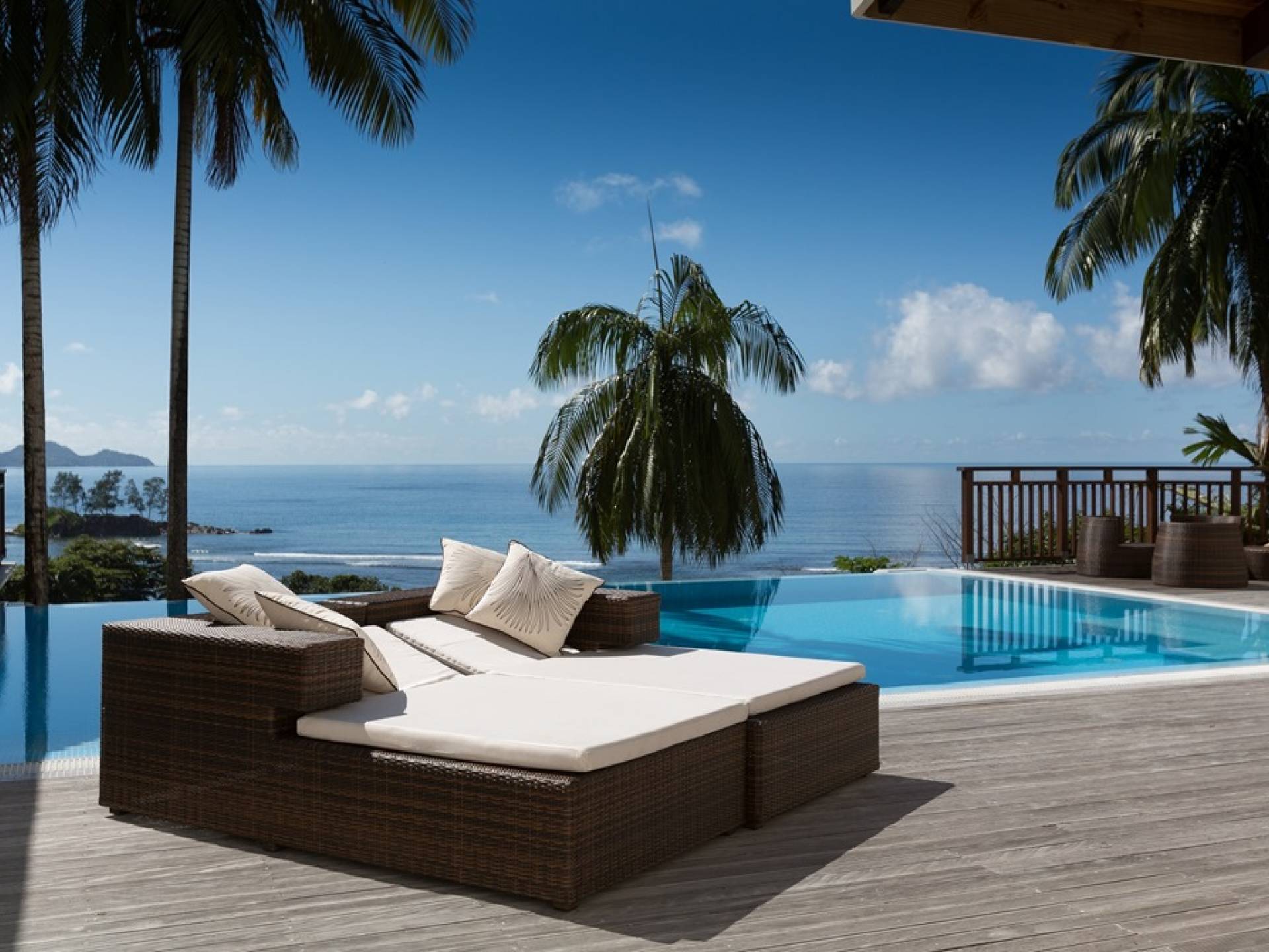 Une terrasse spacieuse avec des banquettes-lits et des sièges en rotin offrant une vue spectaculaire sur l'océan. La villa Queen a sa propre piscine à débordement. La piscine dispose d'une cuisine extérieure avec un minibar. Les délicieux plats seront préparés par un Chef privé qui est à votre entière disposition.
