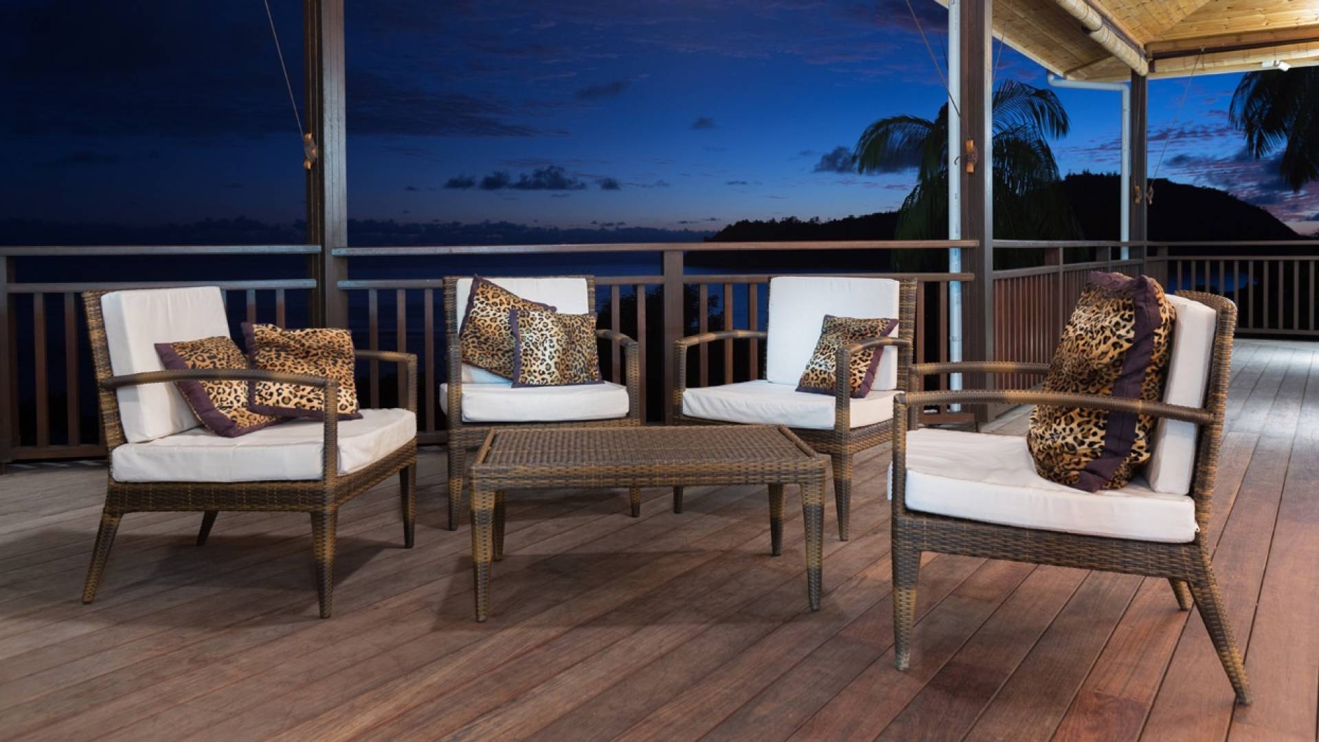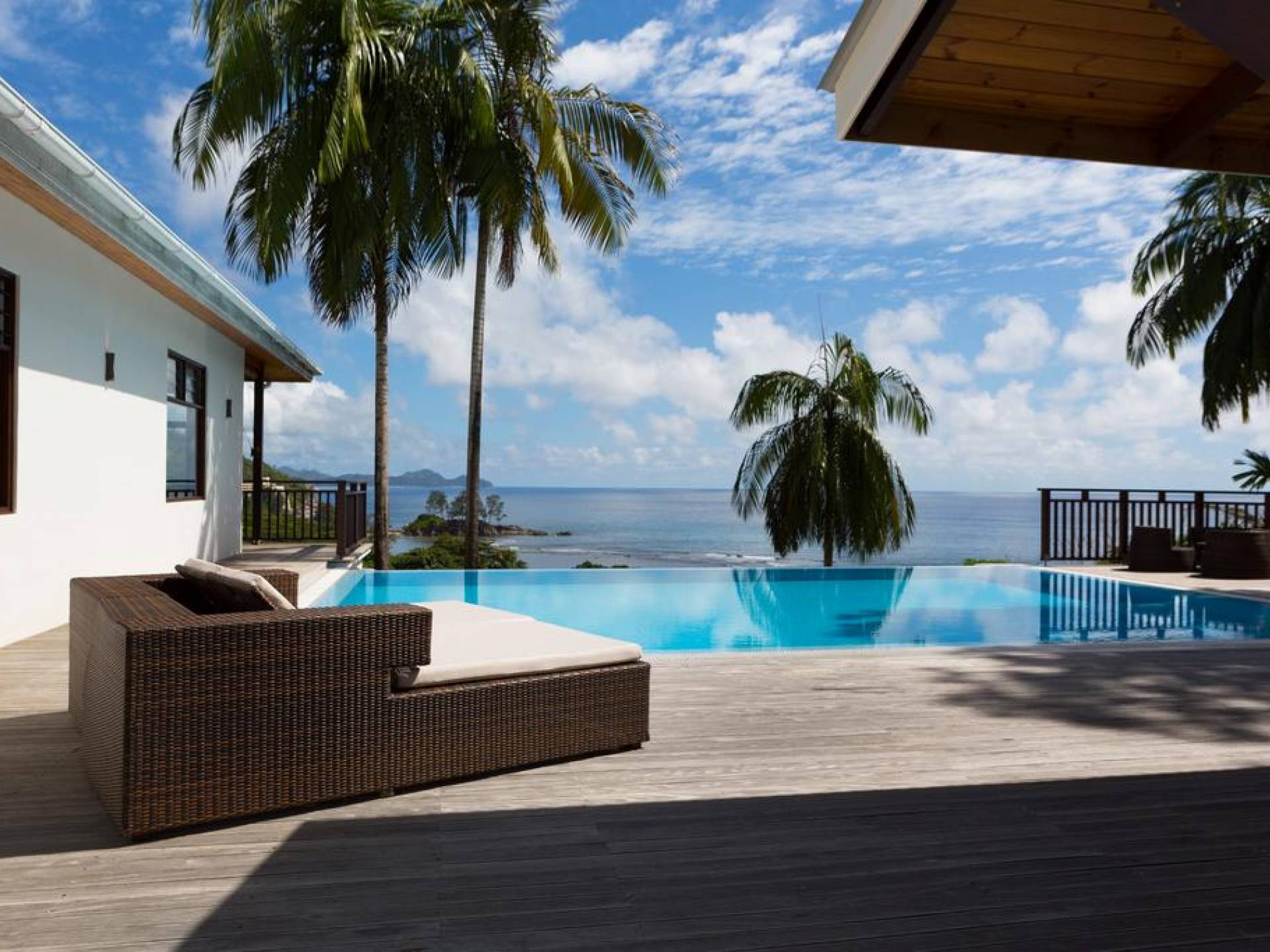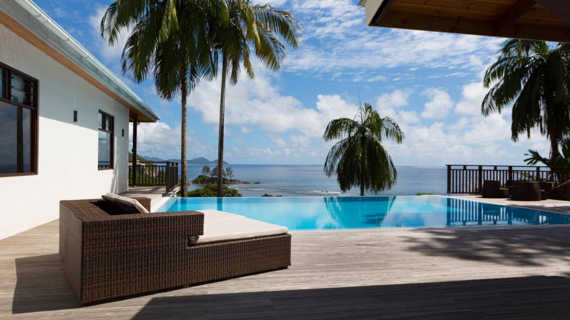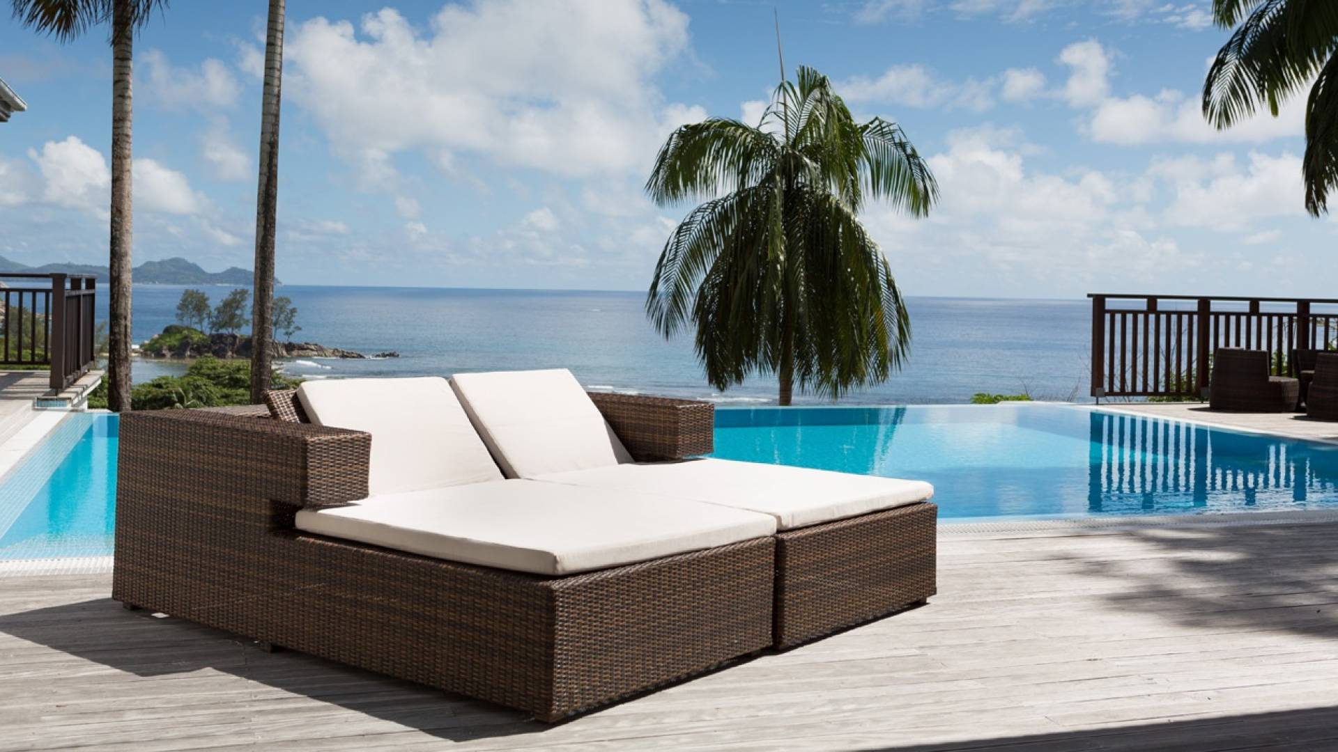 Une terrasse spacieuse avec des banquettes-lits et des sièges en rotin offrant une vue spectaculaire sur l'océan. La villa Queen a sa propre piscine à débordement. La piscine dispose d'une cuisine extérieure avec un minibar. Les délicieux plats seront préparés par un Chef privé qui est à votre entière disposition.