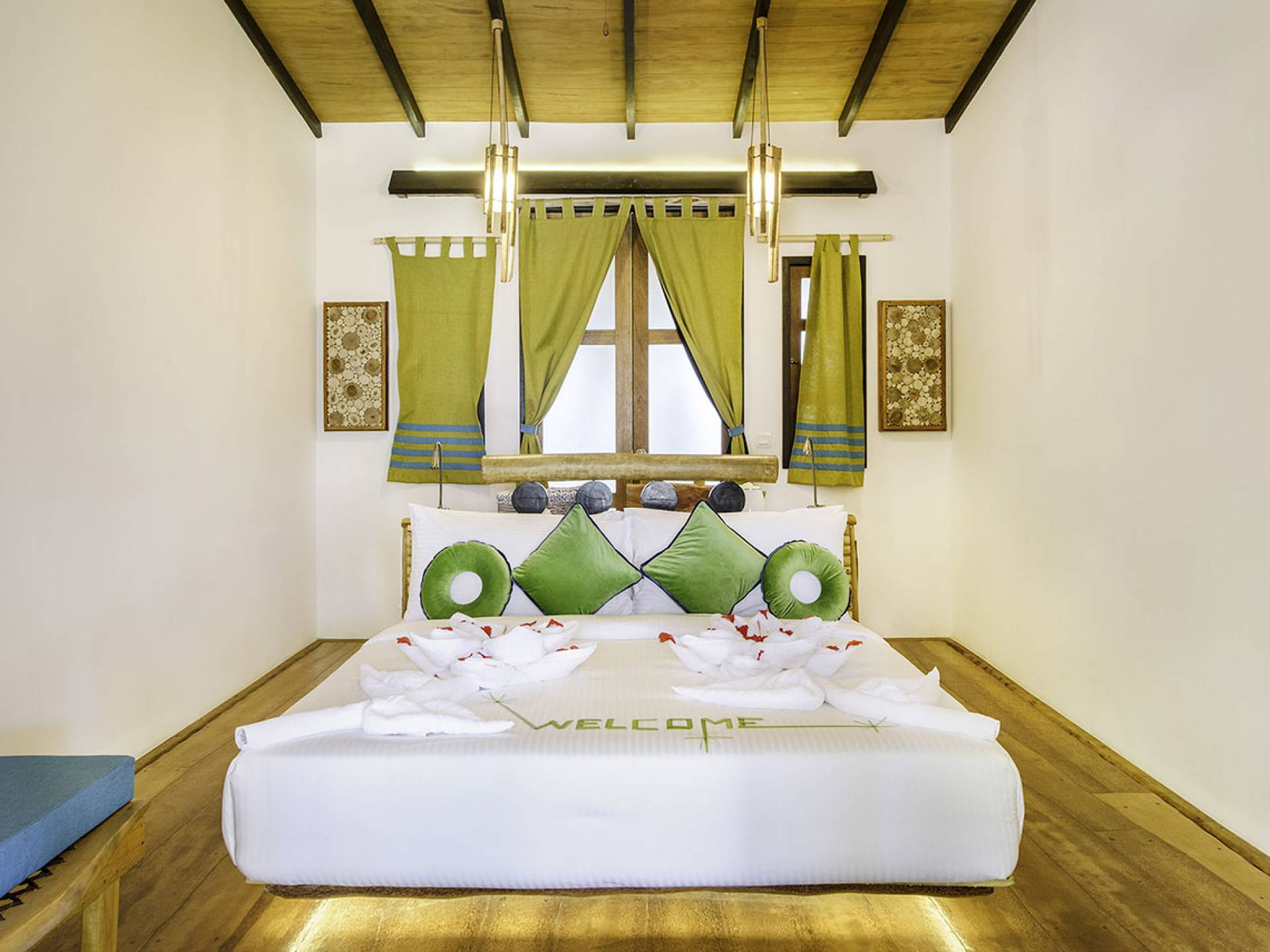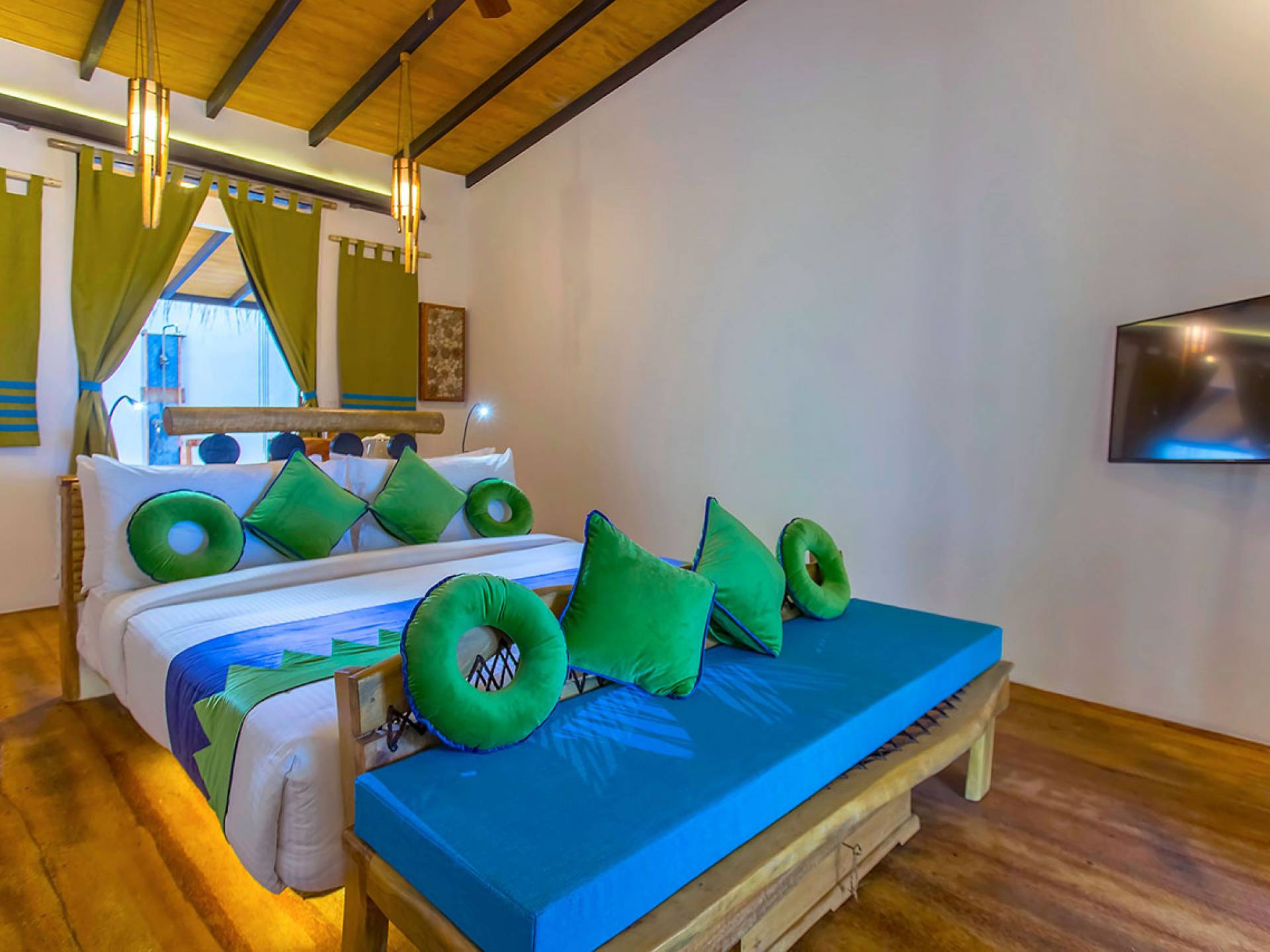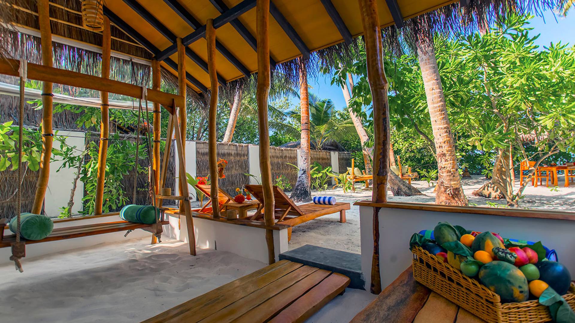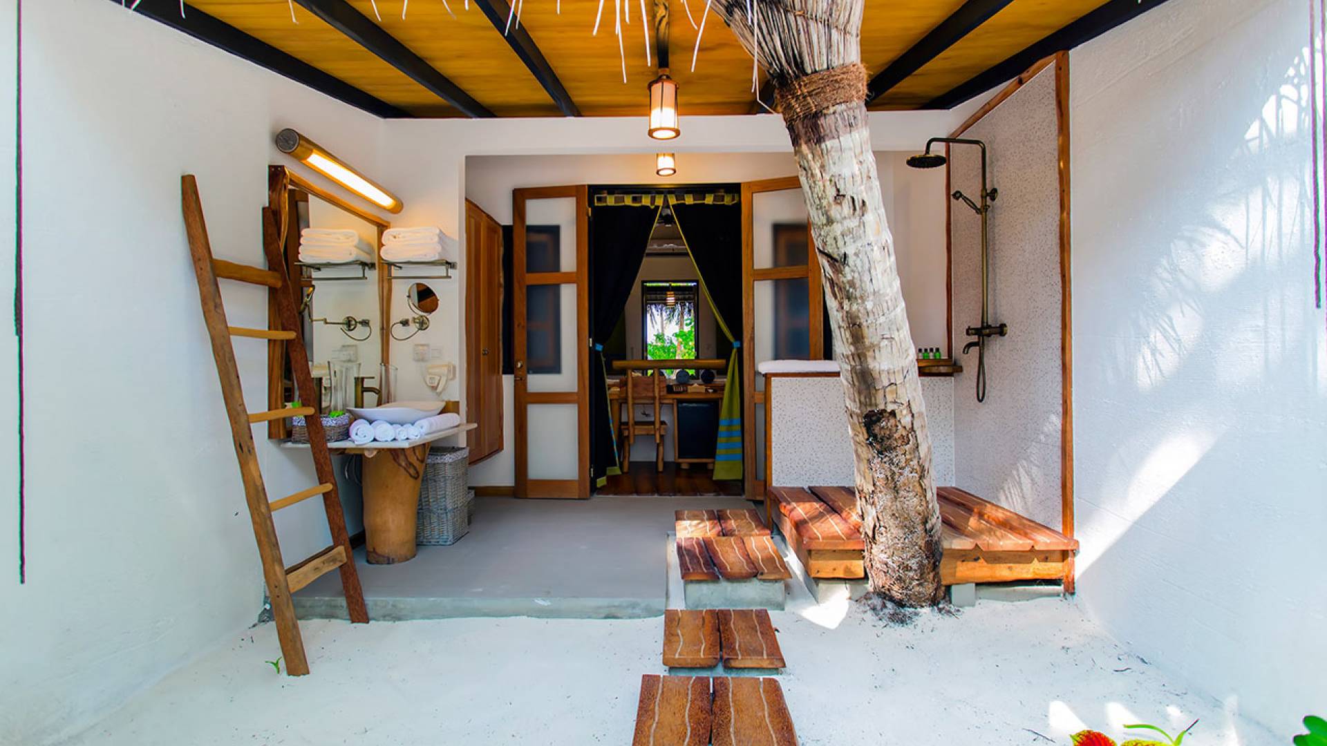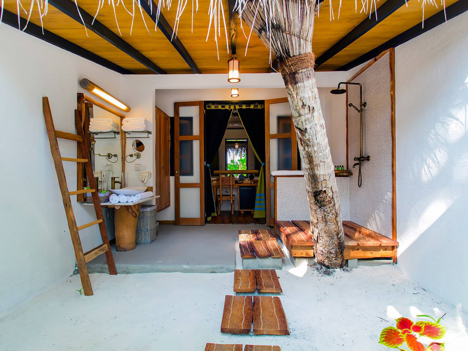 Chaque chambre dispose d'une terrasse extérieure en bois de coco avec des écrans d'intimité. Les portes sont conçues pour ressembler au style traditionnel maldivien des boiseries et de la menuiserie utilisé dans le passé. De même, l'utilisation de cordes fabriquées localement et d'autres parties des cocotiers en font une pièce véritablement maldivienne. Même les rideaux ont été sélectionnés avec des couleurs vives et des matériaux utilisés dans les maisons locales il y a plus de 30 ans. Les luminaires, les canapés et les chaises à l'intérieur de la pièce sont tous fabriqués à la main avec du bois local.