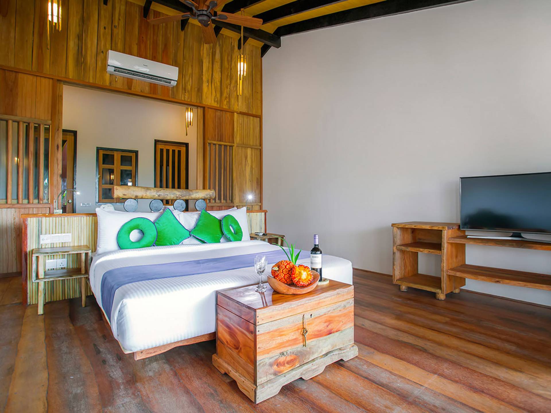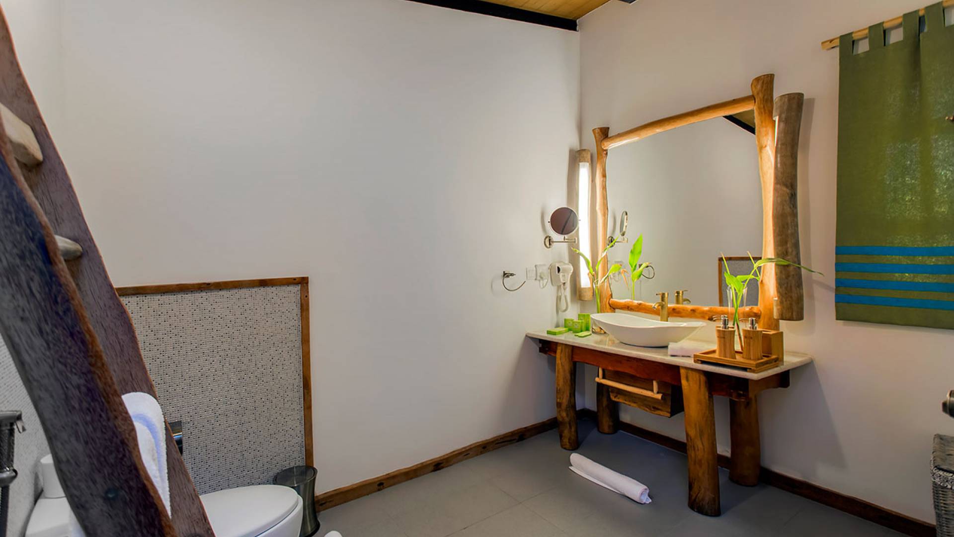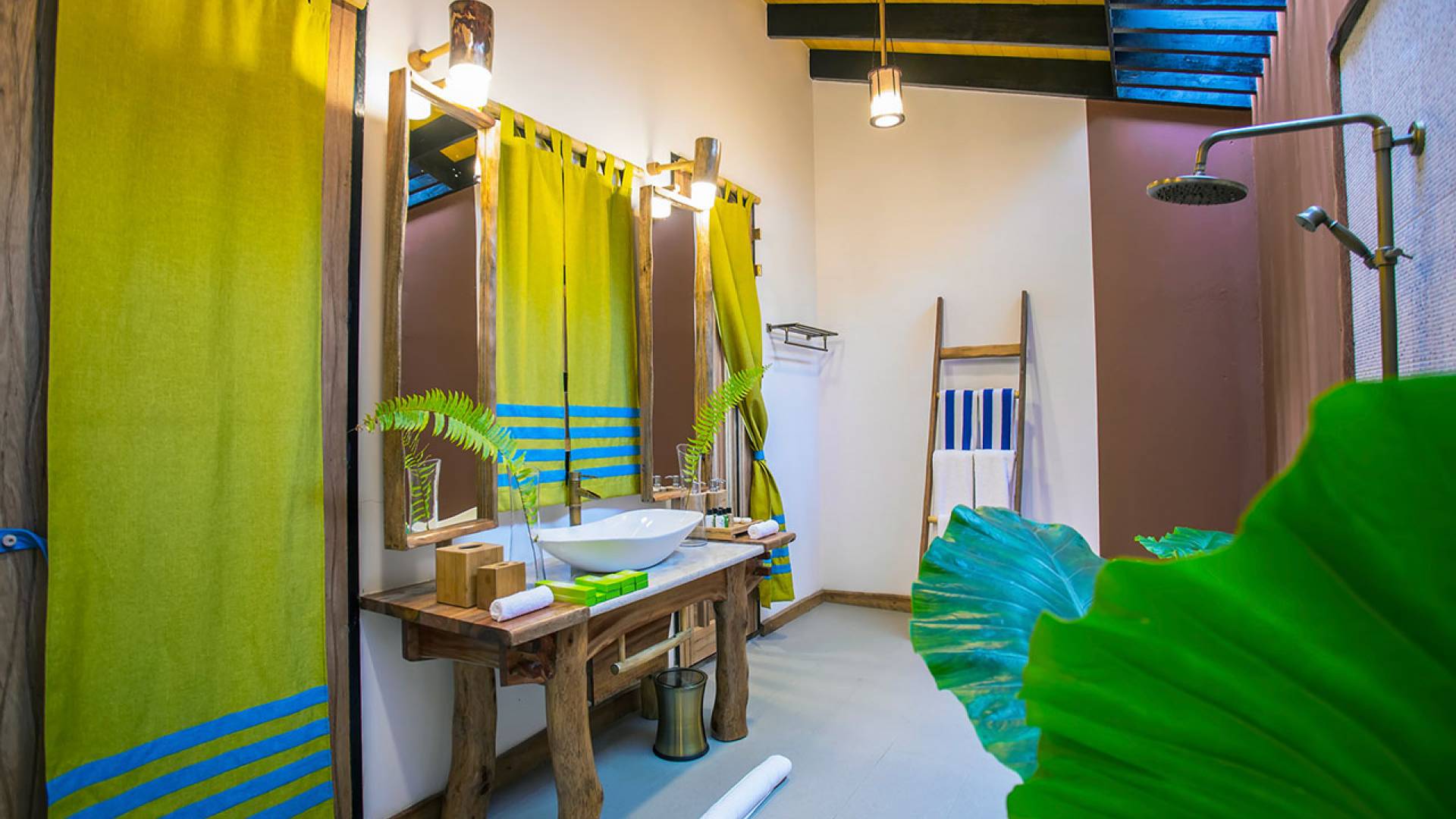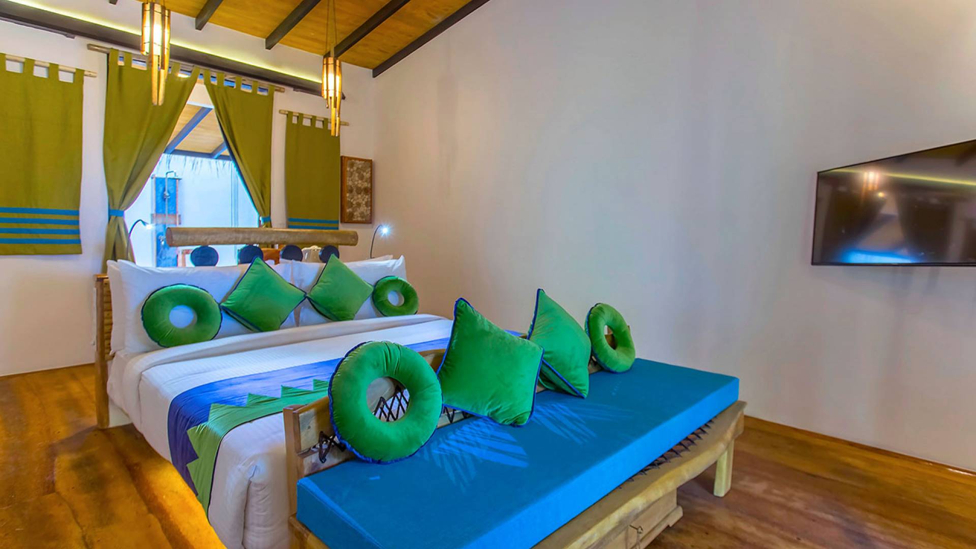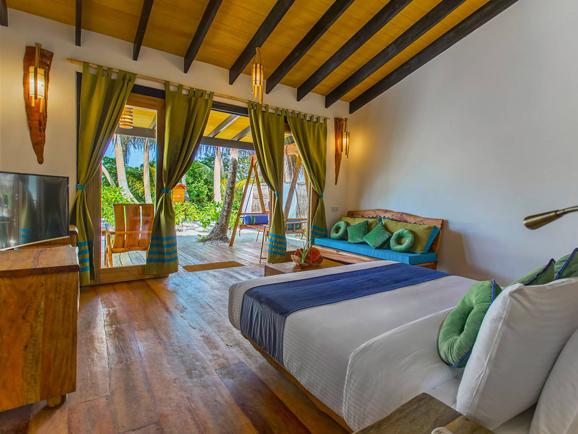 Chaque chambre dispose d'une terrasse extérieure en bois de coco avec des écrans d'intimité. Les portes sont conçues pour ressembler au style traditionnel maldivien des boiseries et de la menuiserie utilisé dans le passé. De même, l'utilisation de cordes fabriquées localement et d'autres parties des cocotiers en font une pièce véritablement maldivienne. Même les rideaux ont été sélectionnés avec des couleurs vives et des matériaux utilisés dans les maisons locales il y a plus de 30 ans. Les luminaires, les canapés et les chaises à l'intérieur de la pièce sont tous fabriqués à la main avec du bois local.