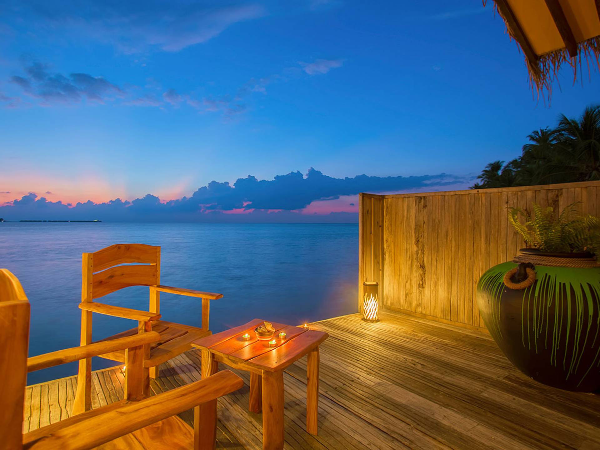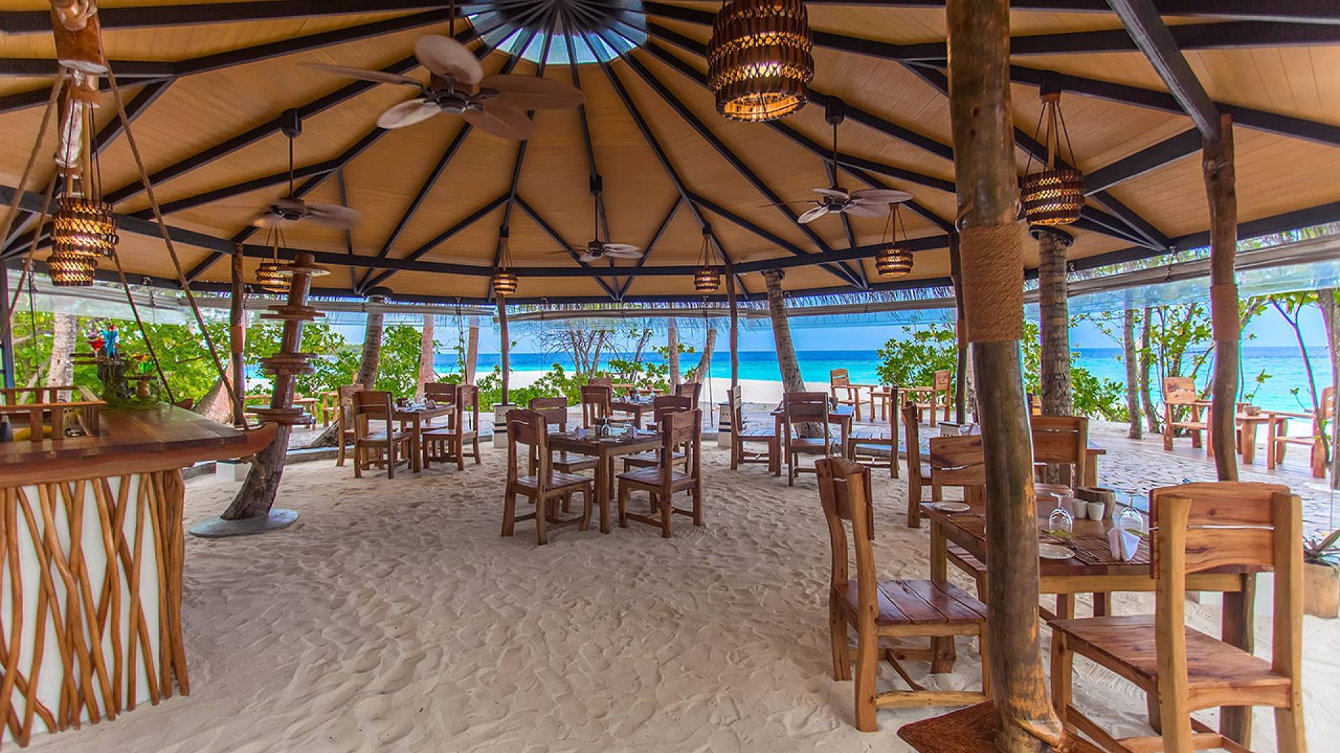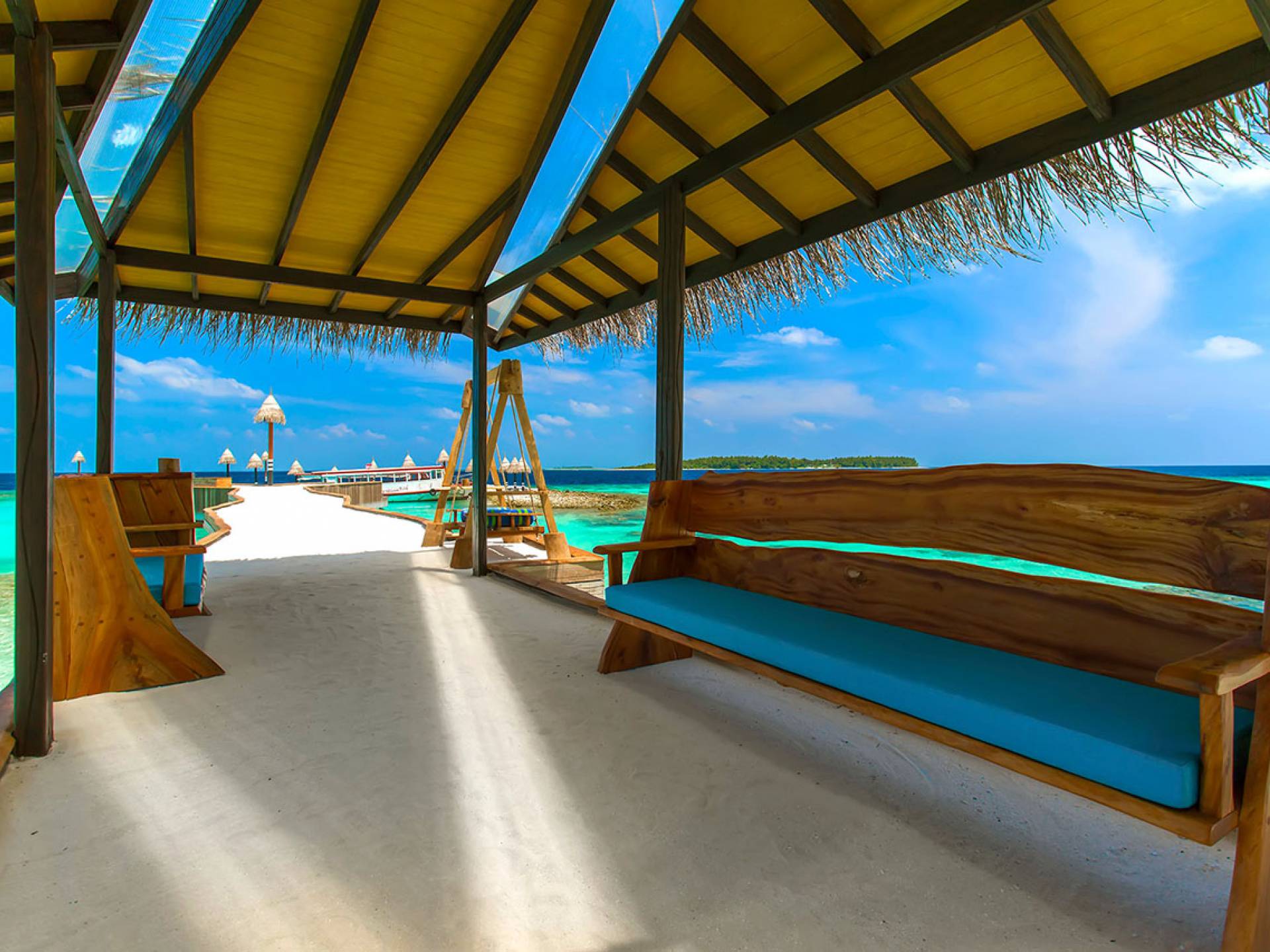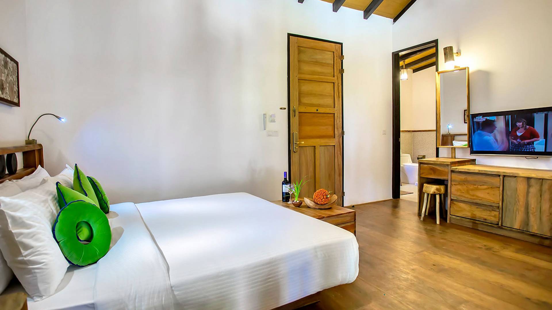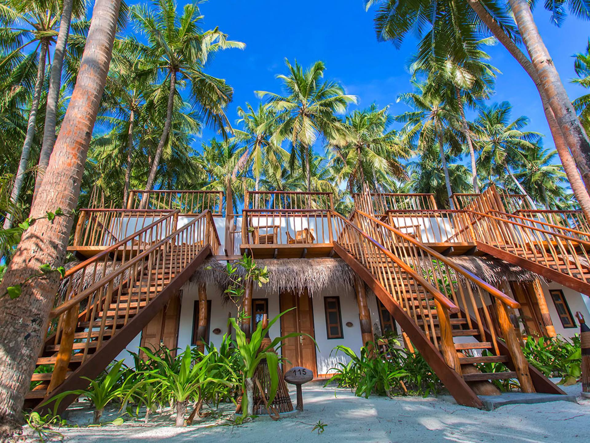 Chaque chambre dispose d'une terrasse extérieure en bois de coco avec des écrans d'intimité. Les portes sont conçues pour ressembler au style traditionnel maldivien des boiseries et de la menuiserie utilisé dans le passé. De même, l'utilisation de cordes fabriquées localement et d'autres parties des cocotiers en font une pièce véritablement maldivienne. Même les rideaux ont été sélectionnés avec des couleurs vives et des matériaux utilisés dans les maisons locales il y a plus de 30 ans. Les luminaires, les canapés et les chaises à l'intérieur de la pièce sont tous fabriqués à la main avec du bois local.