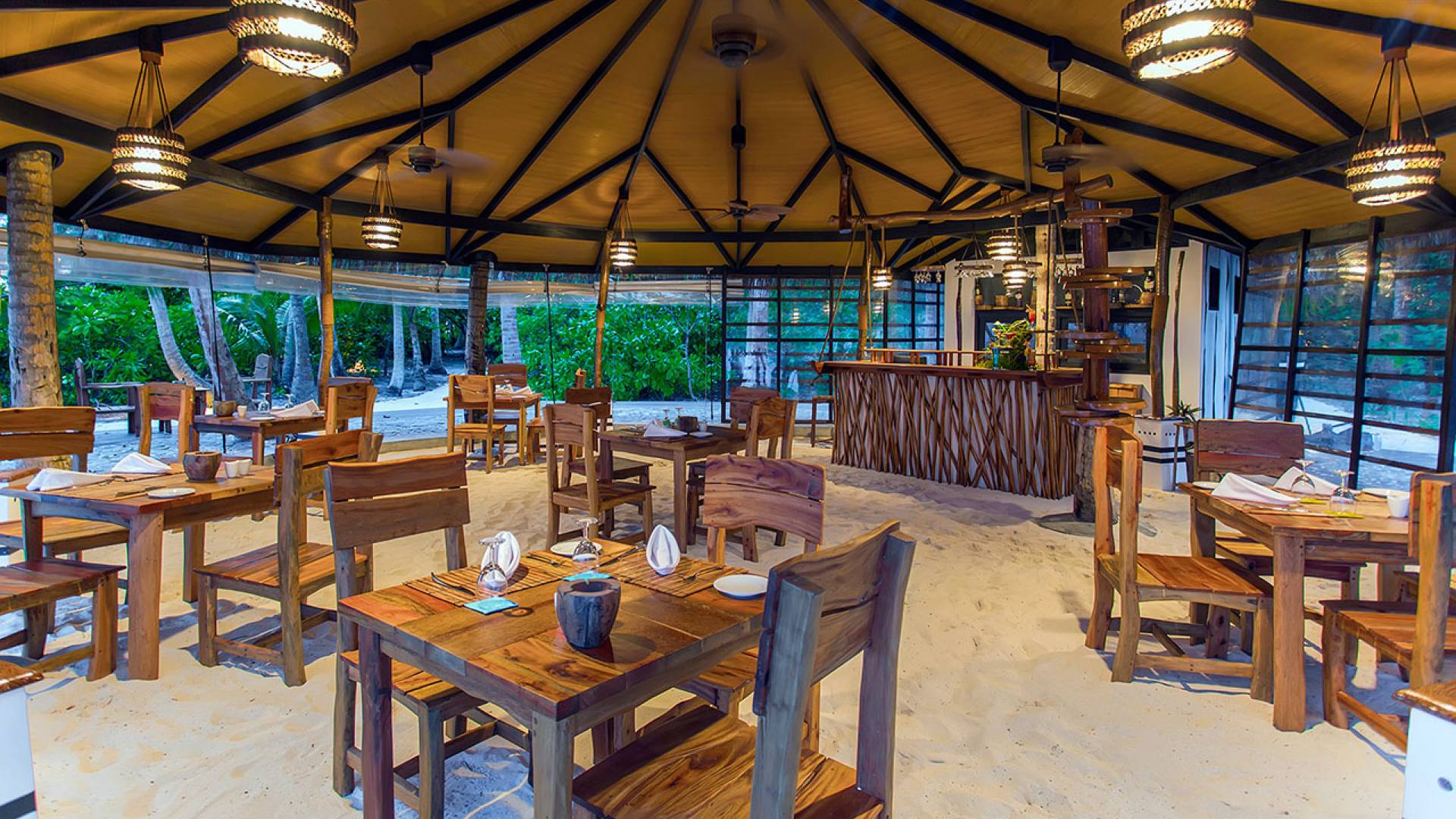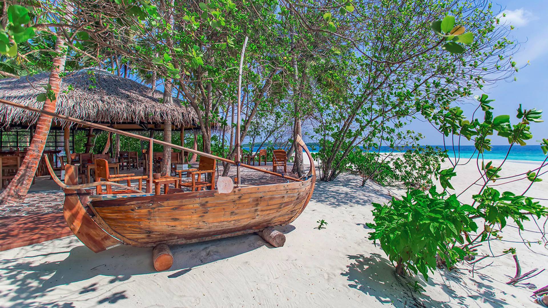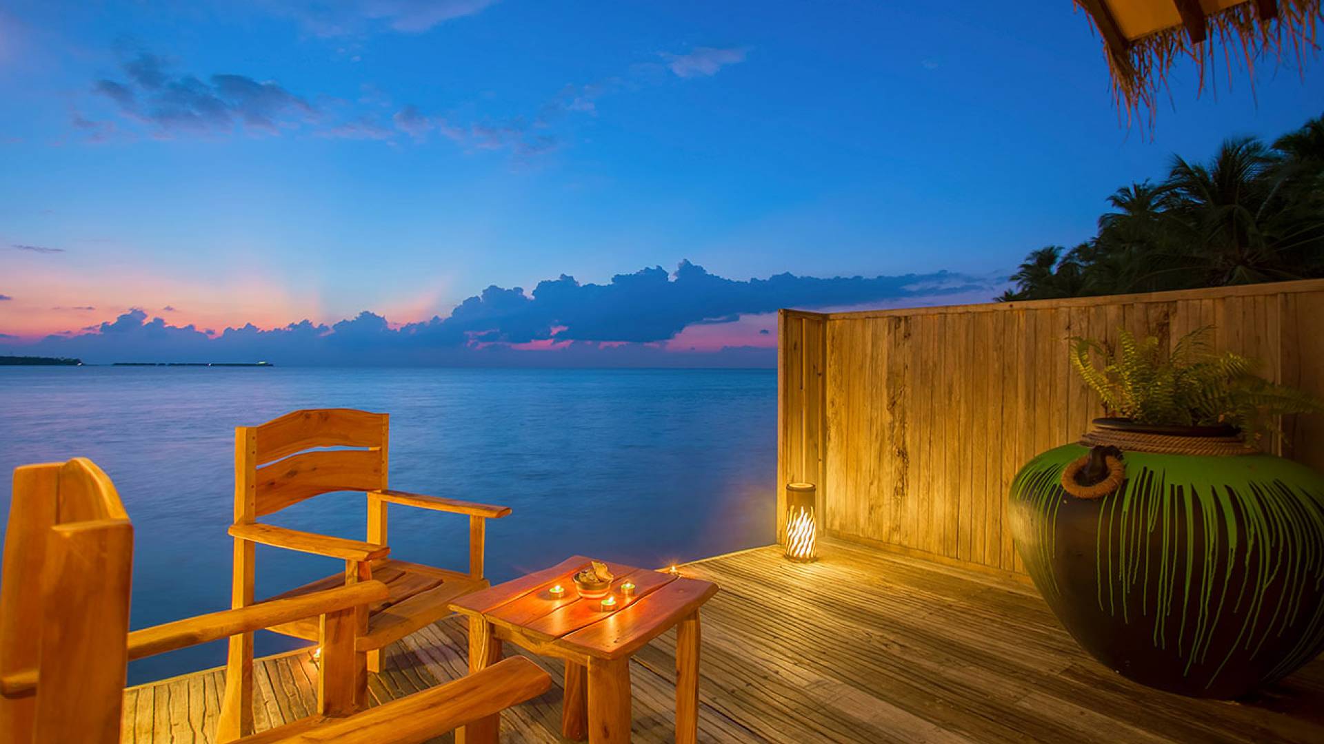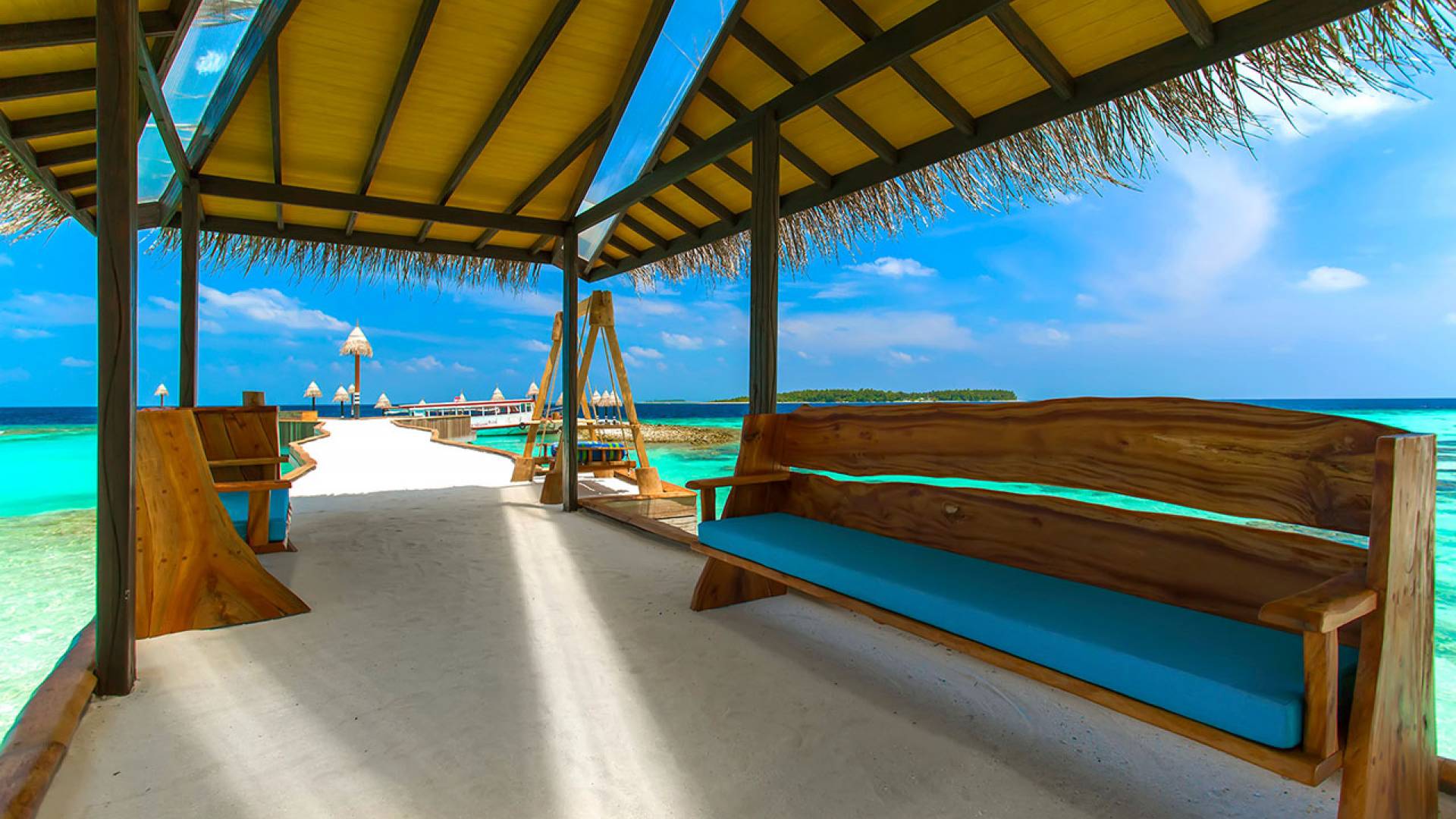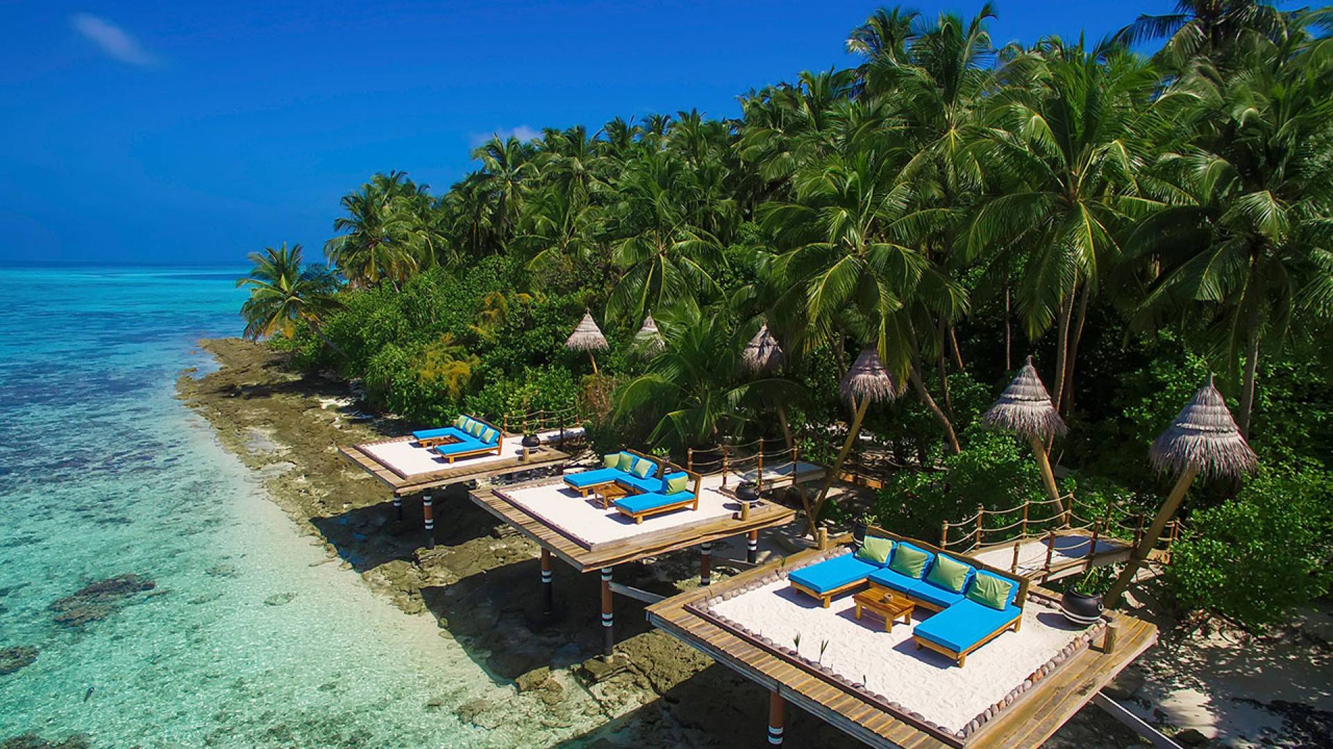 Chaque chambre dispose d'une terrasse extérieure en bois de coco avec des écrans d'intimité. Les portes sont conçues pour ressembler au style traditionnel maldivien des boiseries et de la menuiserie utilisé dans le passé. De même, l'utilisation de cordes fabriquées localement et d'autres parties des cocotiers en font une pièce véritablement maldivienne. Même les rideaux ont été sélectionnés avec des couleurs vives et des matériaux utilisés dans les maisons locales il y a plus de 30 ans. Les luminaires, les canapés et les chaises à l'intérieur de la pièce sont tous fabriqués à la main avec du bois local.