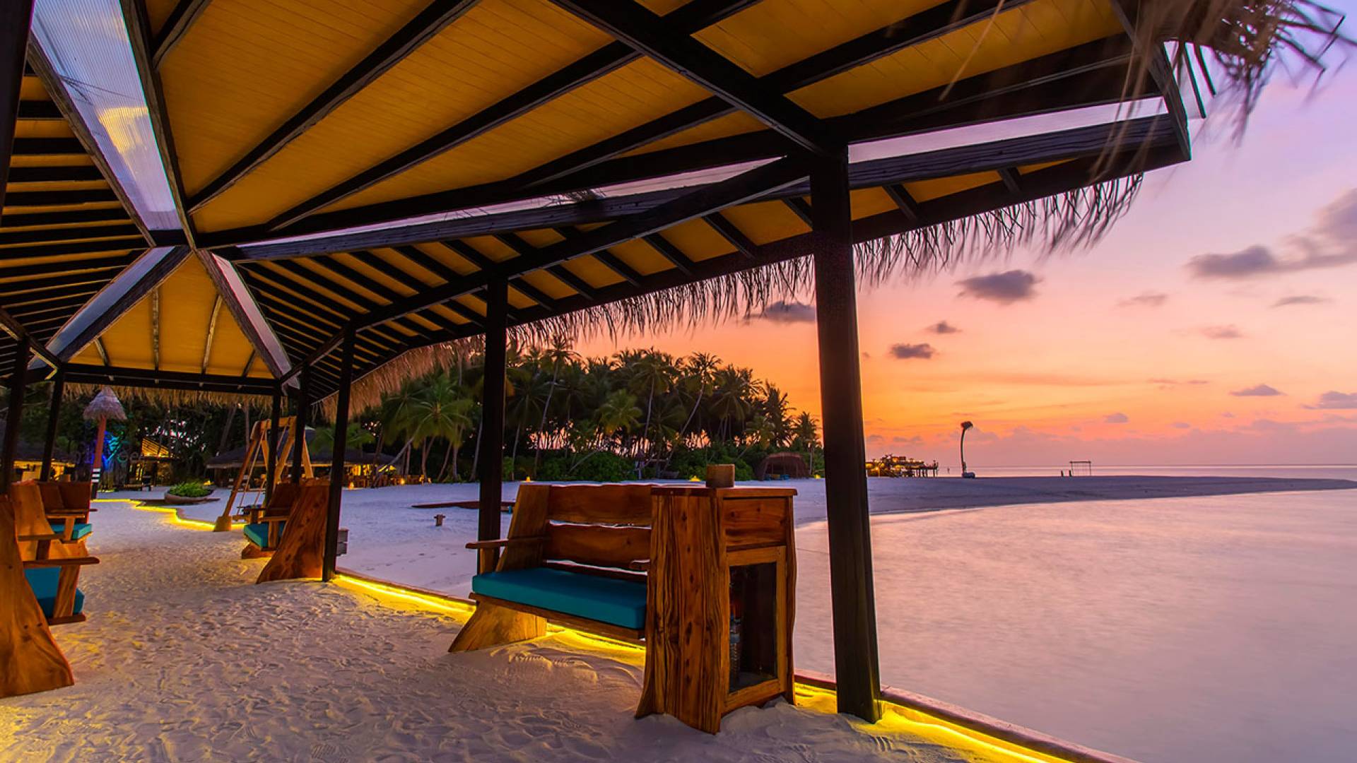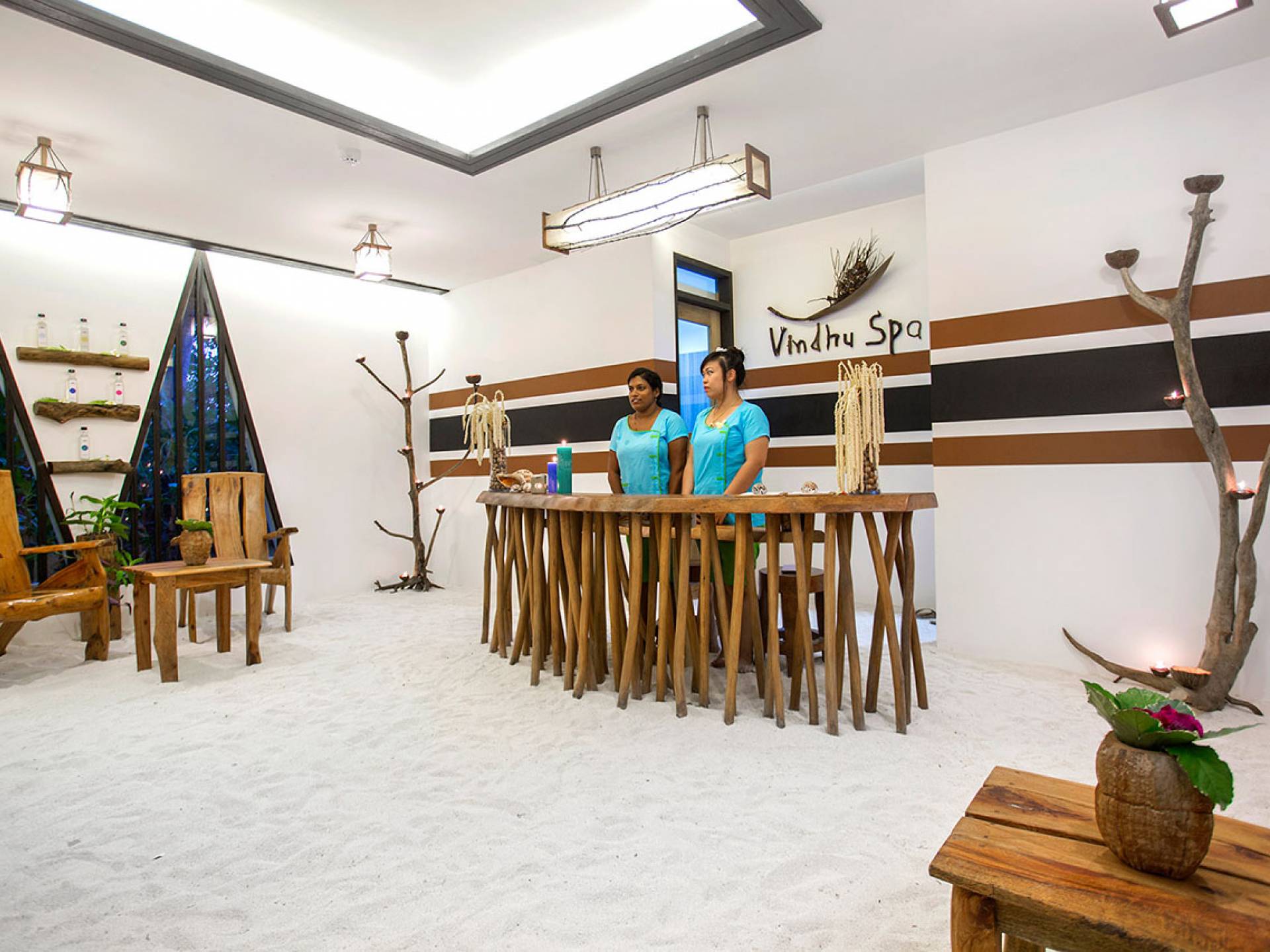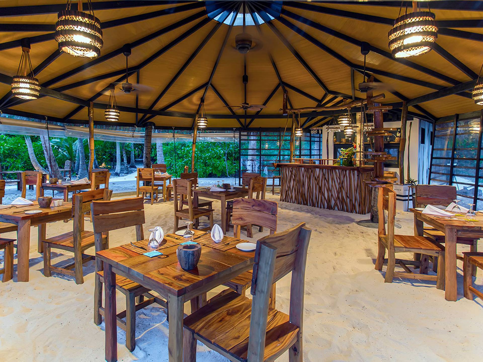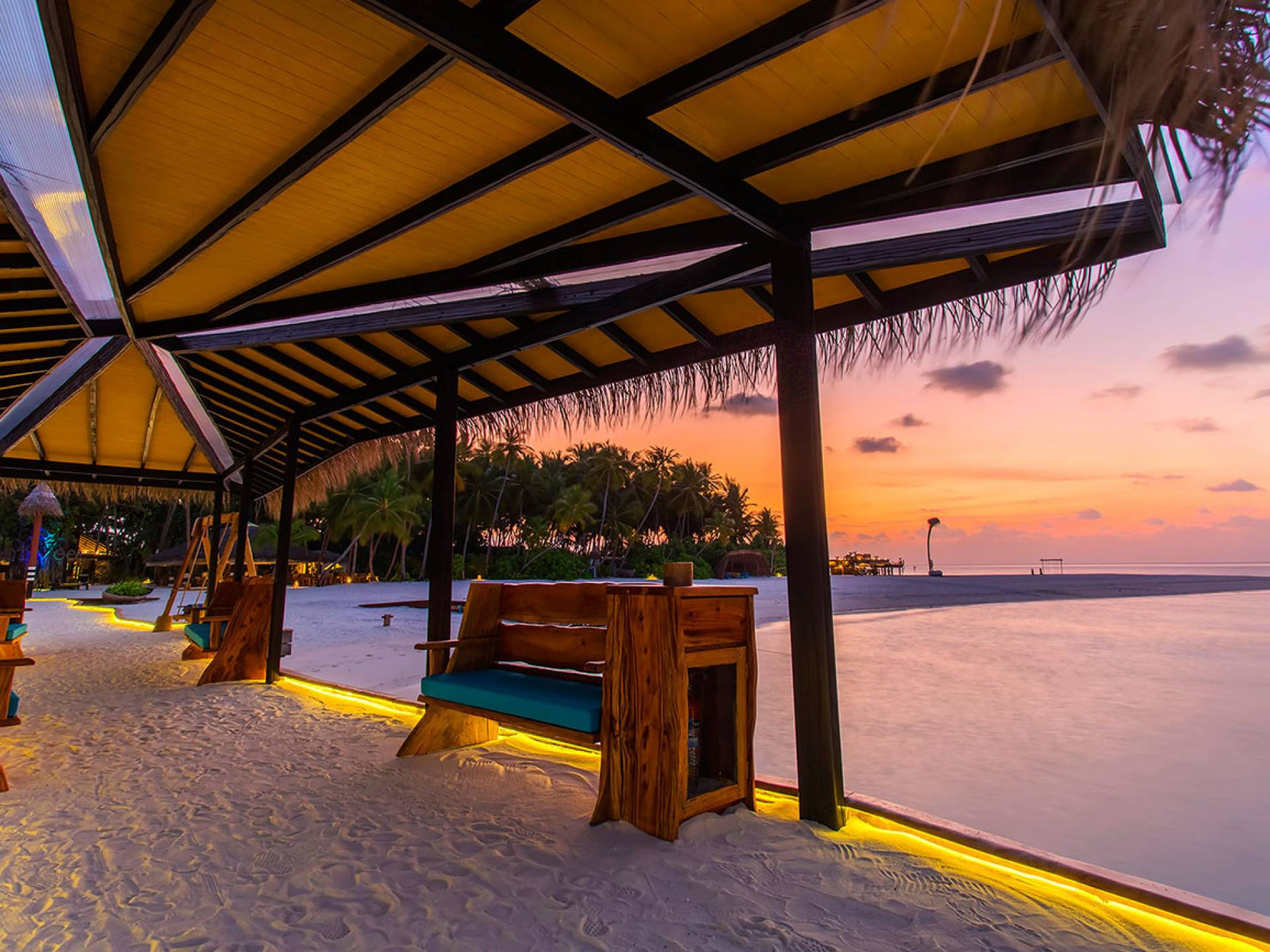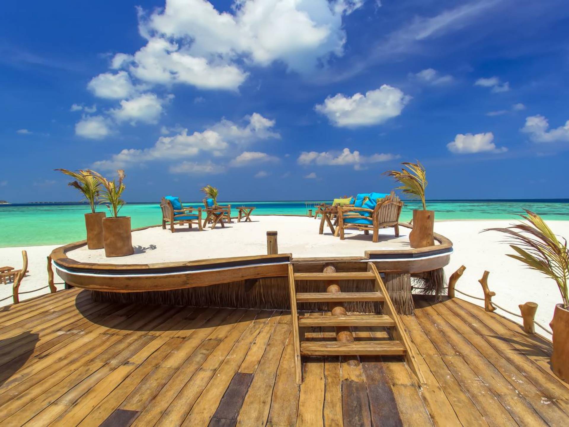 Chaque chambre dispose d'une terrasse extérieure en bois de coco avec des écrans d'intimité. Les portes sont conçues pour ressembler au style traditionnel maldivien des boiseries et de la menuiserie utilisé dans le passé. De même, l'utilisation de cordes fabriquées localement et d'autres parties des cocotiers en font une pièce véritablement maldivienne. Même les rideaux ont été sélectionnés avec des couleurs vives et des matériaux utilisés dans les maisons locales il y a plus de 30 ans. Les luminaires, les canapés et les chaises à l'intérieur de la pièce sont tous fabriqués à la main avec du bois local.
