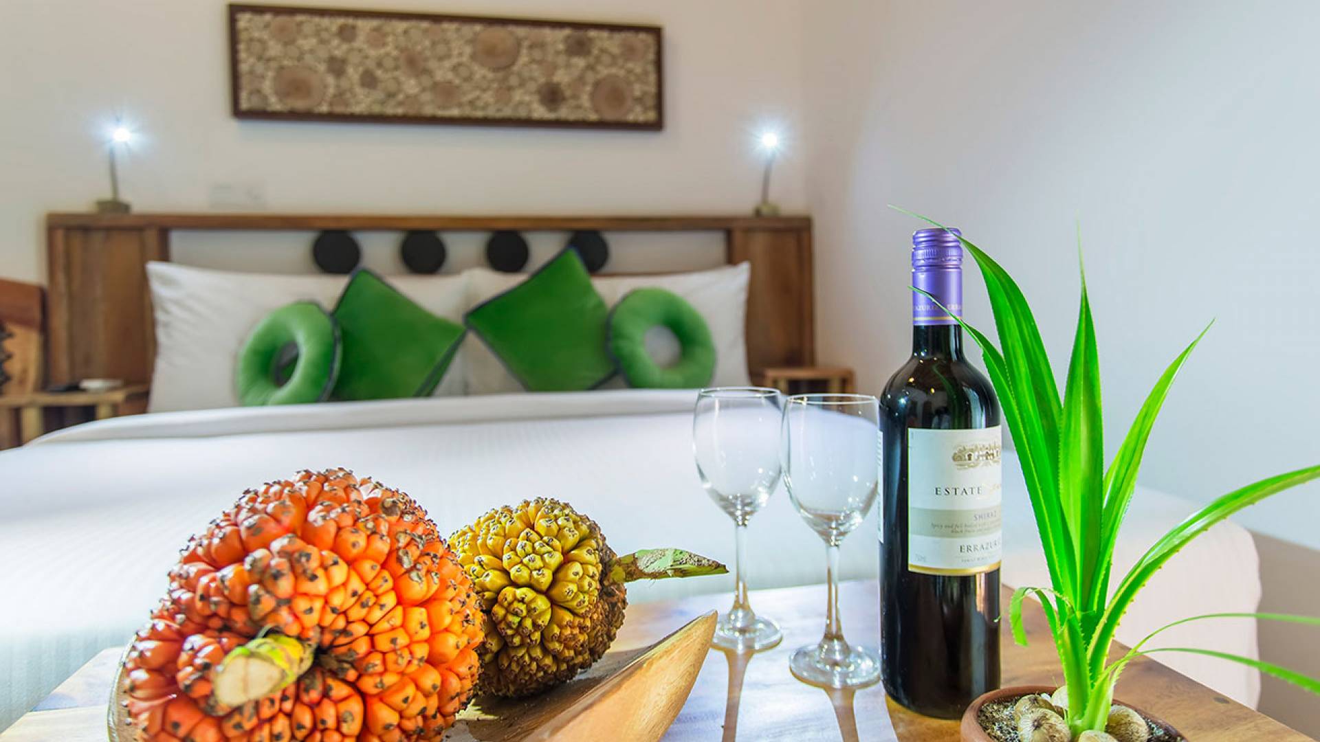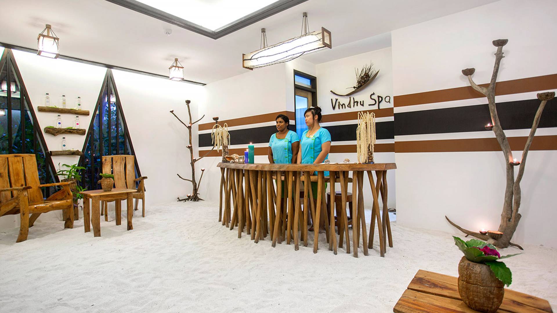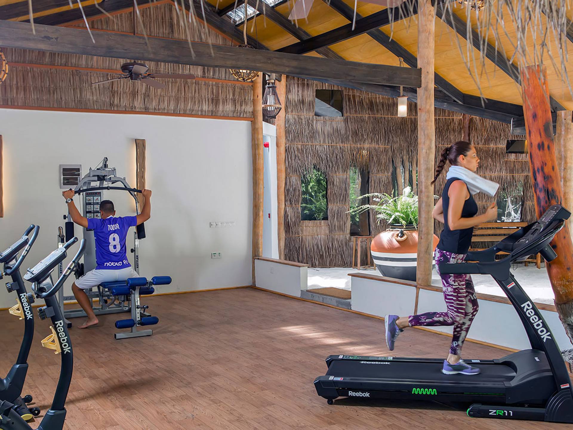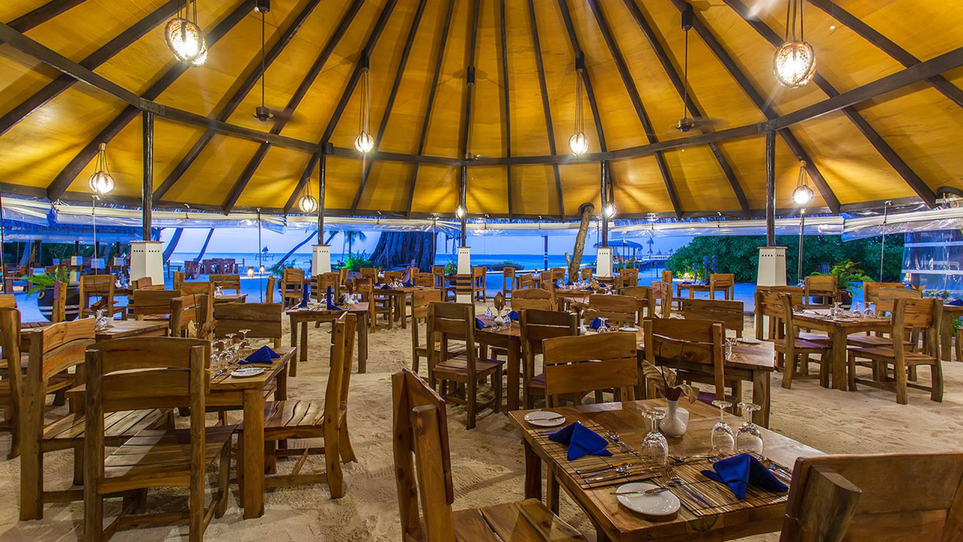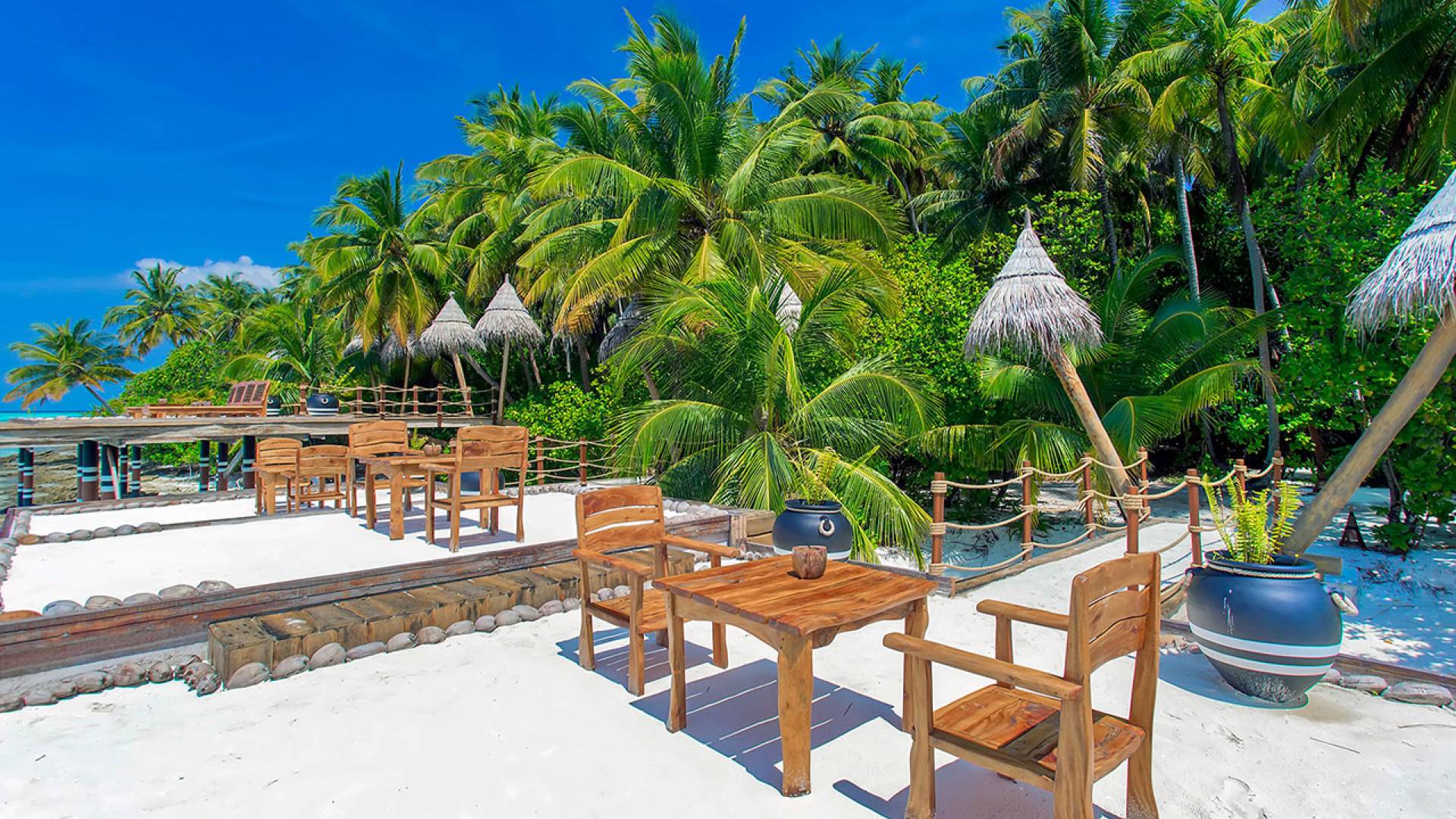 Chaque chambre dispose d'une terrasse extérieure en bois de coco avec des écrans d'intimité. Les portes sont conçues pour ressembler au style traditionnel maldivien des boiseries et de la menuiserie utilisé dans le passé. De même, l'utilisation de cordes fabriquées localement et d'autres parties des cocotiers en font une pièce véritablement maldivienne. Même les rideaux ont été sélectionnés avec des couleurs vives et des matériaux utilisés dans les maisons locales il y a plus de 30 ans. Les luminaires, les canapés et les chaises à l'intérieur de la pièce sont tous fabriqués à la main avec du bois local.