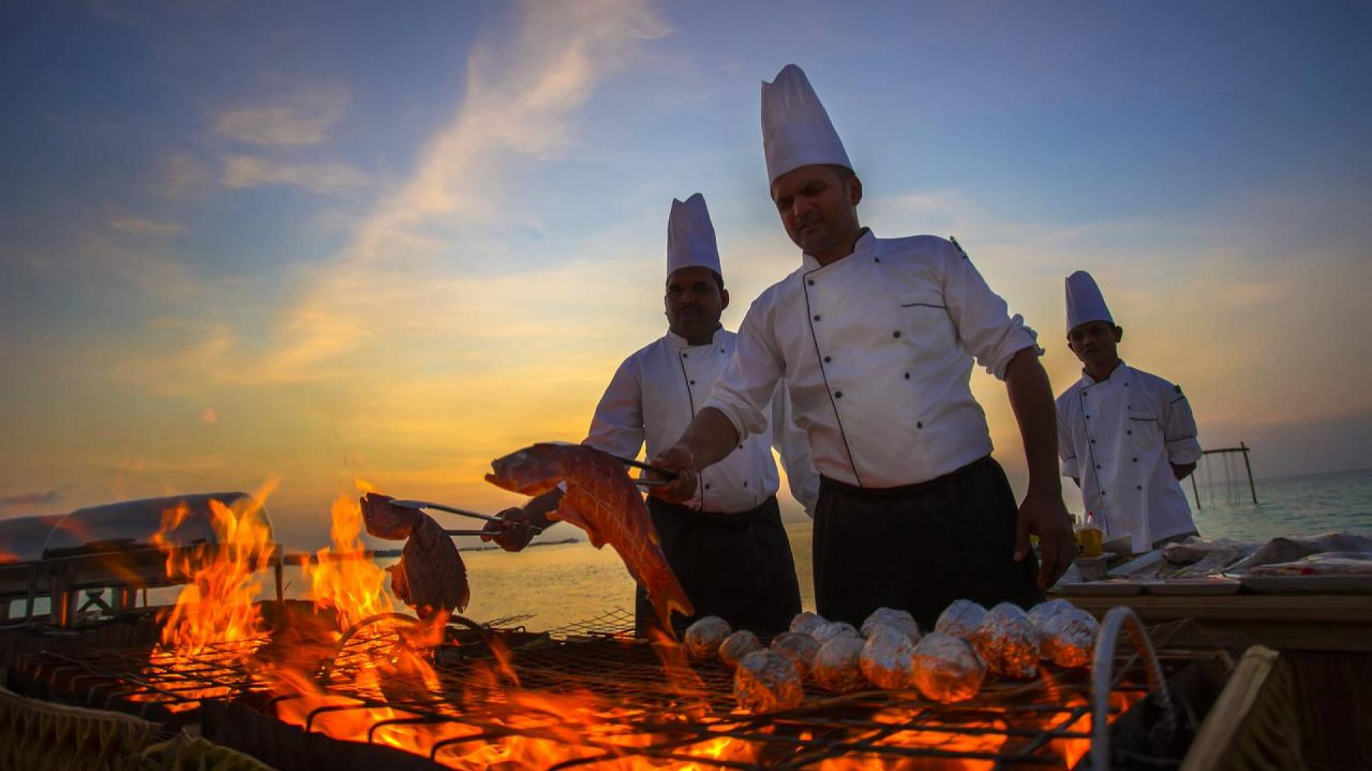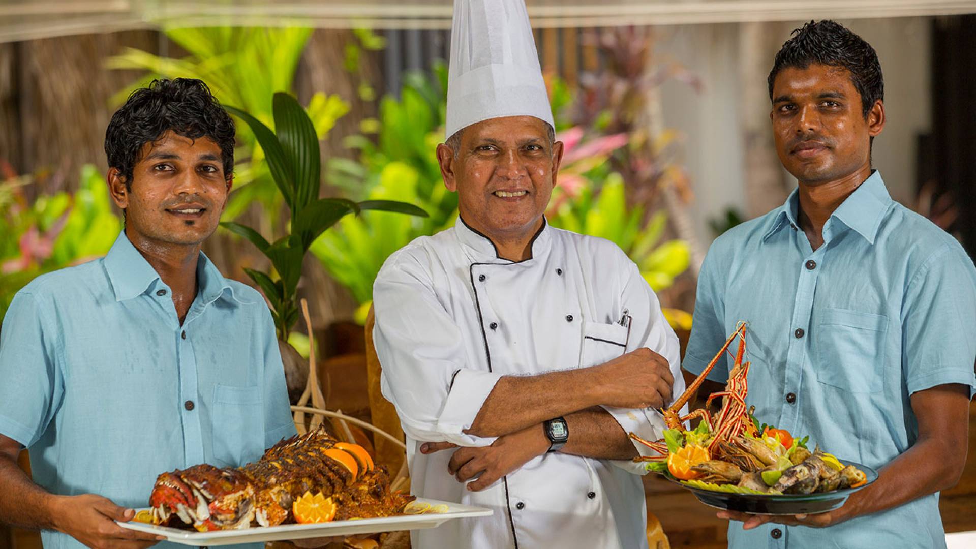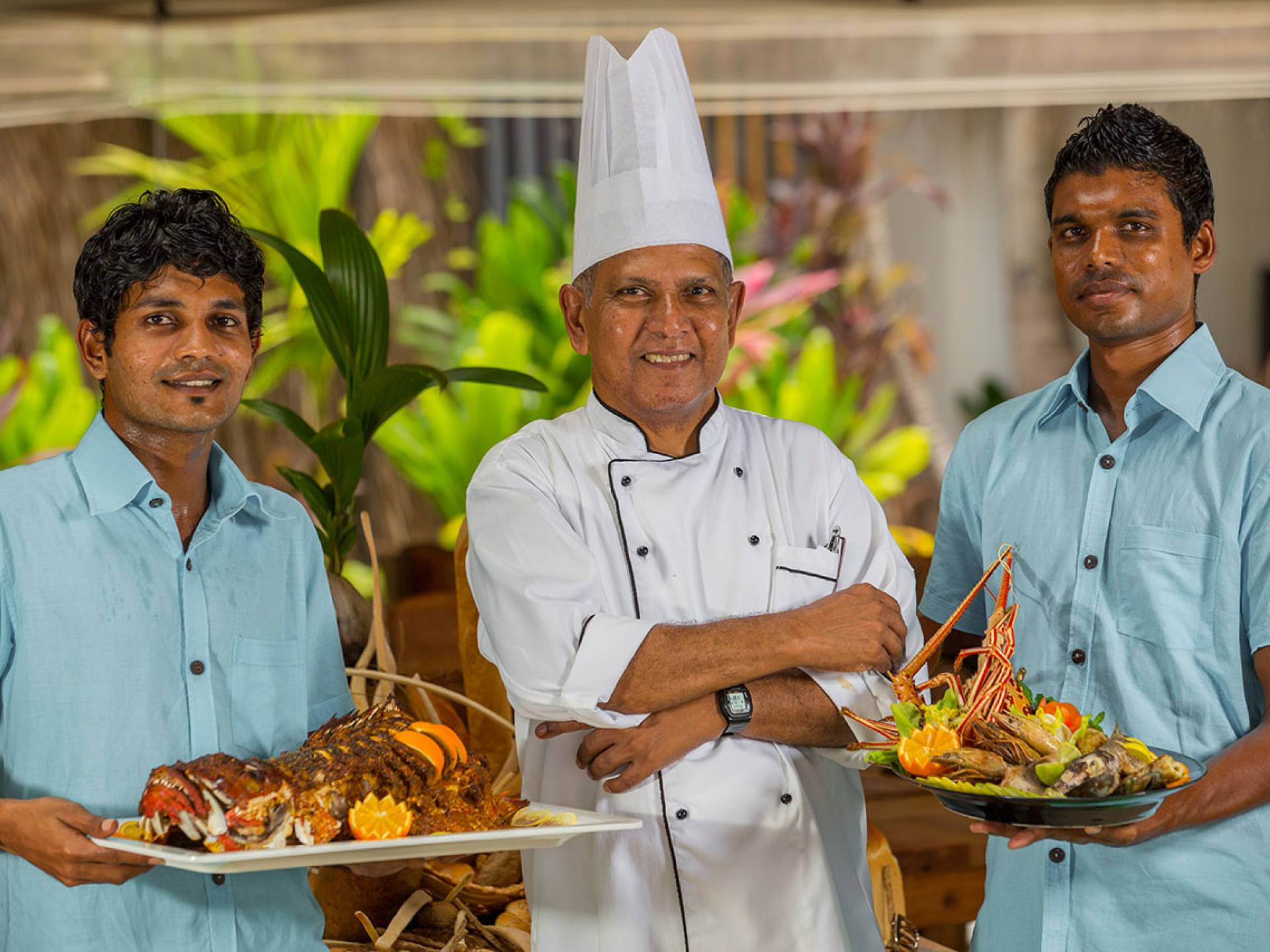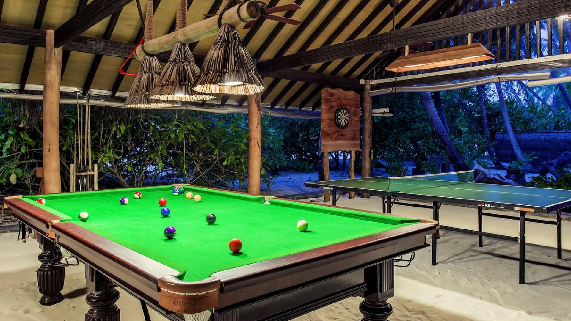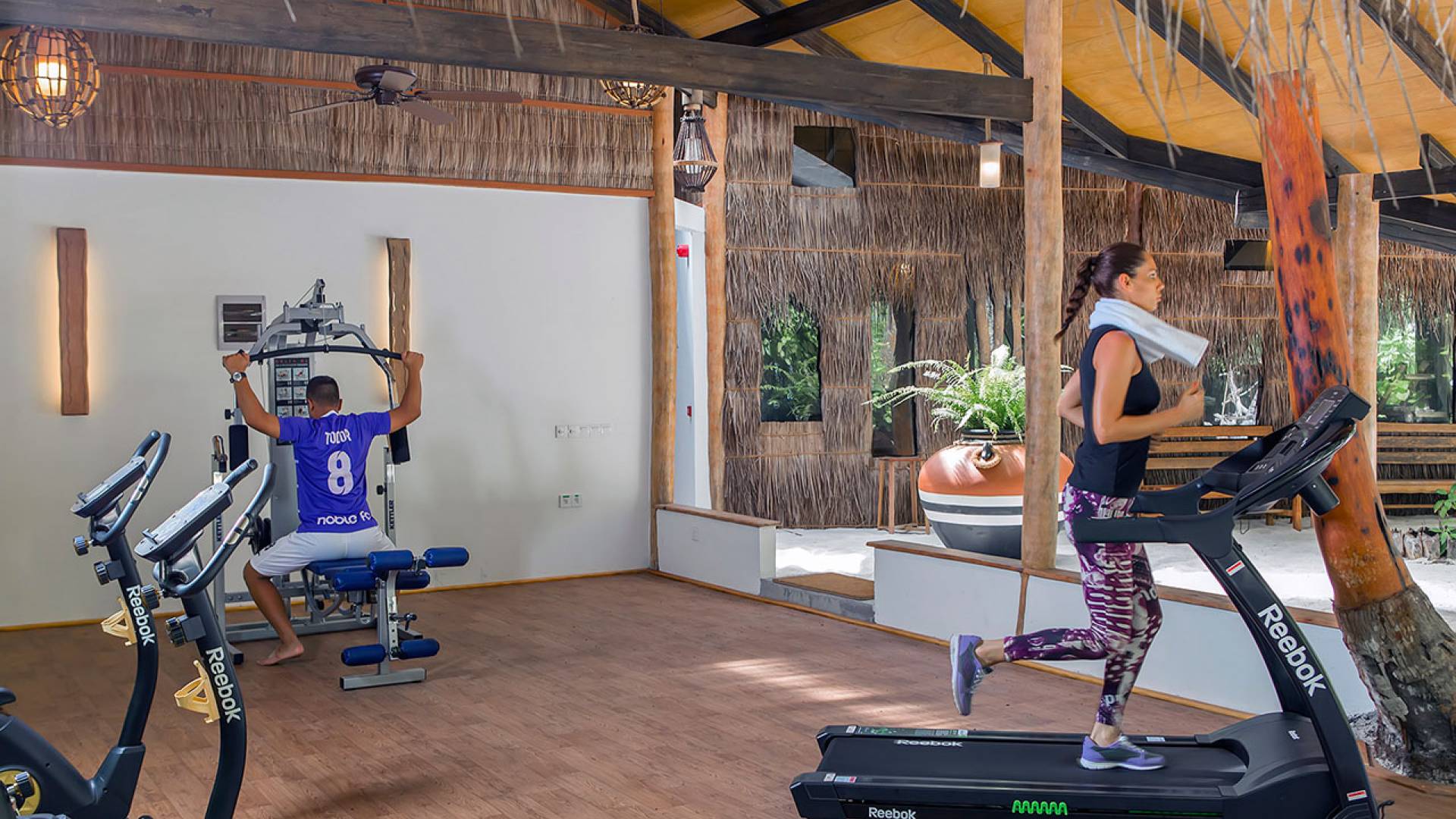 Chaque chambre dispose d'une terrasse extérieure en bois de coco avec des écrans d'intimité. Les portes sont conçues pour ressembler au style traditionnel maldivien des boiseries et de la menuiserie utilisé dans le passé. De même, l'utilisation de cordes fabriquées localement et d'autres parties des cocotiers en font une pièce véritablement maldivienne. Même les rideaux ont été sélectionnés avec des couleurs vives et des matériaux utilisés dans les maisons locales il y a plus de 30 ans. Les luminaires, les canapés et les chaises à l'intérieur de la pièce sont tous fabriqués à la main avec du bois local.