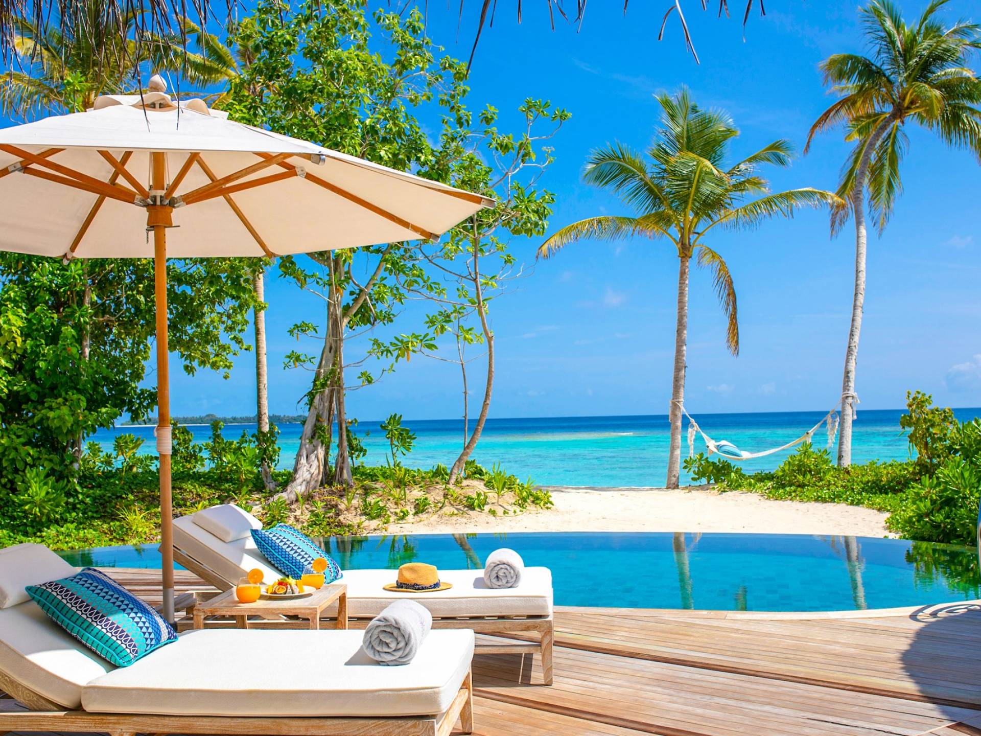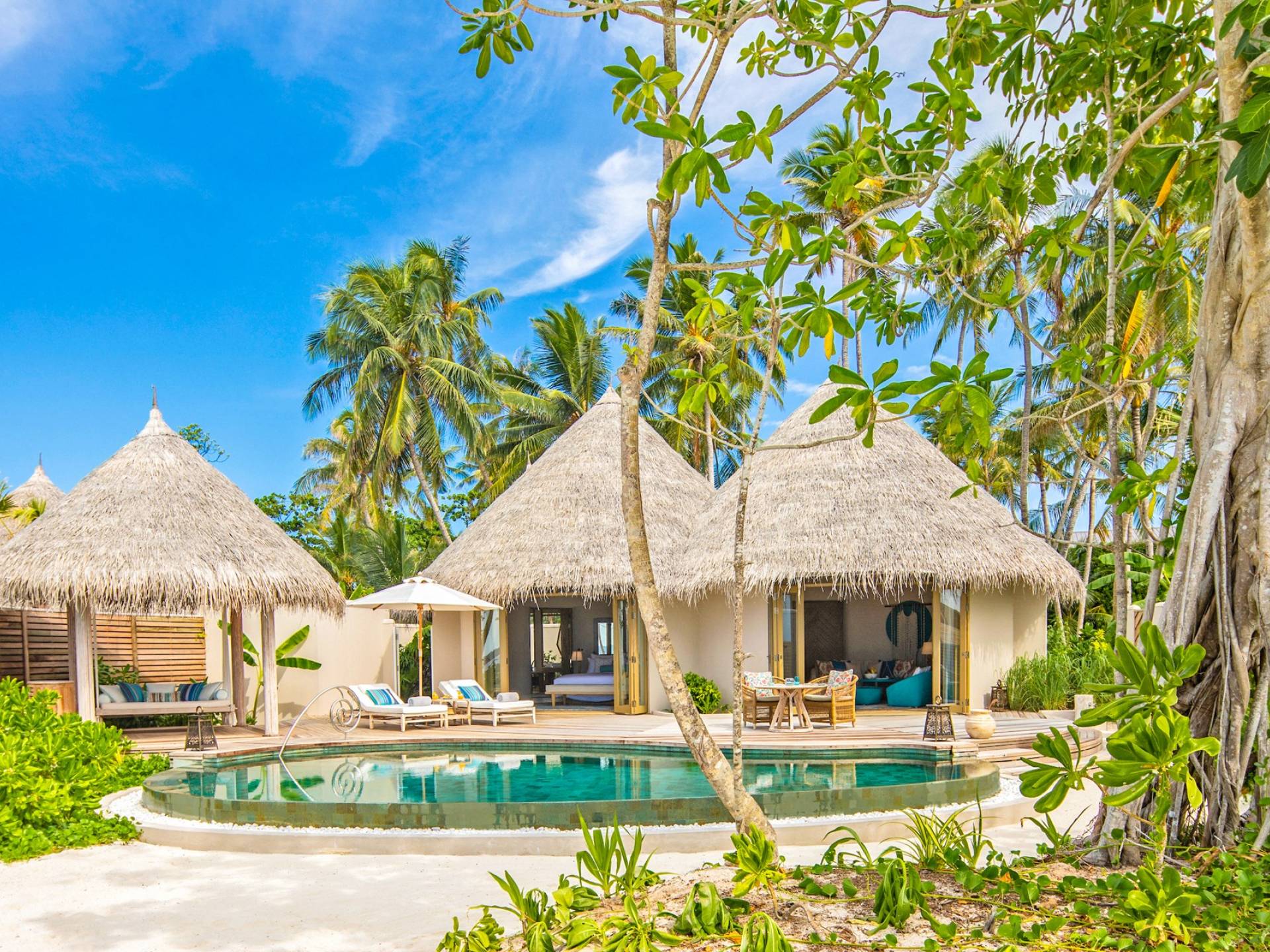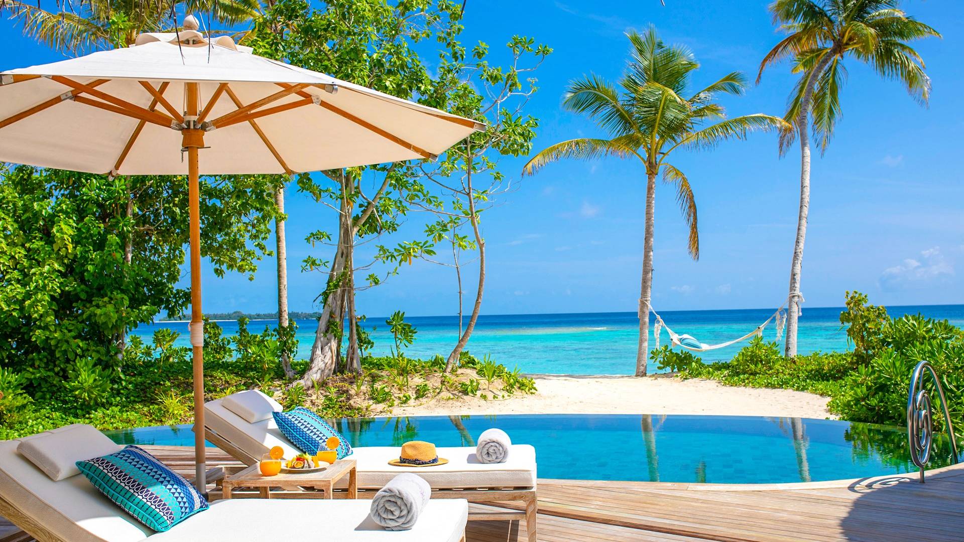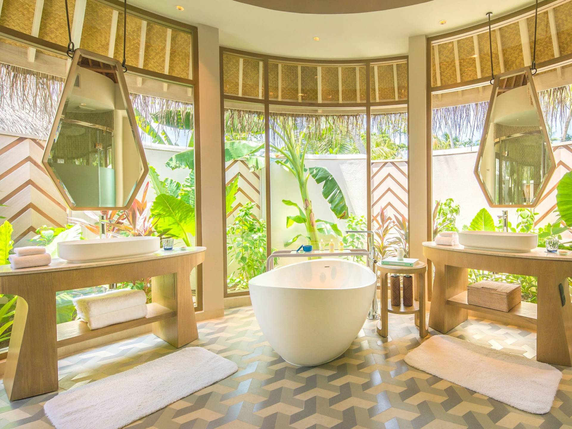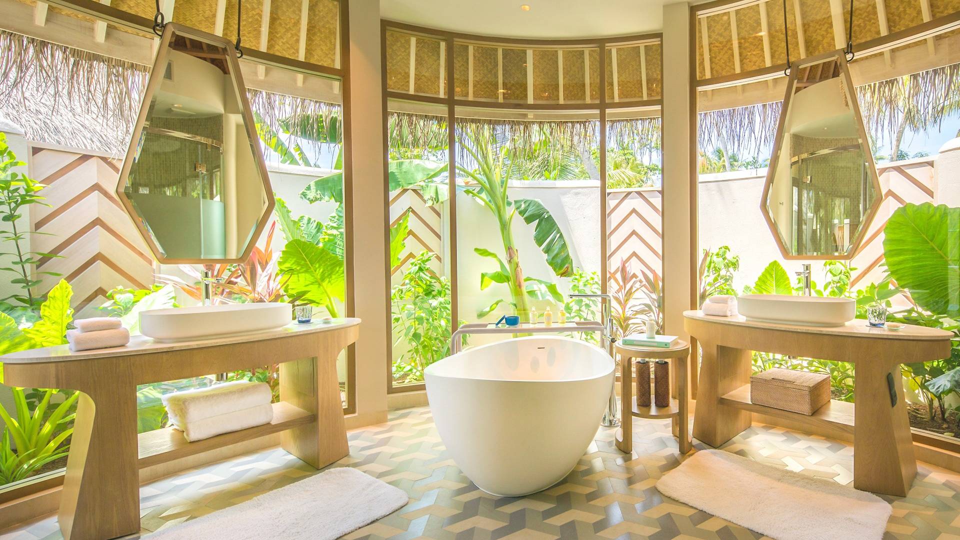 Votre terrasse s'étend jusqu'à votre propre piscine privée, où une balançoire couverte de style maldivien invite à une journée de farniente à l'ombre. Une salle de bains privative aux parois de verre, baignée de lumière et climatisée offre une vue sur la cour du jardin, avec une profonde baignoire autoportante en céramique, une douche à l'italienne à effet pluie et des vanités en granit assorties. Une douche de jardin extérieure permet de se baigner sous un ciel tropical.