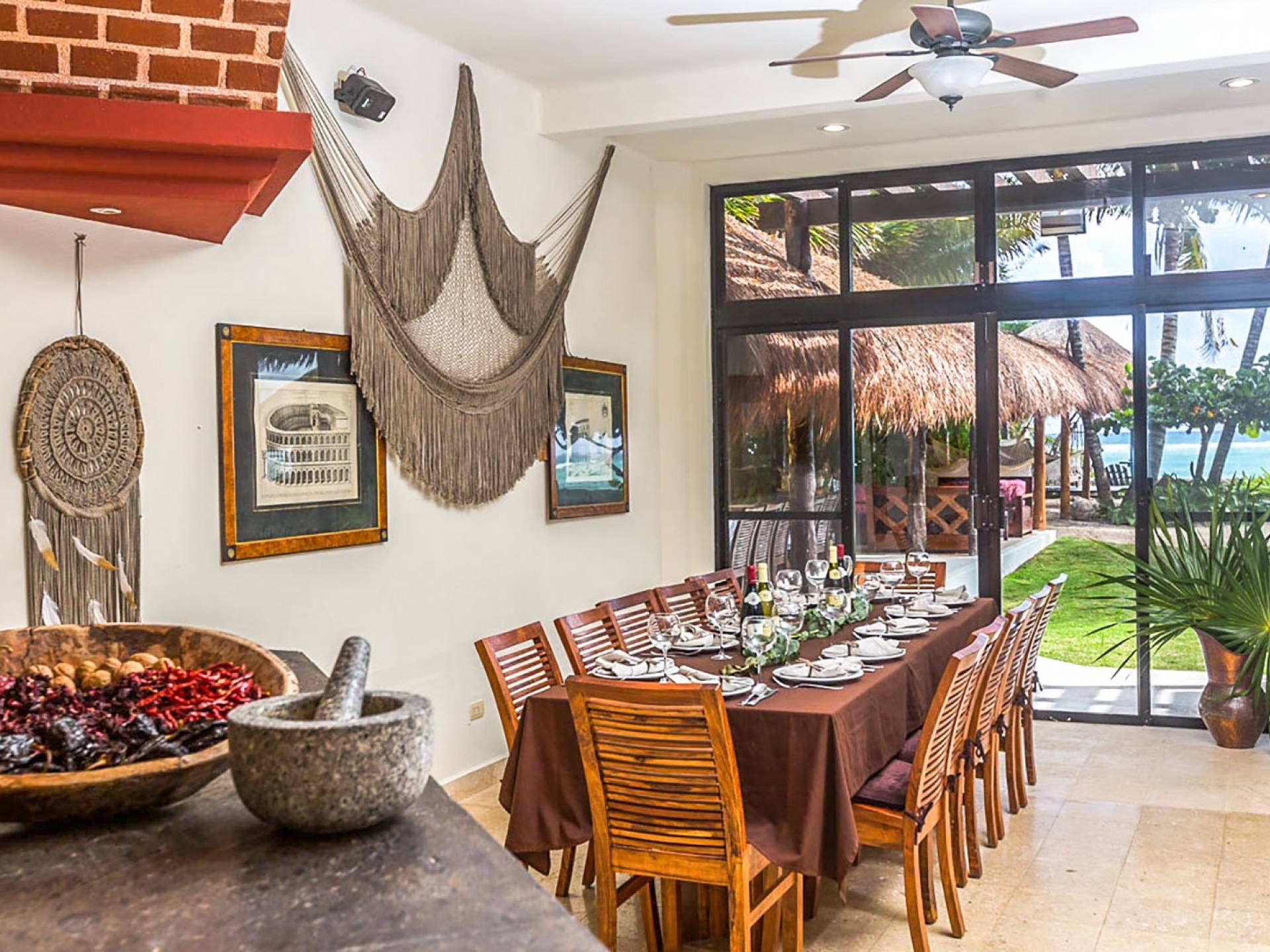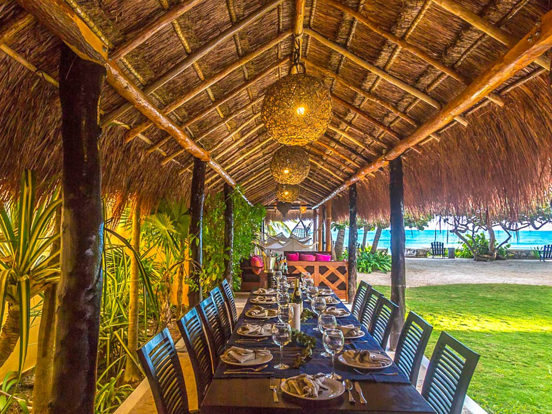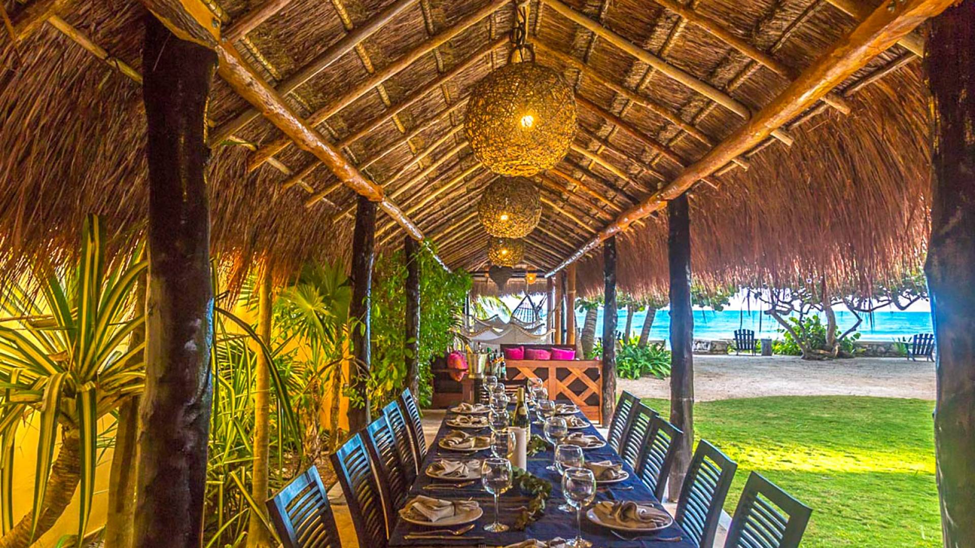 La grande cuisine familiale du Zen del Sol avec son îlot recouvert de granit noir est attenante à une cuisine de traiteur séparée pour un service intime ou de grandes célébrations. Une vaste salle à manger, pouvant accueillir jusqu'à 21 personnes, s'ouvre sur le jardin et offre une sensation d'intérieur et d'extérieur. Un grand salon accueillant, l'un des nombreux espaces de rassemblement, est le centre du divertissement intérieur avec un sentiment de chez-soi. La plage Palapa est le cœur de la vie en plein air. Cette structure au toit de chaume de 90 pieds (30 mètres) abrite la salle à manger extérieure couverte qui ravit 21 convives avec des repas préparés par le chef ou en famille. Le Palapa dispose également de deux coins salons en tant que salons extérieurs, d'un bar de divertissement, d'un lit de détente en bord de mer et de hamacs de détente. L'isolement et l'intimité sont immédiatement ressentis lorsque vous franchissez le seuil du domaine clos et traversez le jardin tropical luxuriant cloîtré.