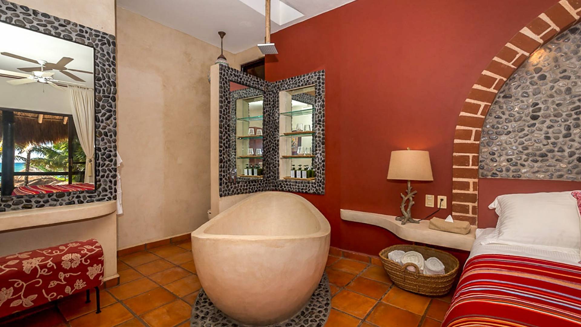 Directement sur la plage de sable de Jade : En entrant dans le domaine fortifié et en entrant dans la Villa Zen Del Sol Akumal, on ressent immédiatement la magie de l'espace. Le hall d'entrée revêtu de calcaire maya, le banc fait d'un tronc d'arbre Zapote, le dôme en briques élancé orné d'un lustre blanc moderne et ironique ajoutent à l'émerveillement. On est immédiatement attiré à l'extérieur. Un coin salon mène à une grande pelouse en bord de mer ornée d'un jardin Lilly et liée directement par du sable marin et des raisins de mer. Près de la digue, il y a des chaises Adirondack accueillantes - fabriquées localement en bois dur de Cahoba - avec des tables de cocktail en tronc d'arbre pour votre margarita de bienvenue. Le sol intérieur de Coachella, adouci d'anciens coquillages, se poursuit organiquement à l'extérieur avec la piscine bleue scintillante et sous la palapa de plage au toit de chaume de 30 mètres (90 ').