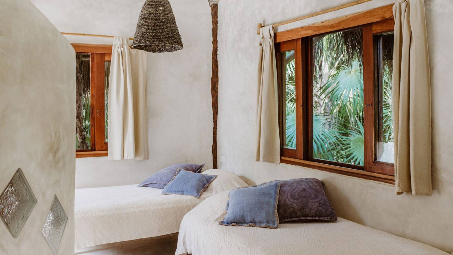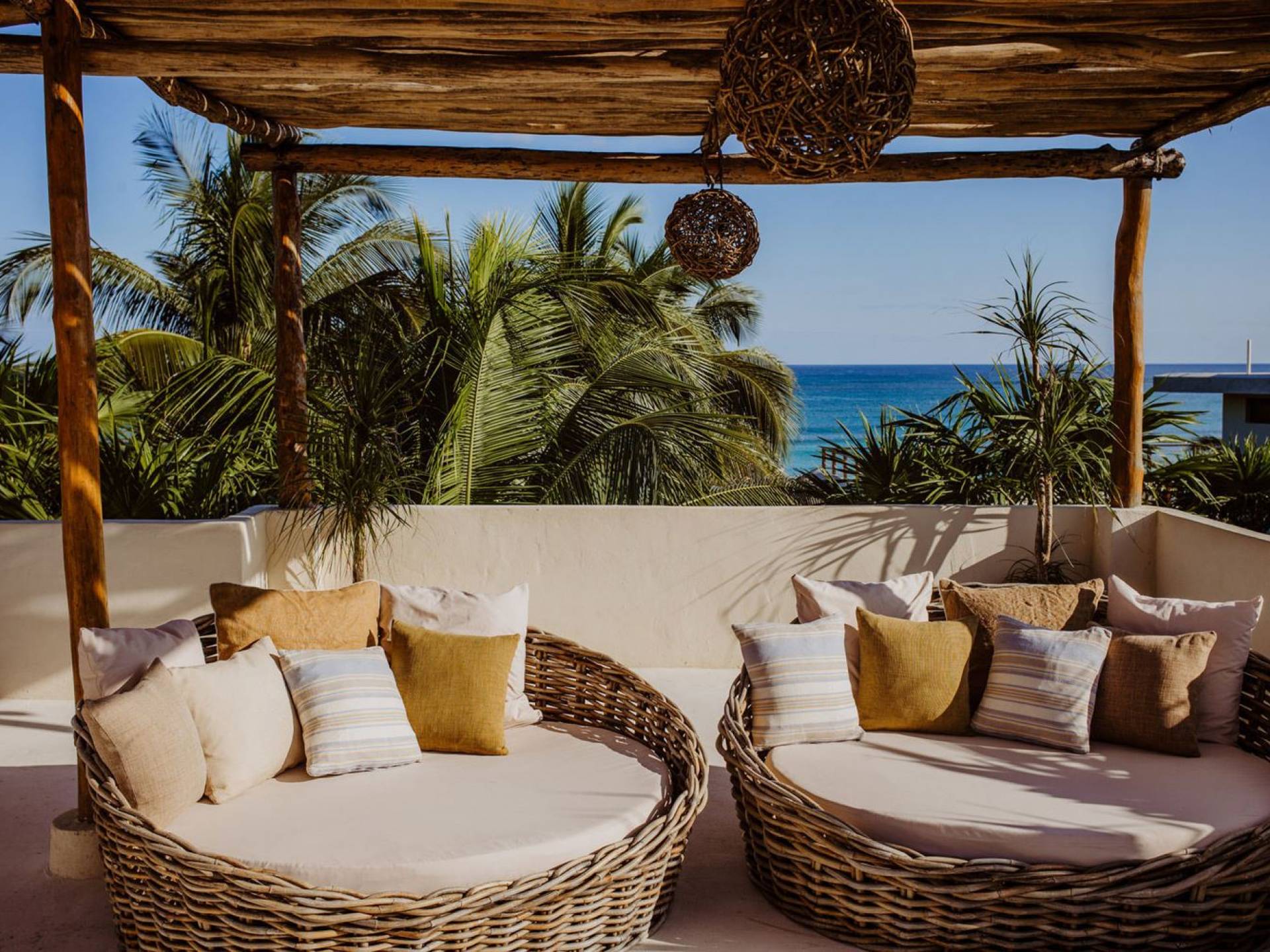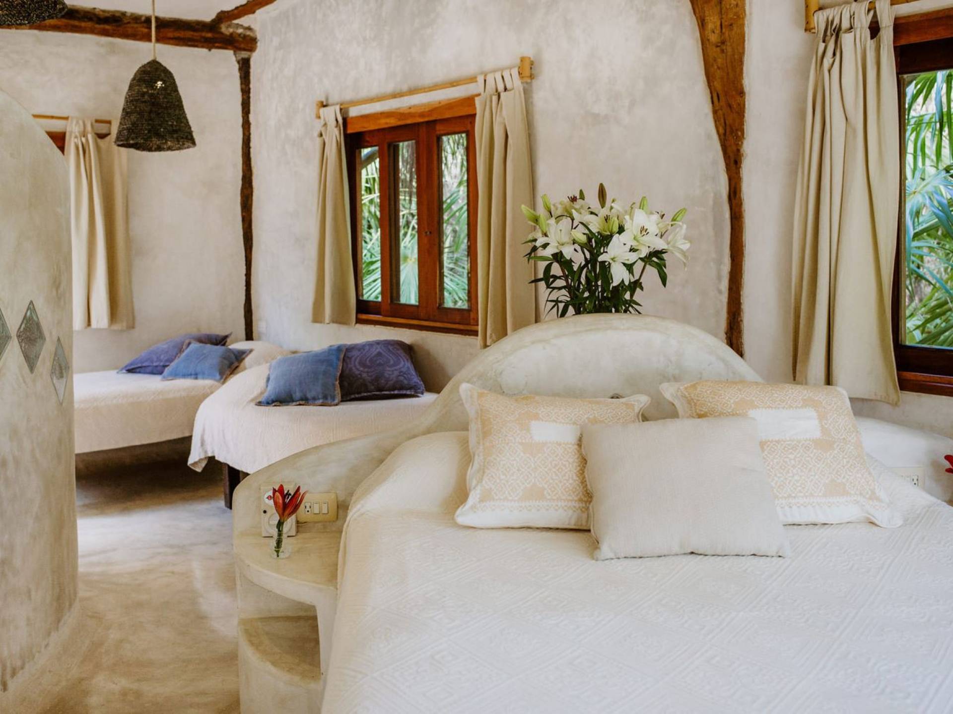 Casa de las Palmas Tulum est une location de villa de luxe avec 3 chambres. Casa de las Palmas est une superbe location de vacances à service complet sur la plage de Tulum. 1 chambre est au rez-de-chaussée avec un lit queen-size et un balcon. À l'étage, il y a 2 autres chambres avec balcon, vue sur la mer et salle de bains privative. Une chambre à l'étage dispose d'un lit king-size et l'autre d'un lit queen-size et de 2 lits simples. Les éléments naturels et les touches artistiques dans toute la maison reflètent la charmante ambiance décontractée de Tulum.