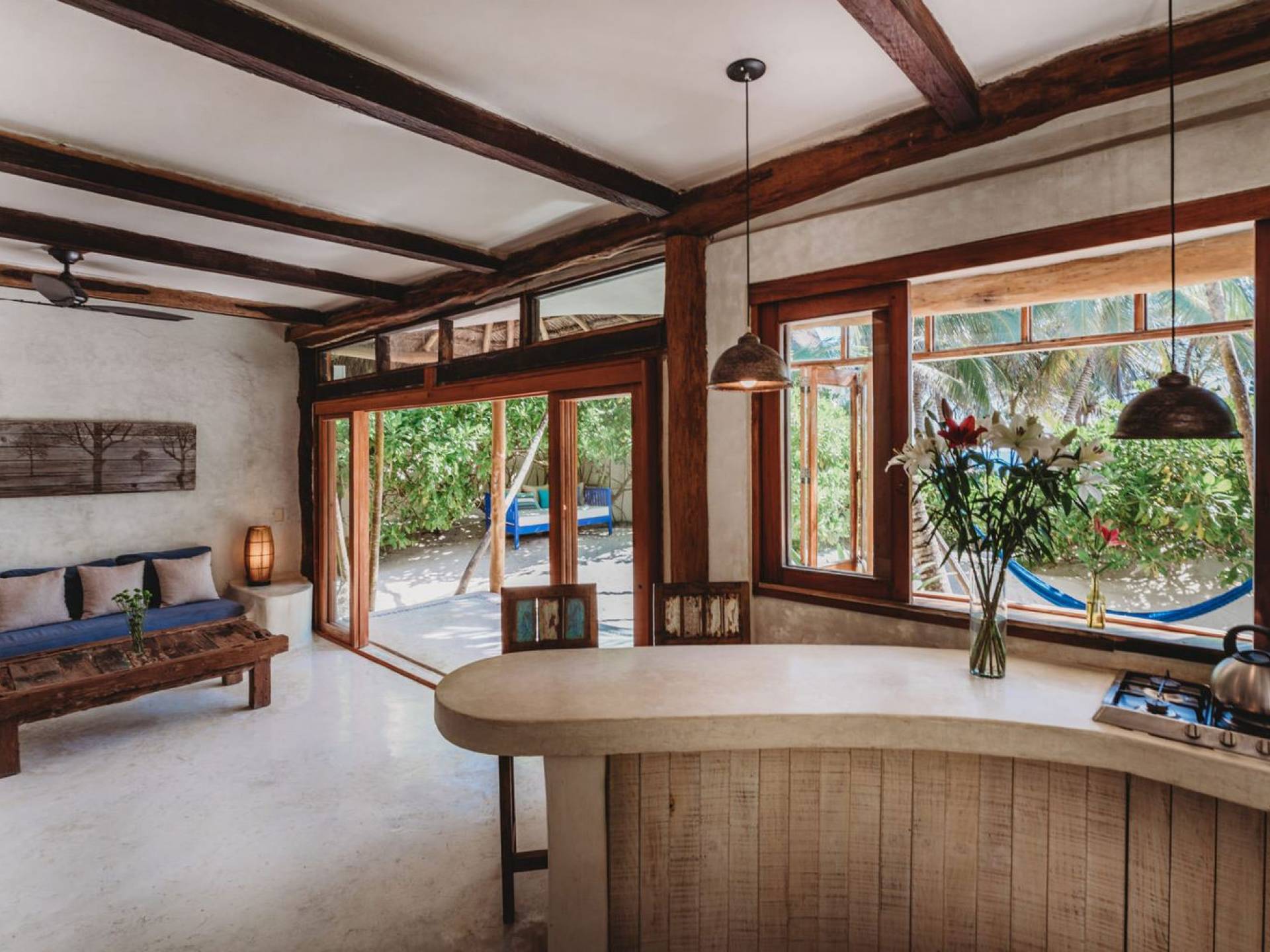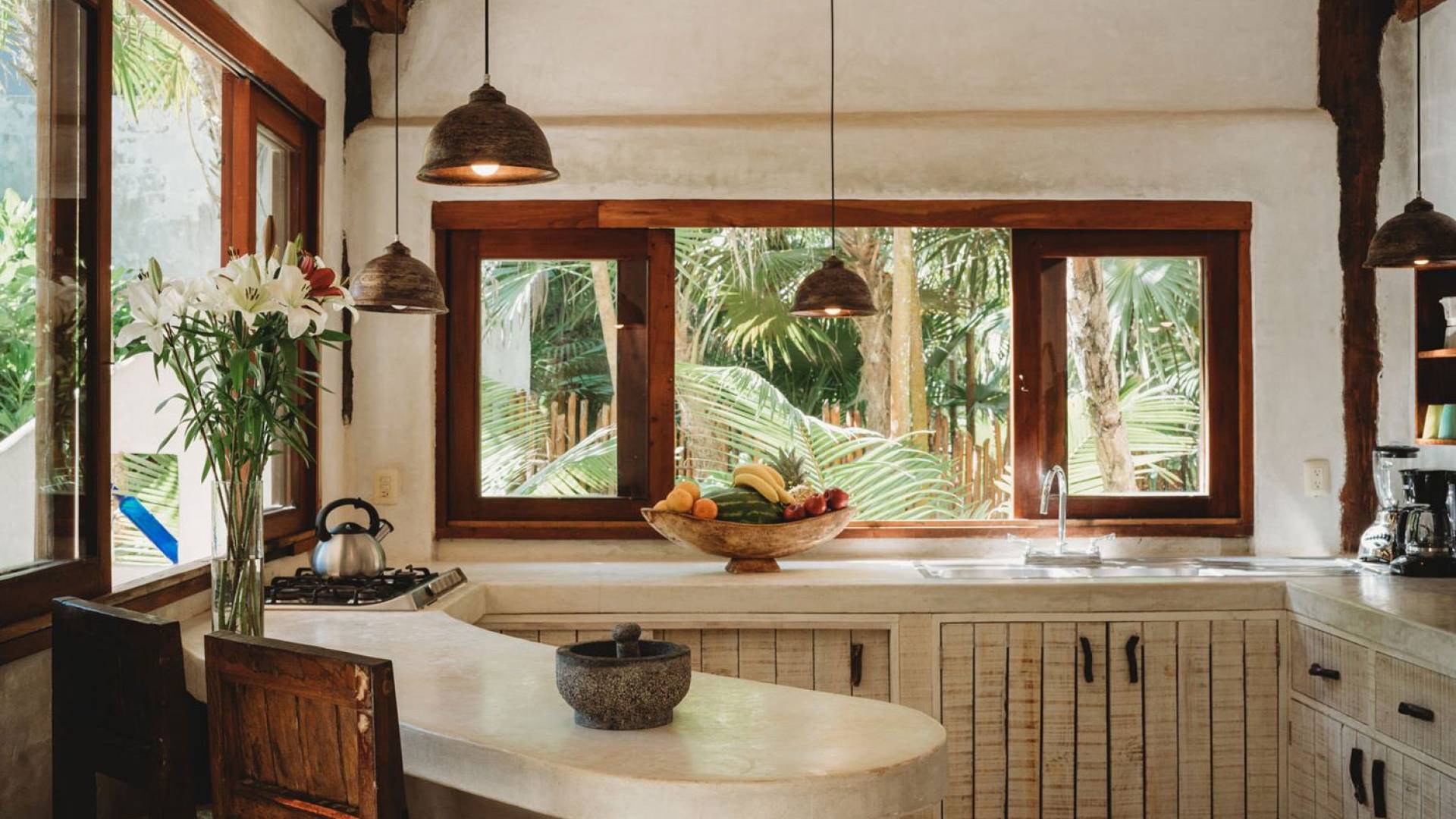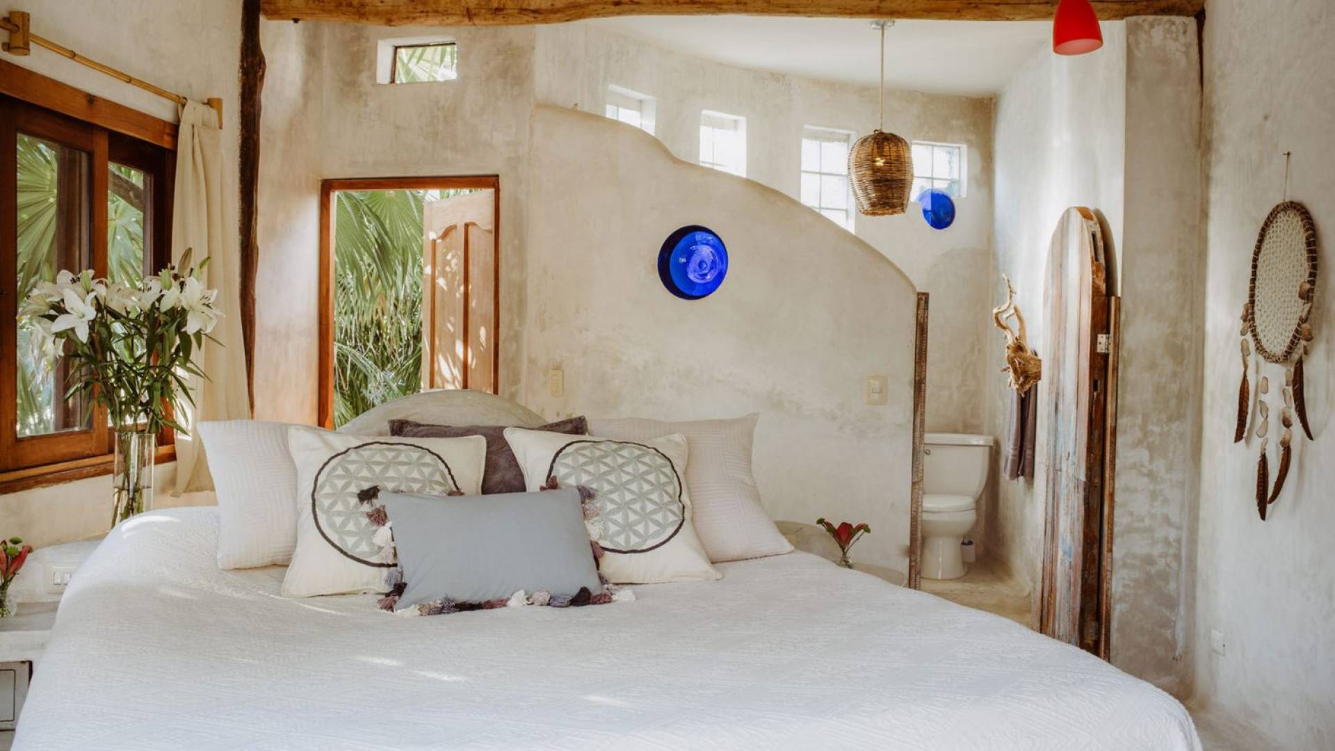 Casa de las Palmas Tulum est une location de villa de luxe avec 3 chambres. Casa de las Palmas est une superbe location de vacances à service complet sur la plage de Tulum. 1 chambre est au rez-de-chaussée avec un lit queen-size et un balcon. À l'étage, il y a 2 autres chambres avec balcon, vue sur la mer et salle de bains privative. Une chambre à l'étage dispose d'un lit king-size et l'autre d'un lit queen-size et de 2 lits simples. Les éléments naturels et les touches artistiques dans toute la maison reflètent la charmante ambiance décontractée de Tulum.