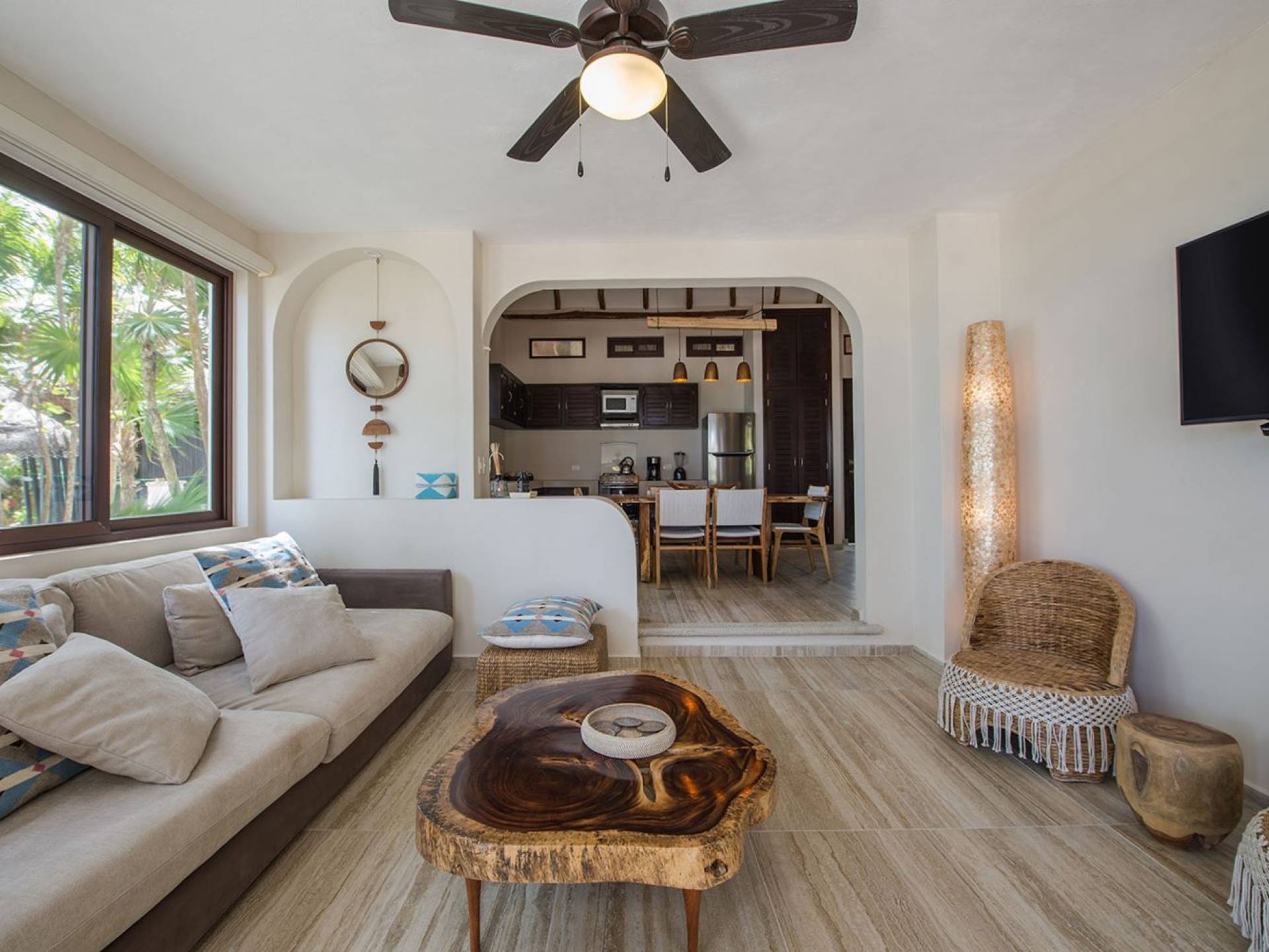 Cette unité fait partie d'un bungalow de trois propriétés qui partage une piscine avec un espace barbecue extérieur et possède sa propre palapa ombragée avec des chaises longues au bord de la plage. La chambre King au rez-de-chaussée comprend une cuisine complète, un patio extérieur, une salle de bains et un coin salon. La deuxième chambre King est située au deuxième niveau avec sa propre salle de bain et une terrasse avec de belles vues.