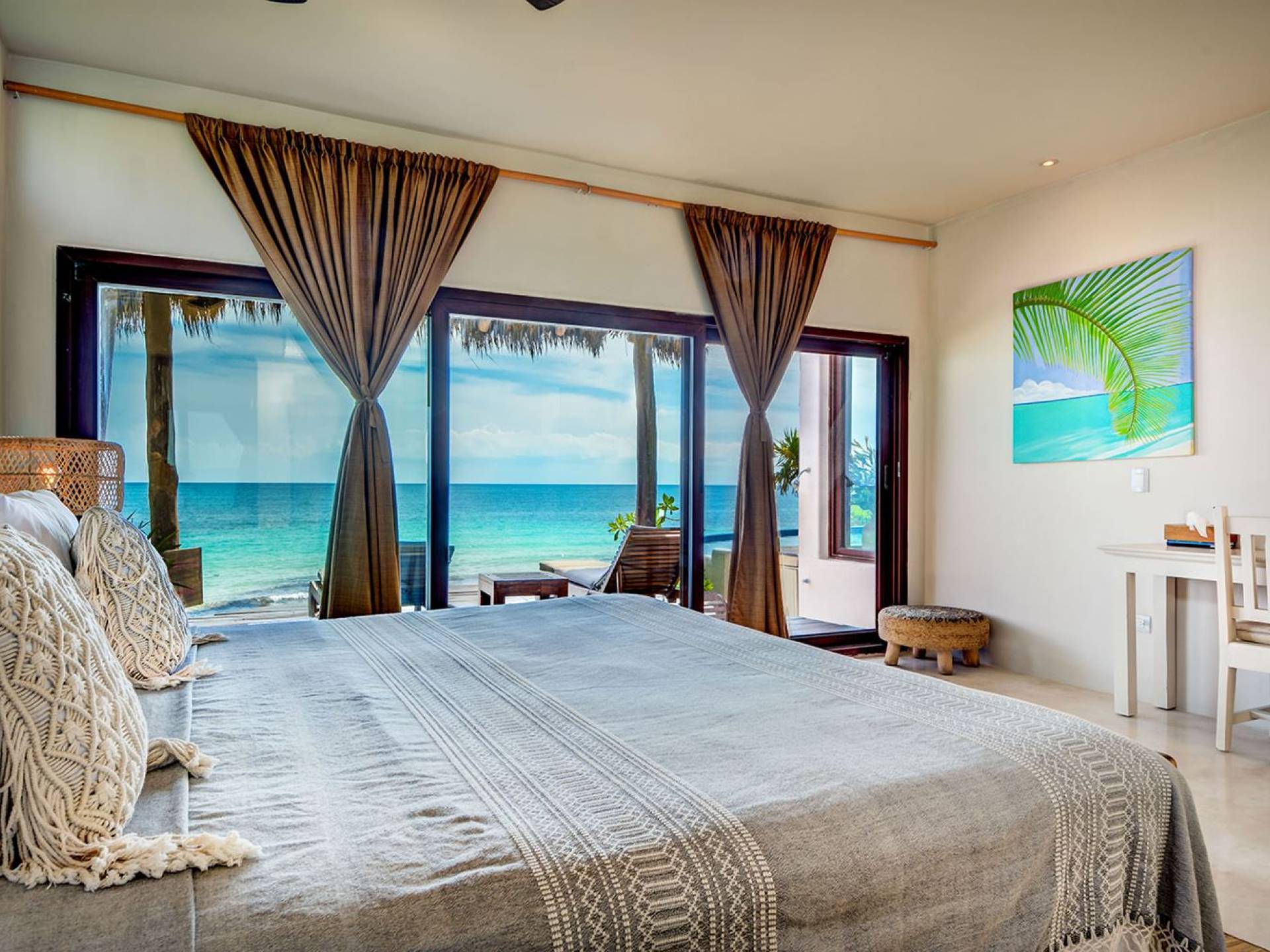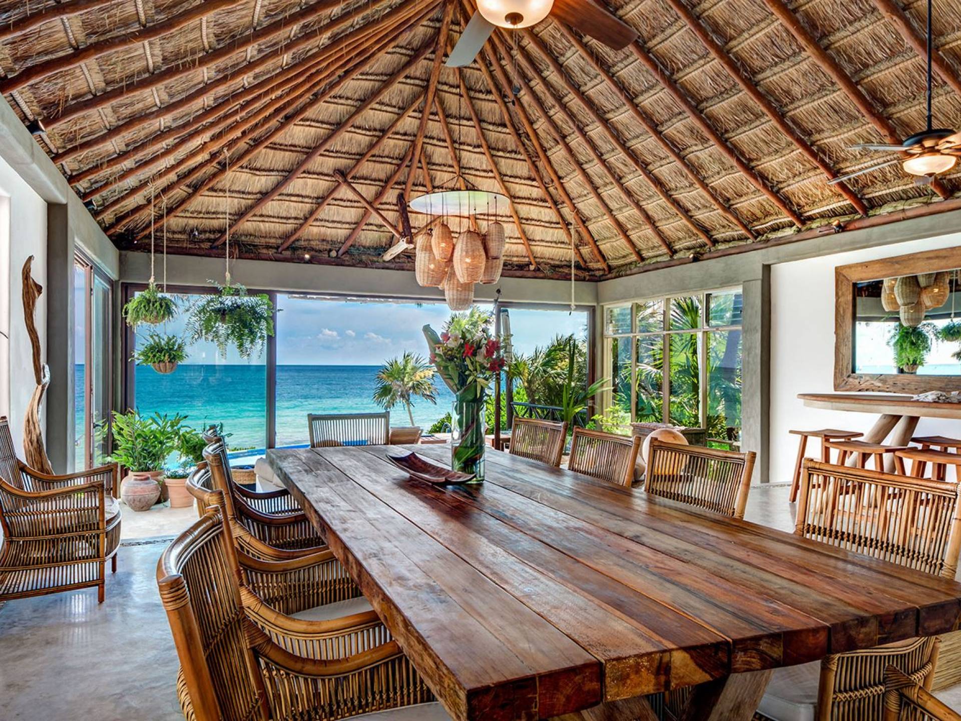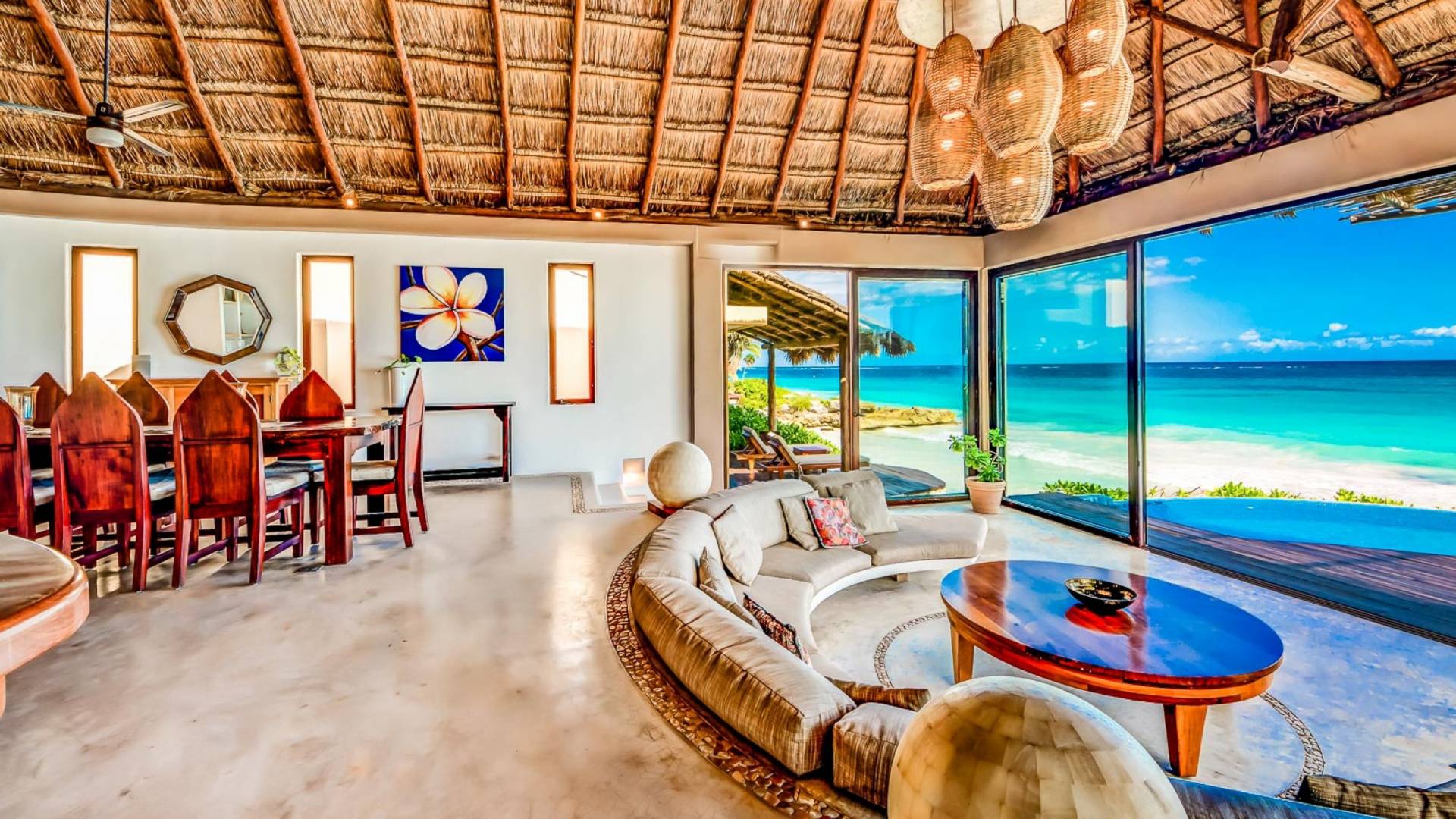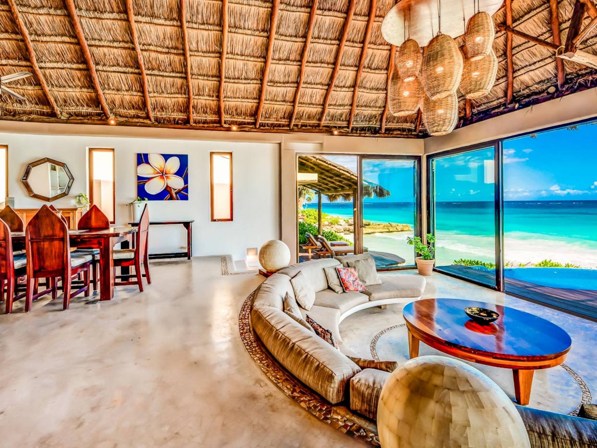 Cette spectaculaire villa sur la plage vous coupera le souffle. Walk-in et a une vue directement à travers la maison sur une piscine privée située en face des Caraïbes. Dégustez des cocktails ou une baignade et regardez les vagues qui roulent. C'est à peu près aussi paisible et serein que possible! La palapa aérée et ensoleillée crée l'atmosphère parfaite pour une contemplation tranquille, une romance ou des invités divertissants. Sortez et profitez du soleil, nagez dans les vagues et faites de la plongée avec tuba dans l'un des meilleurs endroits de Tulum, ou observez les étoiles la nuit sur le pont avec le bruit des vagues, la brise dans vos cheveux et un verre de vin. De l'étage de l'autre côté de la villa, vous pouvez souvent admirer un coucher de soleil au-delà de la vaste et luxuriante jungle verte. Une vue spectaculaire à voir! Ou réveillez-vous tôt pour admirer un lever de soleil n'importe quel jour dans le confort du salon grandiose palapa ou regardez-le en flottant dans la piscine au bord de la plage.