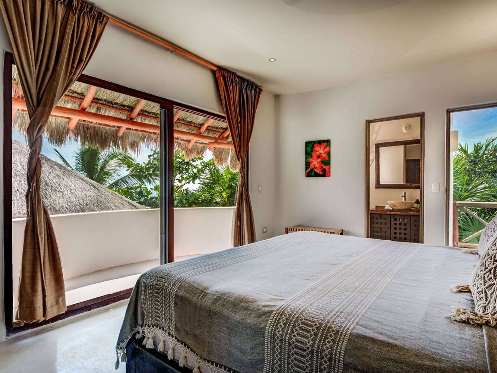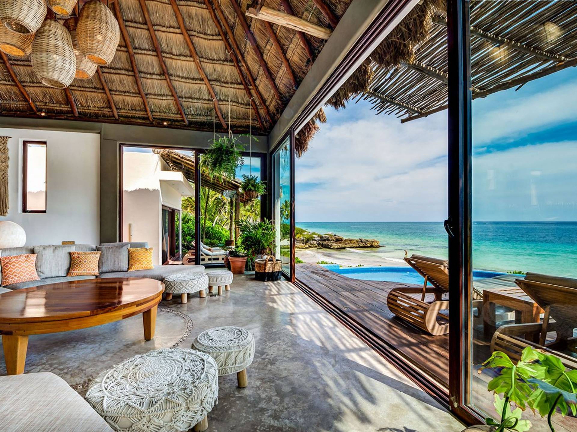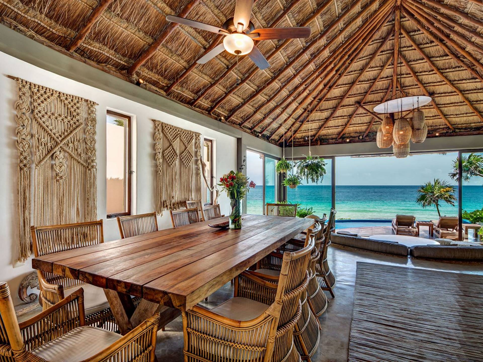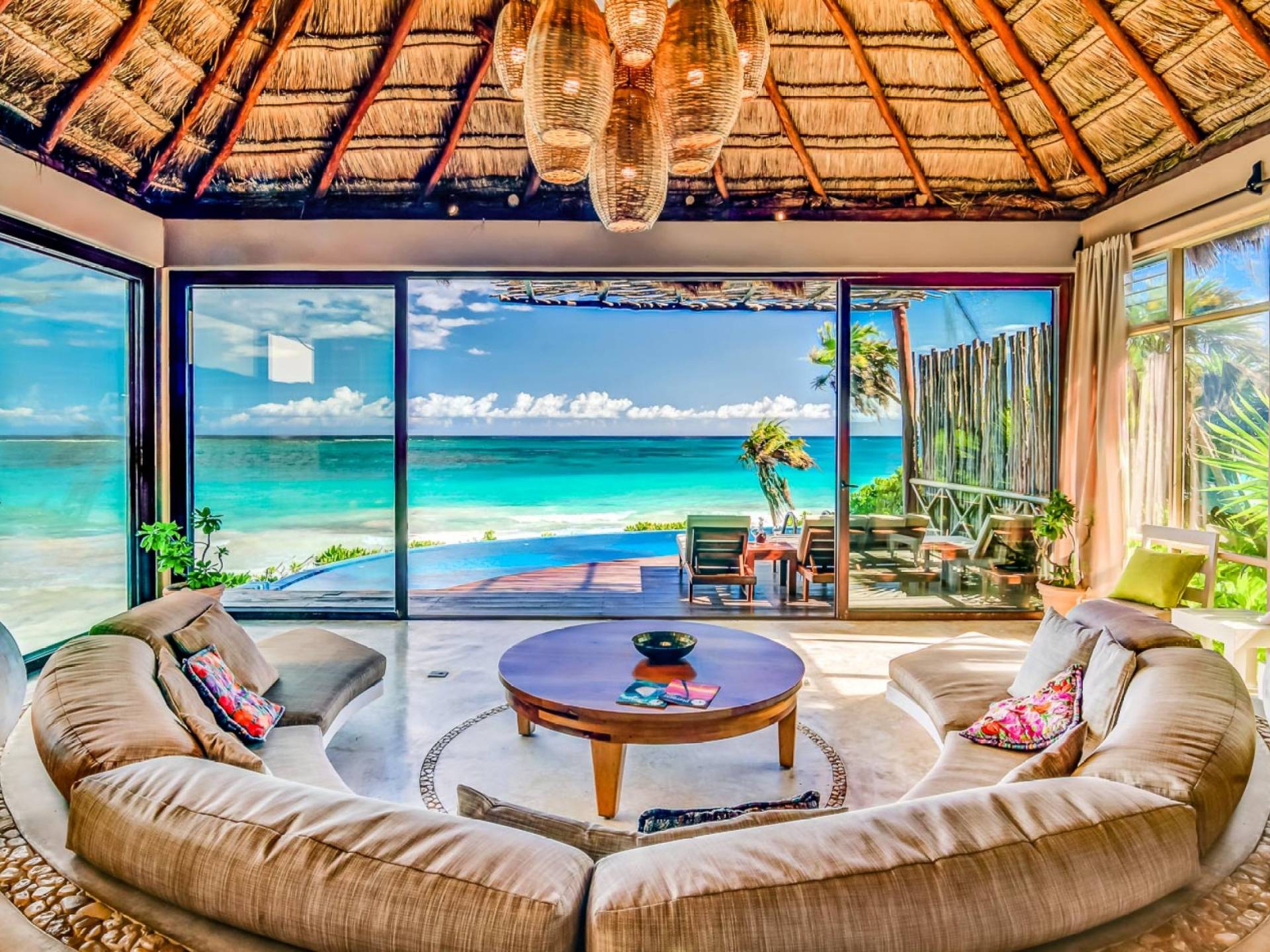 Cette spectaculaire villa sur la plage vous coupera le souffle. Walk-in et a une vue directement à travers la maison sur une piscine privée située en face des Caraïbes. Dégustez des cocktails ou une baignade et regardez les vagues qui roulent. C'est à peu près aussi paisible et serein que possible! La palapa aérée et ensoleillée crée l'atmosphère parfaite pour une contemplation tranquille, une romance ou des invités divertissants. Sortez et profitez du soleil, nagez dans les vagues et faites de la plongée avec tuba dans l'un des meilleurs endroits de Tulum, ou observez les étoiles la nuit sur le pont avec le bruit des vagues, la brise dans vos cheveux et un verre de vin. De l'étage de l'autre côté de la villa, vous pouvez souvent admirer un coucher de soleil au-delà de la vaste et luxuriante jungle verte. Une vue spectaculaire à voir! Ou réveillez-vous tôt pour admirer un lever de soleil n'importe quel jour dans le confort du salon grandiose palapa ou regardez-le en flottant dans la piscine au bord de la plage.