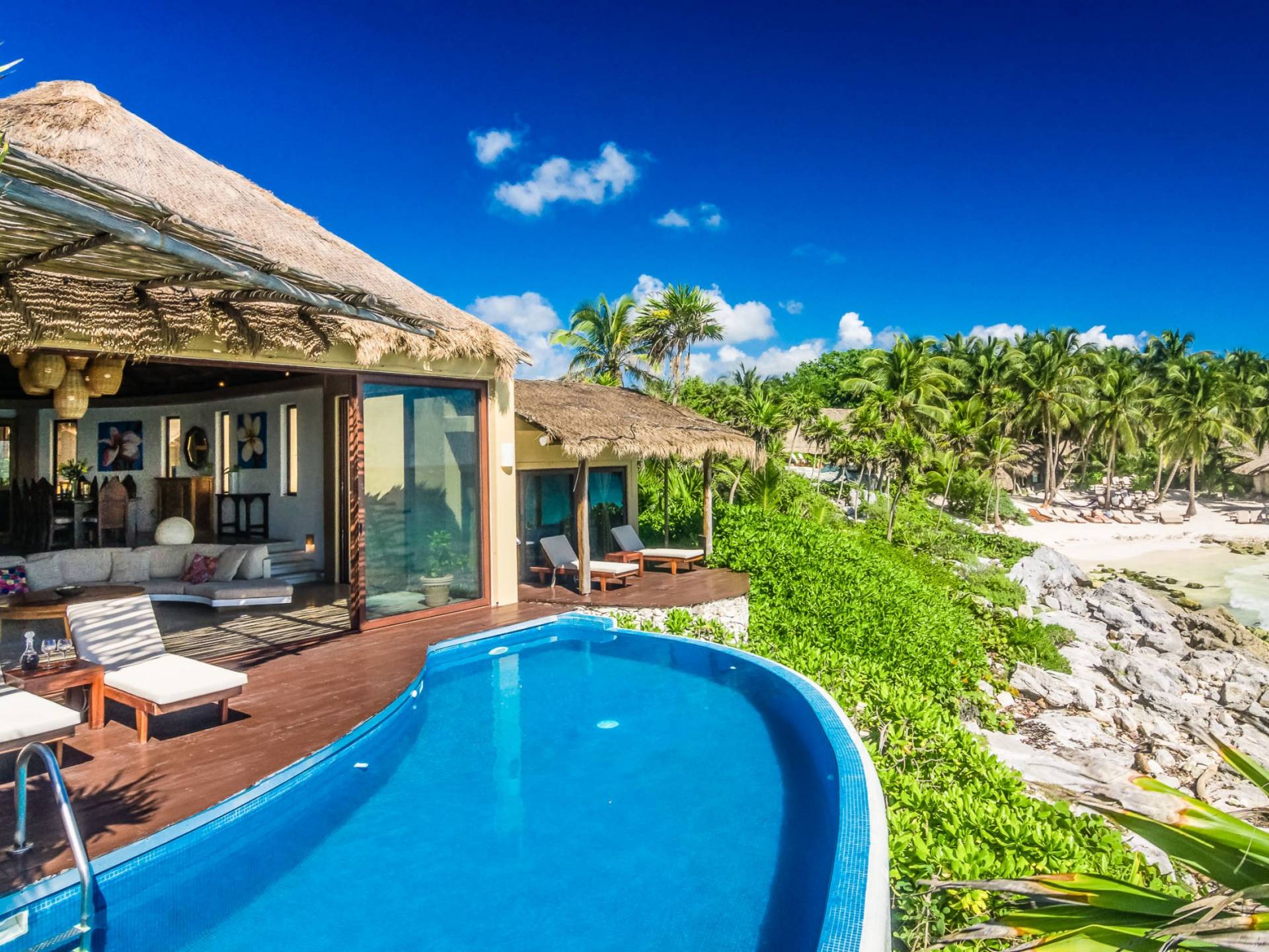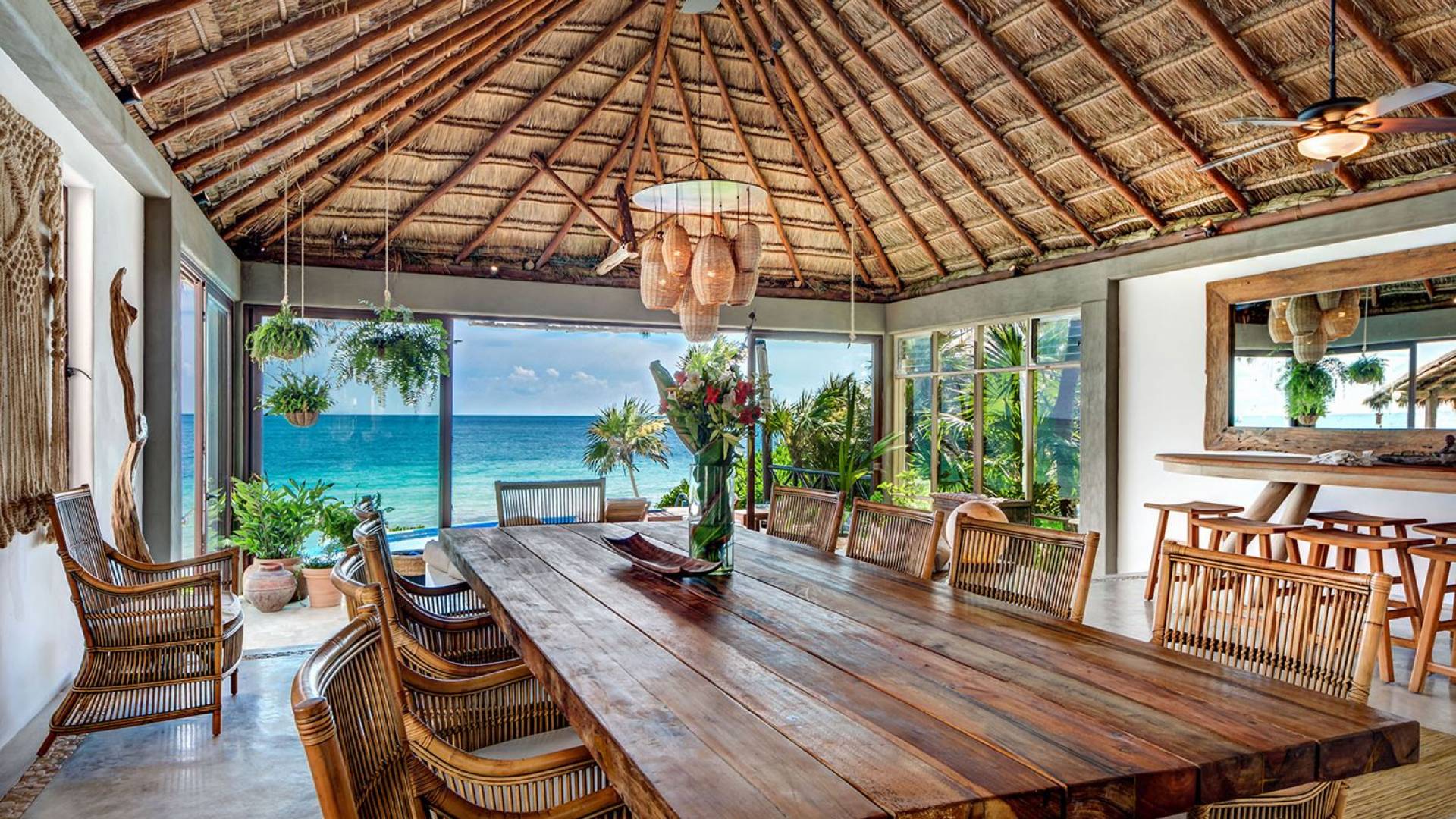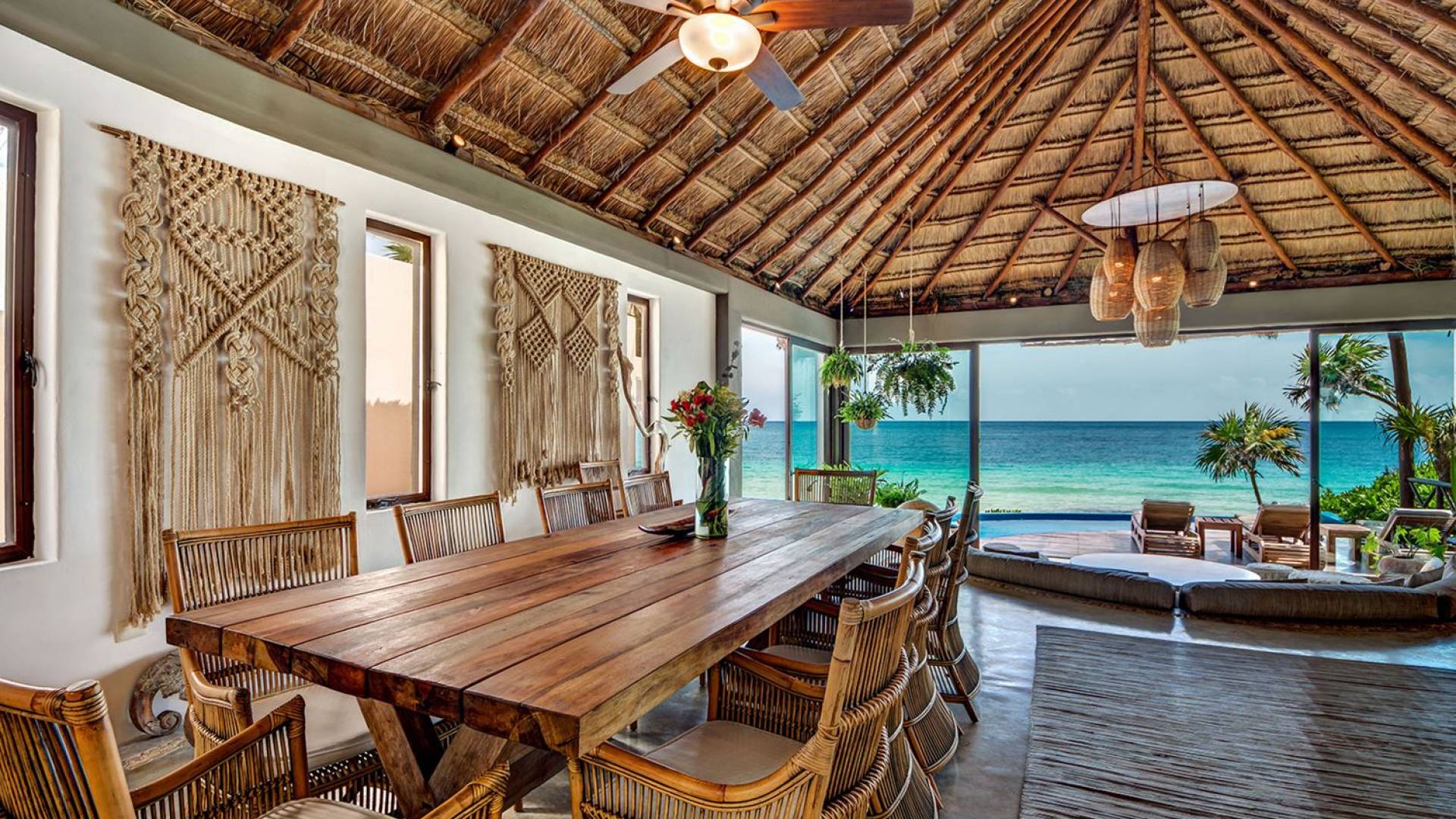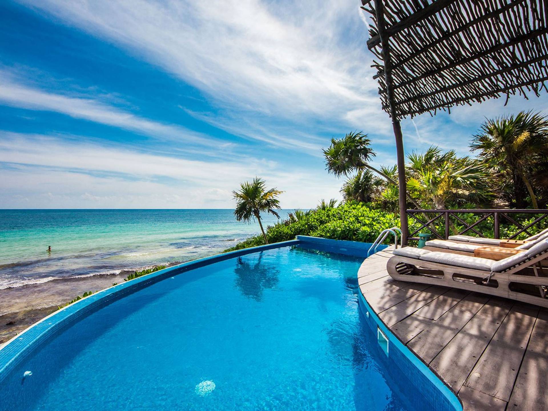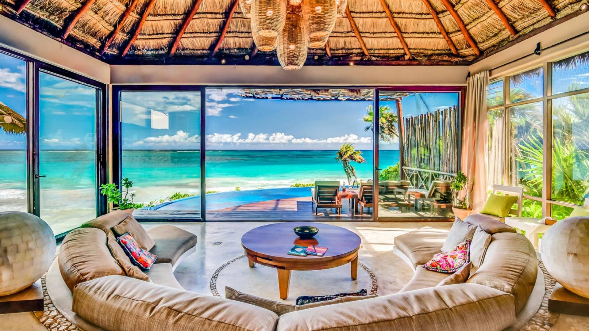 Cette spectaculaire villa sur la plage vous coupera le souffle. Walk-in et a une vue directement à travers la maison sur une piscine privée située en face des Caraïbes. Dégustez des cocktails ou une baignade et regardez les vagues qui roulent. C'est à peu près aussi paisible et serein que possible! La palapa aérée et ensoleillée crée l'atmosphère parfaite pour une contemplation tranquille, une romance ou des invités divertissants. Sortez et profitez du soleil, nagez dans les vagues et faites de la plongée avec tuba dans l'un des meilleurs endroits de Tulum, ou observez les étoiles la nuit sur le pont avec le bruit des vagues, la brise dans vos cheveux et un verre de vin. De l'étage de l'autre côté de la villa, vous pouvez souvent admirer un coucher de soleil au-delà de la vaste et luxuriante jungle verte. Une vue spectaculaire à voir! Ou réveillez-vous tôt pour admirer un lever de soleil n'importe quel jour dans le confort du salon grandiose palapa ou regardez-le en flottant dans la piscine au bord de la plage.
