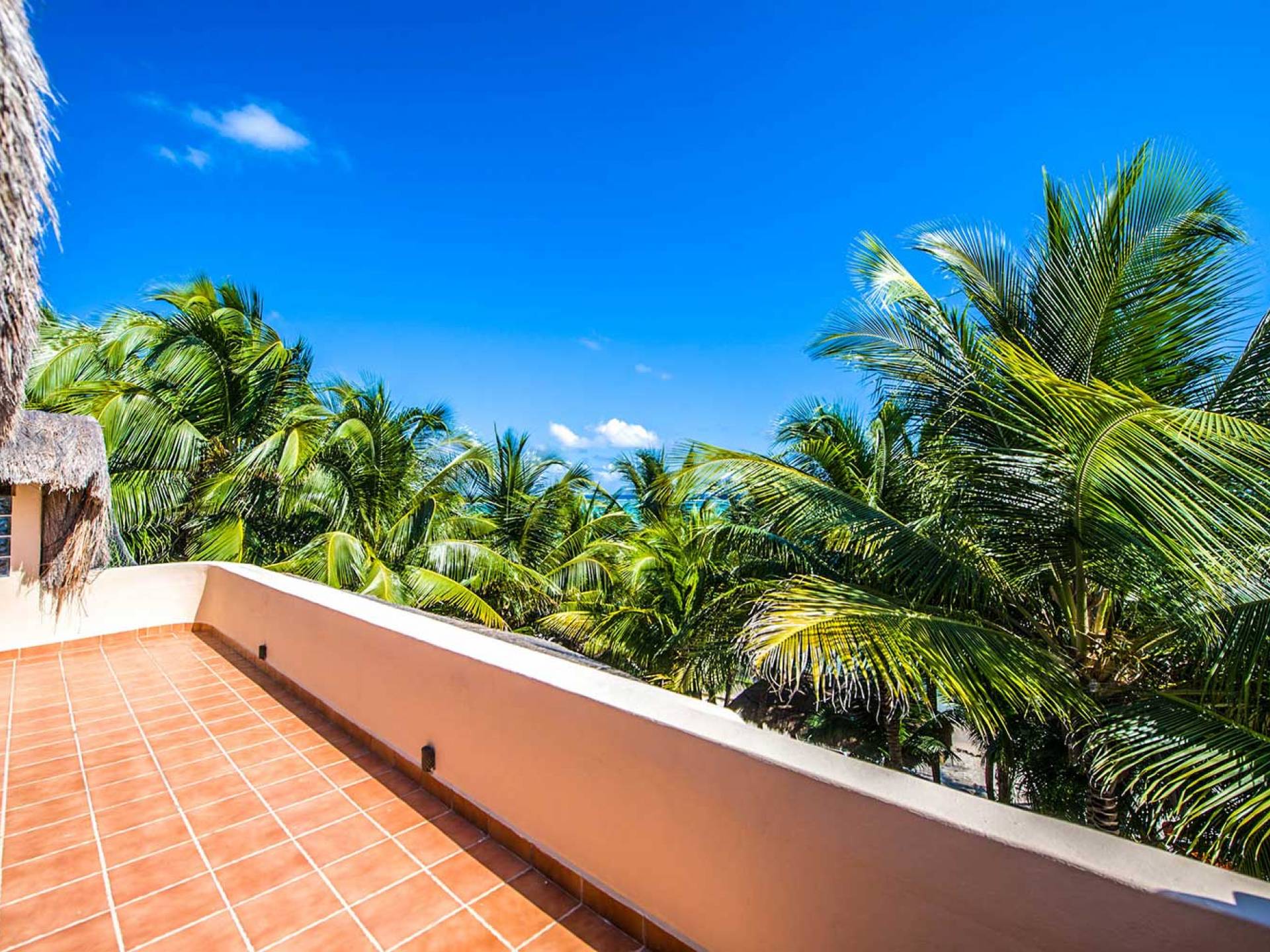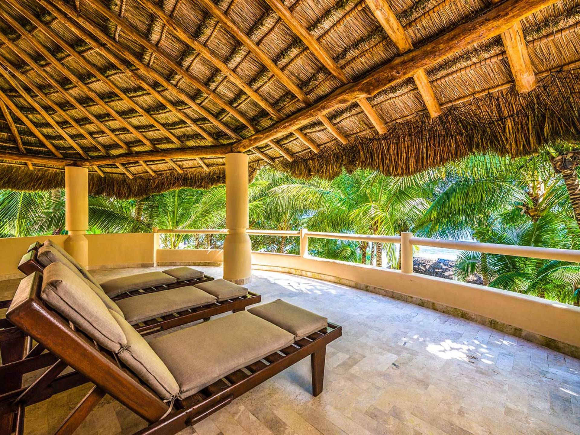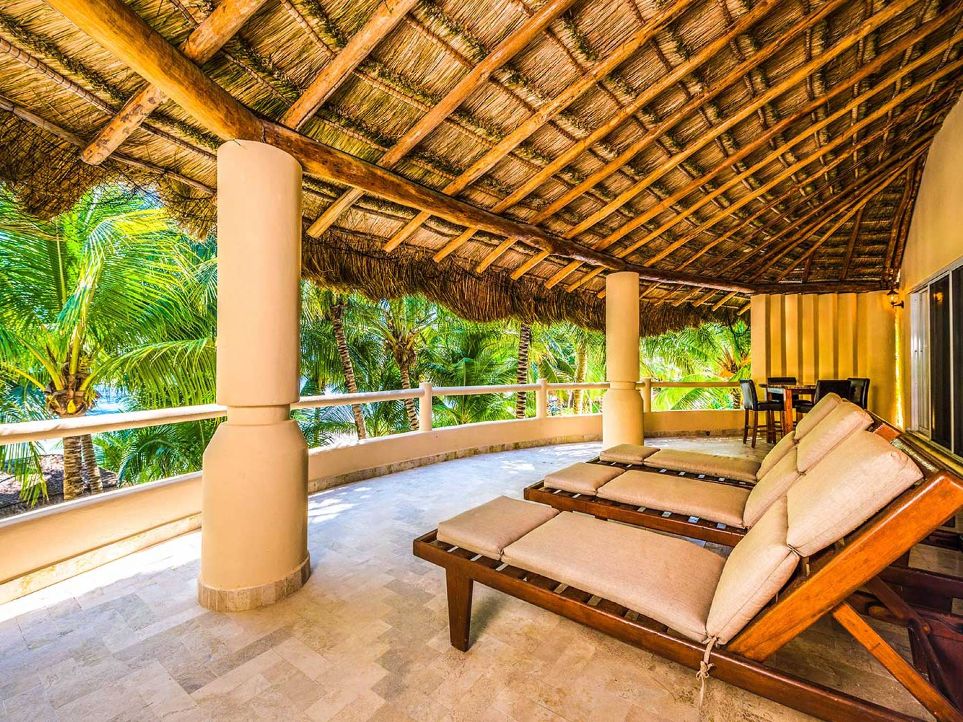 Un escalier extérieur mène à la magnifique chambre principale sur le toit surmontée d'un palapa. C'est probablement la chambre la plus romantique, avec une terrasse privée meublée et une vue élevée sur les Caraïbes d'un côté et la jungle tropicale luxuriante de l'autre.