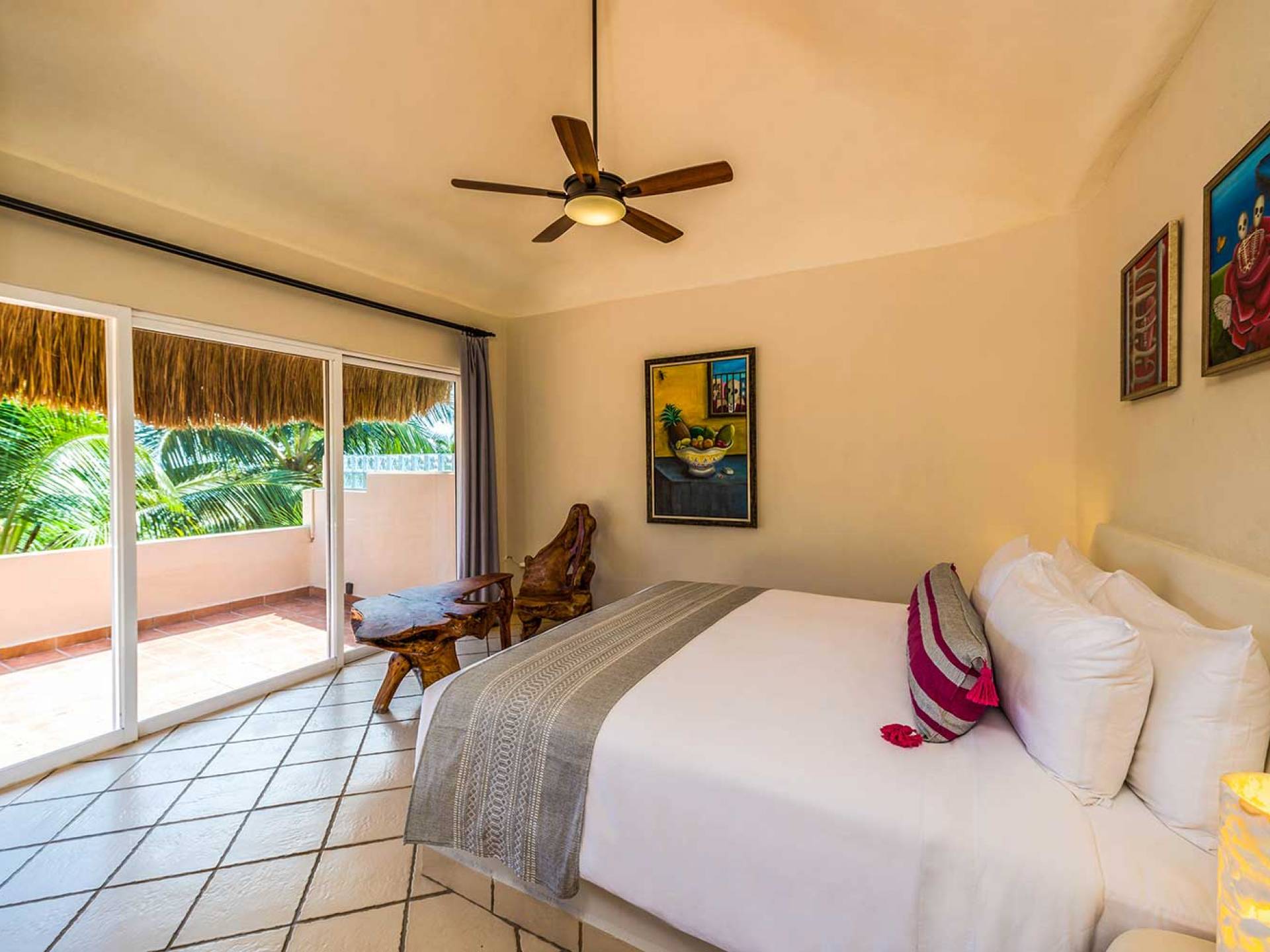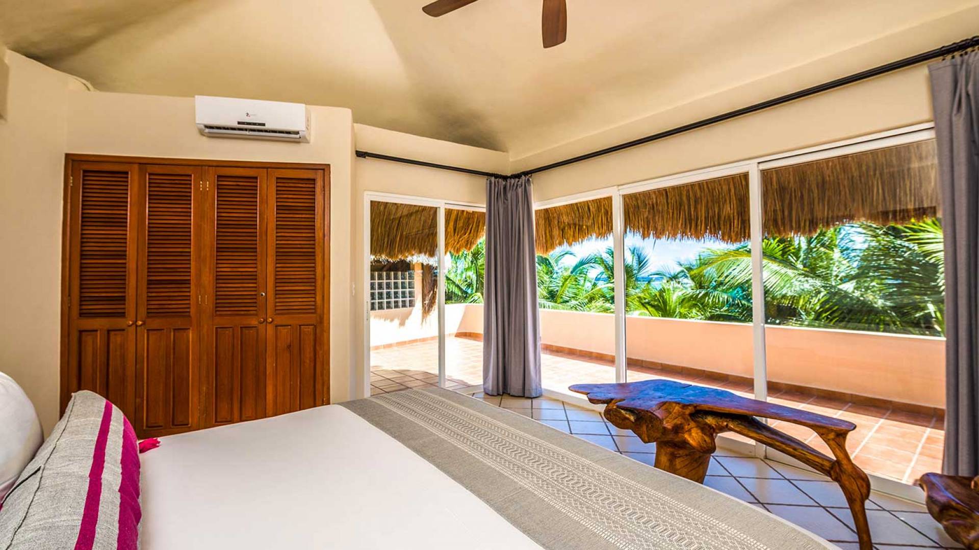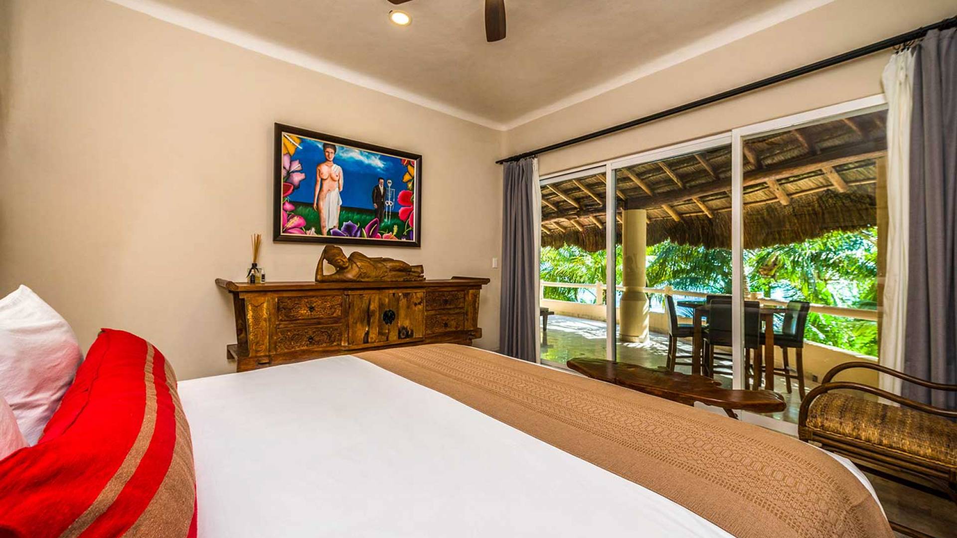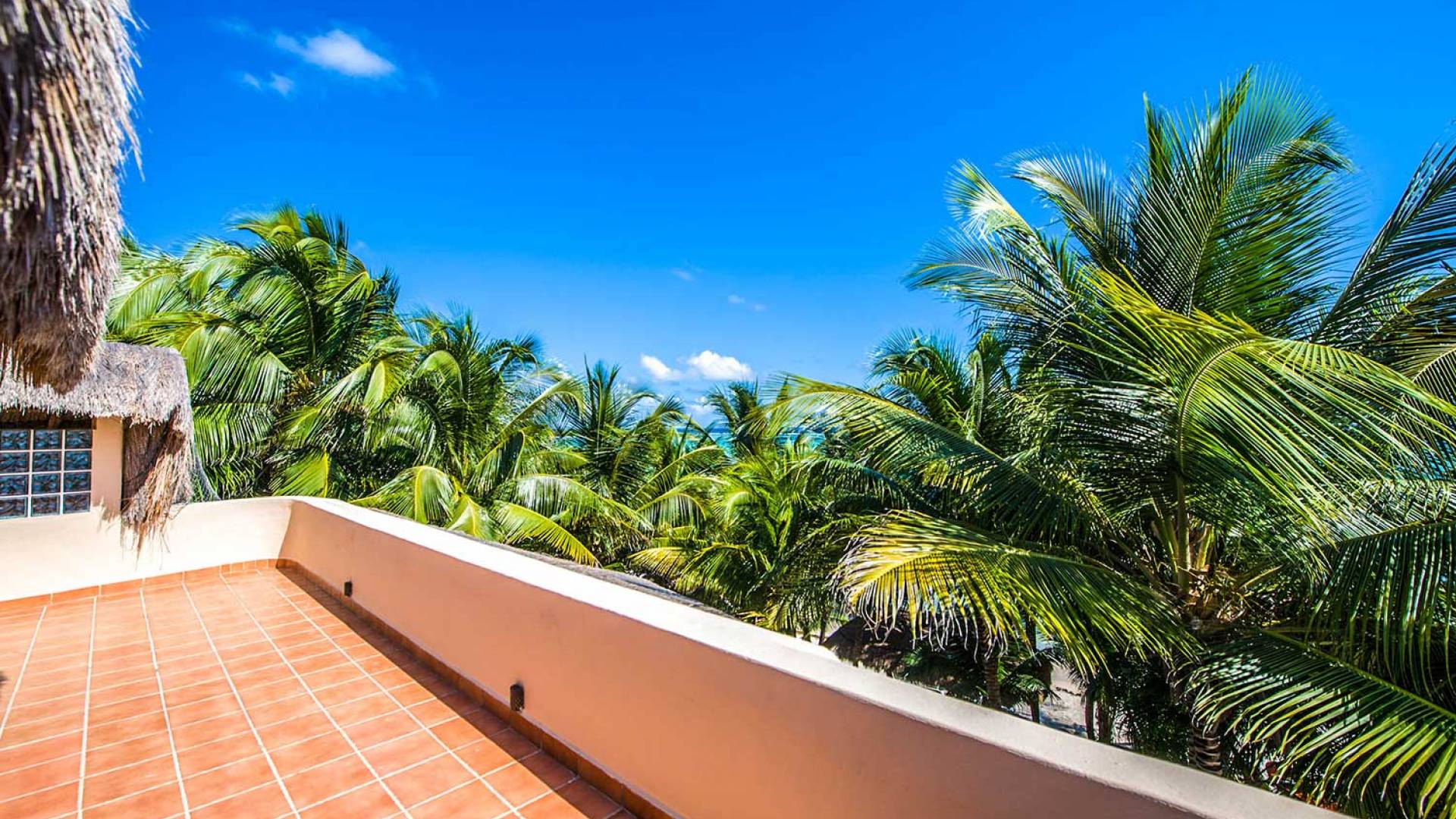 Un escalier extérieur mène à la magnifique chambre principale sur le toit surmontée d'un palapa. C'est probablement la chambre la plus romantique, avec une terrasse privée meublée et une vue élevée sur les Caraïbes d'un côté et la jungle tropicale luxuriante de l'autre.