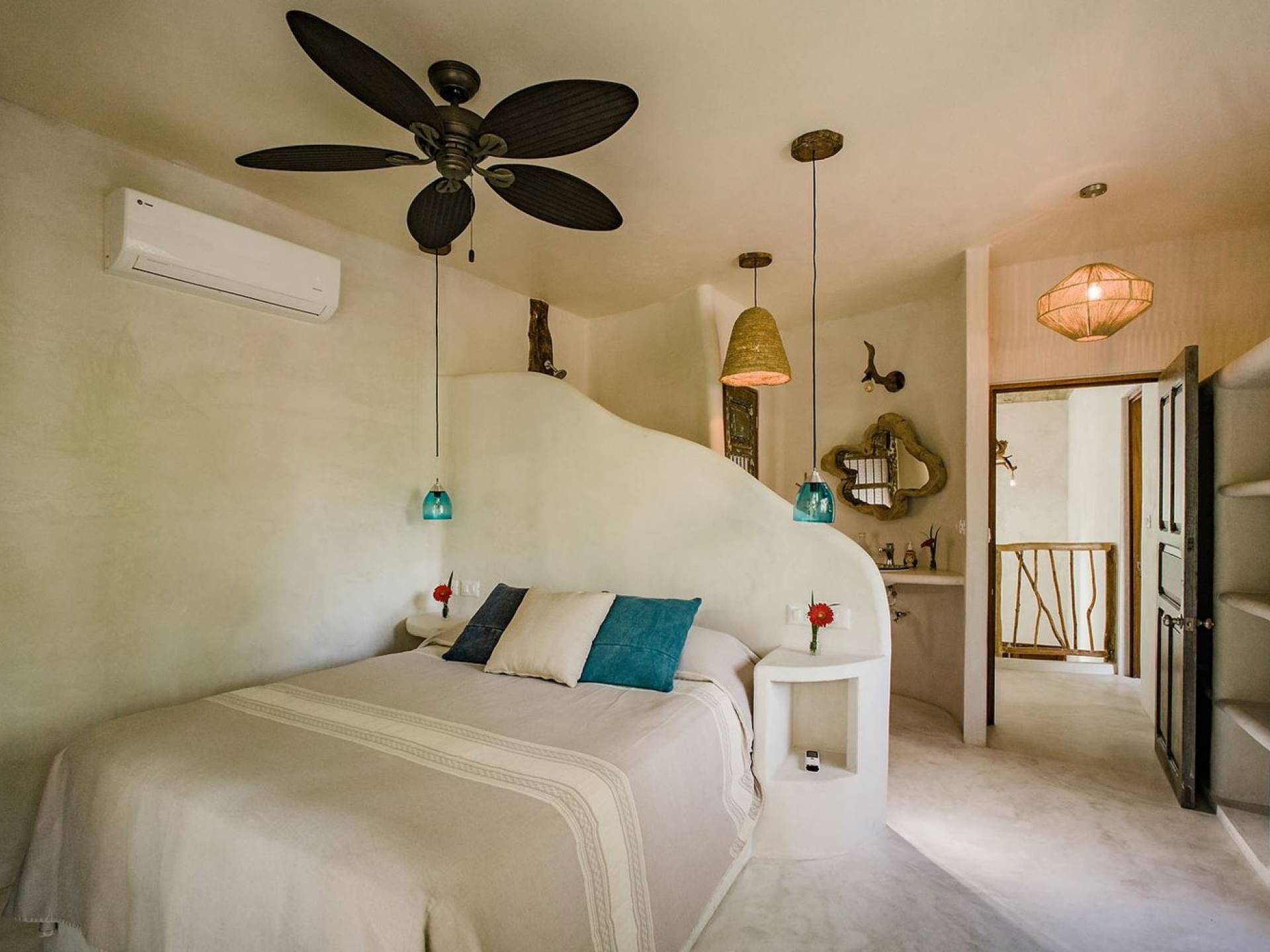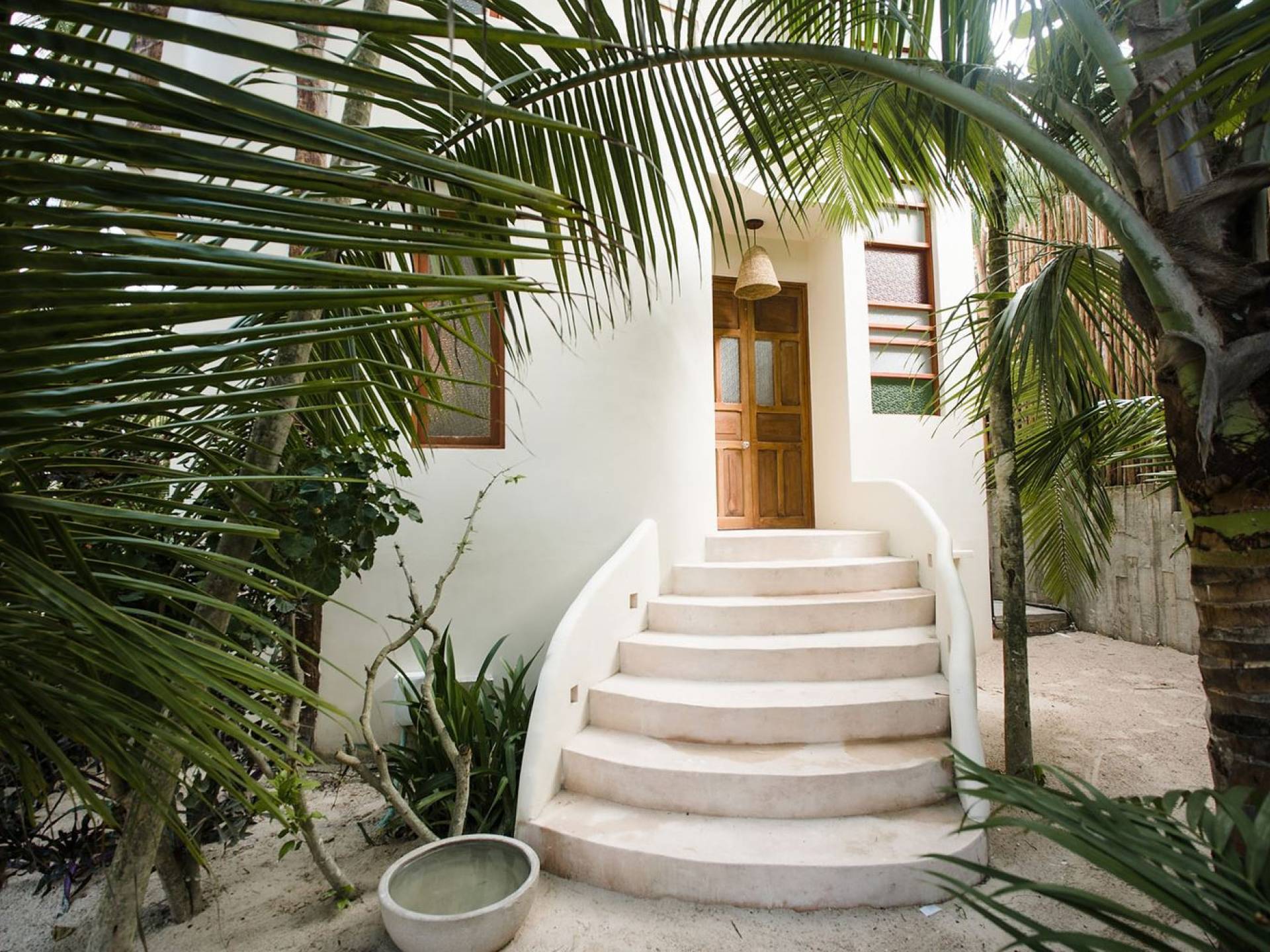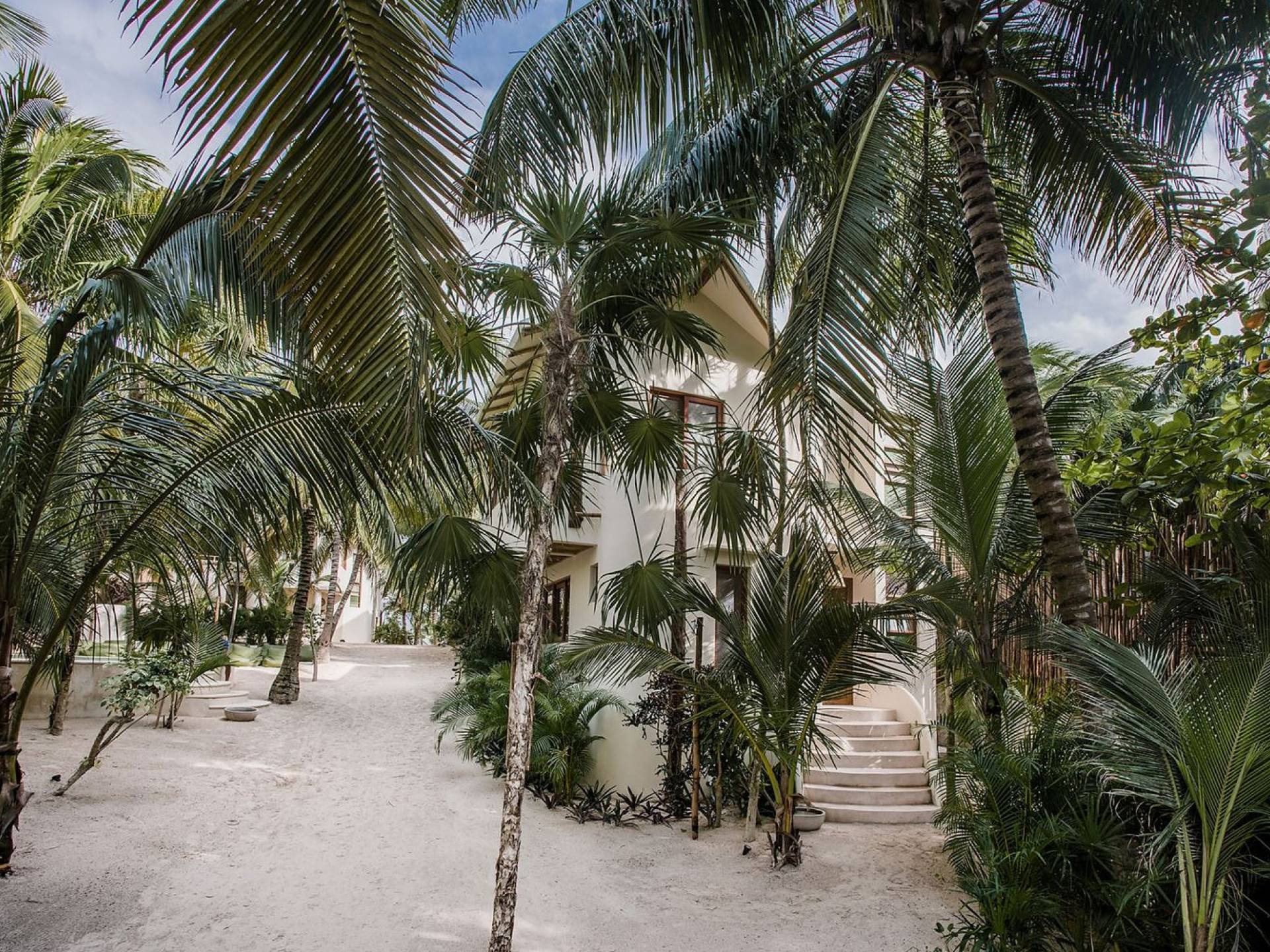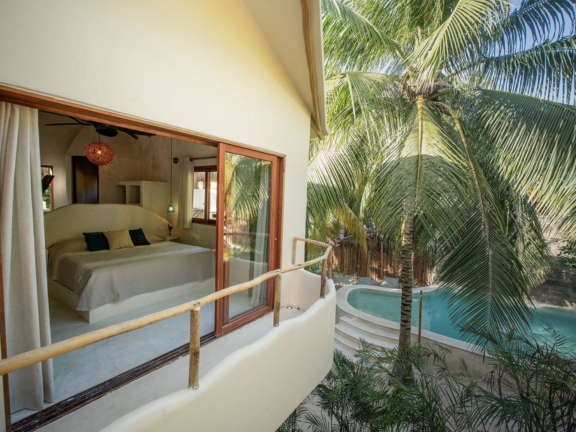 Les deux deuxièmes chambres sont aux niveaux supérieurs au milieu des palmiers. La chambre principale dispose d'un lit king-size, d'une vue sur la mer, d'une salle de bains privative et d'un balcon Juliette. La troisième chambre a un lit queen-size, une salle de bain attenante et un balcon Juliette. Cette maison est idéale pour un groupe d'amis ou une famille pour se retrouver sur la plage.