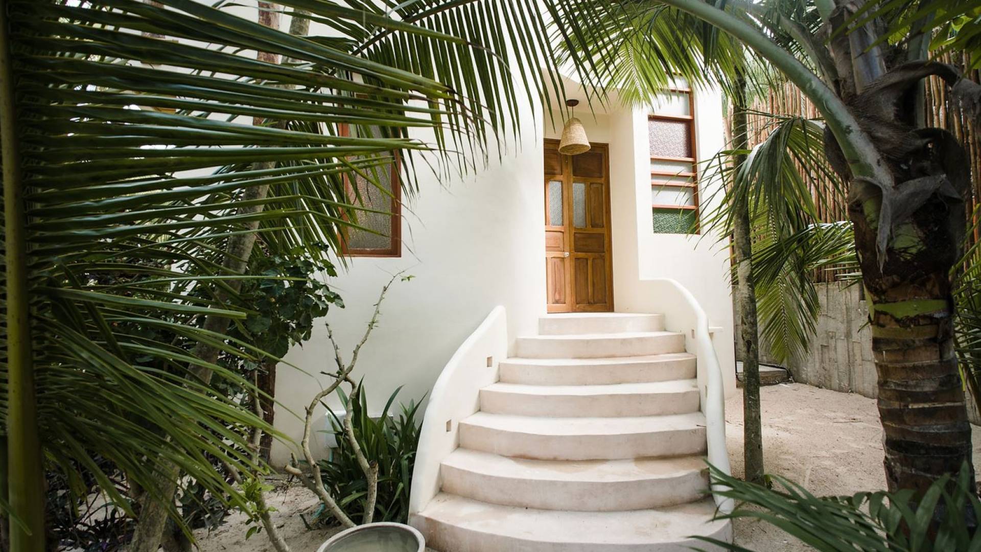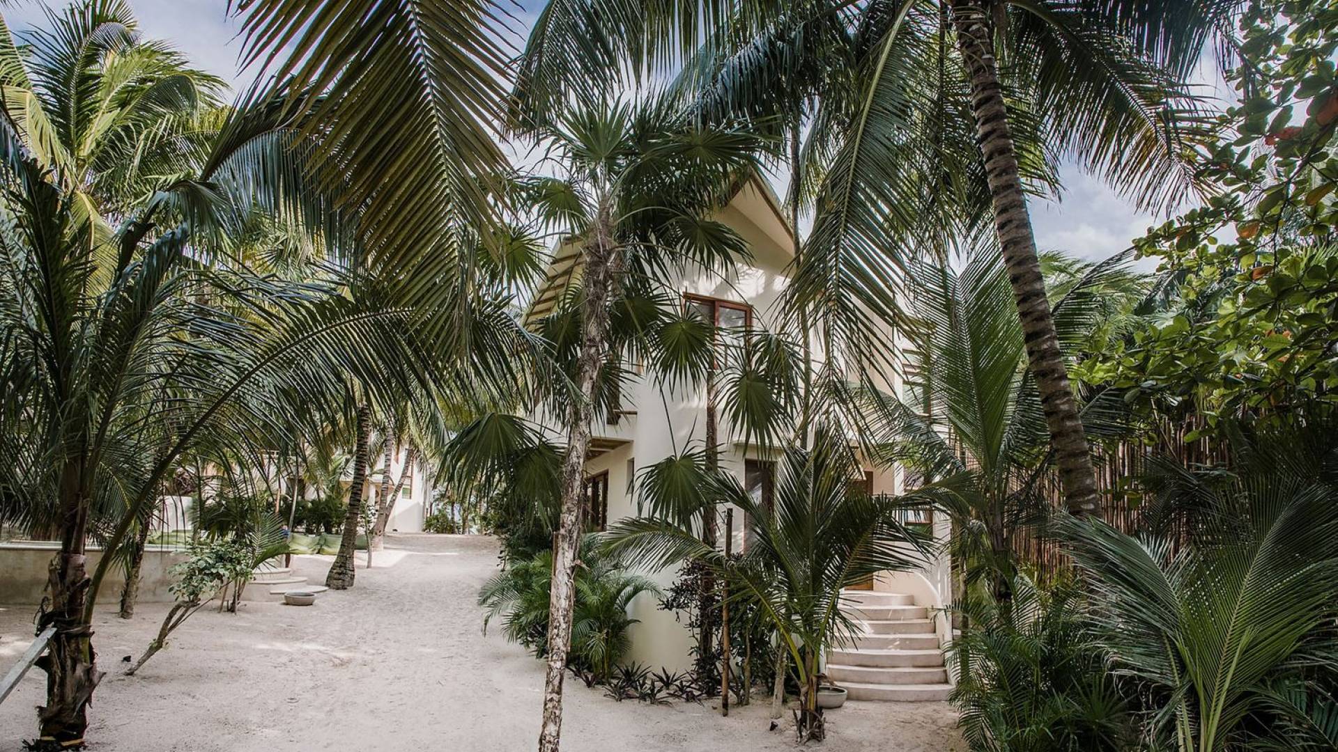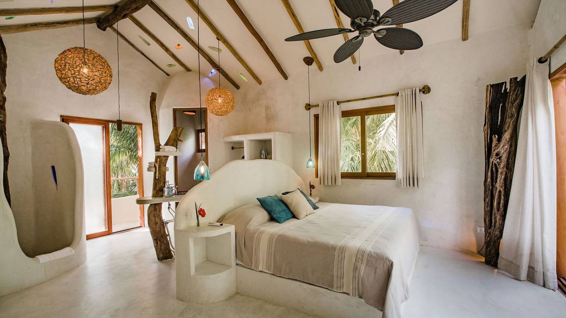 Les deux deuxièmes chambres sont aux niveaux supérieurs au milieu des palmiers. La chambre principale dispose d'un lit king-size, d'une vue sur la mer, d'une salle de bains privative et d'un balcon Juliette. La troisième chambre a un lit queen-size, une salle de bain attenante et un balcon Juliette. Cette maison est idéale pour un groupe d'amis ou une famille pour se retrouver sur la plage.