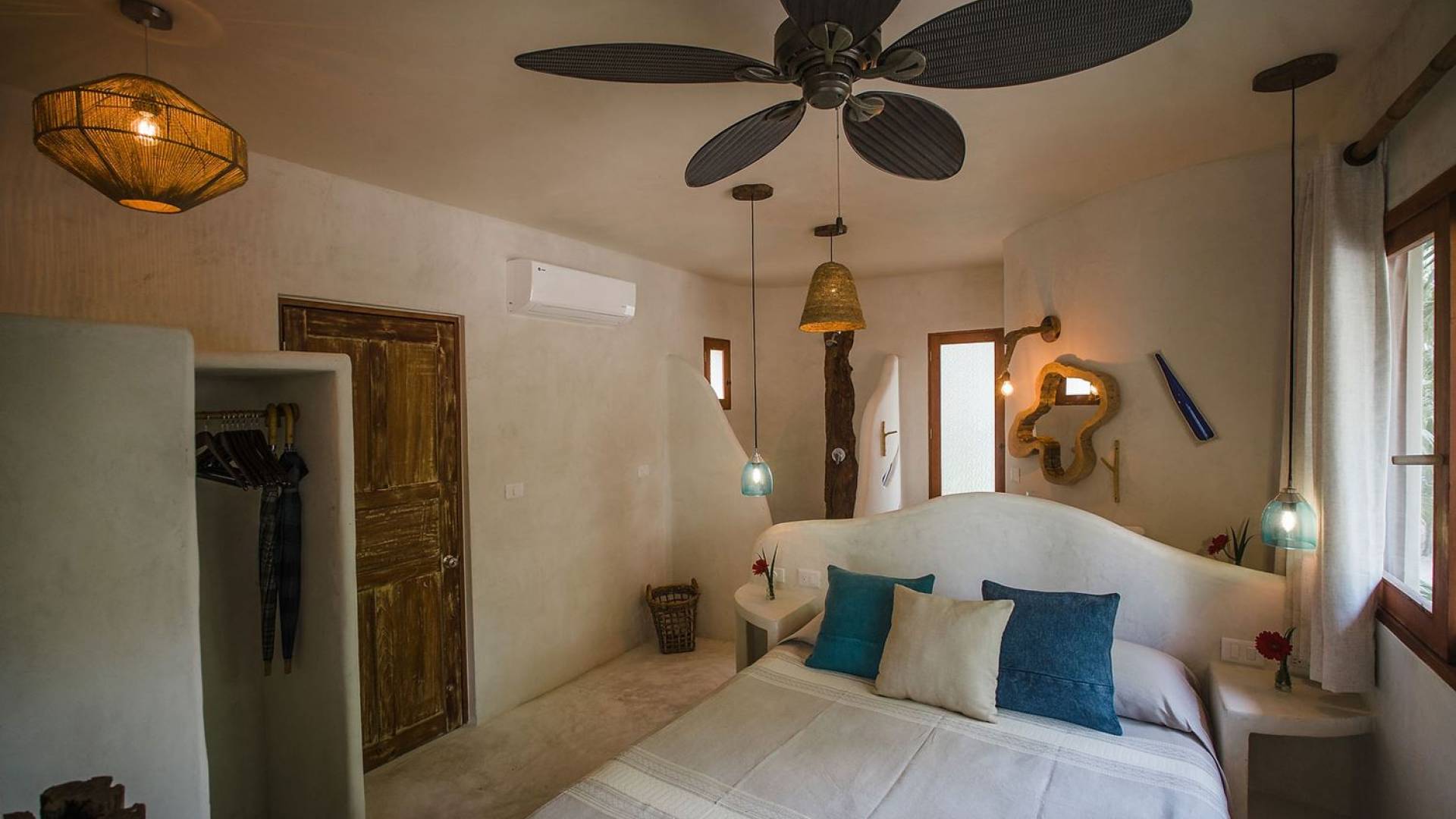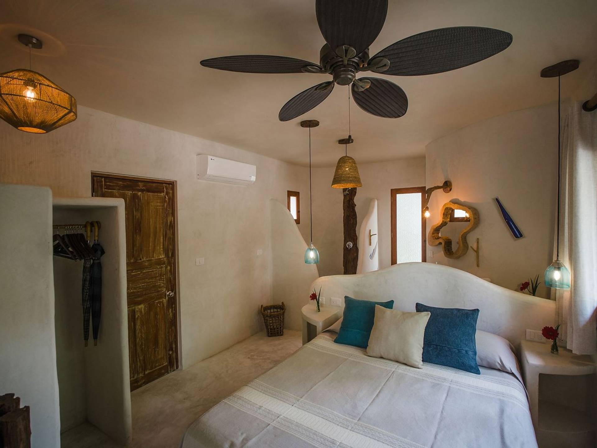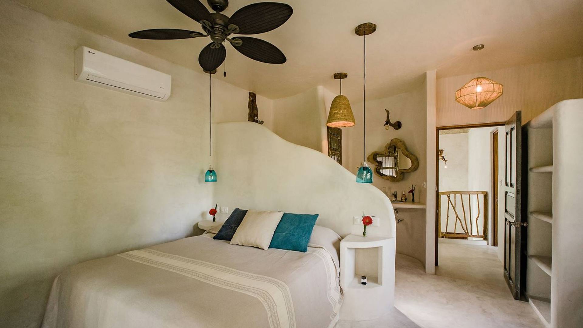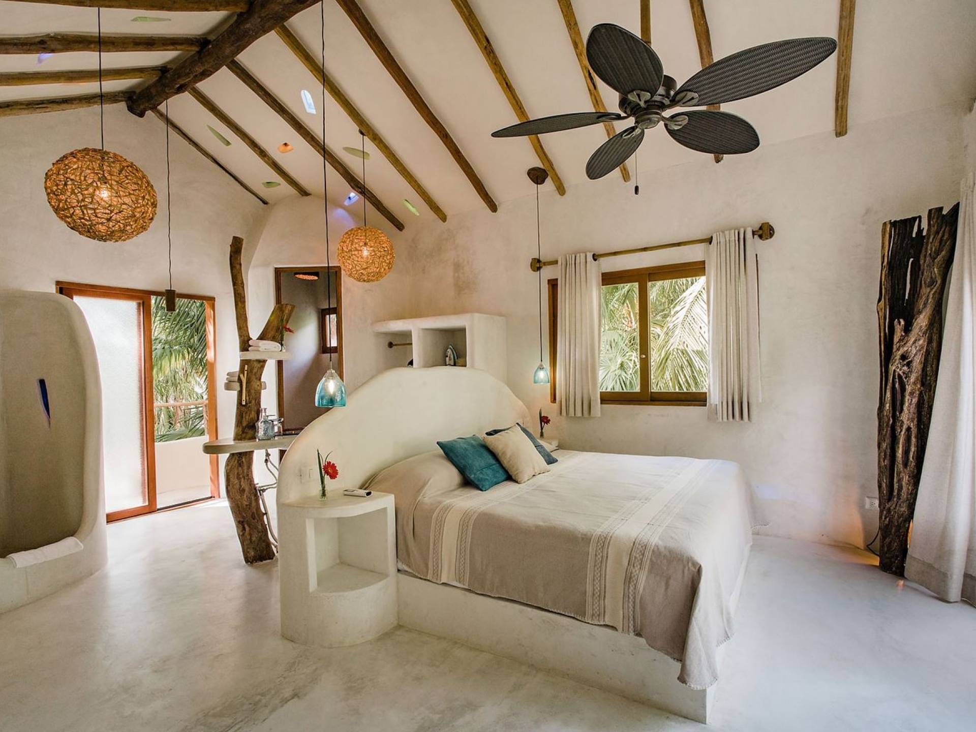 Les deux deuxièmes chambres sont aux niveaux supérieurs au milieu des palmiers. La chambre principale dispose d'un lit king-size, d'une vue sur la mer, d'une salle de bains privative et d'un balcon Juliette. La troisième chambre a un lit queen-size, une salle de bain attenante et un balcon Juliette. Cette maison est idéale pour un groupe d'amis ou une famille pour se retrouver sur la plage.