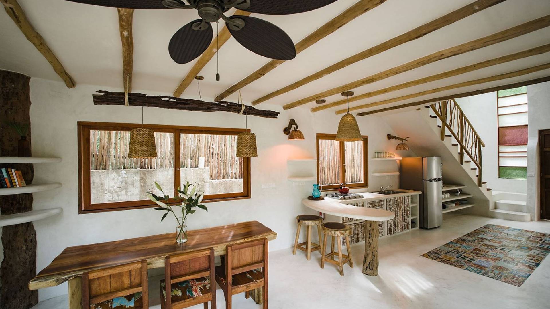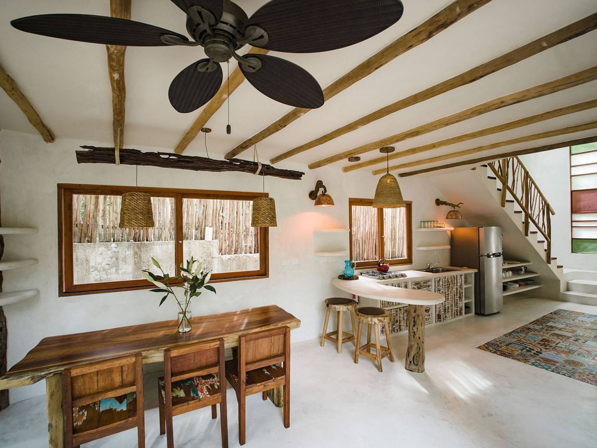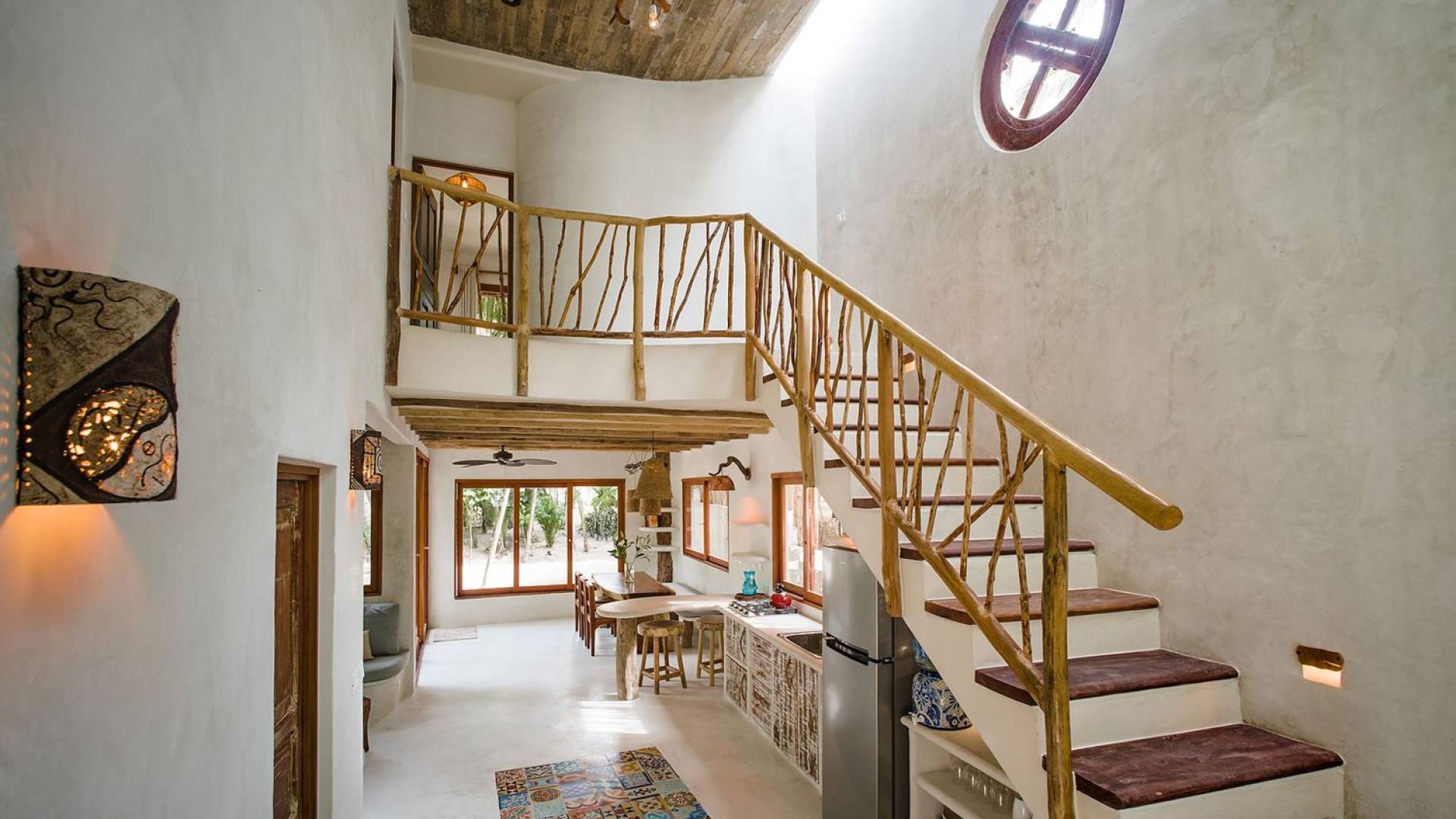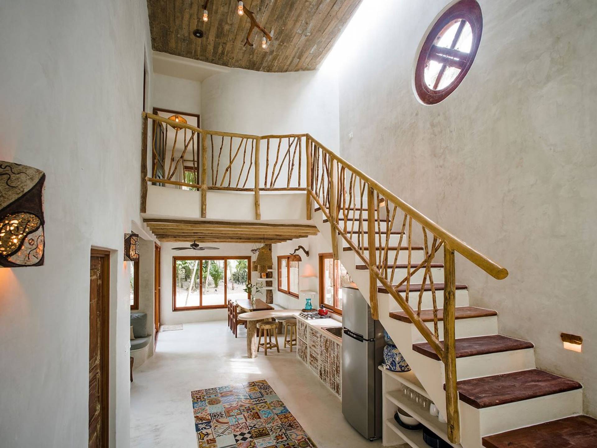 Zorba Dos Tulum est une location de villa de luxe avec 3 chambres sur une magnifique propriété en bord de mer à l'aménagement naturel. Cette maison 3BR est à quelques pas de la mer et de la piscine commune rafraîchissante sur place. Les éléments naturels et les touches artistiques dans toute la maison reflètent la belle ambiance décontractée et la sensation de Tulum. L'éclairage en cuivre, les articles de toilette biologiques, les carreaux artisanaux et les fenêtres en verre coloré ne sont que quelques-unes des nombreuses caractéristiques de conception intéressantes que vous verrez.