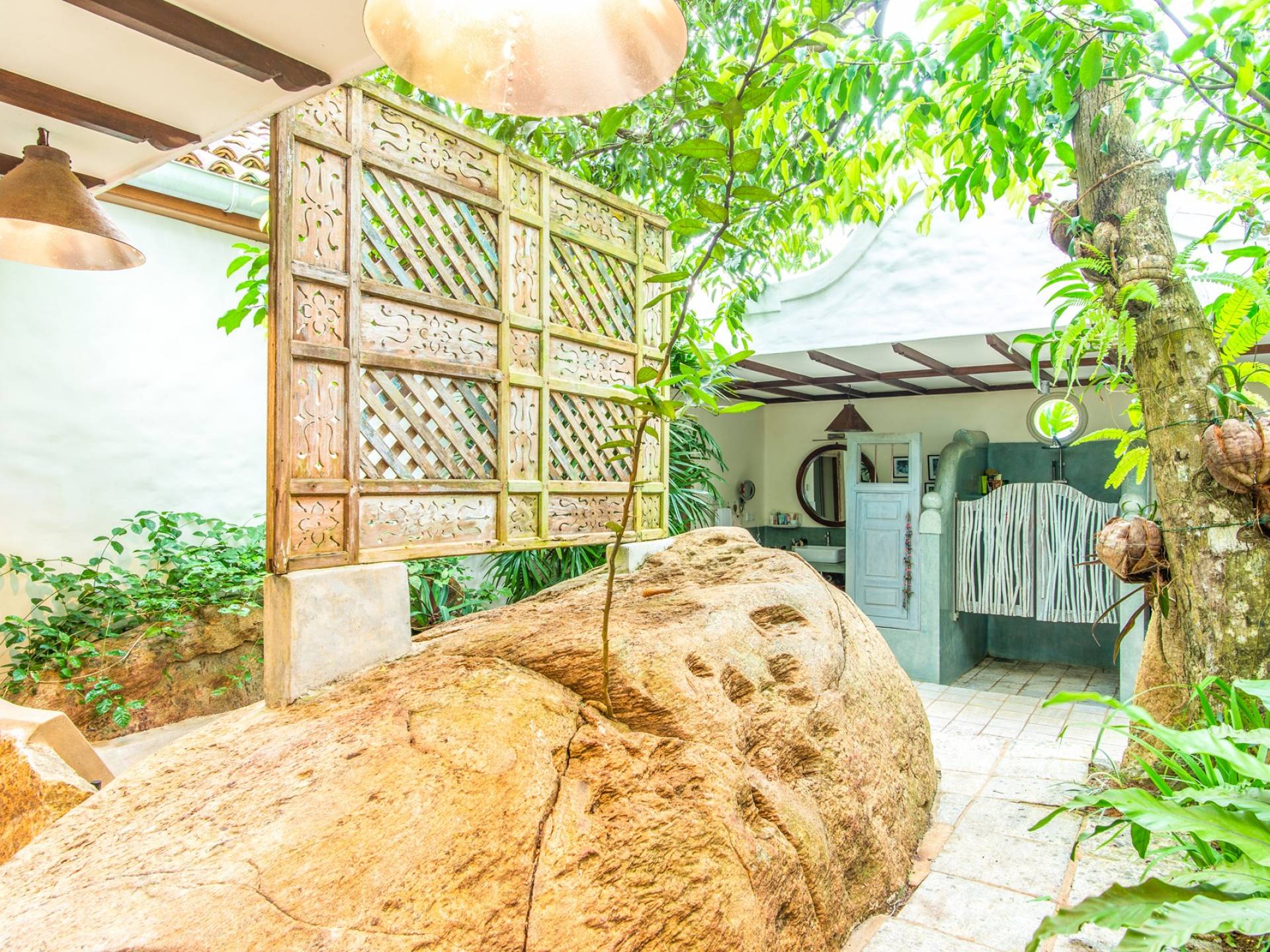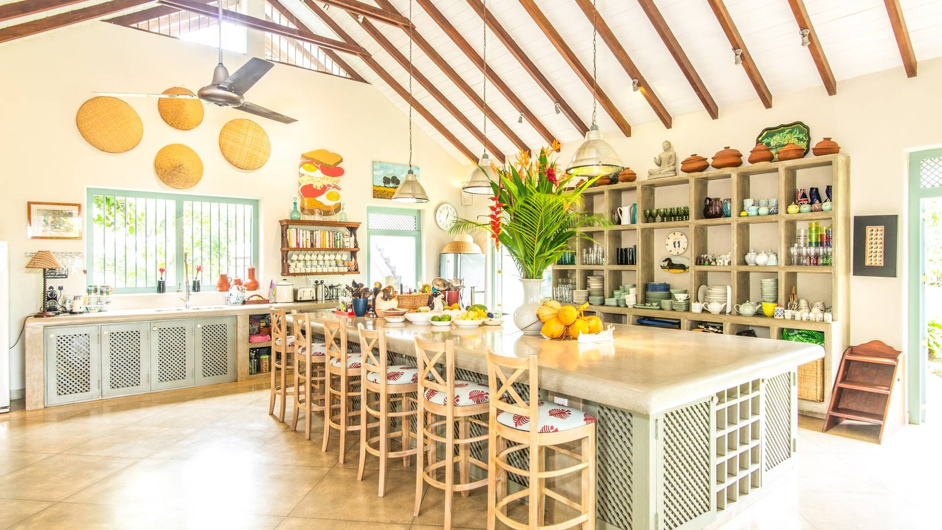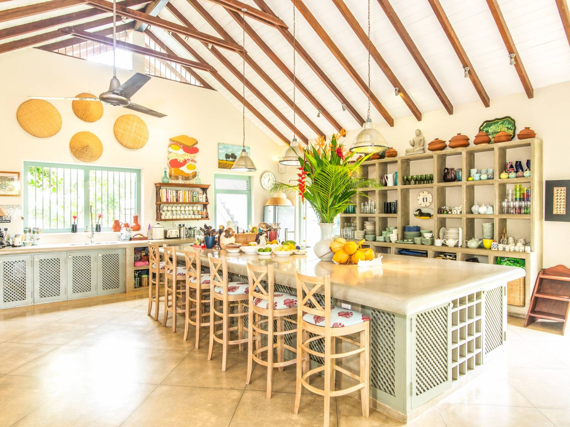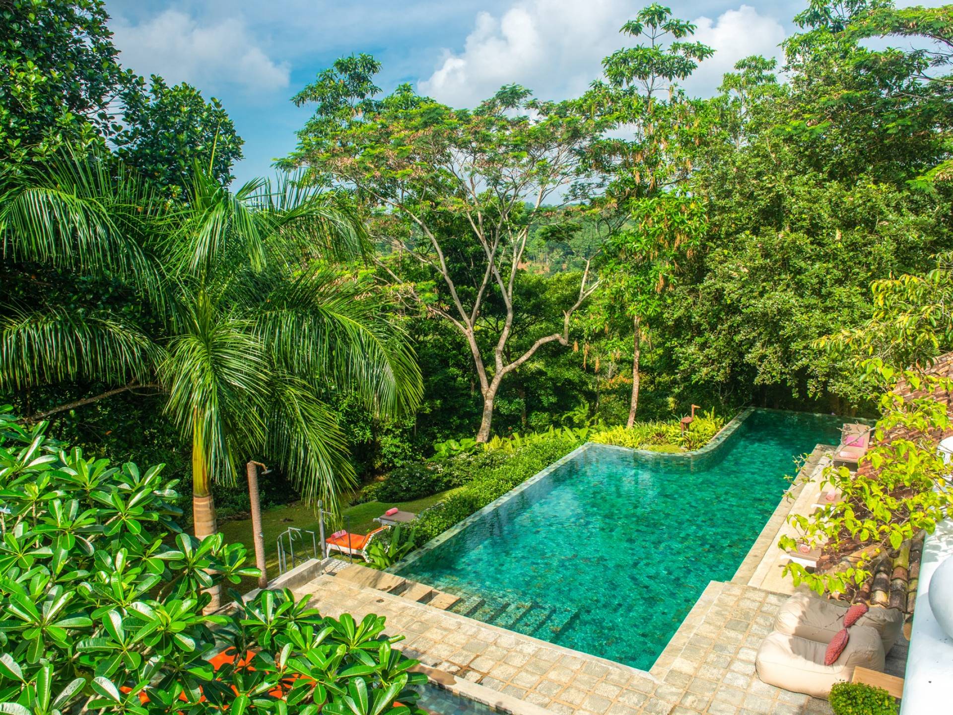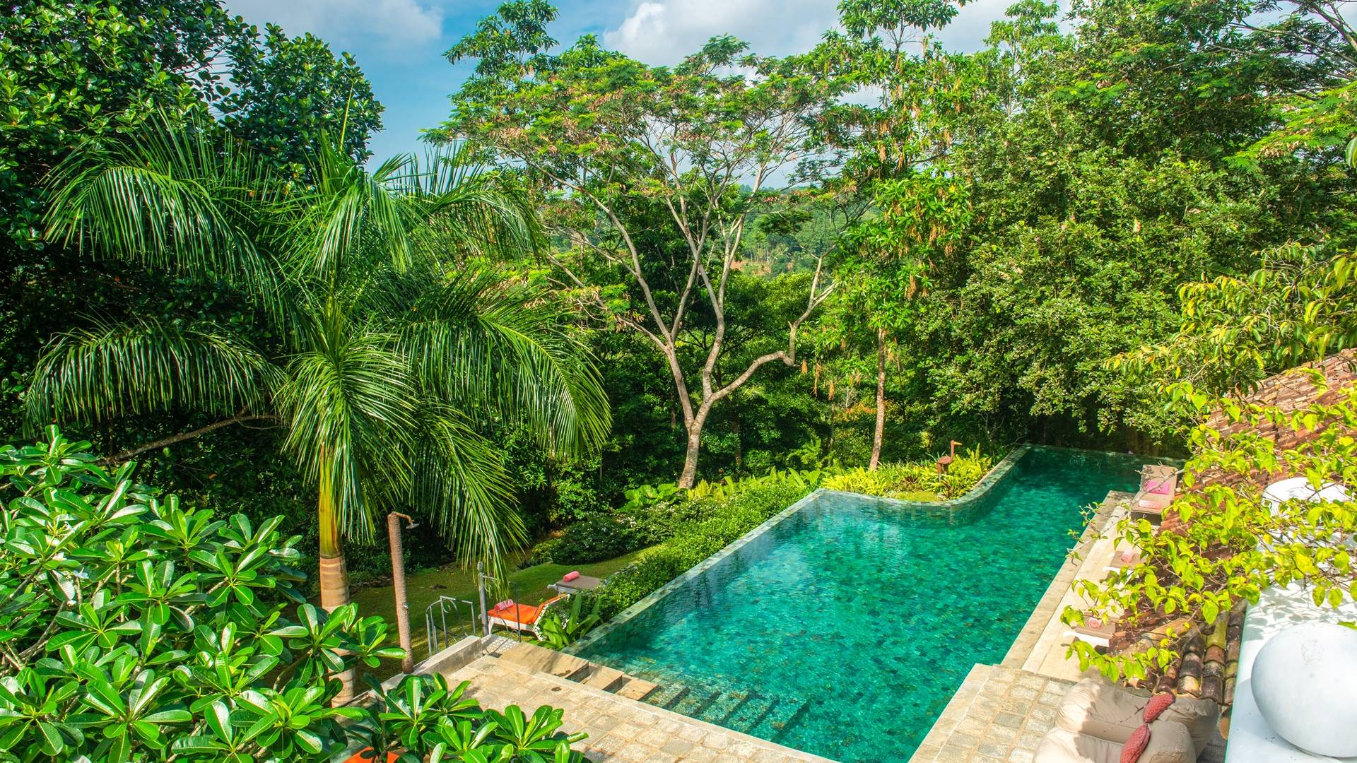 Les immenses espaces de vie et de restauration de la villa Sisidnu comprennent une cuisine spacieuse et bien équipée et offrent une vue imprenable à 360 degrés. Il y a une terrasse sur le toit idéale pour prendre un verre au coucher du soleil, de nombreux autres espaces de repos et de détente isolés et une salle de télévision climatisée avec de vastes canapés. La villa est dotée d'une superbe piscine en forme de L à débordement, à partir de laquelle on peut regarder les navires sillonner la mer lointaine et les singes jouer dans les arbres. Les jardins tropicaux luxuriants avec des fleurs et des fruits exotiques offrent un espace supplémentaire pour se détendre et profiter de la brise fraîche.