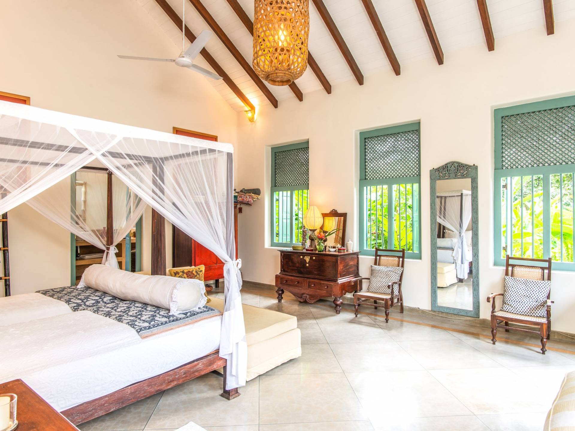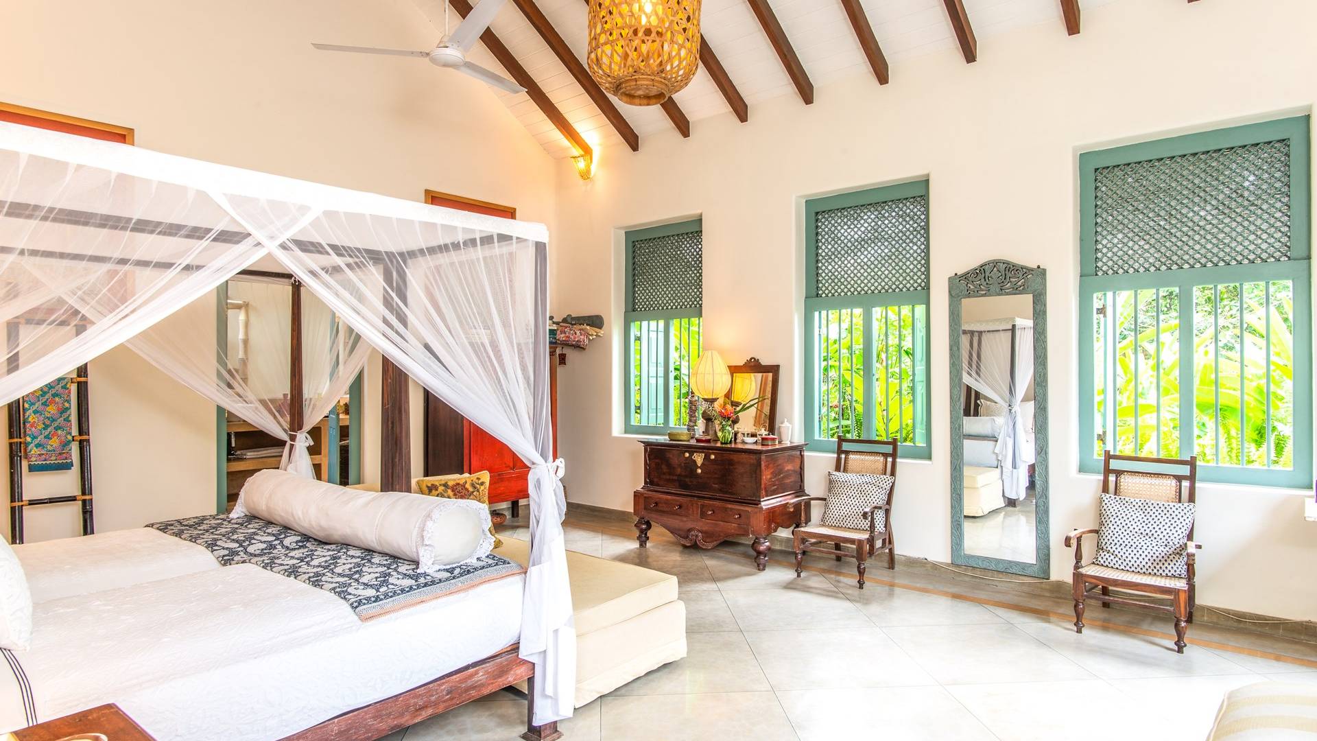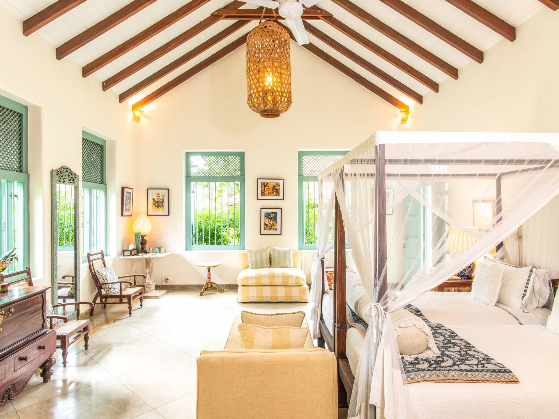 Le magnifique Sisindu Tea Estate Galle est une idée originale d'un couple britannique passionné de décoration d'intérieur, qui l'appelle désormais chez lui. La villa, conçue par l'un des plus grands architectes du Sri Lanka, se trouve dans une position élevée au sommet d'une colline à 800 pieds au-dessus du niveau de la mer, entourée d'une plantation de thé en activité avec une vue imprenable de tous les côtés.