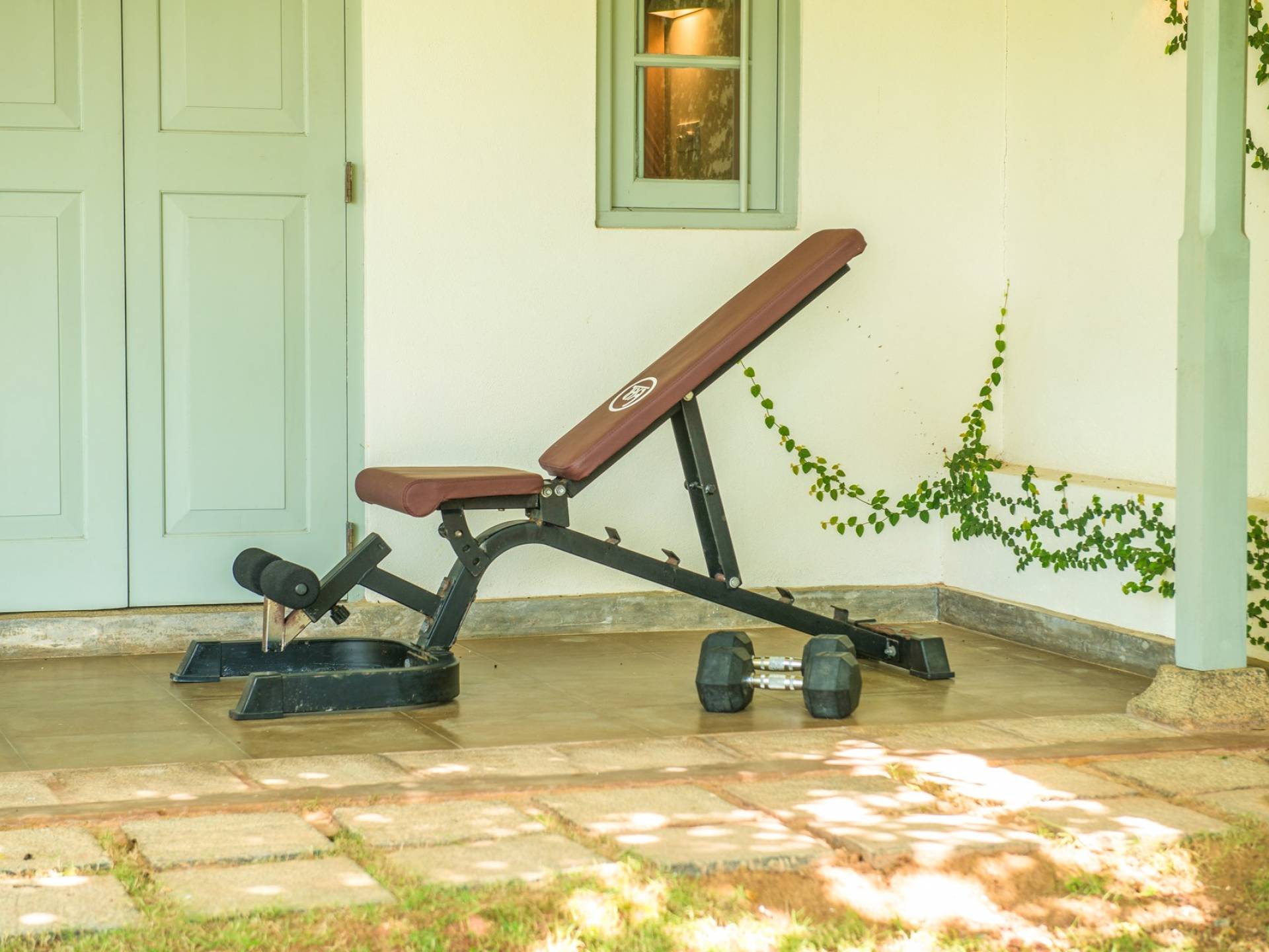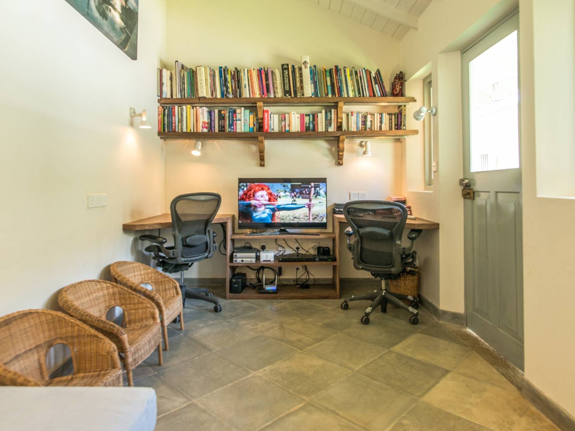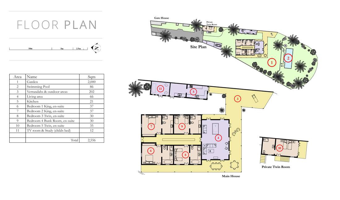 4 chambres sont réparties dans la maison principale et sont centrées autour d'une cour tandis que la 5ème est située dans un bâtiment séparé près de la porte d'entrée. Le salon est équipé d'installations de divertissement telles que TV/DVD, son surround, etc. Une terrasse à l'avant mène à une petite pelouse avec une balançoire pour enfant dans un coin.