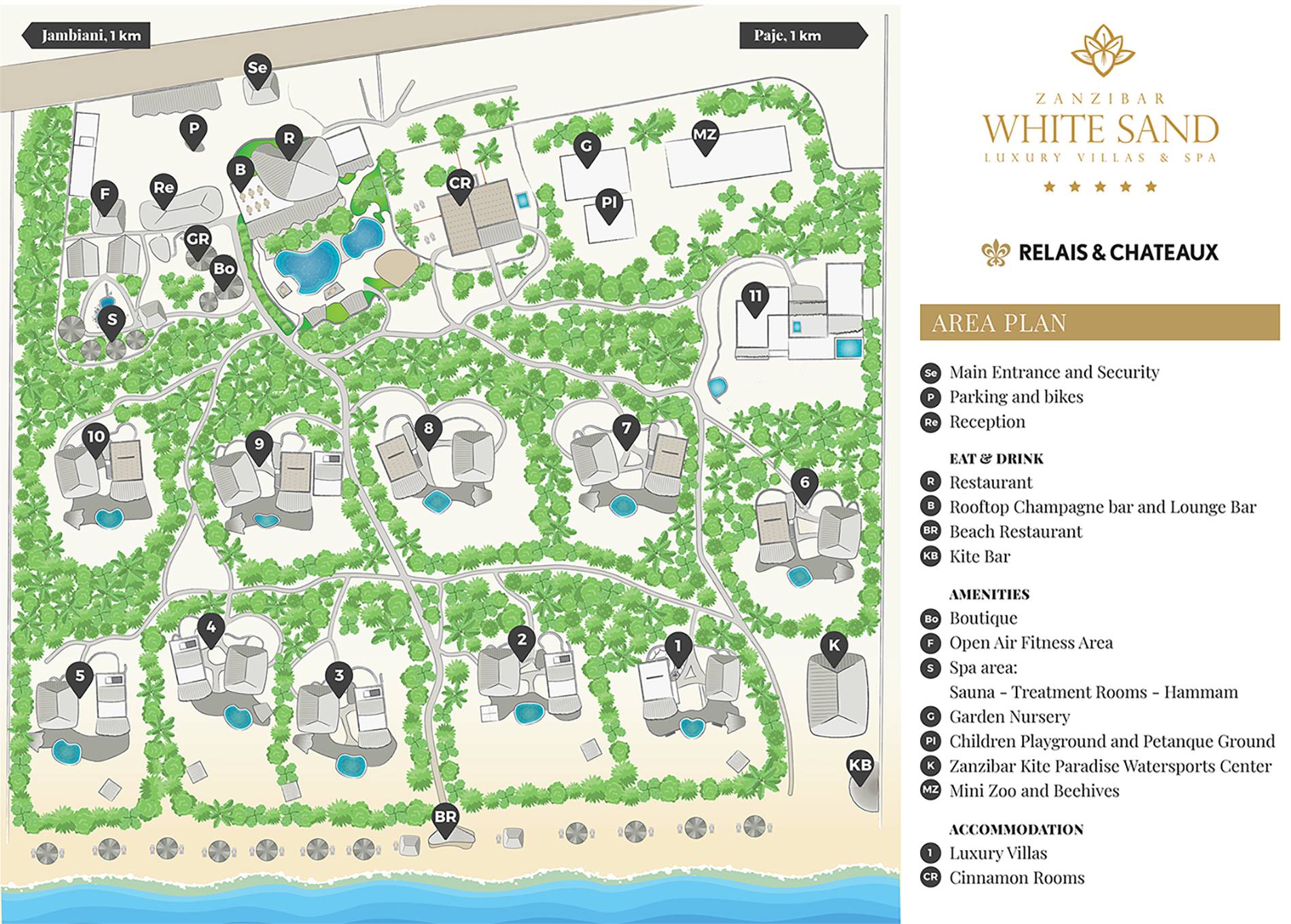 Zanzibar White Sand Luxury Villas & Spa comprend 11 villas (villas 1 chambre en bord de mer, villas familiales 2 chambres et villa présidentielle 5 chambres) et des chambres Cinnamon face au front de mer de la plage de Paje et réparties sur 4 hectares (10 acres) ) d'un jardin tropical. Le complexe comprend également 3 chambres Cinnamon, un restaurant à la carte, un restaurant de plage servant le déjeuner et 3 bars situés dans les différentes zones du complexe (lounge bar, bar de plage, bar à champagne sur le toit). Pour les activités de jour, un centre de sports nautiques et de kitesurf, de grandes piscines, un centre de remise en forme extérieur, une aire de jeux pour enfants et un spa comprenant quelques salles de soins vous garantiront des journées radieuses.
