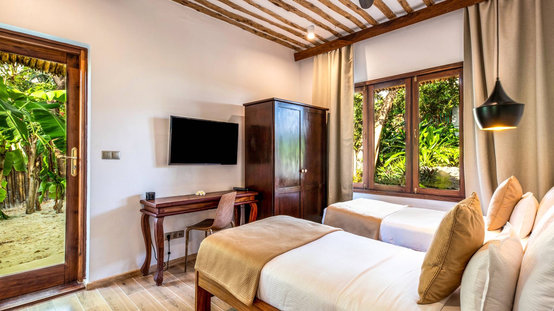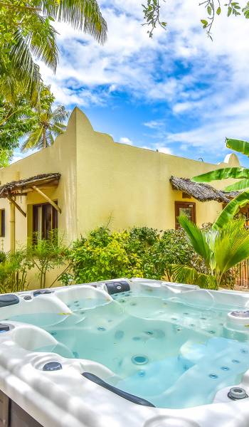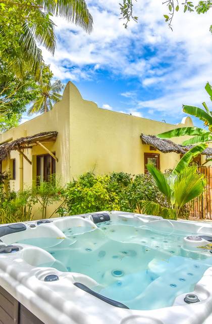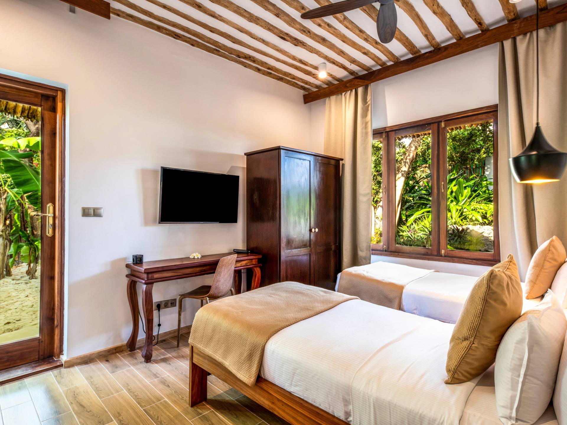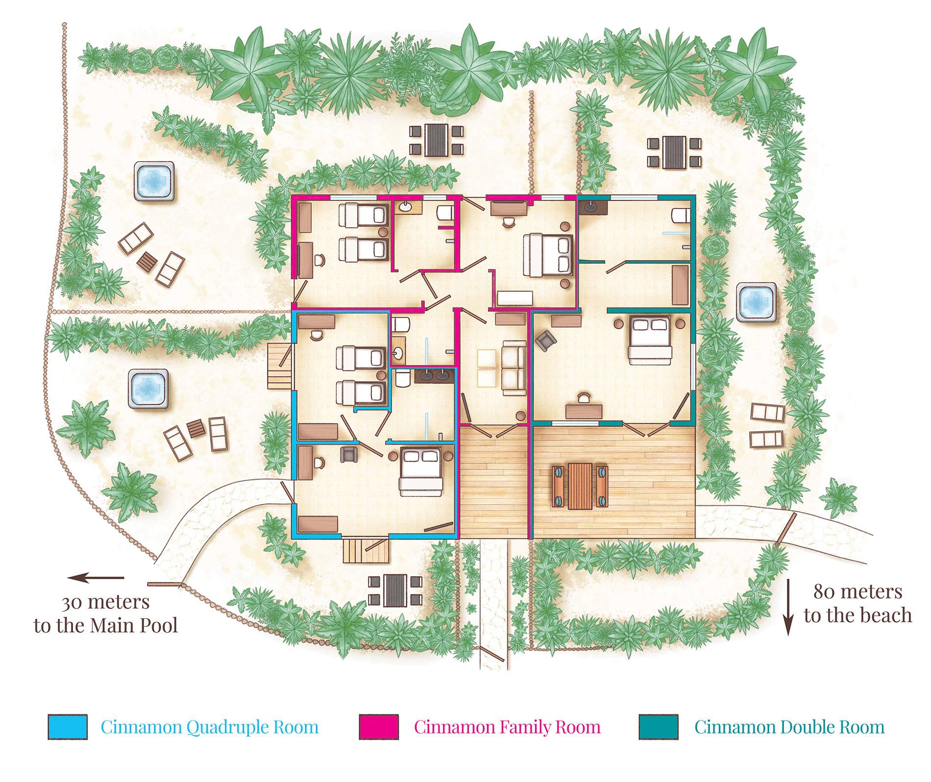 Les chambres Cinnamon sont situées dans un seul bâtiment, avec vue sur le jardin et à environ 100 mètres de la plage. Ils sont situés à 50 mètres de la grande piscine du restaurant principal. Cette chambre comprend deux chambres avec respectivement 1 lit double et 2 lits simples, deux salles de bains, un salon avec canapé-lit et un jardin privé avec une table à manger extérieure et un bain à remous.