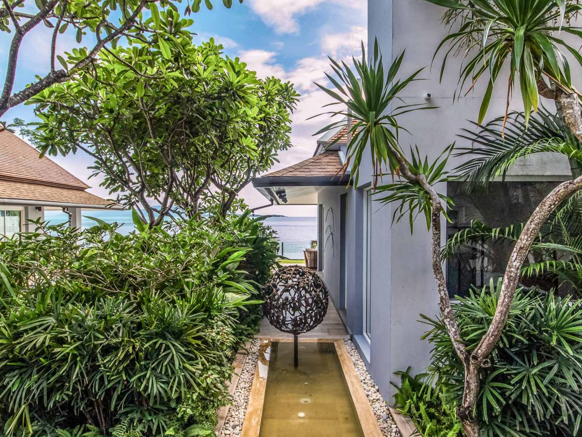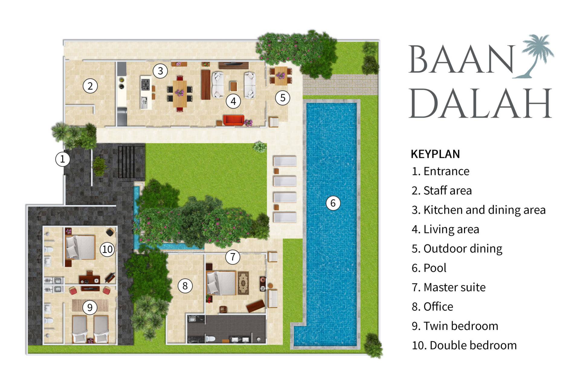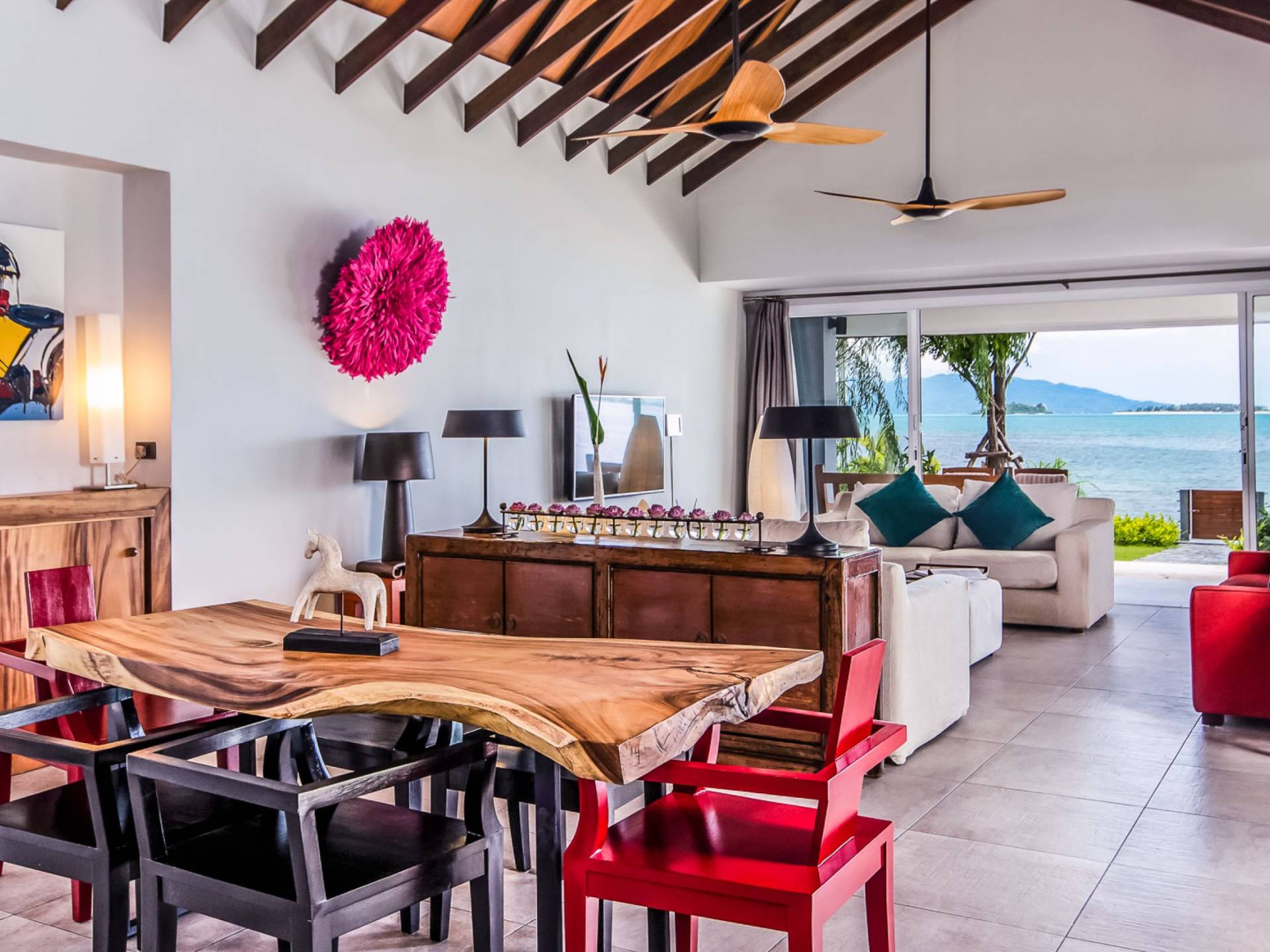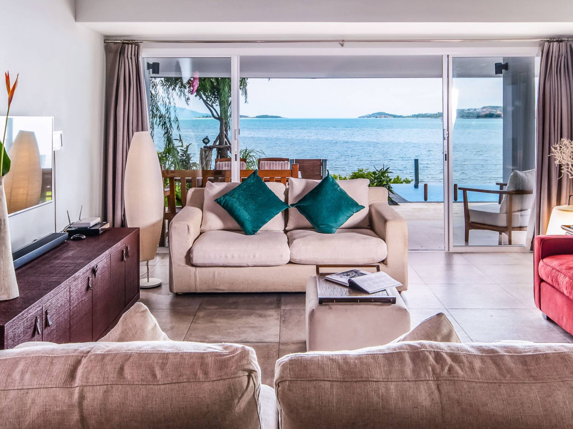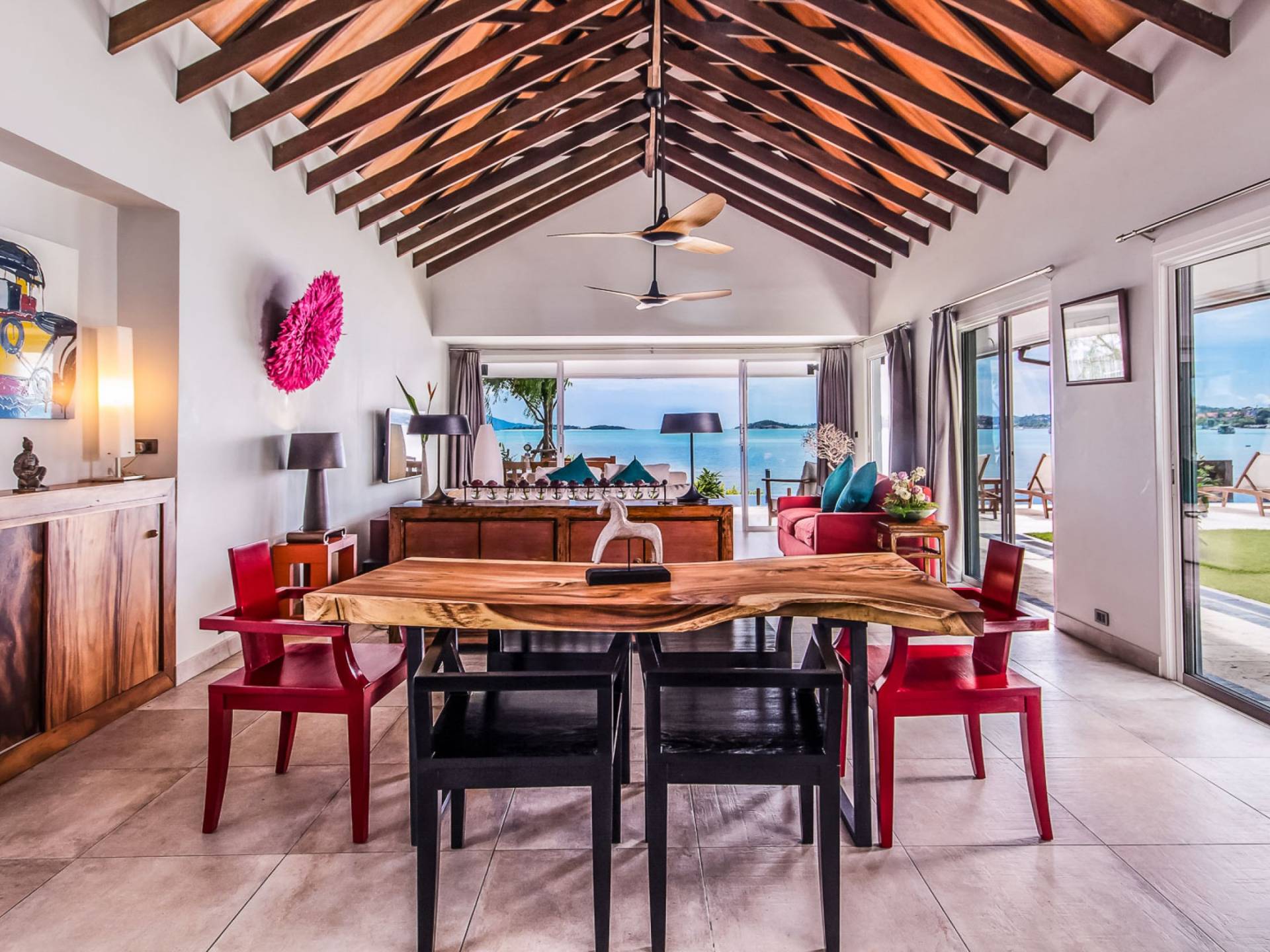 Baan Dalah Samui offre à ses clients un hébergement et des installations confortables qui compléteront sûrement une escapade sur une île. Les clients entrent dans la villa par sa grande porte d'entrée, et en entrant, on a immédiatement l'impression que le monde a été laissé de l'autre côté de la porte. La conception a été aménagée de manière à ce que vous soyez immédiatement accueilli par une vue sur le jardin et la piscine, tout en offrant une vue imprenable sur la mer et les îles adjacentes. La maison est construite en trois pavillons distincts disposés autour d'un jardin tropical qui a été entièrement replanté en même temps que la rénovation de la maison. La cuisine/salle à manger et le salon de la maison avec ses canapés confortables et ses ventilateurs de plafond ainsi qu'un patio extérieur pour les repas se trouvent dans un seul bâtiment et avec les baies vitrées de la chambre, les clients disposent d'un espace merveilleusement relaxant pour se détendre et dîner et avec vue sur la mer 24h/24.