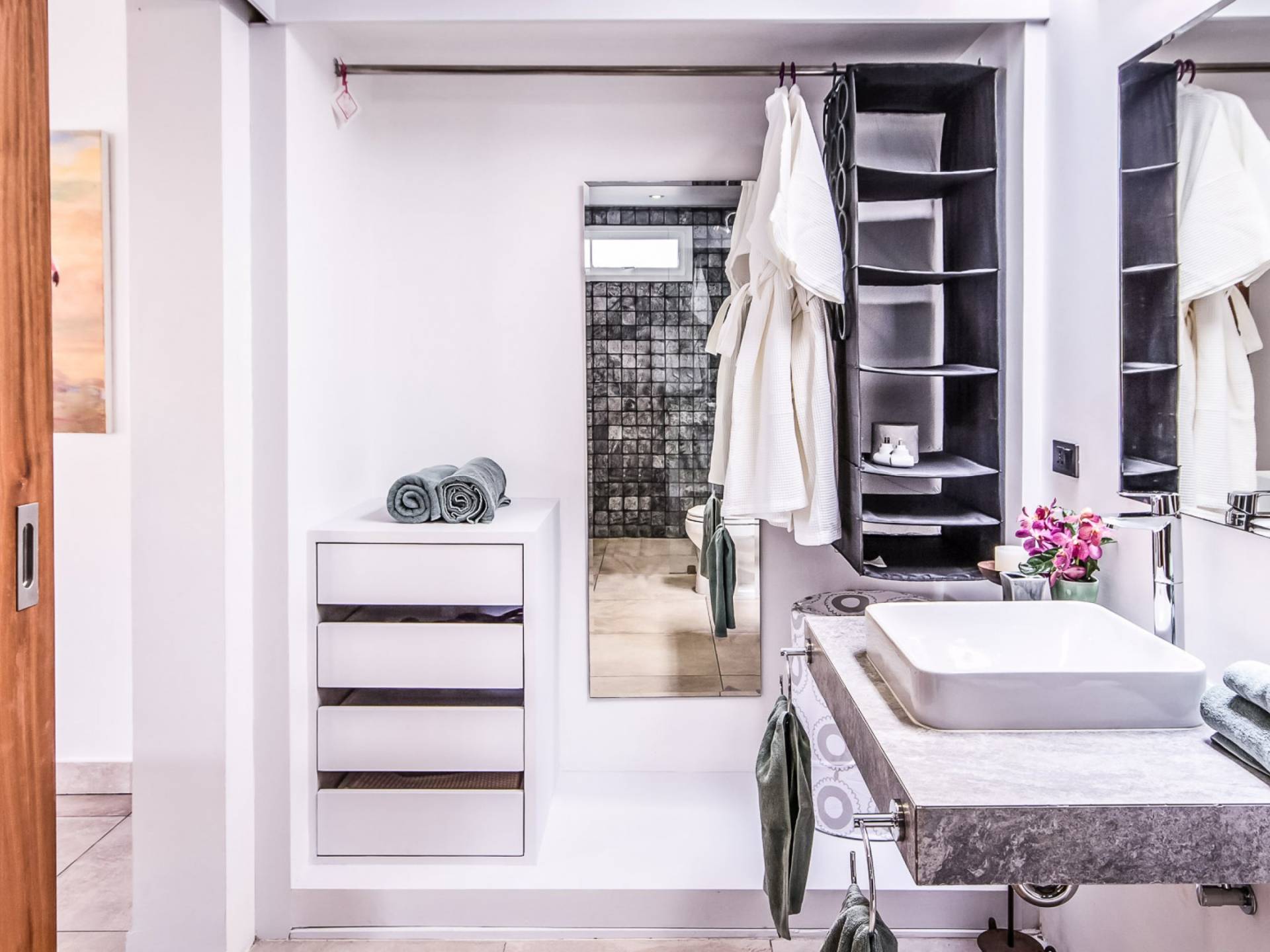 En face du pavillon de vie se trouve la chambre principale avec sa salle de bains privative et cette chambre bénéficie de ce que l'on peut vraiment appeler une vue imprenable sur la mer. Avec la maison face au nord, les lève-tôt seront accueillis par des levers de soleil incroyables tandis que la terrasse dispose de sièges confortables pour regarder le coucher de soleil. Cette chambre spacieuse dispose d'un lit king-size, d'une télévision à écran plasma avec satellite et d'un système de son surround DVD/CD, d'une grande salle de bains privative avec douche à l'italienne, d'une double vasque et d'un grand dressing.