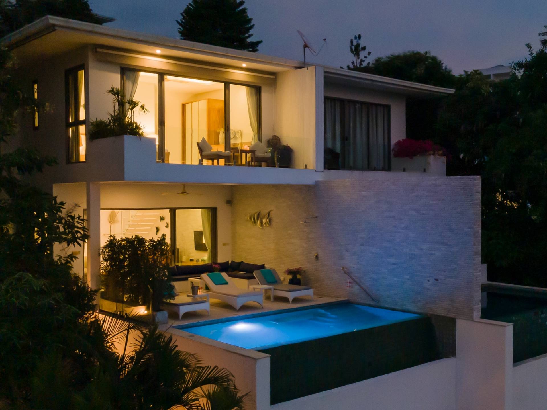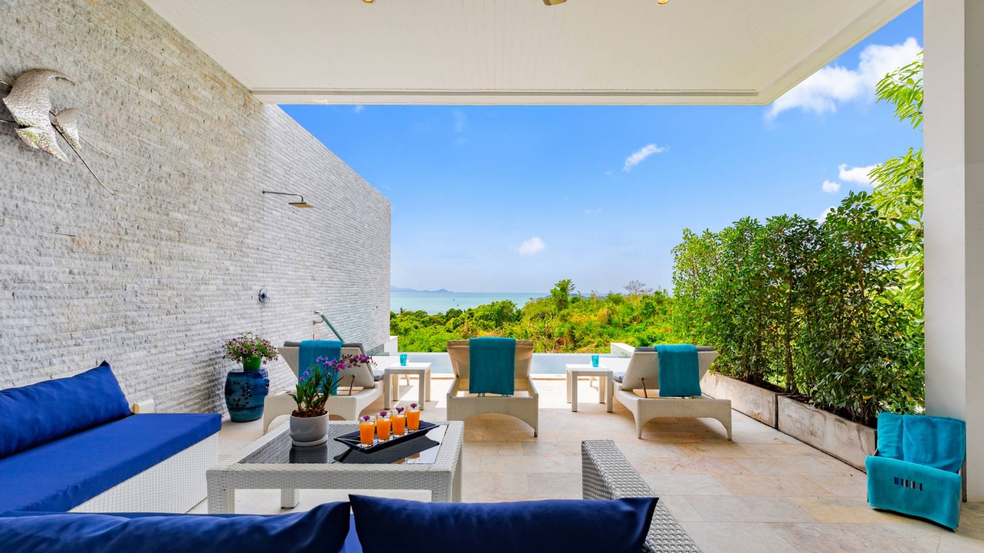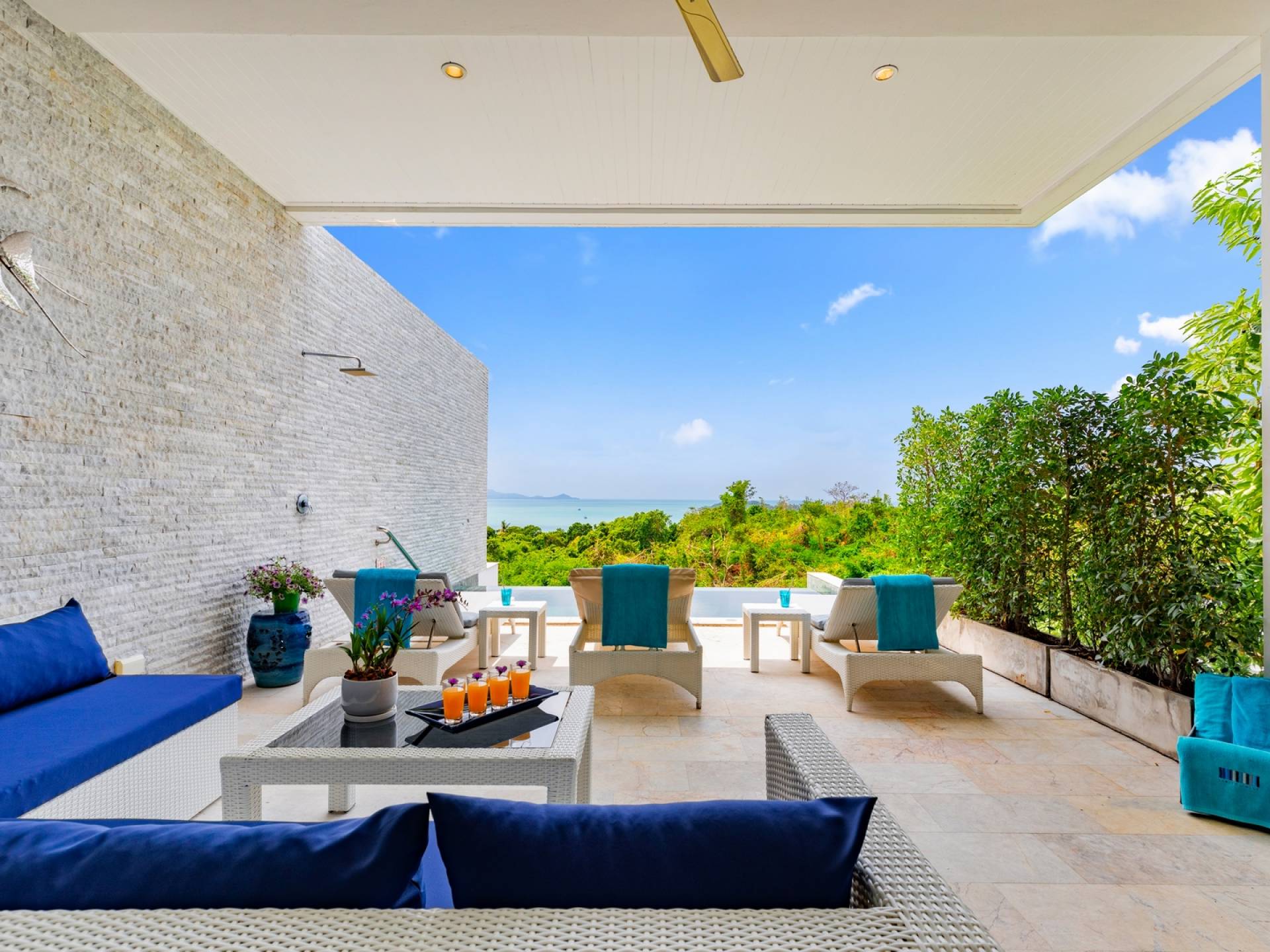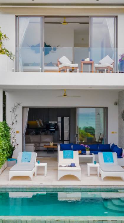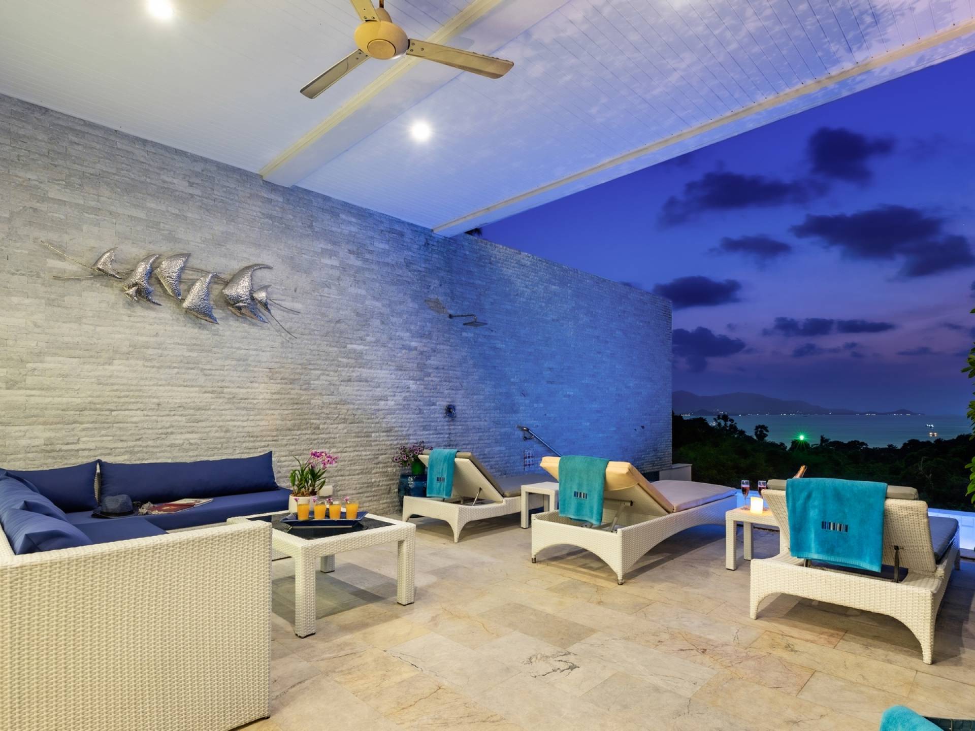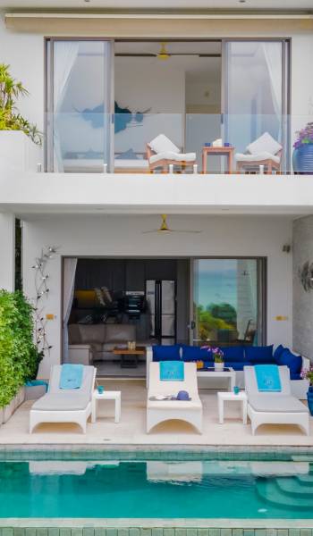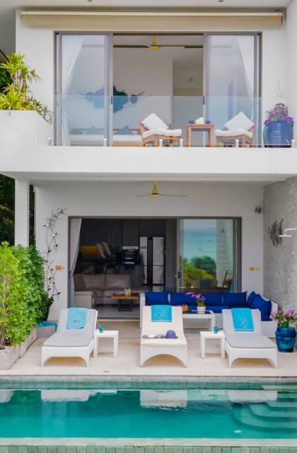 Shades of Blue, une villa contemporaine magnifiquement aménagée pouvant accueillir confortablement huit personnes, est située dans le quartier populaire de Choeng Moen. Répartie sur trois niveaux, cette villa offre des équipements luxueux, la commodité, l'intimité et une vue imprenable sur la mer ininterrompue. Shades of Blue se trouve au bout d'une petite ruelle calme, loin de l'agitation des zones les plus peuplées de Samui. En arrivant à la villa, vous trouverez un abri d'auto tout-terrain avec un escalier en pierre blanche menant à l'entrée du rez-de-chaussée.