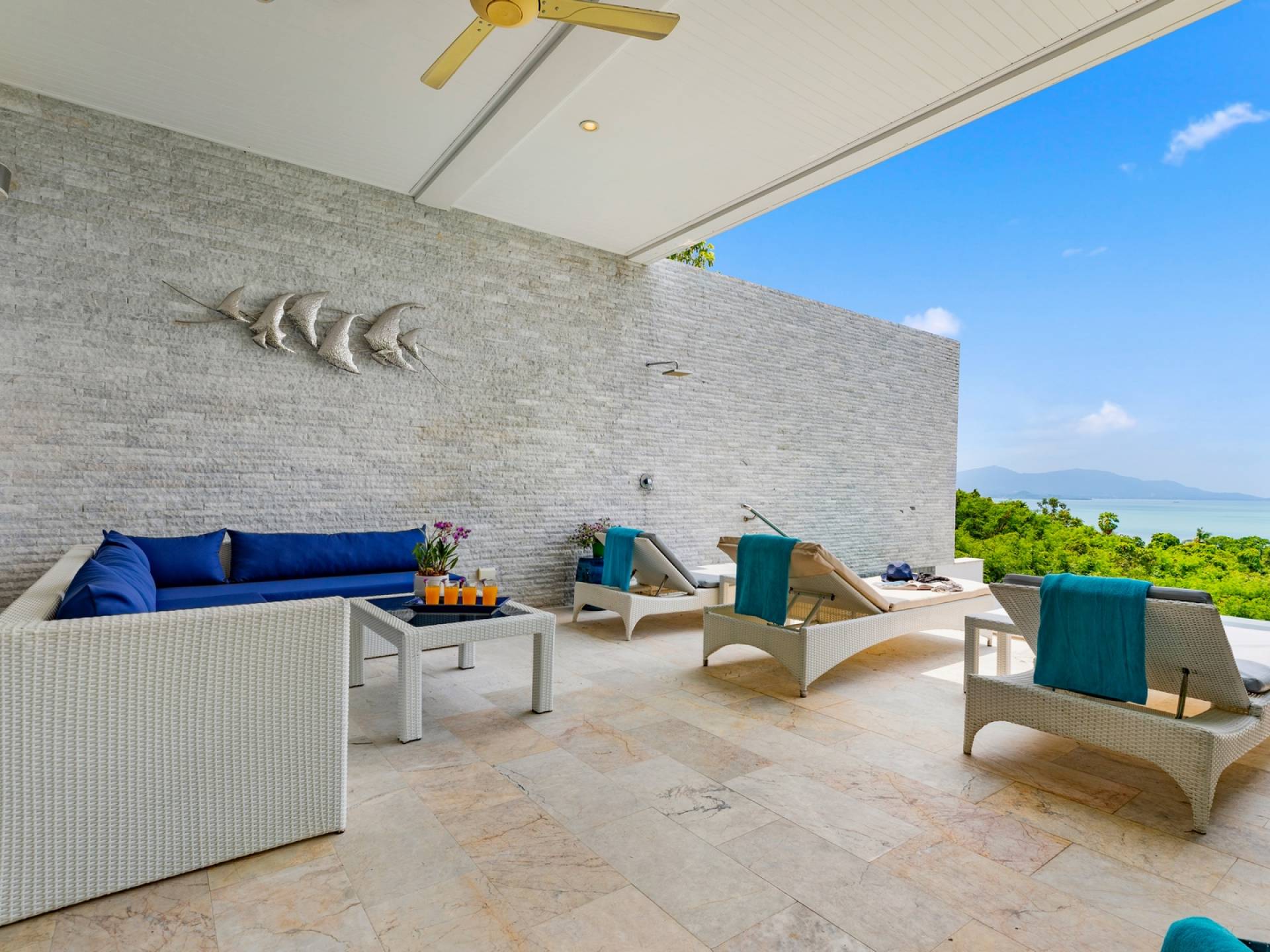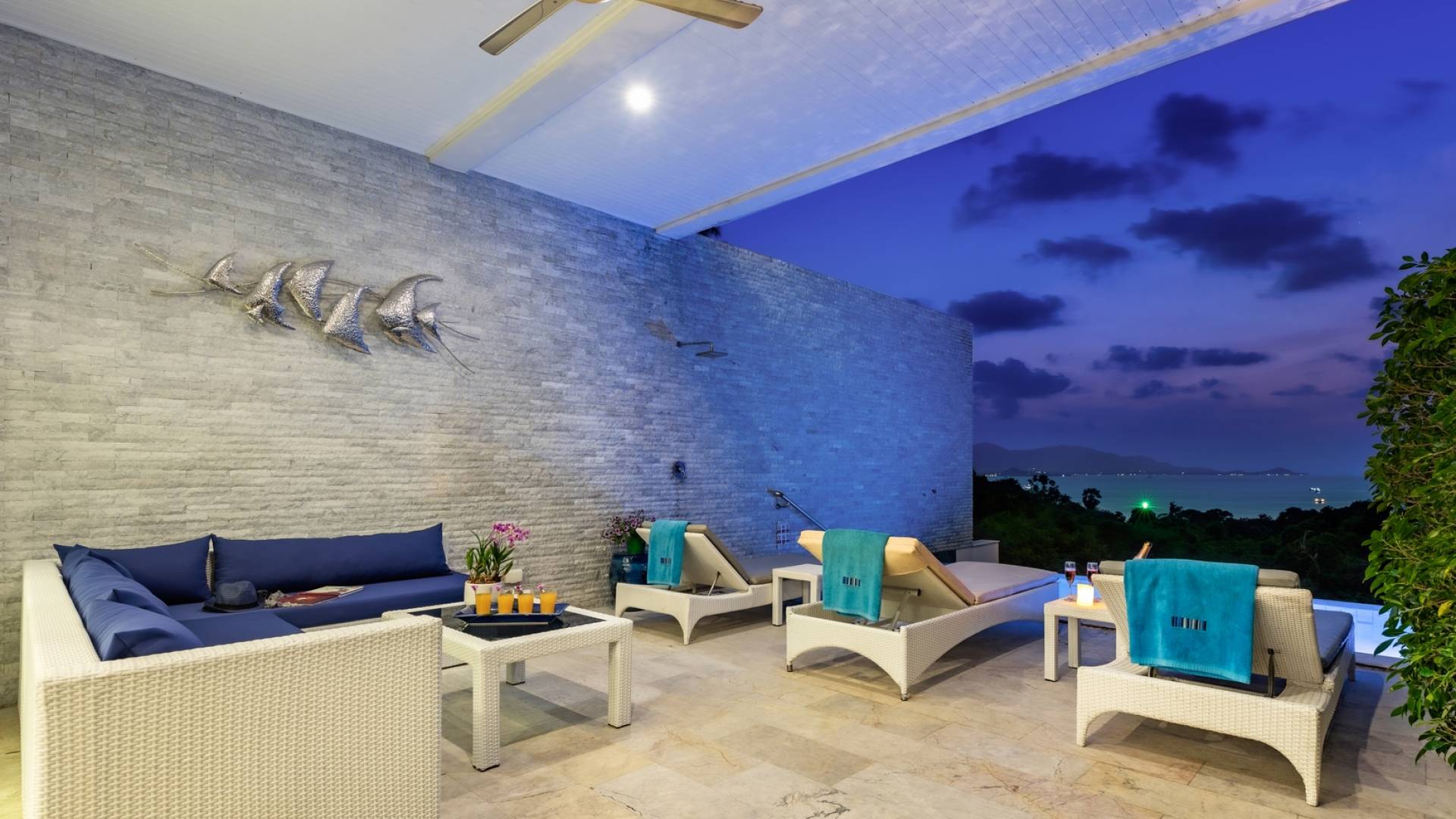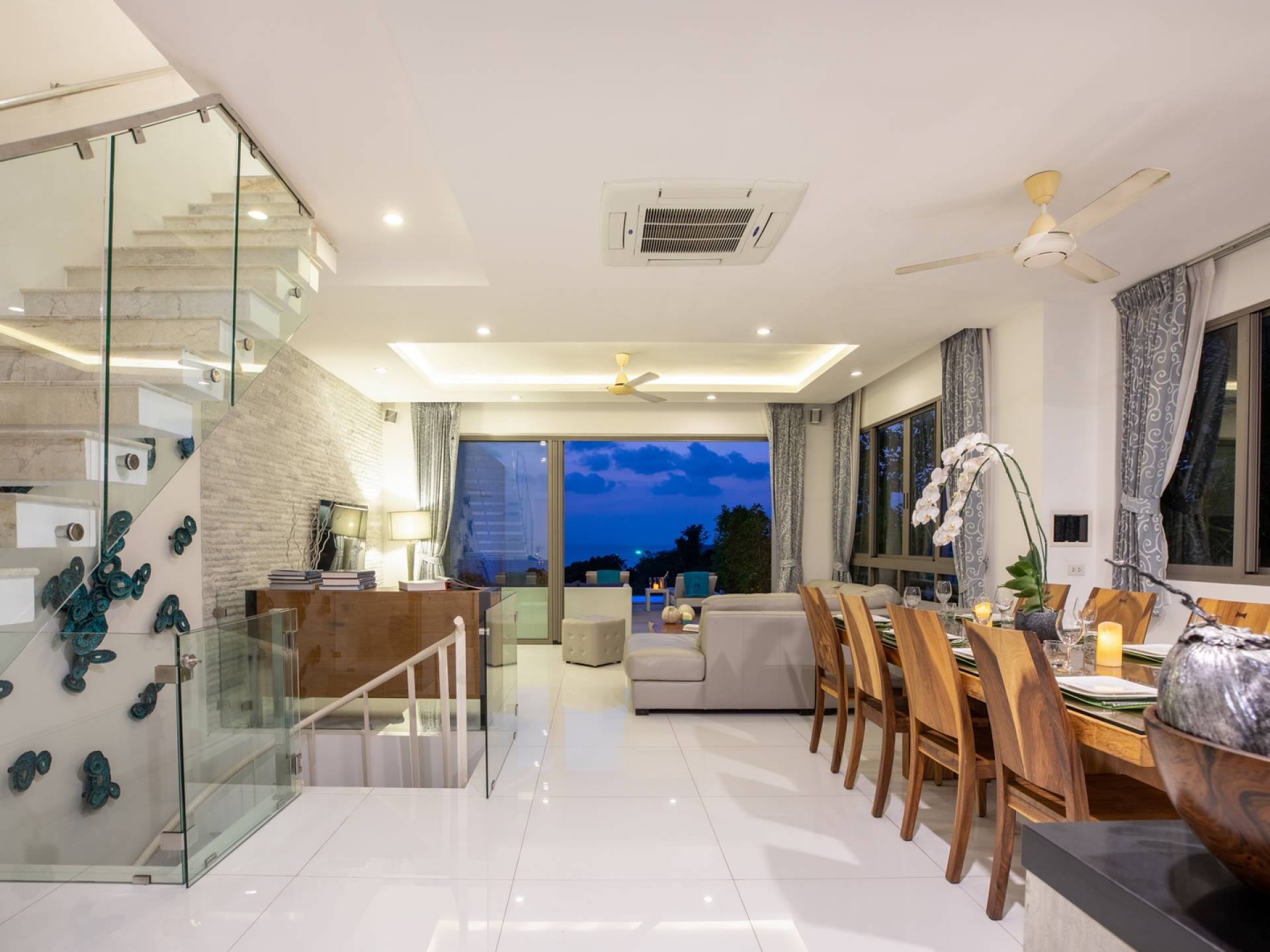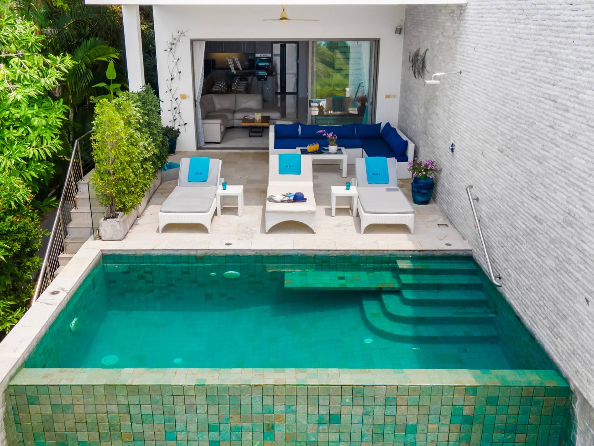 Shades of Blue, une villa contemporaine magnifiquement aménagée pouvant accueillir confortablement huit personnes, est située dans le quartier populaire de Choeng Moen. Répartie sur trois niveaux, cette villa offre des équipements luxueux, la commodité, l'intimité et une vue imprenable sur la mer ininterrompue. Shades of Blue se trouve au bout d'une petite ruelle calme, loin de l'agitation des zones les plus peuplées de Samui. En arrivant à la villa, vous trouverez un abri d'auto tout-terrain avec un escalier en pierre blanche menant à l'entrée du rez-de-chaussée.