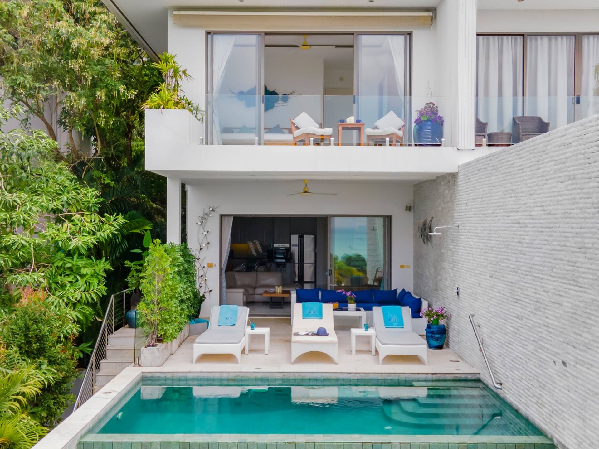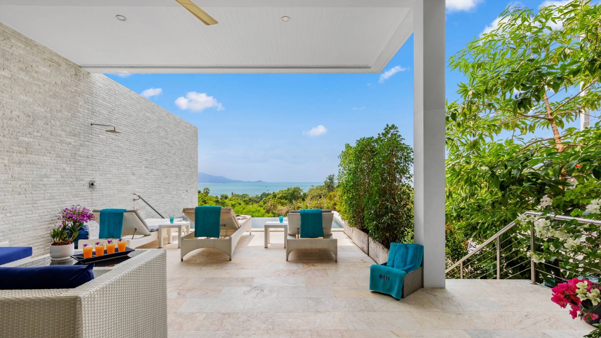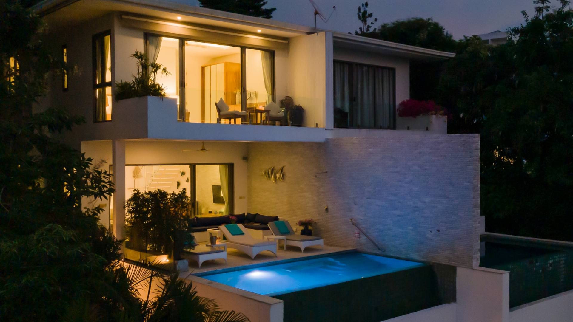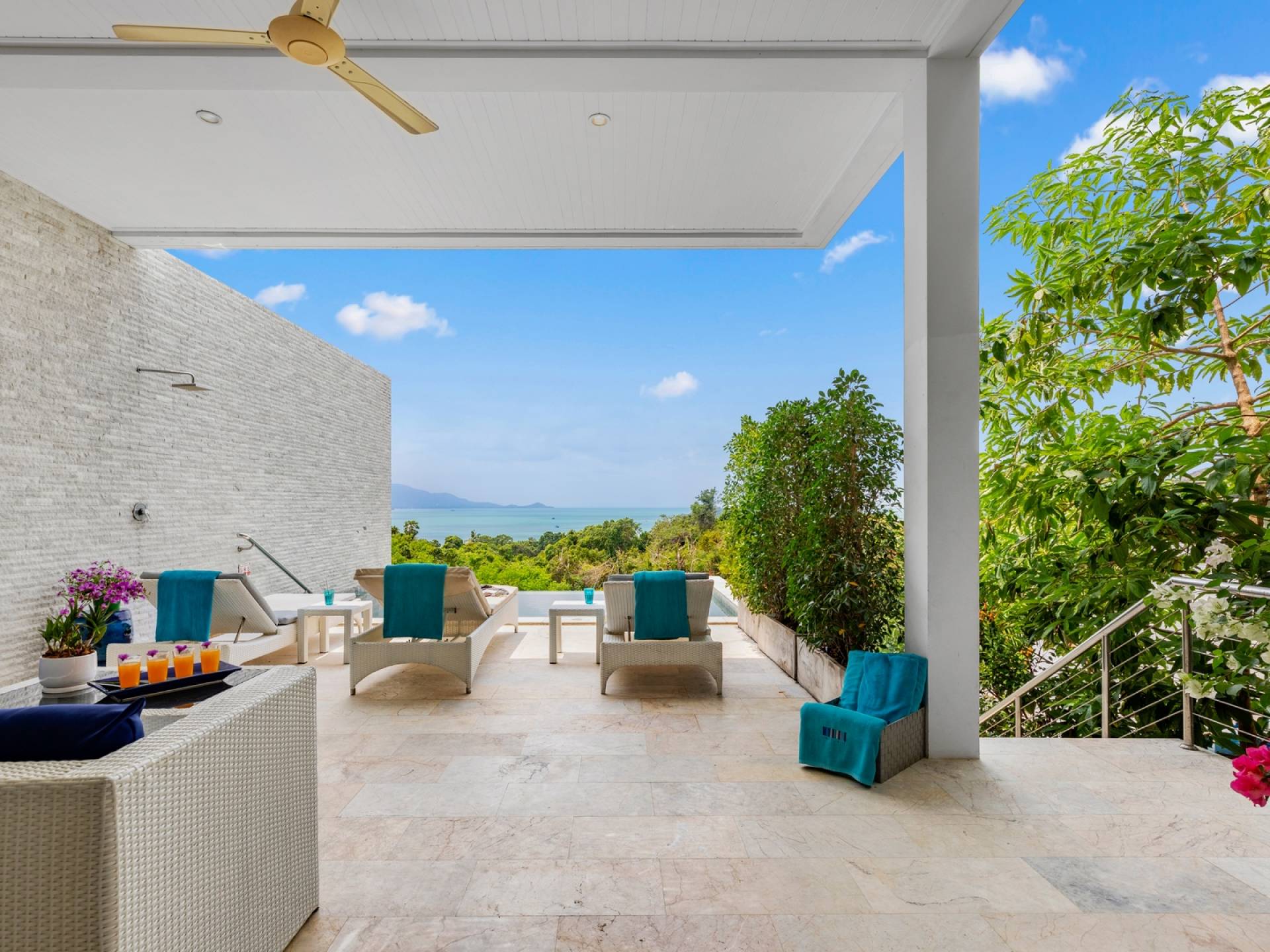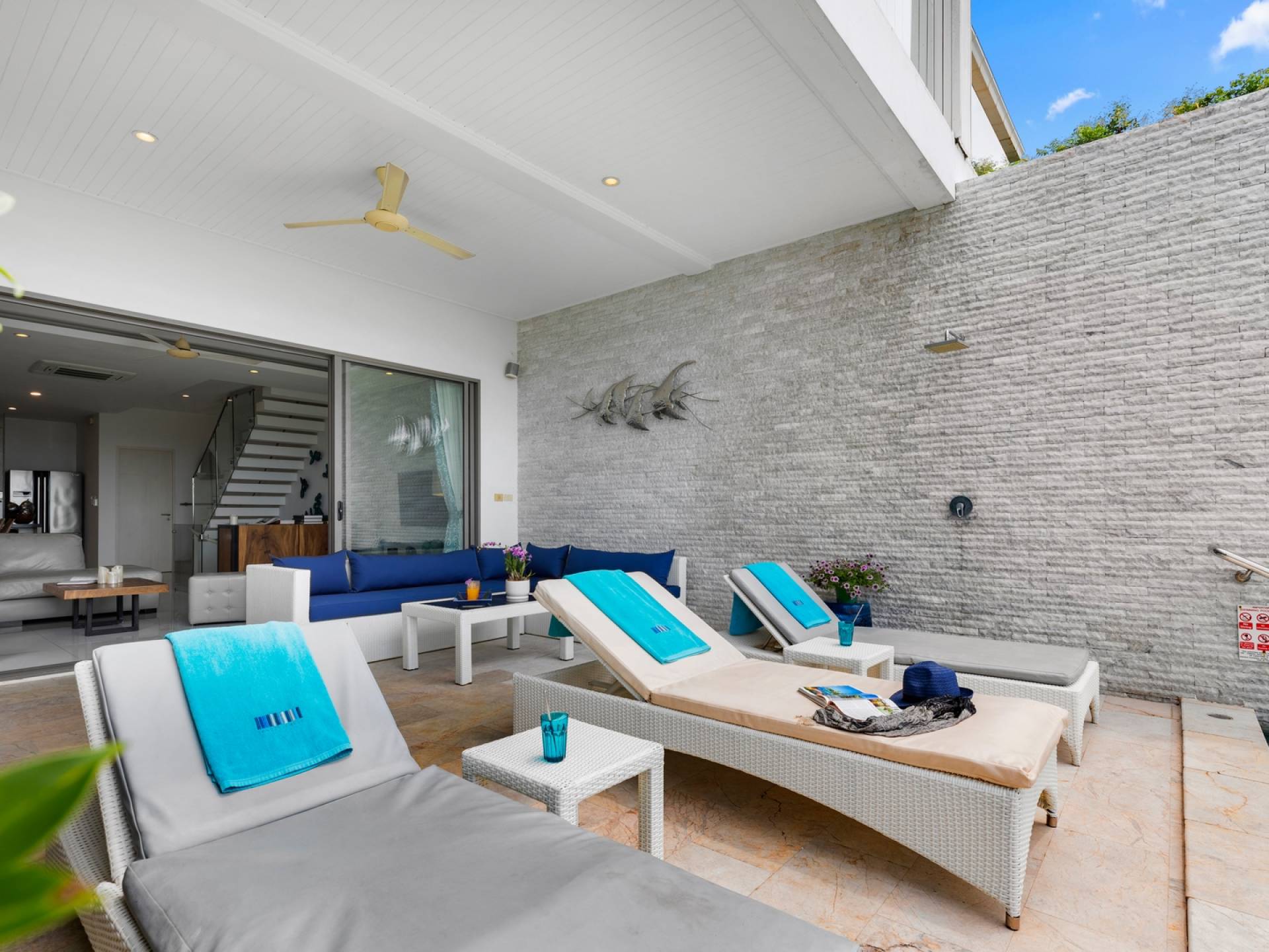 Shades of Blue, une villa contemporaine magnifiquement aménagée pouvant accueillir confortablement huit personnes, est située dans le quartier populaire de Choeng Moen. Répartie sur trois niveaux, cette villa offre des équipements luxueux, la commodité, l'intimité et une vue imprenable sur la mer ininterrompue. Shades of Blue se trouve au bout d'une petite ruelle calme, loin de l'agitation des zones les plus peuplées de Samui. En arrivant à la villa, vous trouverez un abri d'auto tout-terrain avec un escalier en pierre blanche menant à l'entrée du rez-de-chaussée.