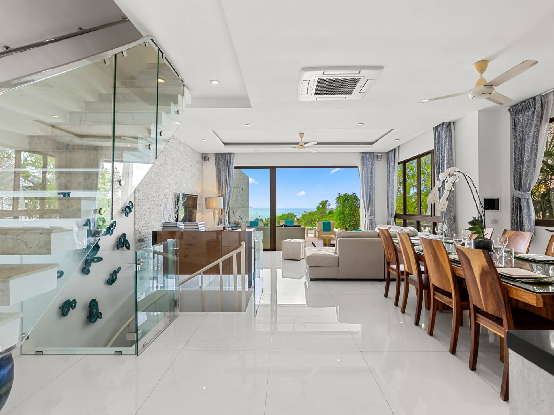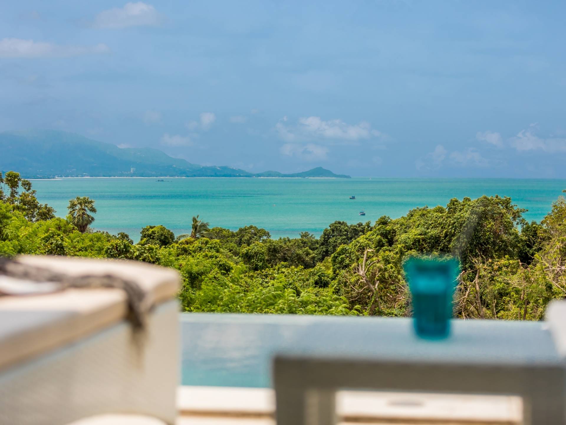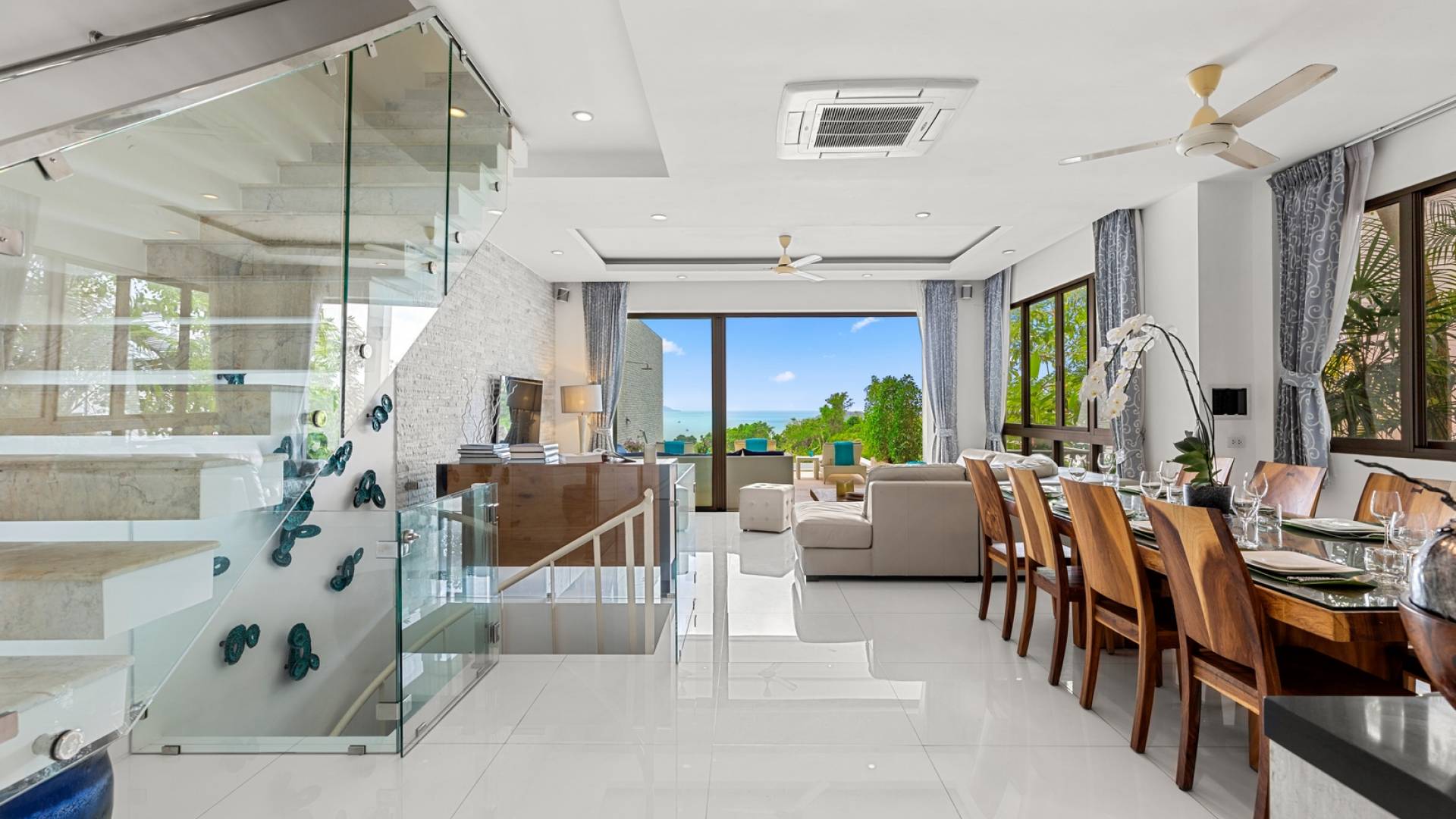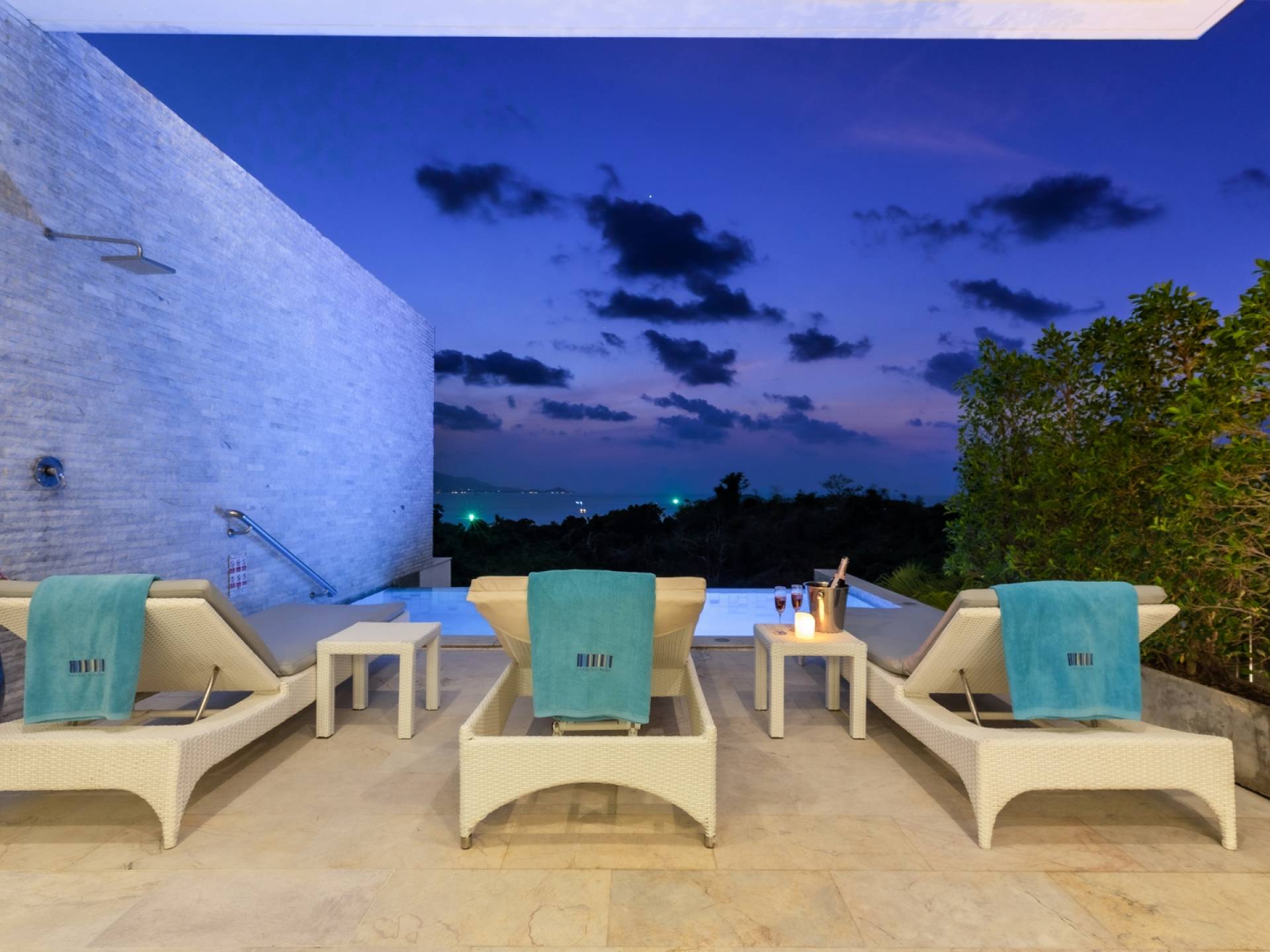 Shades of Blue, une villa contemporaine magnifiquement aménagée pouvant accueillir confortablement huit personnes, est située dans le quartier populaire de Choeng Moen. Répartie sur trois niveaux, cette villa offre des équipements luxueux, la commodité, l'intimité et une vue imprenable sur la mer ininterrompue. Shades of Blue se trouve au bout d'une petite ruelle calme, loin de l'agitation des zones les plus peuplées de Samui. En arrivant à la villa, vous trouverez un abri d'auto tout-terrain avec un escalier en pierre blanche menant à l'entrée du rez-de-chaussée.