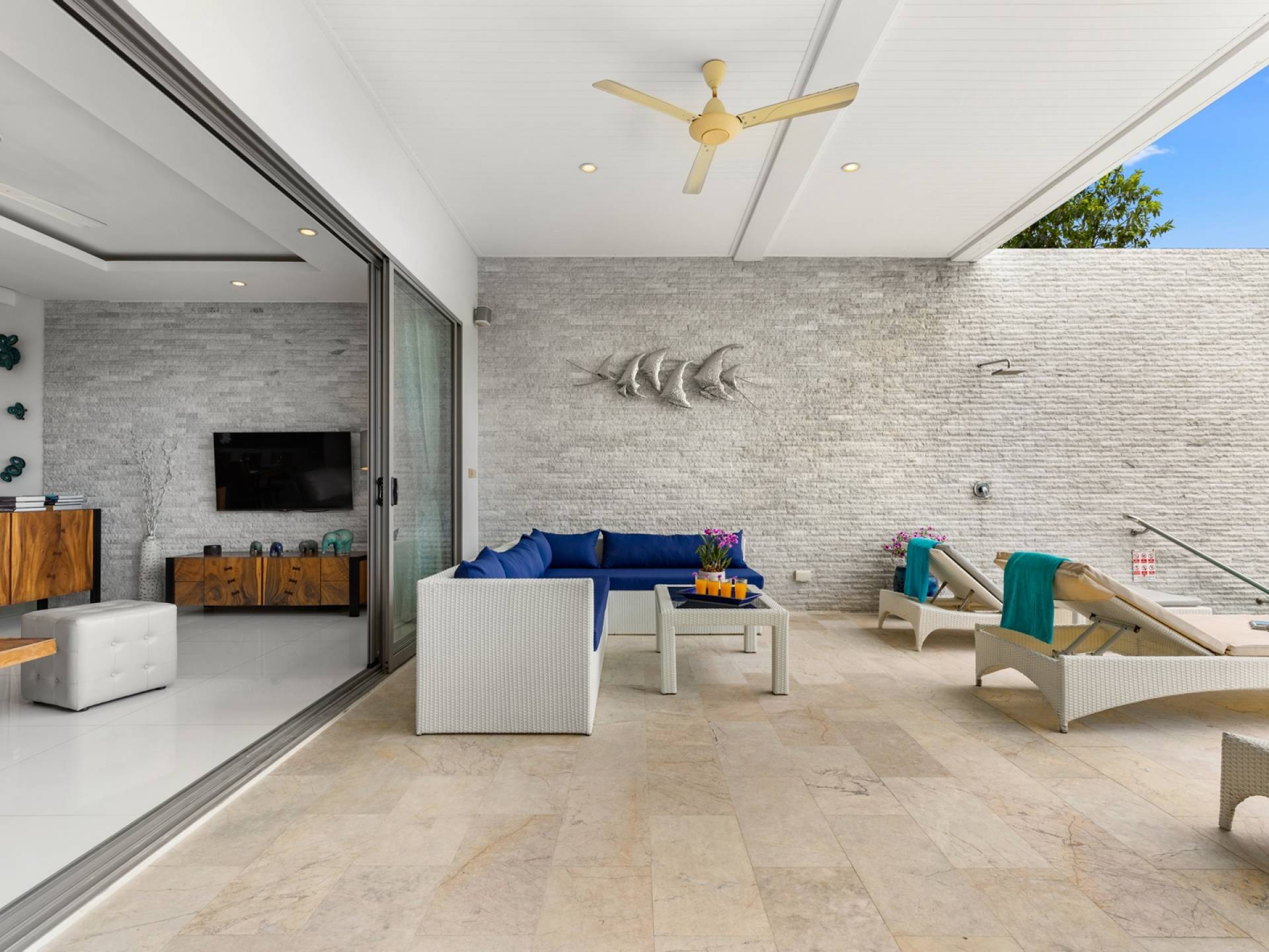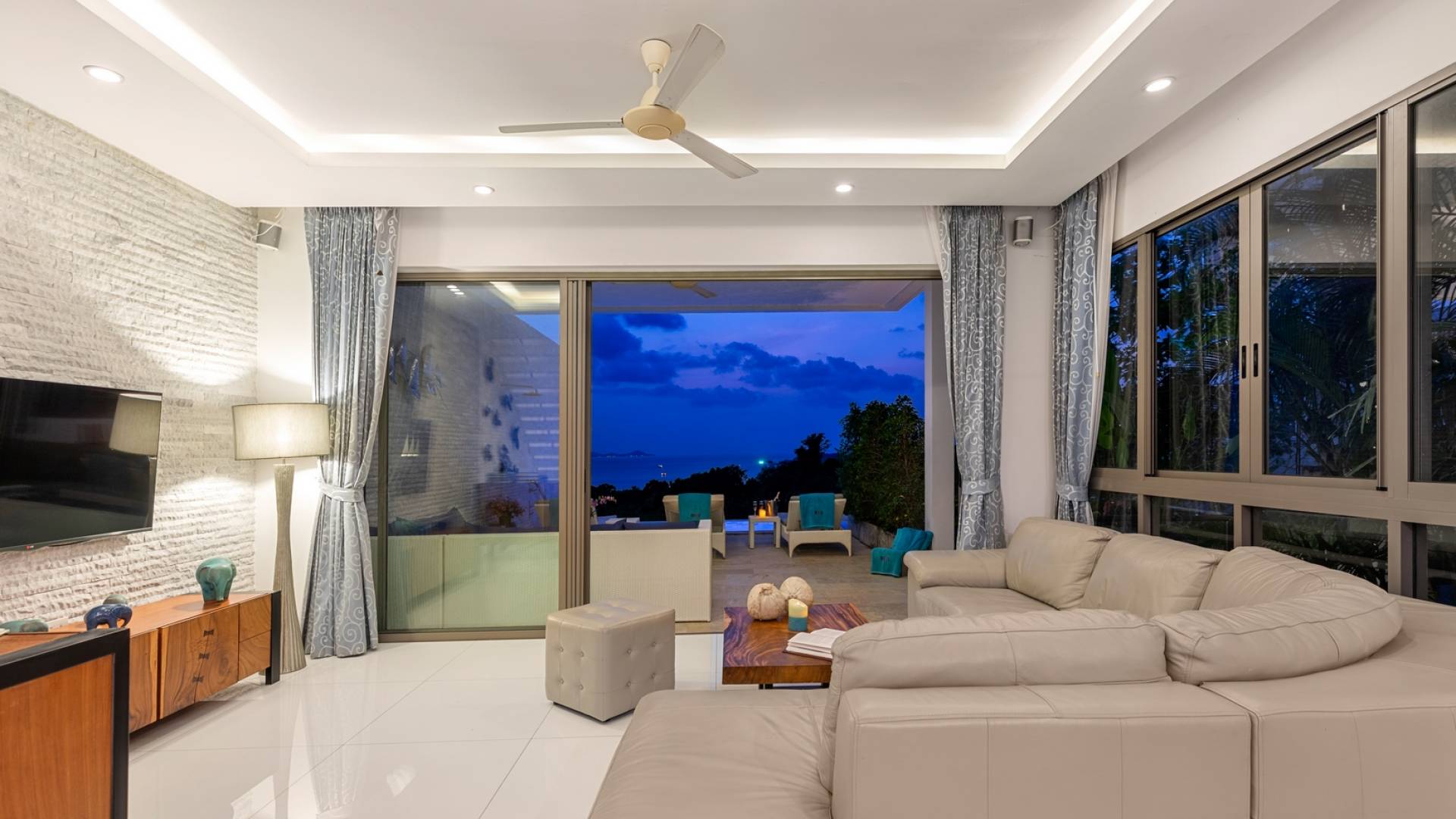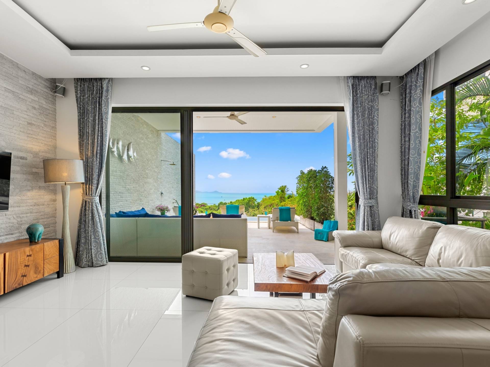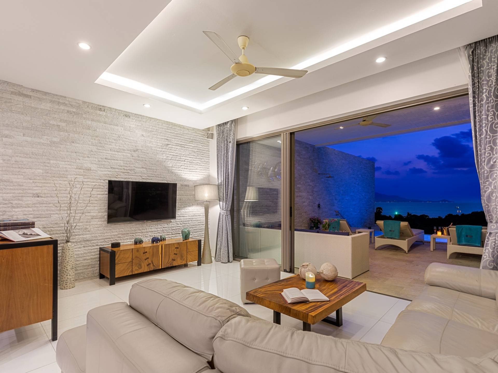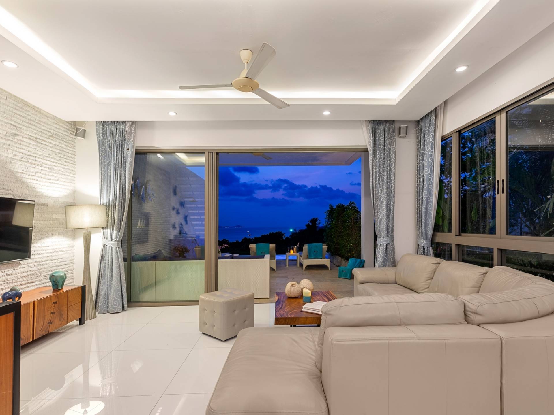 Shades of Blue, une villa contemporaine magnifiquement aménagée pouvant accueillir confortablement huit personnes, est située dans le quartier populaire de Choeng Moen. Répartie sur trois niveaux, cette villa offre des équipements luxueux, la commodité, l'intimité et une vue imprenable sur la mer ininterrompue. Shades of Blue se trouve au bout d'une petite ruelle calme, loin de l'agitation des zones les plus peuplées de Samui. En arrivant à la villa, vous trouverez un abri d'auto tout-terrain avec un escalier en pierre blanche menant à l'entrée du rez-de-chaussée.