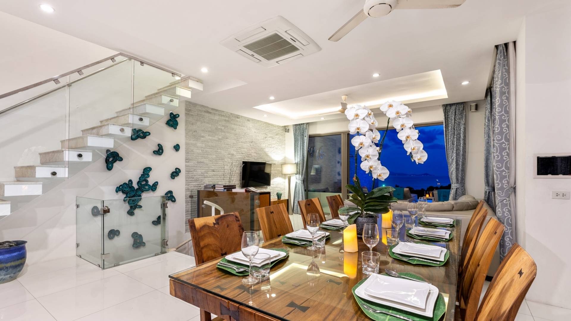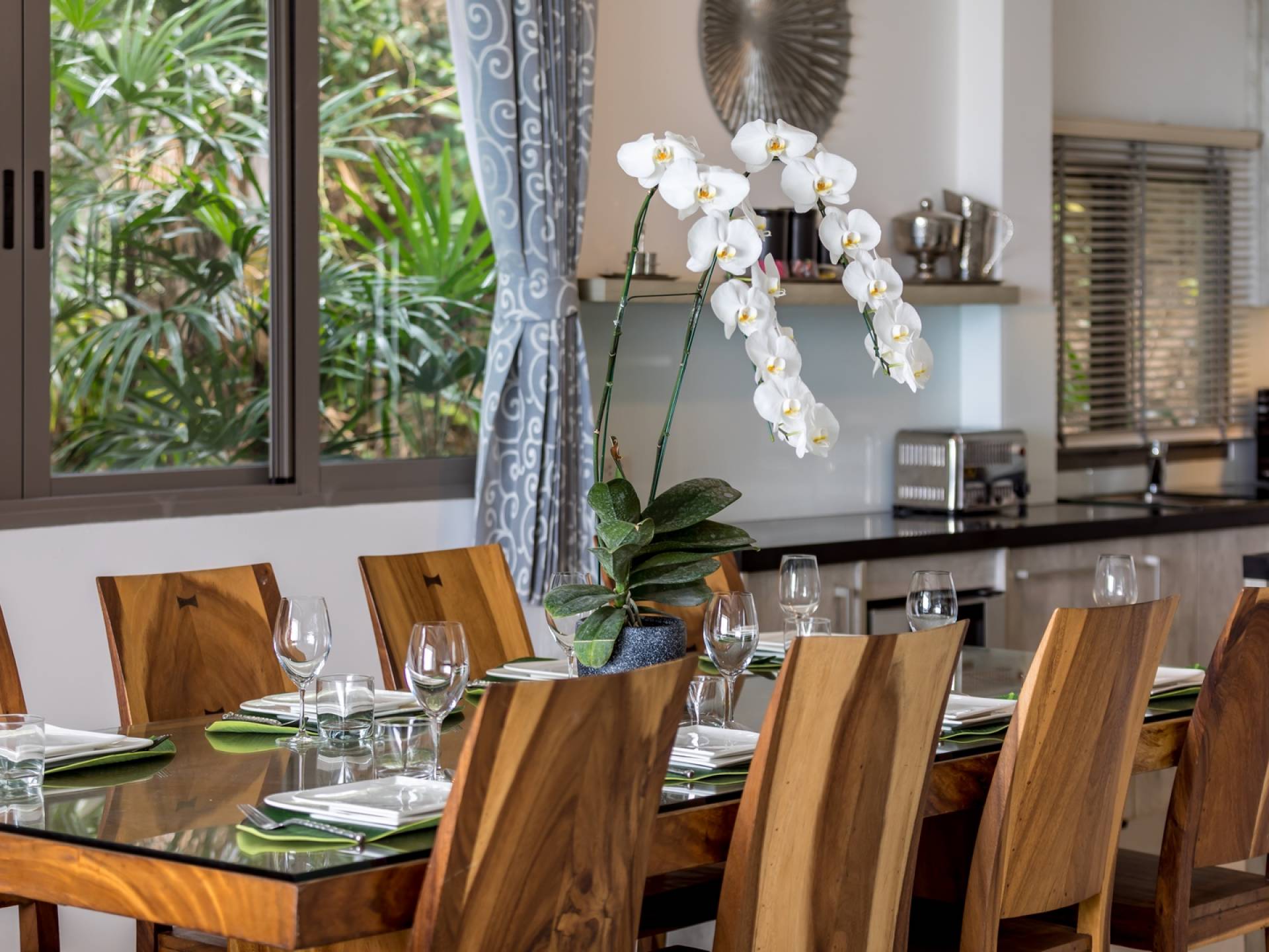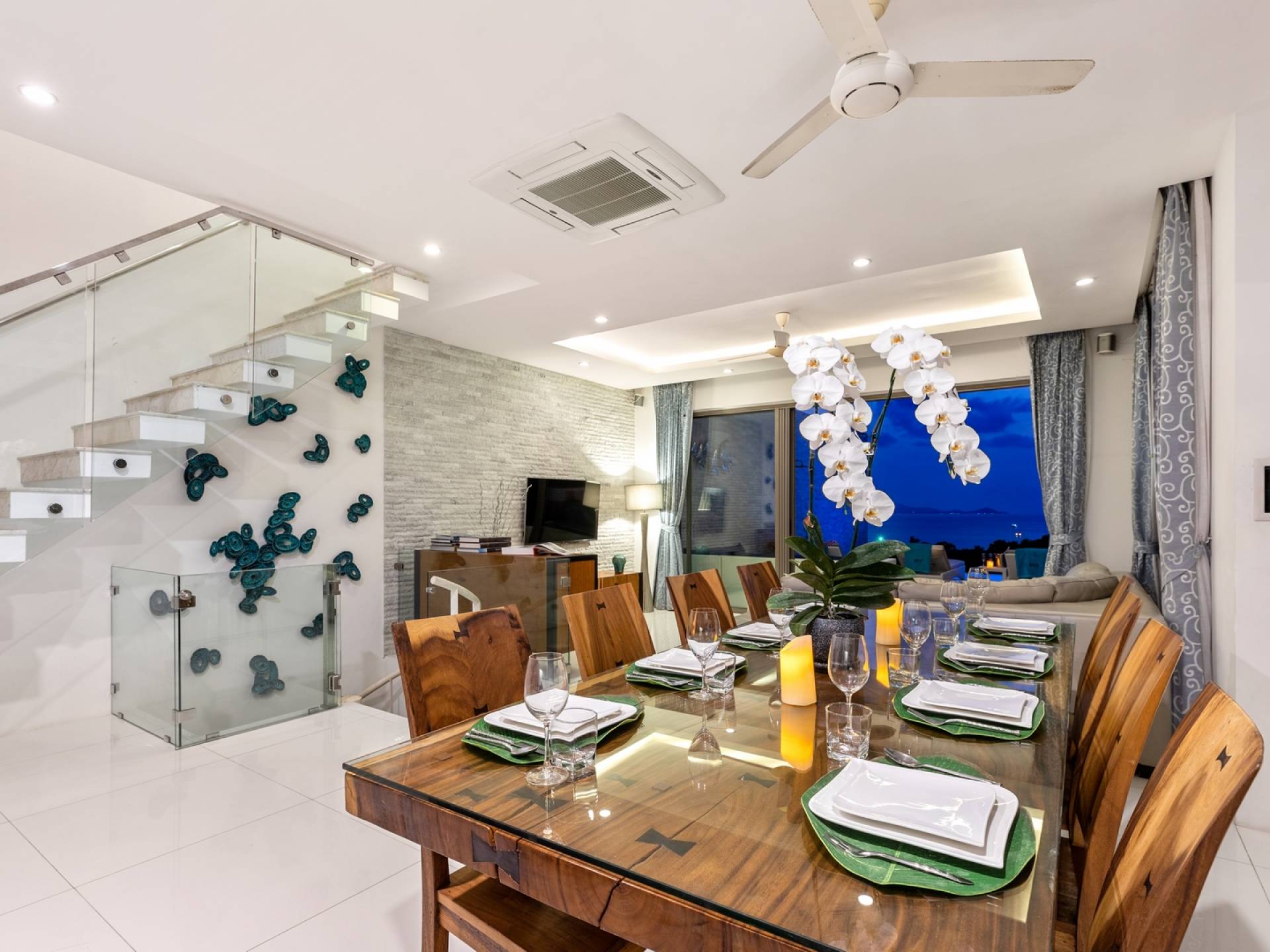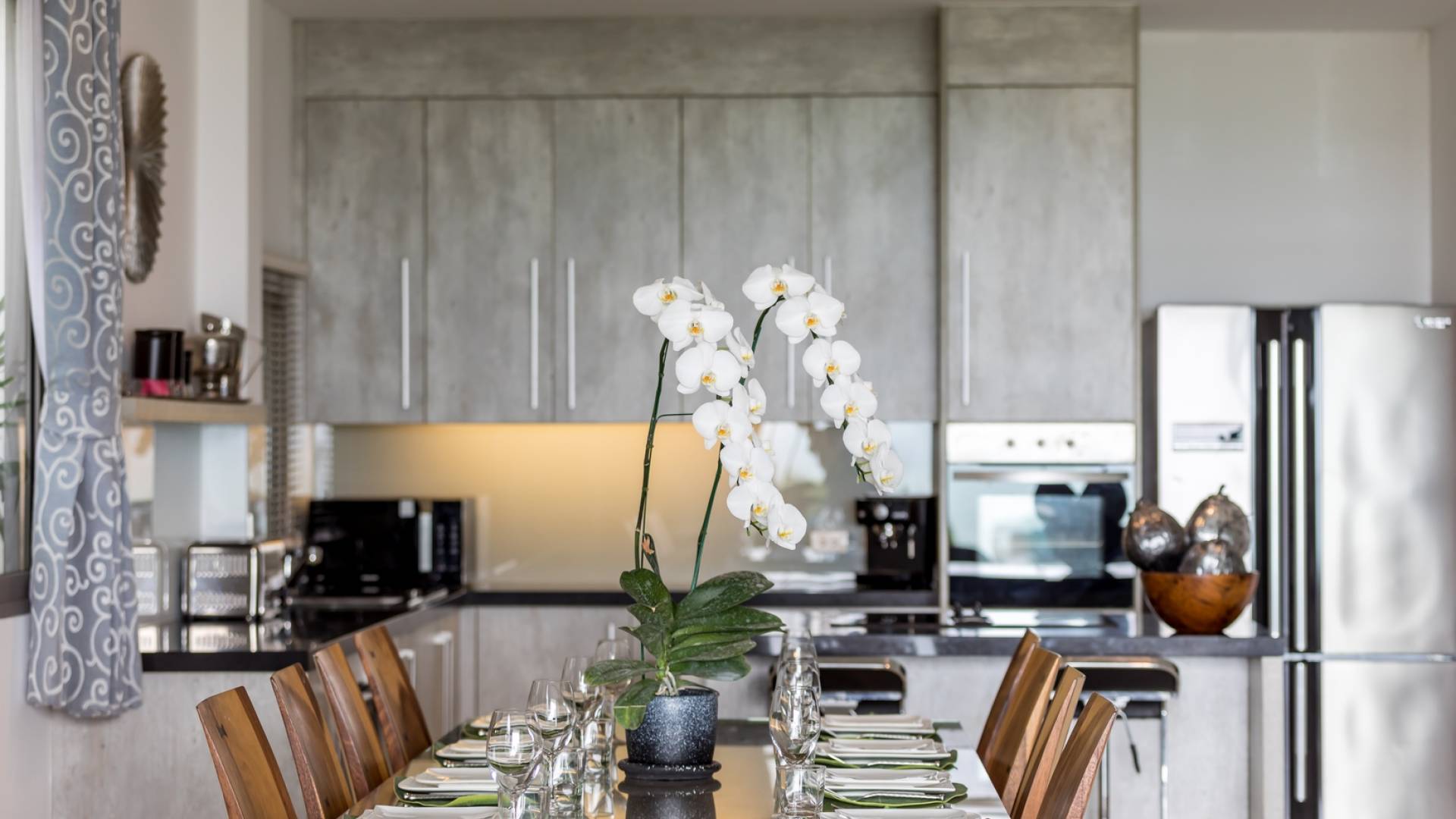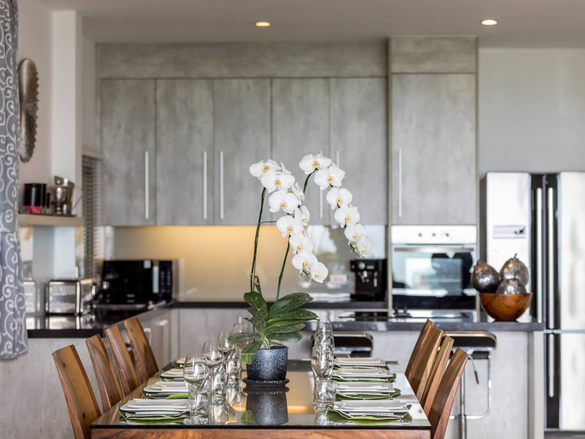 Le deuxième niveau de la villa contient une grande cuisine équipée de tout le confort moderne : un réfrigérateur/congélateur à l'américaine, une cave à vin, un four électrique et une plaque de cuisson halogène. En un mot, tous les appareils et accessoires sont nécessaires pour un divertissement à domicile agréable. Les armoires grises brossées et les surfaces en granit noir hautement poli créent un look épuré et sophistiqué. Derrière l'îlot central et ses trois tabourets de bar se trouve une élégante table à manger en bois dur avec plateau en verre pouvant accueillir confortablement huit personnes. Le reste de cet espace de vie décloisonné contemporain comprend un coin salon confortable avec un élégant canapé en cuir gris perle en forme de L et une télévision à écran plat avec connexion Internet. Deux portes-fenêtres à double vitrage s'ouvrent sur une terrasse avec une piscine à débordement et de superbes vues panoramiques sur l'océan. Des chaises longues confortables pour contempler la vue et un grand bar et tabourets en forme de L rendent cet espace extérieur idéal pour les repas en plein air ou les cocktails avant le dîner. Un WC visiteurs se trouve à côté de la cuisine.