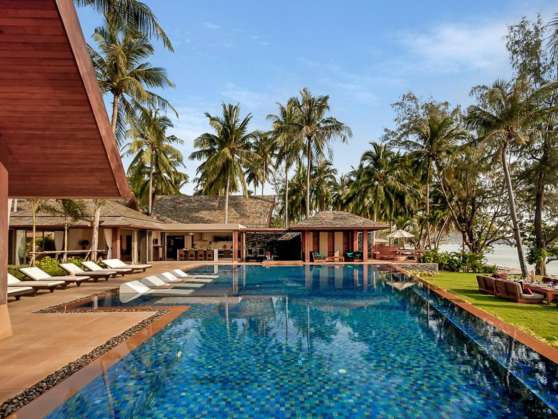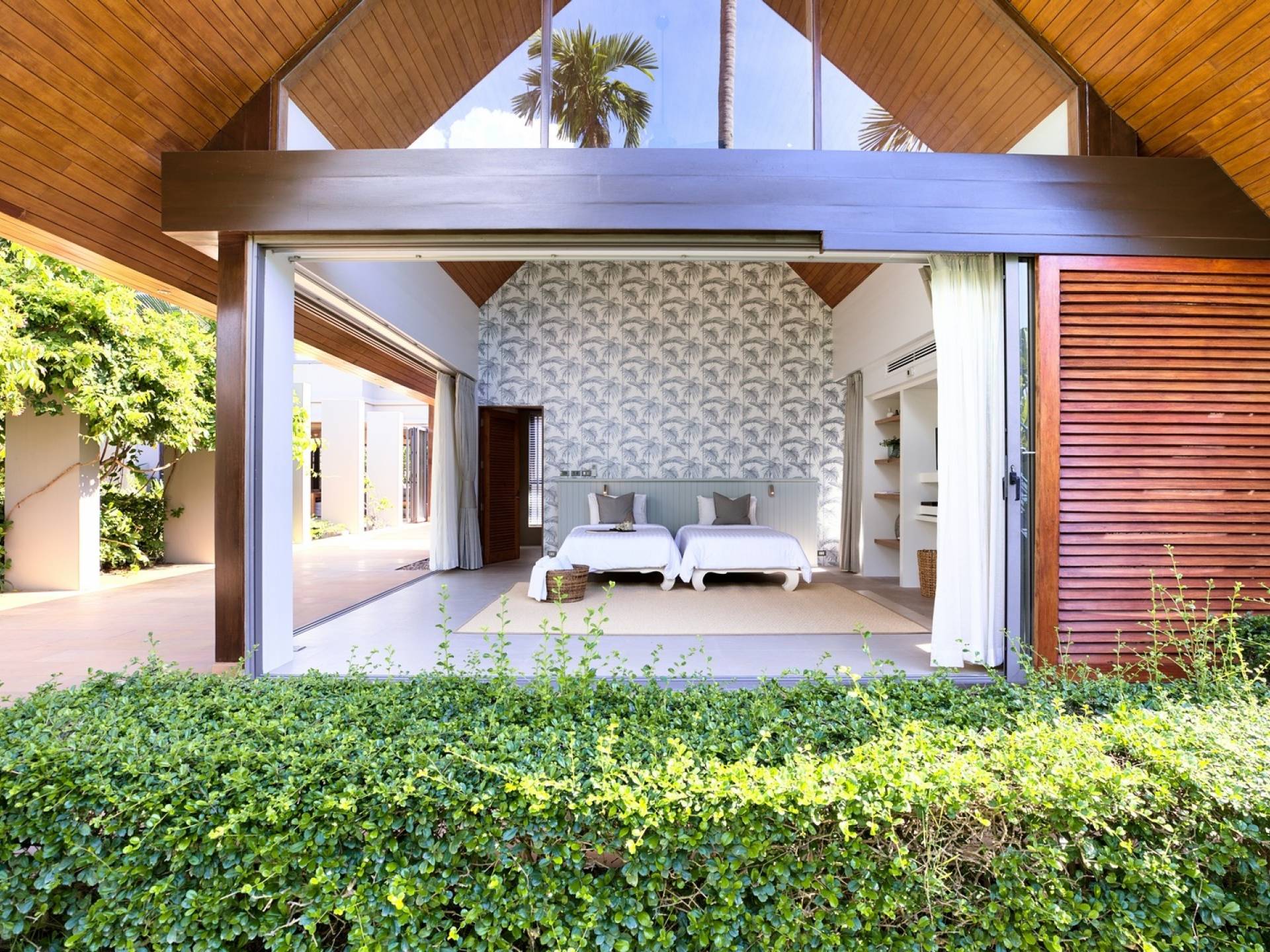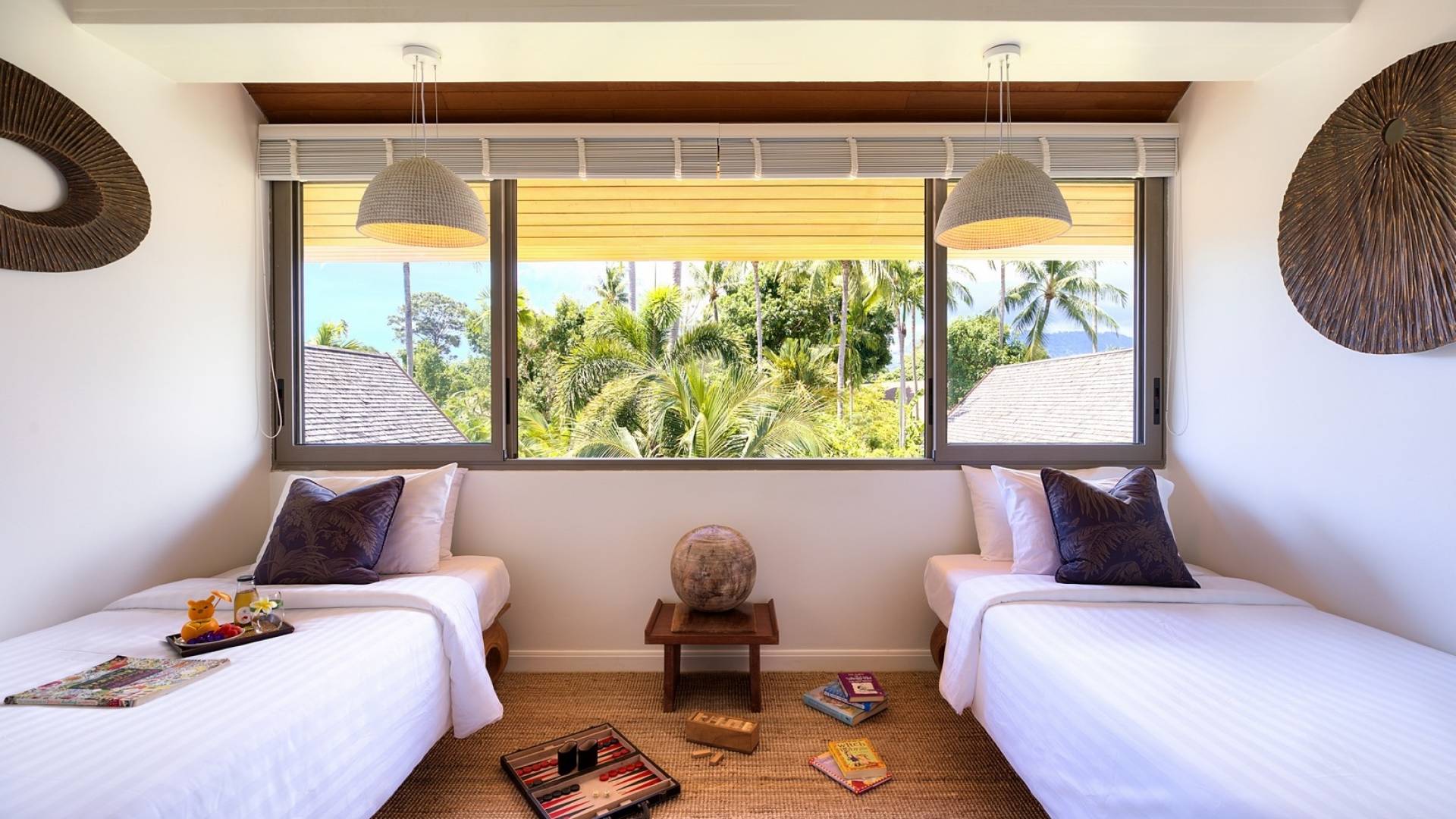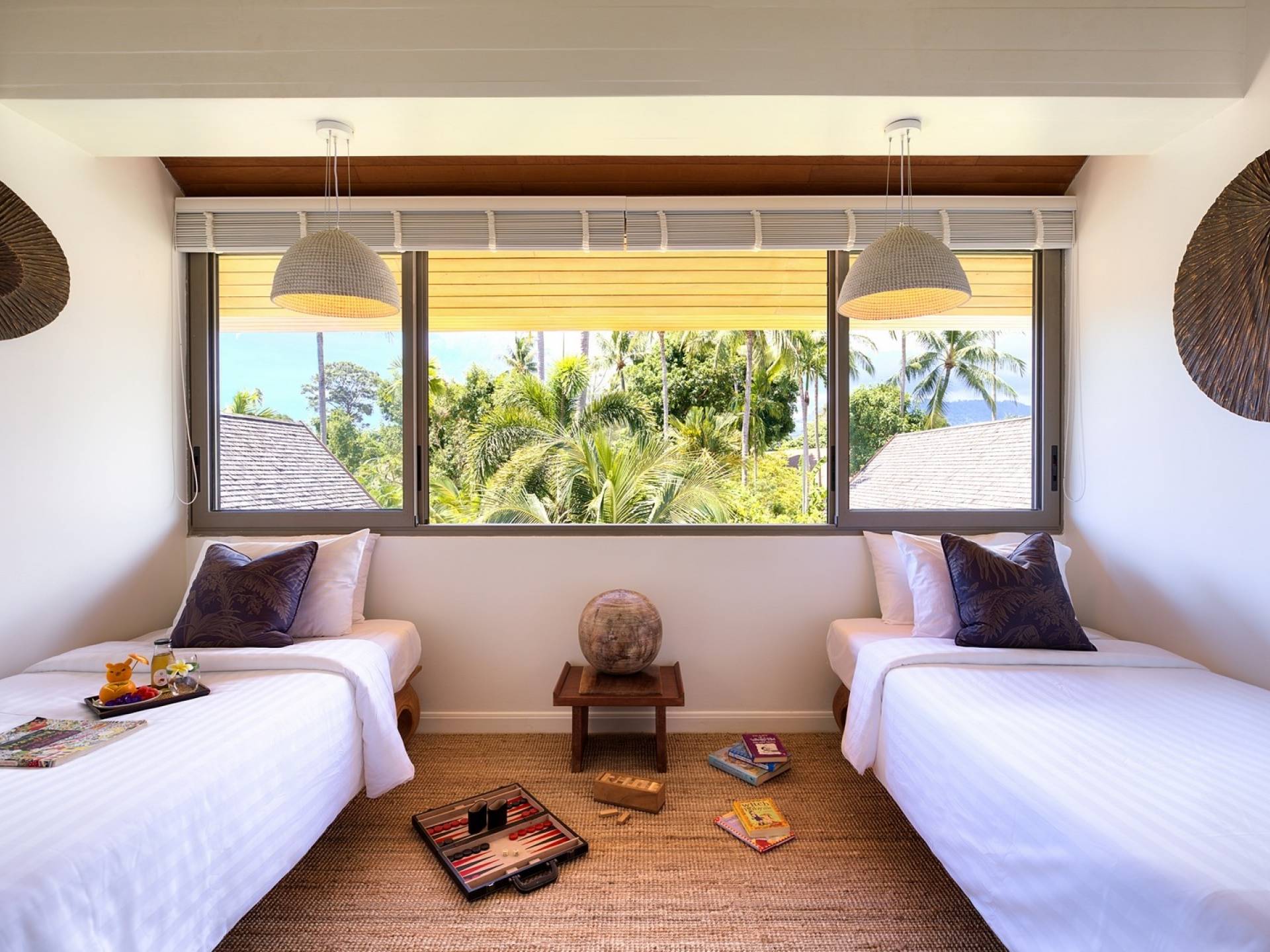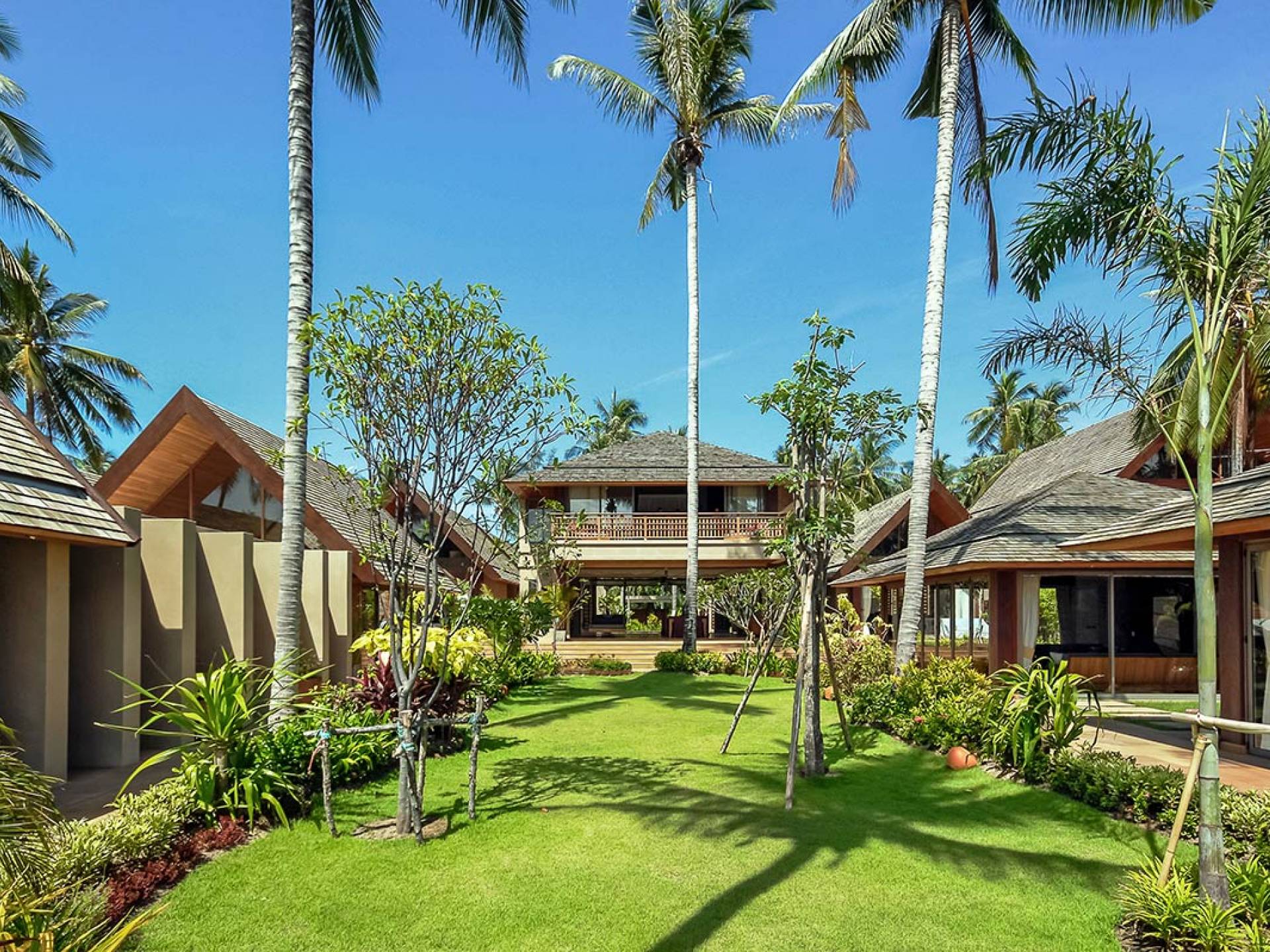 Le couchage a été aménagé pour accueillir les enfants jusqu'au bout. La grande suite parentale accueille 2 lits simples dans une alcôve avec portes coulissantes, la salle de jeux pour enfants peut être aménagée avec 3 lits simples et une salle de bain attenante et 2 des chambres parentales ont une mezzanine au-dessus de leur salle de bain attenante accessible via un échelle pliante (déconseillée aux enfants de moins de 12 ans), enfin, la chambre principale avant accueille un lit d'appoint dans une alcôve au sein de la grande chambre. La vraie vie tropicale tire le meilleur parti des douces brises marines de Samui et du temps chaud. À Baan Kilee, les portes et les fenêtres spécialement conçues peuvent être rabattues, tandis que le monde naturel est également accueilli par le choix de bardeaux de cèdre pour les toits, qui aident la villa à se fondre subtilement dans son environnement. Une bande de pelouse en bord de plage fait face aux espaces de vie, formant une frontière naturelle entre la grande piscine, la plage et la mer.
